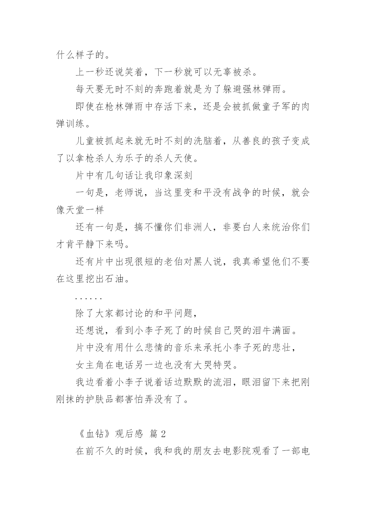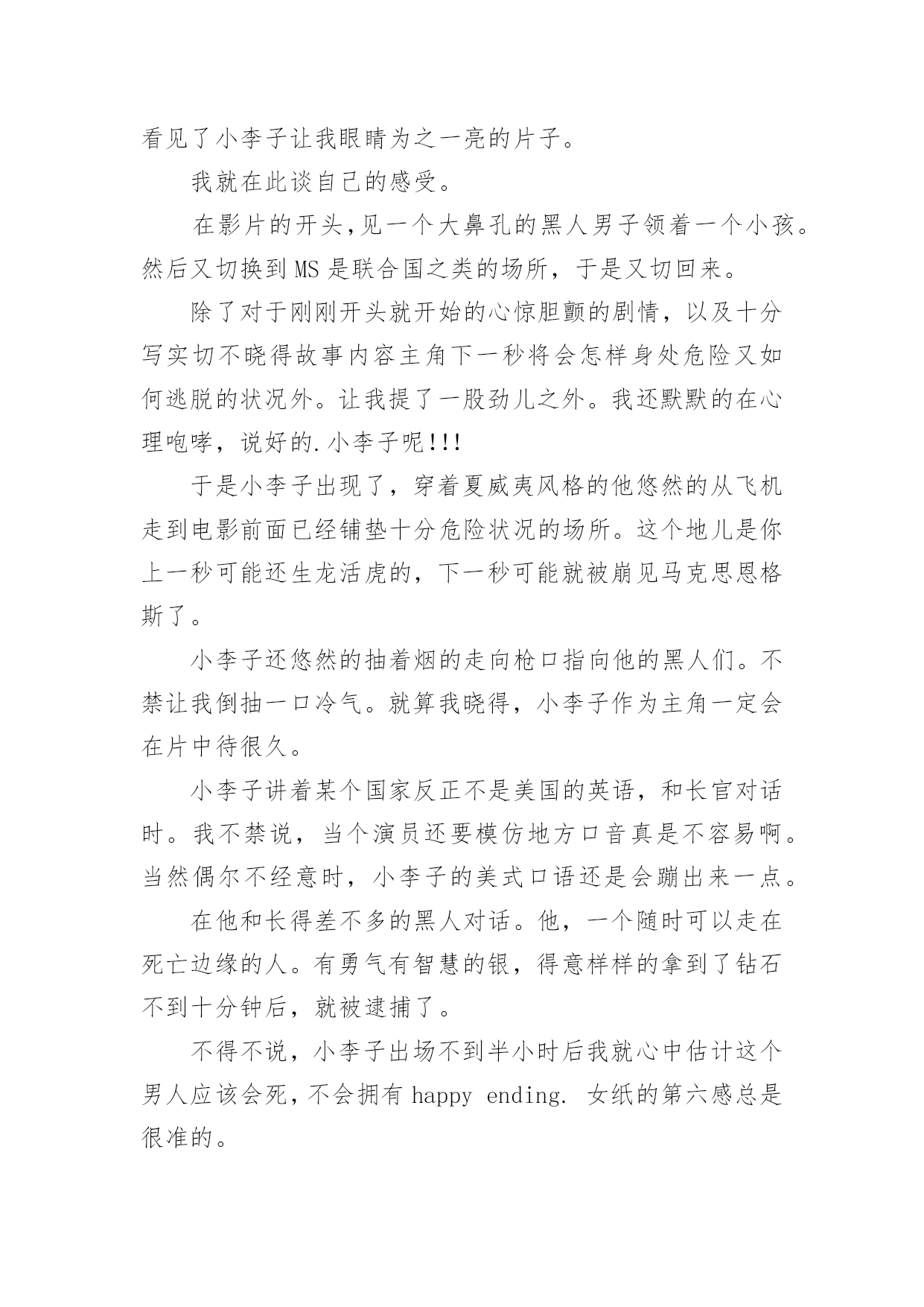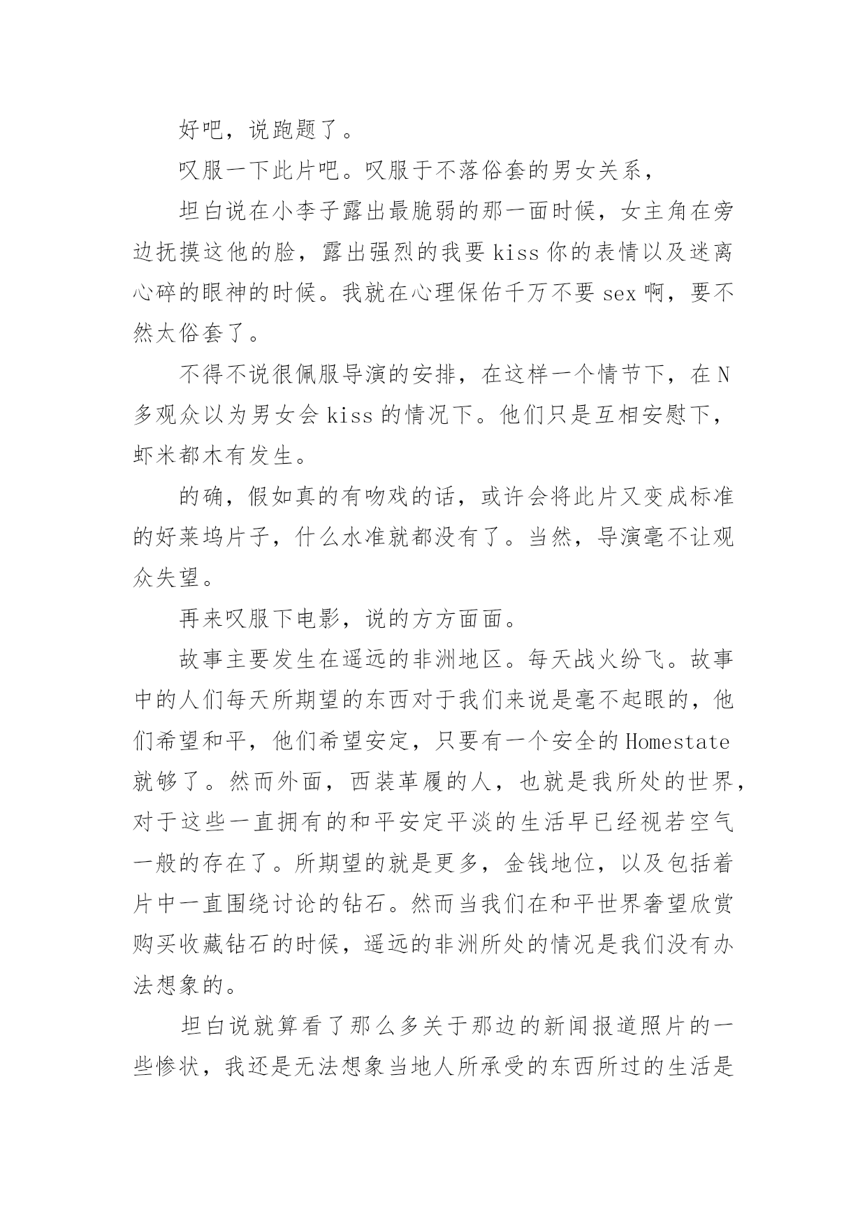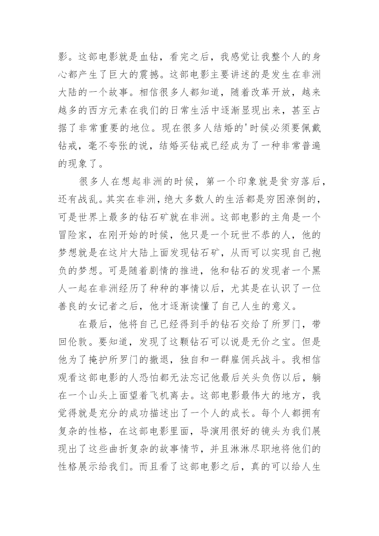 《血钻》观后感看完一部经典作品以后,对人生或者事物一定产生了许多感想吧,不妨坐下来好好写写观后感吧。那么你真的会写观后感吗?以下是小编帮大家整理的《血钻》观后感,供大家参考借鉴,希望可以帮助到有需要的朋友。《血钻》观后感篇1其实看这部片子的初衷完全是因为小李子。尽管泰坦尼克的美貌已不复存在,而小李子早已变成了大叔实力派。我必须说我追了小李子蛮久的。但是在看他变成大叔的一部分电影中,并没有从中获得惊叹什么的。从禁闭岛到盗梦空间,还有孩童时和杰克船长演的不一样的天空加上号称其美貌巅峰的虐心童叔。同性恋片子心之全蚀从这些电影我只能感觉到小李子就像美特斯邦威一样,不走寻常路。不甘愿做欧美偶像,而是愿意选择小众的题材。诉说这什么。当然从这些片子中,我除了感叹小李子的容颜不复存在以外,只能说这些要走实力派的片子实在不是我的菜。甚至包括N多人推荐的盗梦空间。然而,在一个无所事事的早上。我用的我的高级的oppoMP4看电影。本想打发下时间什么的。却没有想到总算让我看见了小李子让我眼睛为之一亮的片子。我就在此谈自己的感受。在影片的开头,见一个大鼻孔的黑人男子领着一个小孩。然后又切换到MS是联合国之类的场所,于是又切回来。除了对于刚刚开头就开始的心惊胆颤的剧情,以及十分写实切不晓得故事内容主角下一秒将会怎样身处危险又如何逃脱的状况外。让我提了一股劲儿之外。我还默默的在心理咆哮,说好的.小李子呢!!!于是小李子出现了,穿着夏威夷风格的他悠然的从飞机走到电影前面已经铺垫十分危险状况的场所。这个地儿是你上一秒可能还生龙活虎的,下一秒可能就被崩见马克思恩格斯了。小李子还悠然的抽着烟的走向枪口指向他的黑人们。不禁让我倒抽一口冷气。就算我晓得,小李子作为主角一定会在片中待很久。小李子讲着某个国家反正不是美国的英语,和长官对话时。我不禁说,当个演员还要模仿地方口音真是不容易啊。当然偶尔不经意时,小李子的美式口语还是会蹦出来一点。在他和长得差不多的黑人对话。他,一个随时可以走在死亡边缘的人。有勇气有智慧的银,得意样样的拿到了钻石不到十分钟后,就被逮捕了。不得不说,小李子出场不到半小时后我就心中估计这个男人应该会死,不会拥有happyending.女纸的第六感总是很准的。好吧,说跑题了。叹服一下此片吧。叹服于不落俗套的男女关系,坦白说在小李子露出最脆弱的那一面时候,女主角在旁边抚摸这他的脸,露出强烈的我要kiss你的表情以及迷离心碎的眼神的时候。我就在心理保佑千万不要sex啊,要不然太俗套了。不得不说很佩服导演的安排,在这样一个情节下,在N多观众以为男女会kiss的情况下。他们只是互相安慰下,虾米都木有发生。的确,假如真的有吻戏的话,或许会将此片又变成标准的好莱坞片子,什么水准就都没有了。当然,导演毫不让观众失望。再来叹服下电影,说的方方面面。故事主要发生在遥远的非洲地区。每天战火纷飞。故事中的人们每天所期望的东西对于我们来说是毫不起眼的,他们希望和平,他们希望安定,只要有一个安全的Homestate就够了。然而外面,西装革履的人,也就是我所处的世界,对于这些一直拥有的和平安定平淡的生活早已经视若空气一般的存在了。所期望的就是更多,金钱地位,以及包括着片中一直围绕讨论的钻石。然而当我们在和平世界奢望欣赏购买收藏钻石的时候,遥远的非洲所处的情况是我们没有办法想象的。坦白说就算看了那么多关于那边的新闻报道照片的一些惨状,我还是无法想象当地人所承受的东西所过的生活是什么样子的。上一秒还说笑着,下一秒就可以无辜被杀。每天要无时不刻的奔跑着就是为了躲避强林弹雨。即使在枪林弹雨中存活下来,还是会被抓做童子军的肉弹训练。儿童被抓起来就无时不刻的洗脑着,从善良的孩子变成了以拿枪杀人为乐子的杀人天使。片中有几句话让我印象深刻一句是,老师说,当这里变和平没有战争的时候,就会像天堂一样还有一句是,搞不懂你们非洲人,非要白人来统治你们才肯平静下来吗。还有片中出现很短的老伯对黑人说,我真希望他们不要在这里挖出石油。......除了大家都讨论的和平问题,还想说,看到小李子死了的时候自己哭的泪牛满面。片中没有用什么悲情的音乐来承托小李子死的悲壮,女主角在电话另一边也没有大哭特哭。我边看着小李子说着话边默默的流泪,眼泪留下来把刚刚抹的护肤品都害怕弄没有了。《血钻》观后感篇2在前不久的时候,我和我的朋友去电影院观看了一部电影。这部电影就是血钻,看完之后,我感觉让我整个人的身心都产生了巨大的震撼。这部电影主要讲述的是发生在非洲大陆的一个故事。相信很多人都知道,随着改革开放,越来越多的西方元素在我们的日常生活中逐渐显现出来,甚至占据了非常重要的地位。现在很多人结婚的'时候必须要佩戴钻戒,毫不夸张的说,结婚买钻戒已经成为了一种非常普遍的现象了。很多人在想起非洲的时候,第一个印象就是贫穷落后,还有战乱