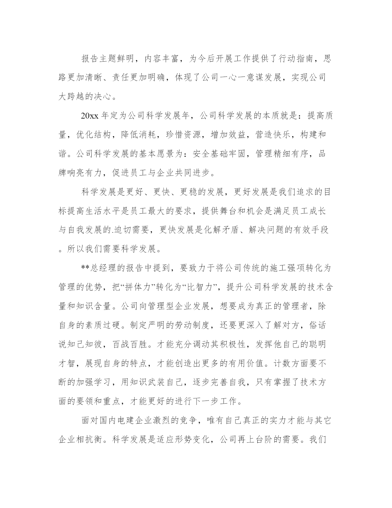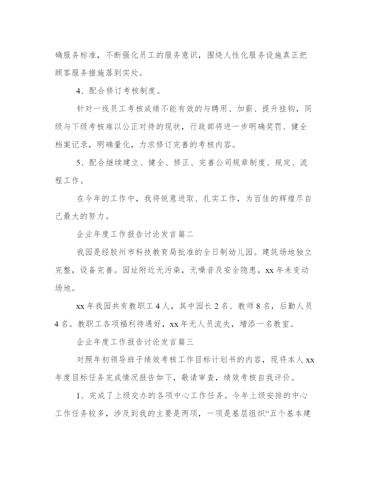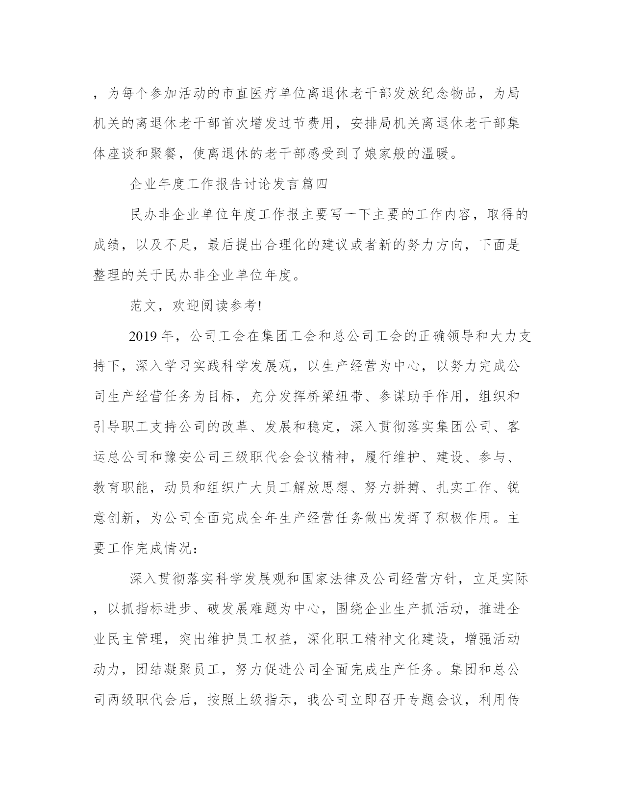 最新企业年度工作报告讨论发言企业年度工作报告(优秀8篇)在当下这个社会中,报告的使用成为日常生活的常态,报告具有成文事后性的特点。报告的格式和要求是什么样的呢?这里我整理了一些优秀的报告范文,希望对大家有所帮助,下面我们就来了解一下吧。企业年度工作报告讨论发言篇一公司十二届一次职代会暨20xx年工作会议上,**总经理作了题为优化资源利用打造核心优势提升管理素质推动科学发展的工作报告。**项目部热机公司召开大会,又对**总经理的工作报告进行学习,之后我又利用业余时间对**总经理的工作报告认真反复学习,感受颇深,使人产生无穷的动力,催人奋进,懂得了学习的重要性。报告内容分三部分,首先,全面回归了公司20xx年的工作,公司经营业绩良好、市场成绩喜人,安全目标实现、履约能力增强、培训成效突出,管理水平提高、文明创建摘冠,群团工作扎实、多产发展稳定,客观总结了取得的各项成绩的经验和体会。其次,确立了20xx年为“以安全和谐为基础,以精细管理为保证,一品牌文化为支撑、以科学发展履约为平台、以又好又快为目标的科学发展年。”最后,确定了公司20xx年的总体要求、工作思路和工作目标,部署了全年的工作重点。报告主题鲜明,内容丰富,为今后开展工作提供了行动指南,思路更加清晰、责任更加明确,体现了公司一心一意谋发展,实现公司大跨越的决心。20xx年定为公司科学发展年,公司科学发展的本质就是:提高质量,优化结构,降低消耗,珍惜资源,增加效益,营造快乐,构建和谐。公司科学发展的基本愿景为:安全基础牢固,管理精细有序,品牌响亮有力,促进员工与企业共同进步。科学发展是更好、更快、更稳的发展,更好发展是我们追求的目标提高生活水平是员工最大的要求,提供舞台和机会是满足员工成长与自我发展的.迫切需要,更快发展是化解矛盾、解决问题的有效手段。所以我们需要科学发展。**总经理的报告中提到,要致力于将公司传统的施工强项转化为管理的优势,把“拼体力”转化为“比智力”,提升公司科学发展的技术含量和知识含量。公司向管理型企业发展,想要成为真正的管理者,除自身的素质过硬。制定严明的劳动制度,还要更深入了解对方,俗话说知己知彼,百战百胜。才能充分调动其积极性,发挥他自己的聪明才智,展现自身的特点,才能创造出更多的有用价值。计数方面要不断的加强学习,用知识武装自己,逐步完善自我,只有掌握了技术方面的要领和重点,才能更好的进行下一步工作。面对国内电建企业激烈的竞争,唯有自己真正的实力才能与其它企业相抗衡。科学发展是适应形势变化,公司再上台阶的需要。我们只有坚持用科学的思维分析问题,用科学的方法攻克困难,用科学的武器寻求措施,在工作中学习,寻求更好的办法解决问题,才能在这种复杂,形式多变的环境下脱颖而出。实现科学发展,必须毫不动摇地贯彻、执行“安全第一,预防为主”的方针。始终树立“安全高于一切”“安全管理无小事”的理念,切实筑牢安全基础。实现科学发展,要有创新的思维,一切笨办法、死办法都是不符合科学发展。所谓创新就是要在某件事情上寻求差异、寻求突破。别人不能做的事情,我们要做到;别人做到的事情我们要做的更好,追求细节完美。具体工作中,根据实际情况,统筹安全、质量、进度、成本之间的关系。丢掉了安全进度没有意义,丢掉了质量进度也没有意义。所以安全、质量、进度同等重要、三者紧密结合、缺一不可。从节省每一根焊条做起,尽量降低消耗,避免浪费。企业是一艘大船,承载着所有员工。同企业同呼吸共命运,只有企业发展壮大了,员工才有所依。企业是个大家庭,我们是企业的主人,在工作中要起到先锋模范到头作用,团结协作,充分发扬主人翁精神。自觉地将思想和行动与公司保持高度的一致,增强工作的主动性和创造性,发扬不畏艰辛、攻坚克难的拼搏精神,为公司改革发展做出更大的贡献。20xx年2月12日公司召开了工作会议,工作报告上指出,以寻求变革应对挑战持续发展为主导思想,全面策划了我公司的发展战略,重点安排了公司20xx年工作。报告总结了20xx年公司取得的成绩,客观分析了当前各门店、各部门存在的不足,特别是从五个方面分析了目前公司面临的形势,明确部署了公司总体扩门店发展的重点方向,坚持“市区高度覆盖、县区全线抢占、周边适度辐射”的发展思路不动摇,坚持五年发展成为中型区域连锁战略目标不松懈,按照蜂窝式市场格局,集中进行意向谈判。这是公司三年的具体发展目标,我们会为了共同的梦想和成就一起努力。下面是我对报告的阐述:一、对公司领导讲话的理解与认识。一是从发展角度。企业生存靠发展,企业壮大靠发展。在年会报告中最主要的精髓就是发展,但不管从市场形势、基础条件、人才梯队、管理模式等实现三年的战略目标我们还需要一个过程。但只要战略目标不动摇,一步一个脚印,我们绝对有信心实现我们的目标,树立我公司的品牌形