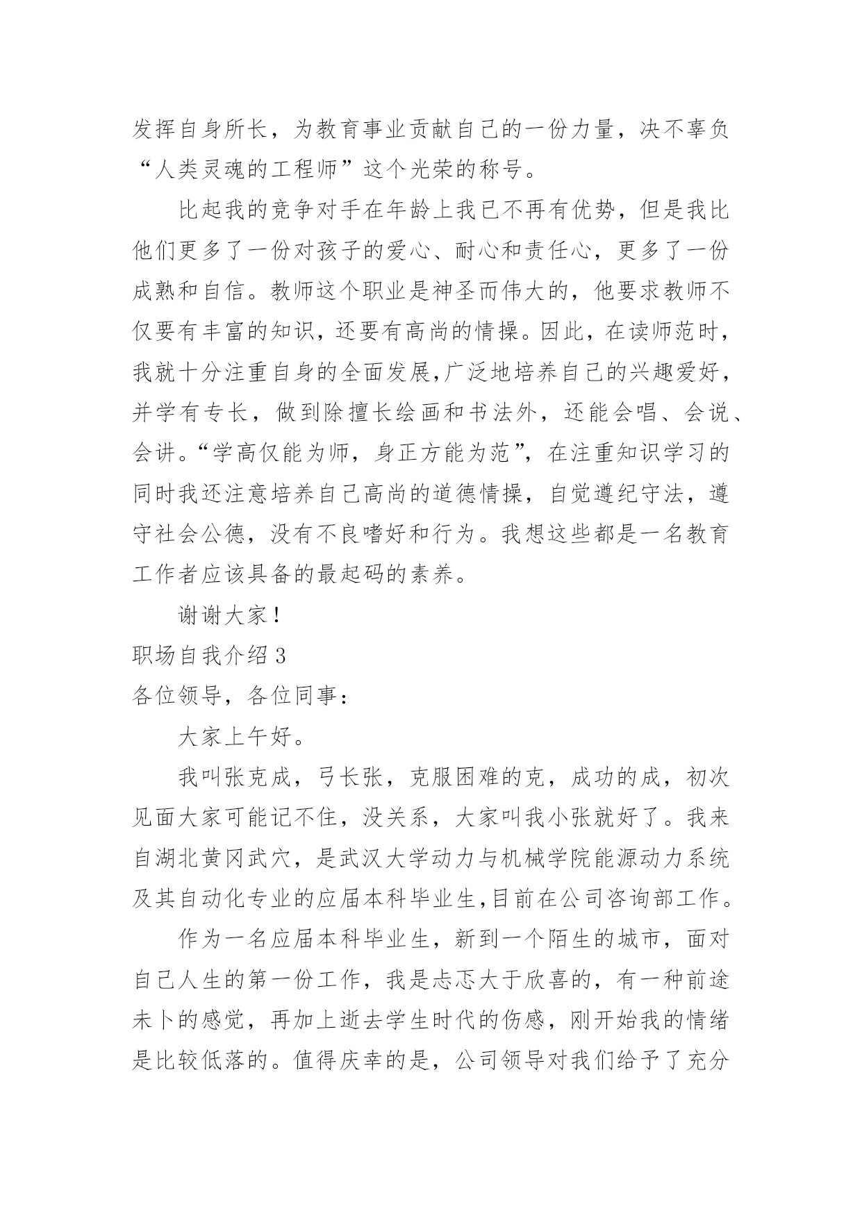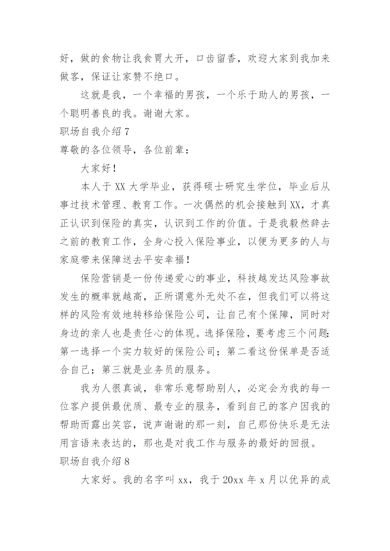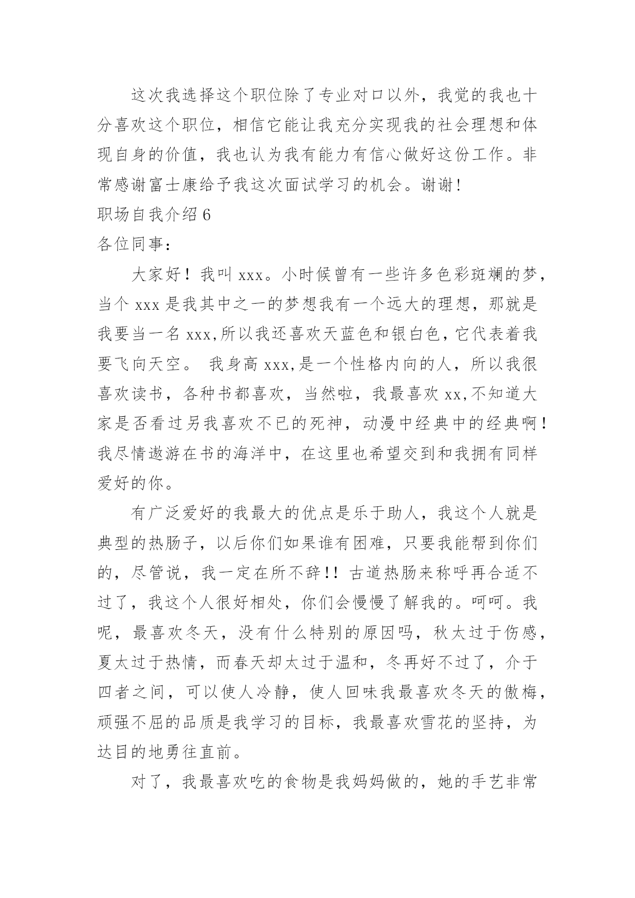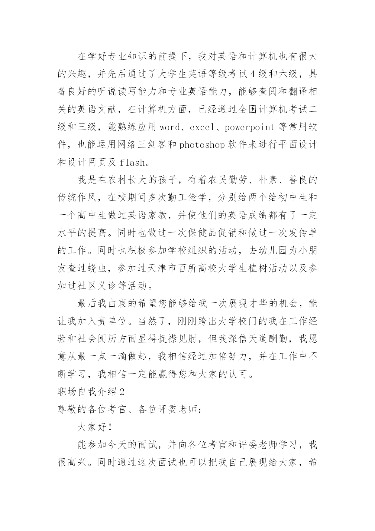 职场自我介绍【精】职场自我介绍当进入一个陌生环境,我们通常会被要求作自我介绍,自我介绍是结识新朋友的重要手段。那么自我介绍有什么格式呢?以下是小编为大家整理的职场自我介绍,希望能够帮助到大家。职场自我介绍1各位面试老师好:我叫刘xx,是xx省xx市人,xx医科大学医学检验的系的学生,将于200x年7月份毕业,并获得学士学位。医学检验是一门对动手能力要求较高的学科,所以,在校期间,除了医学基础课和专业课理论的学习,我们还被安排了大量的实验课,其中临床检验、微生物检验、生化检验、免疫学检验等专业课,他们的实验课比理论课还要多,这些既使我们对理论有了更深的理解和掌握,更重要的是使我们有了熟练的动手操作能力。我在随后的xx市第一中心医院检验科实习期间,很快就得到了代教老师的认可和信任,而肯放开手让我独立操作仪器和独立进行实验,我也就更加积极主动地去做得更好,遇到不明白的问题及时地向老师请教。等到实习结束时已经熟知了检验科的工作流程和具备了大多实验的独立操作能力。在学好专业知识的前提下,我对英语和计算机也有很大的兴趣,并先后通过了大学生英语等级考试4级和六级,具备良好的听说读写能力和专业英语能力,能够查阅和翻译相关的英语文献,在计算机方面,已经通过全国计算机考试二级和三级,能熟练应用word、excel、powerpoint等常用软件,也能运用网络三剑客和photoshop软件来进行平面设计和设计网页及flash。我是在农村长大的孩子,有着农民勤劳、朴素、善良的传统作风,在校期间多次勤工俭学,分别给两个给初中生和一个高中生做过英语家教,并使他们的英语成绩都有了一定水平的提高。同时也做过一次保健品促销和做过一次发传单的工作。同时也积极参加学校组织的活动,去幼儿园为小朋友查过蛲虫,参加过天津市百所高校大学生植树活动以及参加过社区义诊等活动。最后我由衷的希望您能够给我一次展现才华的机会,能让我加入贵单位。当然了,刚刚跨出大学校门的我在工作经验和社会阅历方面显得捉襟见肘,但我深信天道酬勤,我愿意从最一点一滴做起,我相信经过加倍努力,并在工作中不断学习,我相信一定能赢得您和大家的认可。职场自我介绍2尊敬的各位考官、各位评委老师:大家好!能参加今天的面试,并向各位考官和评委老师学习,我很高兴。同时通过这次面试也可以把我自己展现给大家,希望你们能记住我,下面我简单介绍我的基本情况。我叫xx,今年x岁。毕业于xxx。我性格活泼开朗,大方热情,乐于助人,平时喜欢阅读、看书和上网流览信息。我曾经在学校参加过教学实习,在实习期间我严格按照正式老师的标准来要求自己,进行语文教学和班级管理。我深入学生,和他们相处融洽,和他们一起布置文明教室,开主题班会,组织大家开展篮球赛,参与诗歌朗诵比赛等,学习了语文教学的各种知识,掌握了一定的中学语文教学技巧,也对班主任工作和学生工作有了一定的认识,找到了自己的管理班级的一套方法。同时,在实习当中,身边教师无私奉献的精神和天真、求知若渴的学生们勤奋的学习态度深深地感染了我。我也深深体会到了作为一名“人类灵魂的工程师”的乐趣和重要意义,更加坚定了自己做一名教师的决心,成为一名教师也成了我的愿望。教师这个职业是神圣而伟大的,他要求教师不仅要有丰富的知识,还要有高尚的情操。为了成为一名教师,我在自己掌握了专业知识的基础上,不断拓展自己的各种能力,培养自己的爱心、责任心和耐心,创新能力、竞争能力和分析、处理问题的能力,并参与各种活动,广泛培养自己的兴趣爱好,并学有专长,做到除擅长写作和气排球外,还能会唱、会说、会讲。“学高仅能为师,身正方能为范”,在注重知识学习的同时我还注意培养自身的道德情操,自觉遵纪守法,遵守社会公德。使自己具有一名教育工作者应该具备的最起码的素养。如果,我通过了面试,成为该校教师队伍中的成员,我将继续虚心学习,努力工作,发挥自身所长,为教育事业贡献自己的一份力量,决不辜负“人类灵魂的工程师”这个光荣的称号。比起我的竞争对手在年龄上我已不再有优势,但是我比他们更多了一份对孩子的爱心、耐心和责任心,更多了一份成熟和自信。教师这个职业是神圣而伟大的,他要求教师不仅要有丰富的知识,还要有高尚的情操。因此,在读师范时,我就十分注重自身的全面发展,广泛地培养自己的兴趣爱好,并学有专长,做到除擅长绘画和书法外,还能会唱、会说、会讲。“学高仅能为师,身正方能为范”,在注重知识学习的同时我还注意培养自己高尚的道德情操,自觉遵纪守法,遵守社会公德,没有不良嗜好和行为。我想这些都是一名教育工作者应该具备的最起码的素养。谢谢大家!职场自我介绍3各位领导,各位同事:大家上午好。我叫张克成,弓长张,克服困难的克,成功的成,初次见面大家可能记不住,没关系,大家叫我小张就好了。我来自湖北黄冈武穴,是武汉大学动力与机械学院能源动力系统及其自