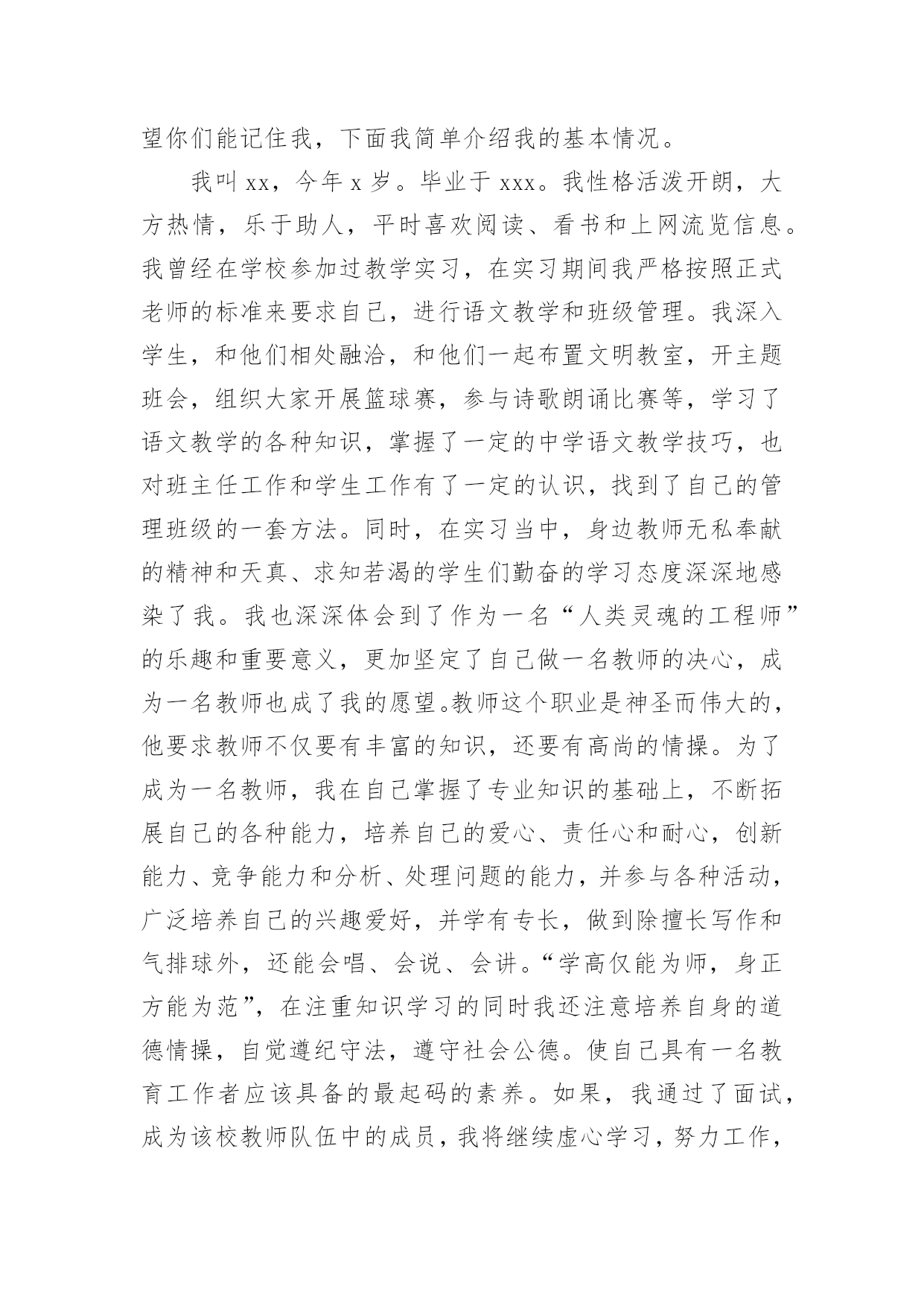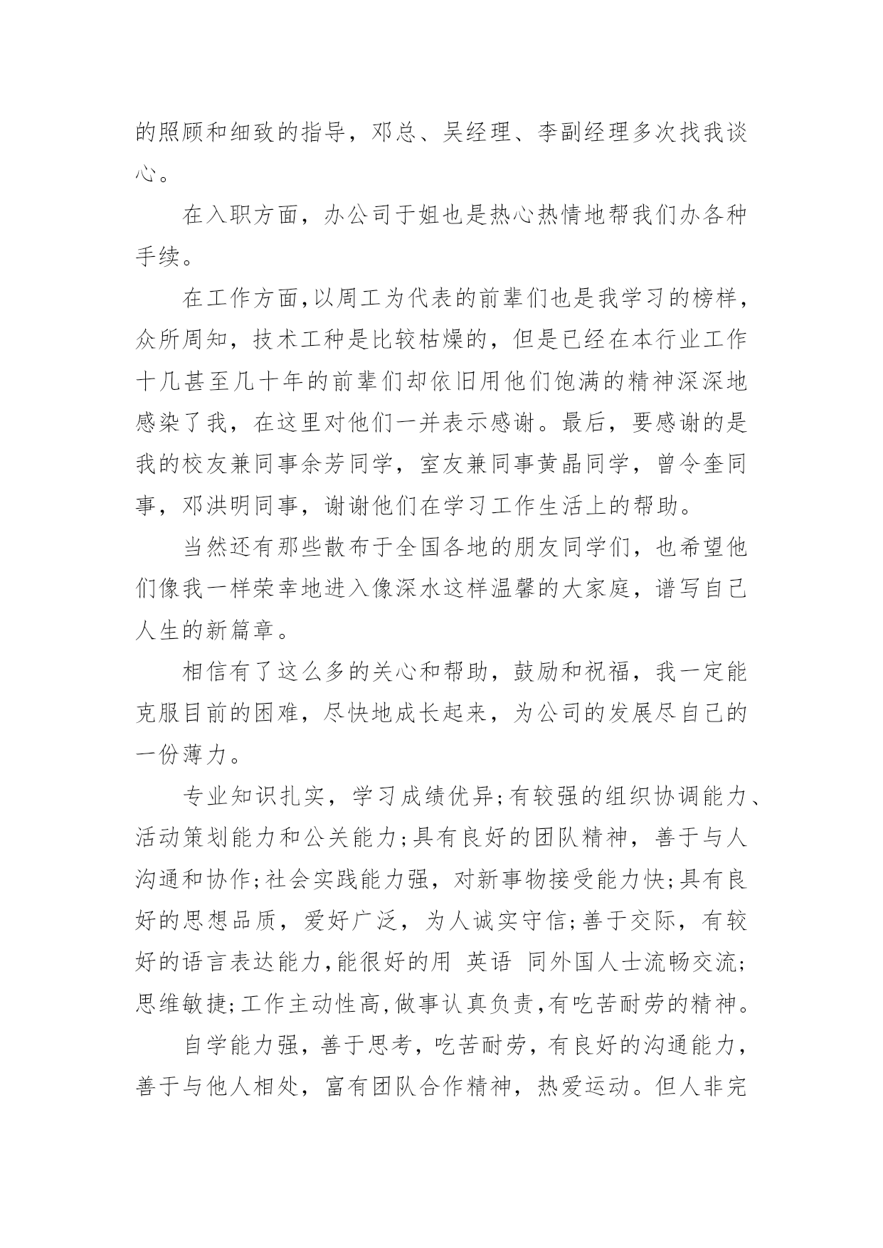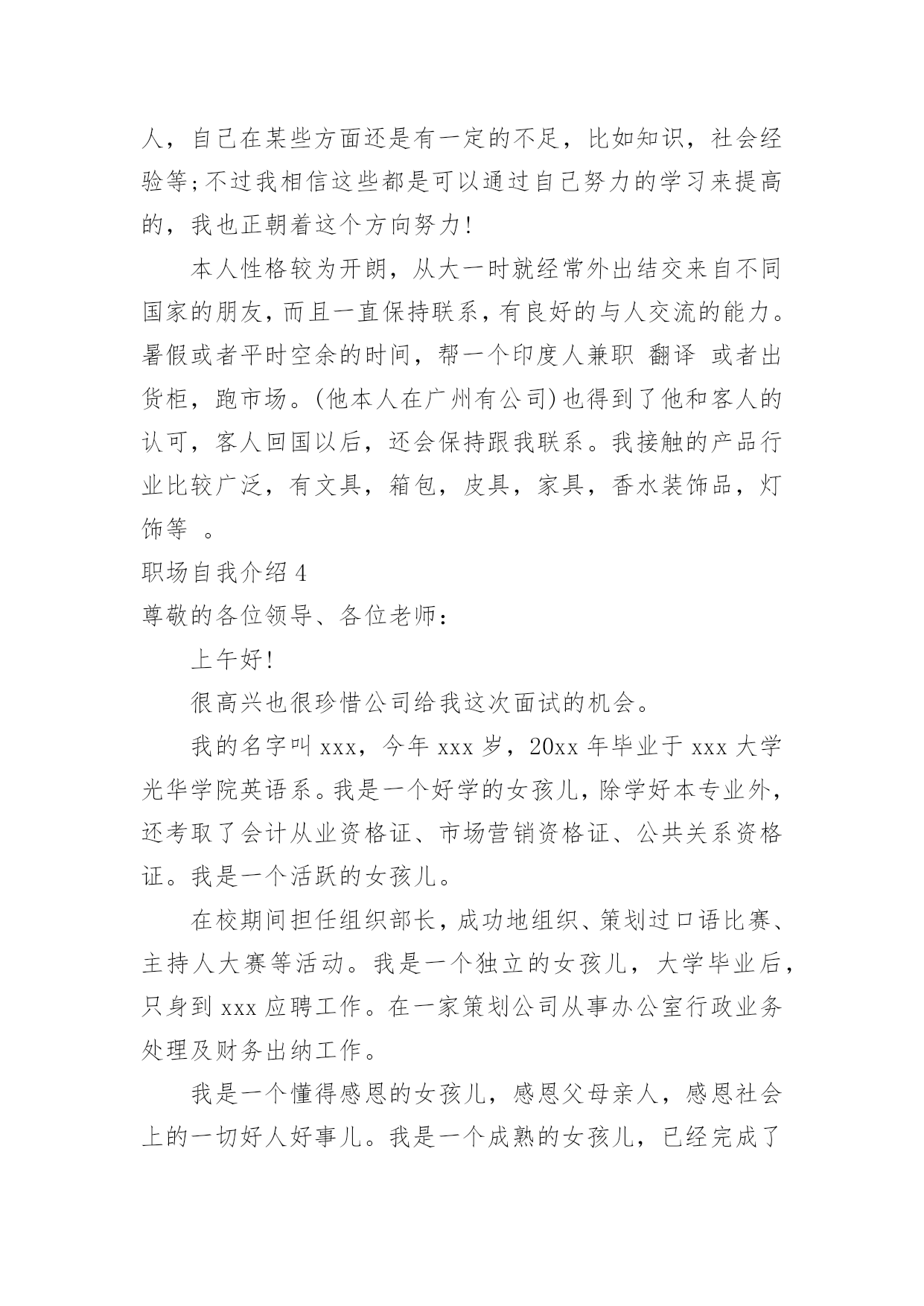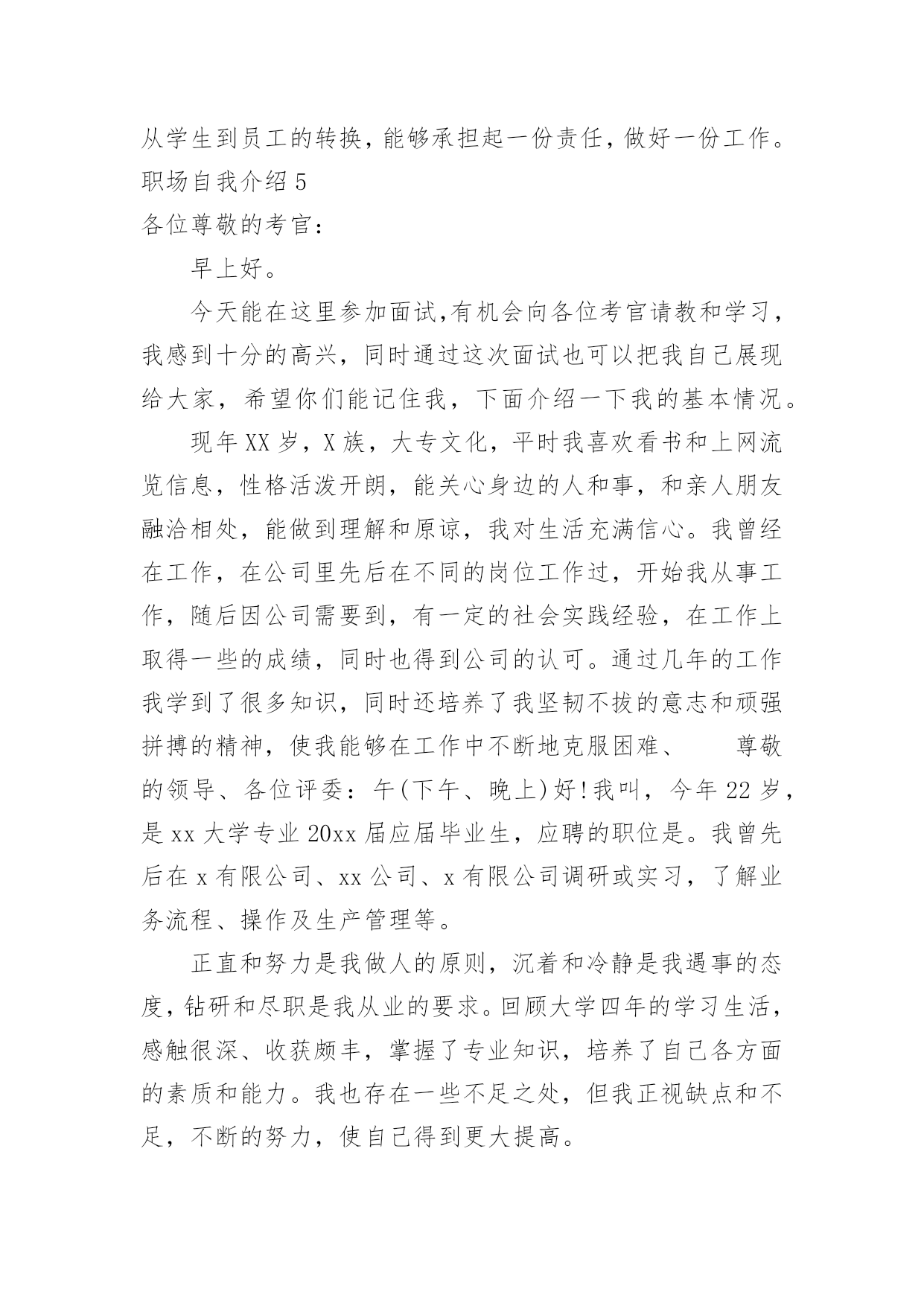 职场自我介绍【精】职场自我介绍当进入一个陌生环境,我们通常会被要求作自我介绍,自我介绍是结识新朋友的重要手段。那么自我介绍有什么格式呢?以下是小编为大家整理的职场自我介绍,希望能够帮助到大家。职场自我介绍1各位面试老师好:我叫刘xx,是xx省xx市人,xx医科大学医学检验的系的学生,将于200x年7月份毕业,并获得学士学位。医学检验是一门对动手能力要求较高的学科,所以,在校期间,除了医学基础课和专业课理论的学习,我们还被安排了大量的实验课,其中临床检验、微生物检验、生化检验、免疫学检验等专业课,他们的实验课比理论课还要多,这些既使我们对理论有了更深的理解和掌握,更重要的是使我们有了熟练的动手操作能力。我在随后的xx市第一中心医院检验科实习期间,很快就得到了代教老师的认可和信任,而肯放开手让我独立操作仪器和独立进行实验,我也就更加积极主动地去做得更好,遇到不明白的问题及时地向老师请教。等到实习结束时已经熟知了检验科的工作流程和具备了大多实验的独立操作能力。在学好专业知识的前提下,我对英语和计算机也有很大的兴趣,并先后通过了大学生英语等级考试4级和六级,具备良好的听说读写能力和专业英语能力,能够查阅和翻译相关的英语文献,在计算机方面,已经通过全国计算机考试二级和三级,能熟练应用word、excel、powerpoint等常用软件,也能运用网络三剑客和photoshop软件来进行平面设计和设计网页及flash。我是在农村长大的孩子,有着农民勤劳、朴素、善良的传统作风,在校期间多次勤工俭学,分别给两个给初中生和一个高中生做过英语家教,并使他们的英语成绩都有了一定水平的提高。同时也做过一次保健品促销和做过一次发传单的工作。同时也积极参加学校组织的活动,去幼儿园为小朋友查过蛲虫,参加过天津市百所高校大学生植树活动以及参加过社区义诊等活动。最后我由衷的希望您能够给我一次展现才华的机会,能让我加入贵单位。当然了,刚刚跨出大学校门的我在工作经验和社会阅历方面显得捉襟见肘,但我深信天道酬勤,我愿意从最一点一滴做起,我相信经过加倍努力,并在工作中不断学习,我相信一定能赢得您和大家的认可。职场自我介绍2尊敬的各位考官、各位评委老师:大家好!能参加今天的面试,并向各位考官和评委老师学习,我很高兴。同时通过这次面试也可以把我自己展现给大家,希望你们能记住我,下面我简单介绍我的基本情况。我叫xx,今年x岁。毕业于xxx。我性格活泼开朗,大方热情,乐于助人,平时喜欢阅读、看书和上网流览信息。我曾经在学校参加过教学实习,在实习期间我严格按照正式老师的标准来要求自己,进行语文教学和班级管理。我深入学生,和他们相处融洽,和他们一起布置文明教室,开主题班会,组织大家开展篮球赛,参与诗歌朗诵比赛等,学习了语文教学的各种知识,掌握了一定的中学语文教学技巧,也对班主任工作和学生工作有了一定的认识,找到了自己的管理班级的一套方法。同时,在实习当中,身边教师无私奉献的精神和天真、求知若渴的学生们勤奋的学习态度深深地感染了我。我也深深体会到了作为一名“人类灵魂的工程师”的乐趣和重要意义,更加坚定了自己做一名教师的决心,成为一名教师也成了我的愿望。教师这个职业是神圣而伟大的,他要求教师不仅要有丰富的知识,还要有高尚的情操。为了成为一名教师,我在自己掌握了专业知识的基础上,不断拓展自己的各种能力,培养自己的爱心、责任心和耐心,创新能力、竞争能力和分析、处理问题的能力,并参与各种活动,广泛培养自己的兴趣爱好,并学有专长,做到除擅长写作和气排球外,还能会唱、会说、会讲。“学高仅能为师,身正方能为范”,在注重知识学习的同时我还注意培养自身的道德情操,自觉遵纪守法,遵守社会公德。使自己具有一名教育工作者应该具备的最起码的素养。如果,我通过了面试,成为该校教师队伍中的成员,我将继续虚心学习,努力工作,发挥自身所长,为教育事业贡献自己的一份力量,决不辜负“人类灵魂的工程师”这个光荣的称号。比起我的竞争对手在年龄上我已不再有优势,但是我比他们更多了一份对孩子的爱心、耐心和责任心,更多了一份成熟和自信。教师这个职业是神圣而伟大的,他要求教师不仅要有丰富的知识,还要有高尚的情操。因此,在读师范时,我就十分注重自身的全面发展,广泛地培养自己的兴趣爱好,并学有专长,做到除擅长绘画和书法外,还能会唱、会说、会讲。“学高仅能为师,身正方能为范”,在注重知识学习的同时我还注意培养自己高尚的道德情操,自觉遵纪守法,遵守社会公德,没有不良嗜好和行为。我想这些都是一名教育工作者应该具备的最起码的素养。谢谢大家!职场自我介绍3各位领导,各位同事:大家上午好。我叫张克成,弓长张,克服困难的克,成功的成,初次见面大家可能记不住,没关系,大家叫我小张就好了。我来自湖北黄冈武穴,是武汉大学动力与机械学院能源动力系统及其自