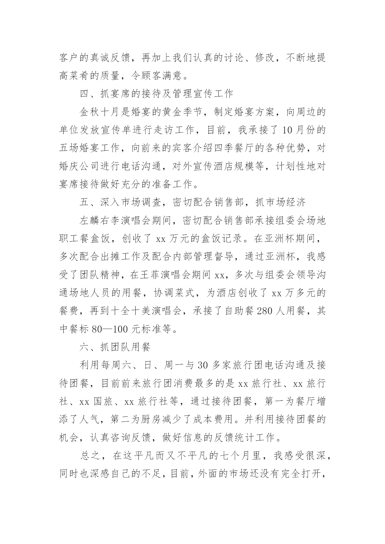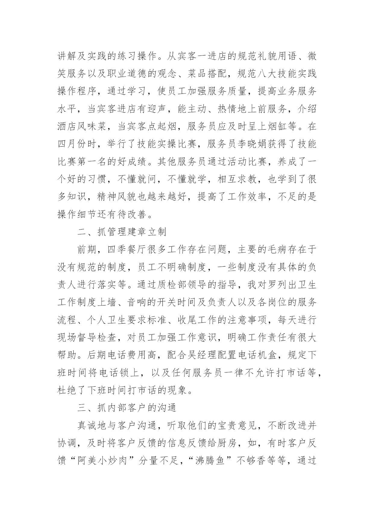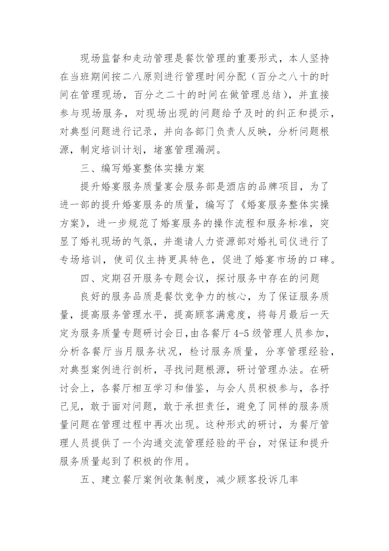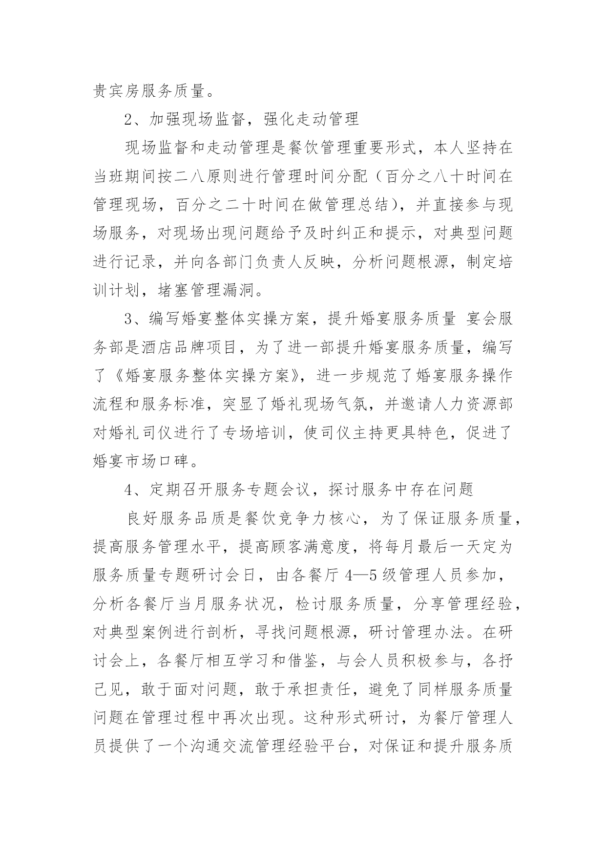 酒店餐厅运营经理个人年终工作总结总结是事后对某一阶段的学习、工作或其完成情况加以回顾和分析的一种书面材料,它有助于我们寻找工作和事物发展的规律,从而掌握并运用这些规律,让我们好好写一份总结吧。你所见过的总结应该是什么样的?下面是小编精心整理的酒店餐厅运营经理个人年终工作总结,欢迎大家分享。酒店餐厅运营经理个人年终工作总结1本年度餐厅以以提升服务品质为核心,加强服务品质工程建设餐饮服务品质的建设,是一个庞大的系统工程,是餐饮管理实力的综合体现,20xx年度,在对各运作部门的日常管理及服务品质建设方面开展了以下工作:一、编写操作规程,提升服务质量根据餐饮部各个部门的实际运作状况,编写了《宴会服务操作规范》、《青叶庭服务操作规范》、《西餐厅服务操作规范》、《酒吧服务操作规范》、《管事部服务操作规范》等。统一了各部门的服务标准,为各部门培训、检查、监督、考核确立了标准和依据,规范了员工服务操作。同时根据贵宾房的服务要求,编写了贵宾房服务接待流程,从咨客接待、语言要求、席间服务、酒水推销、卫生标准、物品准备、环境布置、视听效果、能源节约等方面作了明确详细的规定,促进了贵宾房的`服务质量。二、加强现场监督,强化走动管理现场监督和走动管理是餐饮管理的重要形式,本人坚持在当班期间按二八原则进行管理时间分配(百分之八十的时间在管理现场,百分之二十的时间在做管理总结),并直接参与现场服务,对现场出现的问题给予及时的纠正和提示,对典型问题进行记录,并向各部门负责人反映,分析问题根源,制定培训计划,堵塞管理漏洞。三、编写婚宴整体实操方案提升婚宴服务质量宴会服务部是酒店的品牌项目,为了进一部的提升婚宴服务的质量,编写了《婚宴服务整体实操方案》,进一步规范了婚宴服务的操作流程和服务标准,突显了婚礼现场的气氛,并邀请人力资源部对婚礼司仪进行了专场培训,使司仪主持更具特色,促进了婚宴市场的口碑。四、定期召开服务专题会议,探讨服务中存在的问题良好的服务品质是餐饮竞争力的核心,为了保证服务质量,提高服务管理水平,提高顾客满意度,将每月最后一天定为服务质量专题研讨会日,由各餐厅4-5级管理人员参加,分析各餐厅当月服务状况,检讨服务质量,分享管理经验,对典型案例进行剖析,寻找问题根源,研讨管理办法。在研讨会上,各餐厅相互学习和借鉴,与会人员积极参与,各抒己见,敢于面对问题,敢于承担责任,避免了同样的服务质量问题在管理过程中再次出现。这种形式的研讨,为餐厅管理人员提供了一个沟通交流管理经验的平台,对保证和提升服务质量起到了积极的作用。五、建立餐厅案例收集制度,减少顾客投诉几率本年度餐饮部在各餐厅实施餐饮案例收集制度,收集各餐厅顾客对服务质量、出品质量等方面的投诉,热门思想汇报作为改善管理和评估各部门管理人员管理水平的重要依据,各餐厅管理人员对收集的案例进行分析总结,针对问题拿出解决方案,使管理更具针对性,减少了顾客的投诉几率。为了配合酒店15周年庆典,餐饮部8月份组织各餐厅举行了首届餐饮服务技能暨餐饮知识竞赛,编写了竞赛实操方案,经过一个多月的准备和预赛,在人力资源部、行政部的大力支持下,取得了成功,得到上级领导的肯定,充分展示了餐饮部娴熟的服务技能和过硬的基本功,增强了团队的凝聚力,鼓舞了员工士气,达到了预期的目的。酒店餐厅运营经理个人年终工作总结2回顾这20xx年的工作,我在领导及各位同事的支持与帮助下,严格要求自己,按照西餐厅的要求较好地完成了自己的本职工作,通过xx年的学习,工作方式有了较大的改变,工作质量有了新的提升,现将xx年来的工作情况总结如下:一、加强自身学习,提高业务水平要做到优秀,自己的学识,能力等还有一定距离,所以总不敢掉以轻心,向书本,向领导,向同事学习,这样下来感觉自己xx年来还是有了一定的进步,在管理能力,协调能力及处理问题等方面,有了进一步的提高,保证了餐厅各项工作的正常运行。二、日常管理工作作为一名餐饮部的一份子,自己扮演的角色是承上启下,协调左右的作用,我们每天面对的是繁杂琐碎的、有着挑战性的工作。xx年在饮和厅的`工作中,各项工作都是本着提高服务质量,提高工作效率为目的,让工作有条理性,融入到每一项工作当中。努力配合主管做好餐厅的管理工作,本着实事求是原则,做到上情下达,下情上报。本餐厅的宴会接待任务比较重,xx年多次接待了重要宾客及宴会,但由于种种原因质量和效率跟不上,这就要求自我强化工作意识,注意加快工作节奏,提高工作效率,力求周全,准确避免疏漏和差错。三、明年工作计划1、明确开发的方向根据饭店餐厅的经营接待性质,新品开发方向主要以精品、精致为主,体现出饭店的档次;2、确保完成任务(1)、主管对开发工作要及时安排组织,落实任务指标,要早做准备。必须按时完成任务,不能拖延滞后。(2)、主管、领班必须以身作则,带头创新,不仅要完