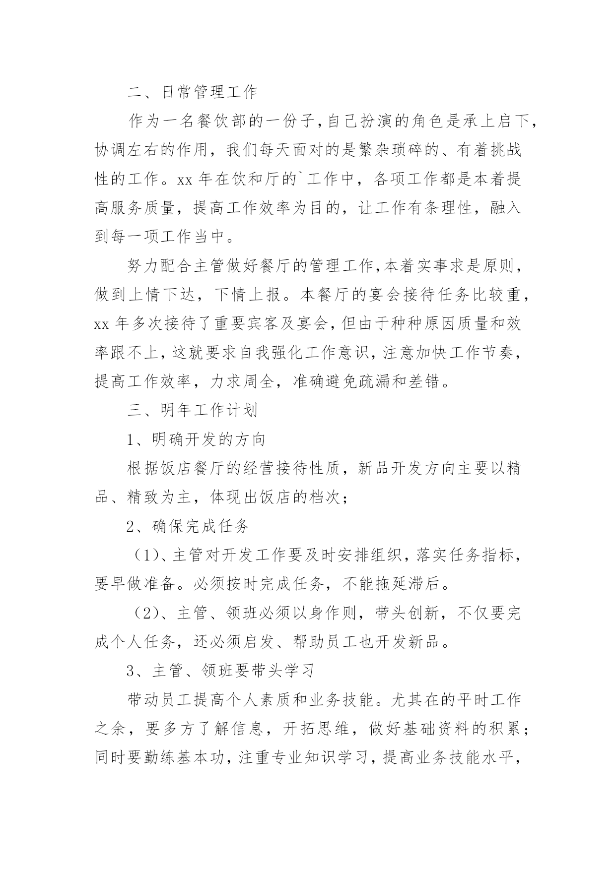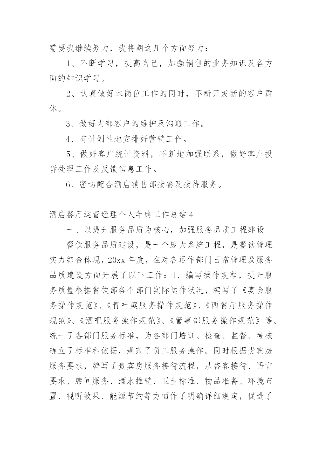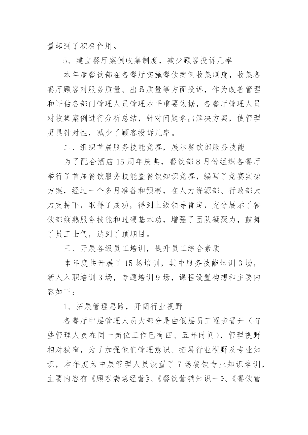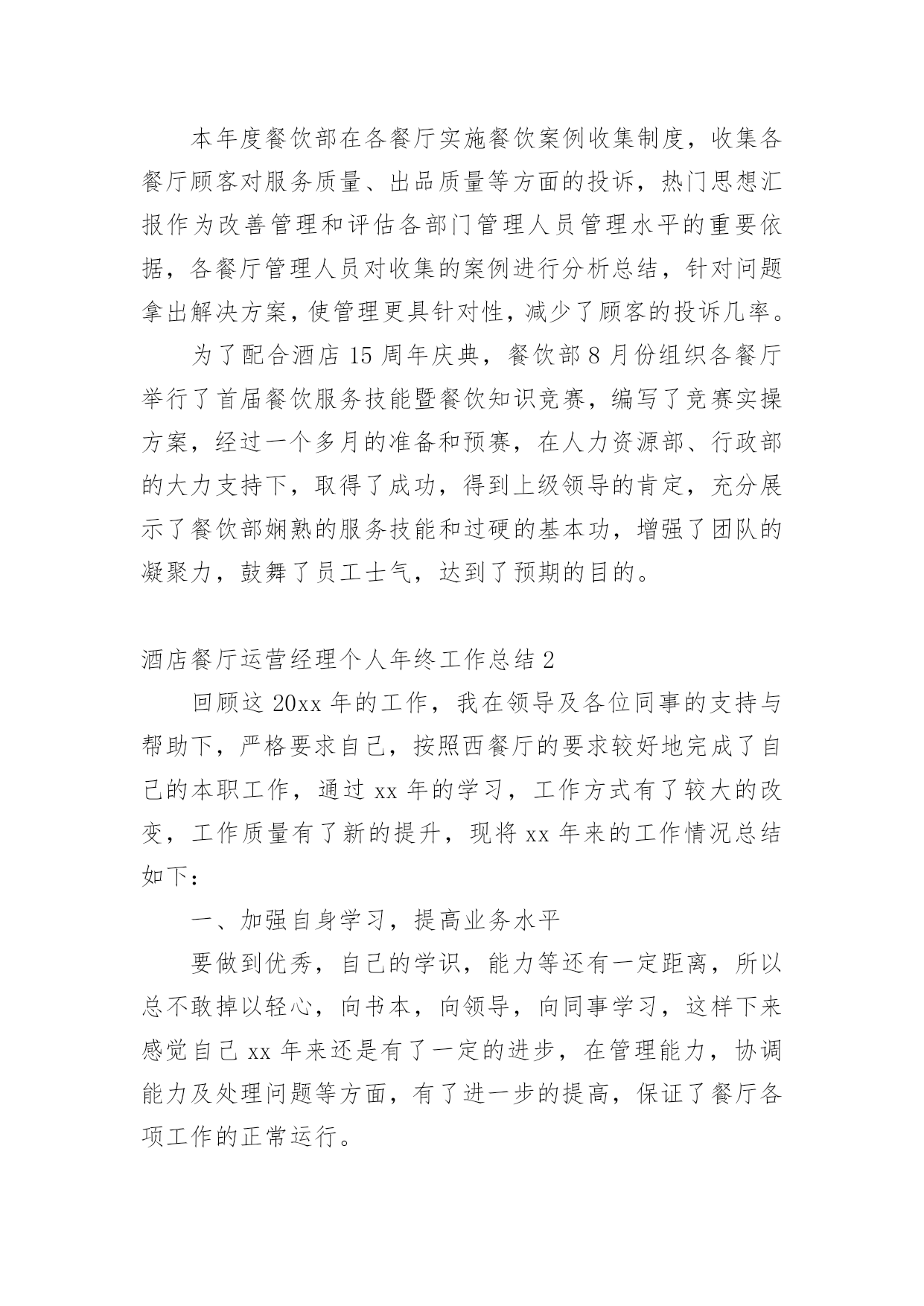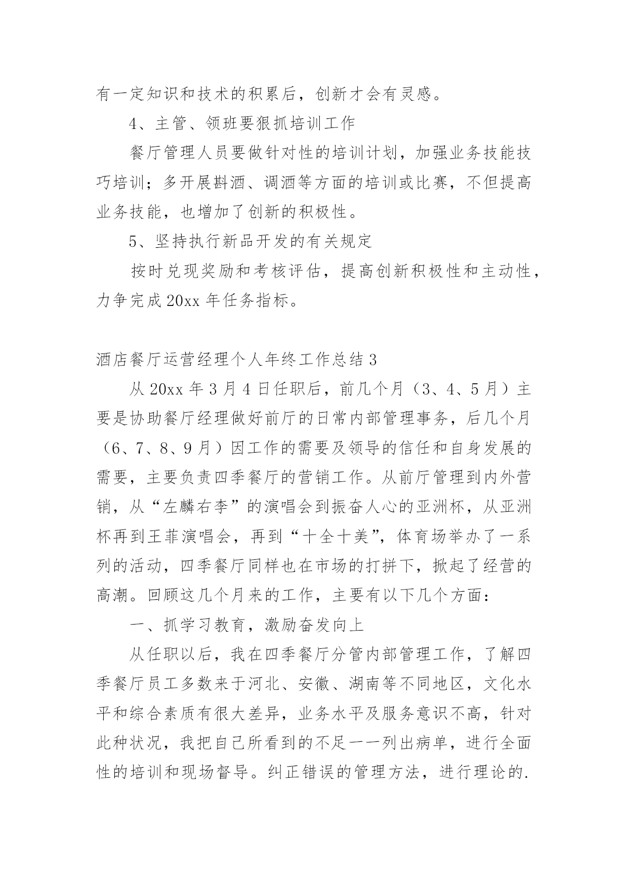 酒店餐厅运营经理个人年终工作总结总结是事后对某一阶段的学习、工作或其完成情况加以回顾和分析的一种书面材料,它有助于我们寻找工作和事物发展的规律,从而掌握并运用这些规律,让我们好好写一份总结吧。你所见过的总结应该是什么样的?下面是小编精心整理的酒店餐厅运营经理个人年终工作总结,欢迎大家分享。酒店餐厅运营经理个人年终工作总结1本年度餐厅以以提升服务品质为核心,加强服务品质工程建设餐饮服务品质的建设,是一个庞大的系统工程,是餐饮管理实力的综合体现,20xx年度,在对各运作部门的日常管理及服务品质建设方面开展了以下工作:一、编写操作规程,提升服务质量根据餐饮部各个部门的实际运作状况,编写了《宴会服务操作规范》、《青叶庭服务操作规范》、《西餐厅服务操作规范》、《酒吧服务操作规范》、《管事部服务操作规范》等。统一了各部门的服务标准,为各部门培训、检查、监督、考核确立了标准和依据,规范了员工服务操作。同时根据贵宾房的服务要求,编写了贵宾房服务接待流程,从咨客接待、语言要求、席间服务、酒水推销、卫生标准、物品准备、环境布置、视听效果、能源节约等方面作了明确详细的规定,促进了贵宾房的`服务质量。二、加强现场监督,强化走动管理现场监督和走动管理是餐饮管理的重要形式,本人坚持在当班期间按二八原则进行管理时间分配(百分之八十的时间在管理现场,百分之二十的时间在做管理总结),并直接参与现场服务,对现场出现的问题给予及时的纠正和提示,对典型问题进行记录,并向各部门负责人反映,分析问题根源,制定培训计划,堵塞管理漏洞。三、编写婚宴整体实操方案提升婚宴服务质量宴会服务部是酒店的品牌项目,为了进一部的提升婚宴服务的质量,编写了《婚宴服务整体实操方案》,进一步规范了婚宴服务的操作流程和服务标准,突显了婚礼现场的气氛,并邀请人力资源部对婚礼司仪进行了专场培训,使司仪主持更具特色,促进了婚宴市场的口碑。四、定期召开服务专题会议,探讨服务中存在的问题良好的服务品质是餐饮竞争力的核心,为了保证服务质量,提高服务管理水平,提高顾客满意度,将每月最后一天定为服务质量专题研讨会日,由各餐厅4-5级管理人员参加,分析各餐厅当月服务状况,检讨服务质量,分享管理经验,对典型案例进行剖析,寻找问题根源,研讨管理办法。在研讨会上,各餐厅相互学习和借鉴,与会人员积极参与,各抒己见,敢于面对问题,敢于承担责任,避免了同样的服务质量问题在管理过程中再次出现。这种形式的研讨,为餐厅管理人员提供了一个沟通交流管理经验的平台,对保证和提升服务质量起到了积极的作用。五、建立餐厅案例收集制度,减少顾客投诉几率本年度餐饮部在各餐厅实施餐饮案例收集制度,收集各餐厅顾客对服务质量、出品质量等方面的投诉,热门思想汇报作为改善管理和评估各部门管理人员管理水平的重要依据,各餐厅管理人员对收集的案例进行分析总结,针对问题拿出解决方案,使管理更具针对性,减少了顾客的投诉几率。为了配合酒店15周年庆典,餐饮部8月份组织各餐厅举行了首届餐饮服务技能暨餐饮知识竞赛,编写了竞赛实操方案,经过一个多月的准备和预赛,在人力资源部、行政部的大力支持下,取得了成功,得到上级领导的肯定,充分展示了餐饮部娴熟的服务技能和过硬的基本功,增强了团队的凝聚力,鼓舞了员工士气,达到了预期的目的。酒店餐厅运营经理个人年终工作总结2回顾这20xx年的工作,我在领导及各位同事的支持与帮助下,严格要求自己,按照西餐厅的要求较好地完成了自己的本职工作,通过xx年的学习,工作方式有了较大的改变,工作质量有了新的提升,现将xx年来的工作情况总结如下:一、加强自身学习,提高业务水平要做到优秀,自己的学识,能力等还有一定距离,所以总不敢掉以轻心,向书本,向领导,向同事学习,这样下来感觉自己xx年来还是有了一定的进步,在管理能力,协调能力及处理问题等方面,有了进一步的提高,保证了餐厅各项工作的正常运行。二、日常管理工作作为一名餐饮部的一份子,自己扮演的角色是承上启下,协调左右的作用,我们每天面对的是繁杂琐碎的、有着挑战性的工作。xx年在饮和厅的`工作中,各项工作都是本着提高服务质量,提高工作效率为目的,让工作有条理性,融入到每一项工作当中。努力配合主管做好餐厅的管理工作,本着实事求是原则,做到上情下达,下情上报。本餐厅的宴会接待任务比较重,xx年多次接待了重要宾客及宴会,但由于种种原因质量和效率跟不上,这就要求自我强化工作意识,注意加快工作节奏,提高工作效率,力求周全,准确避免疏漏和差错。三、明年工作计划1、明确开发的方向根据饭店餐厅的经营接待性质,新品开发方向主要以精品、精致为主,体现出饭店的档次;2、确保完成任务(1)、主管对开发工作要及时安排组织,落实任务指标,要早做准备。必须按时完成任务,不能拖延滞后。(2)、主管、领班必须以身作则,带头创新,不仅要完