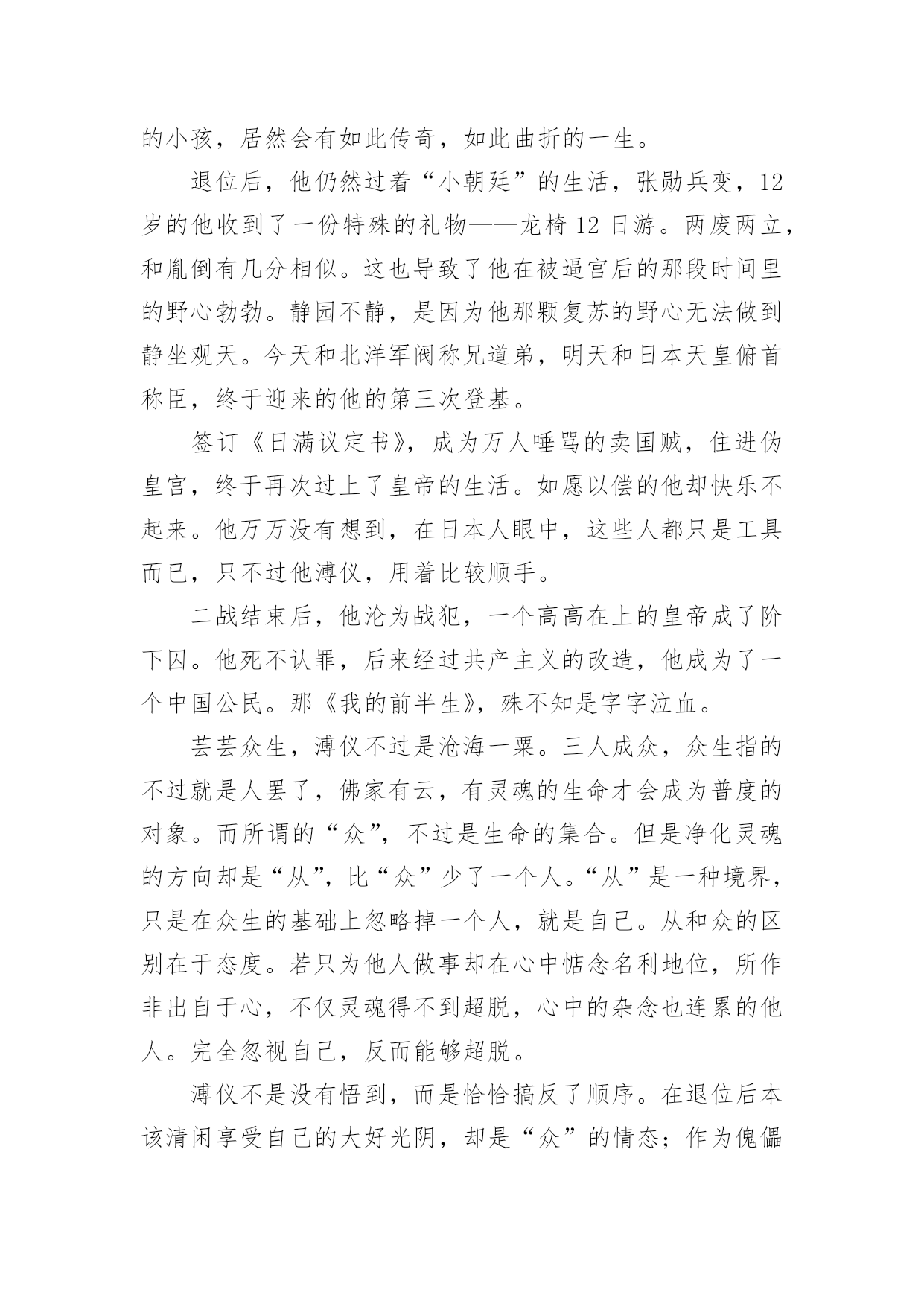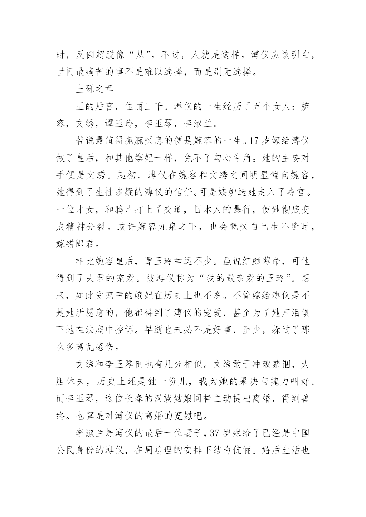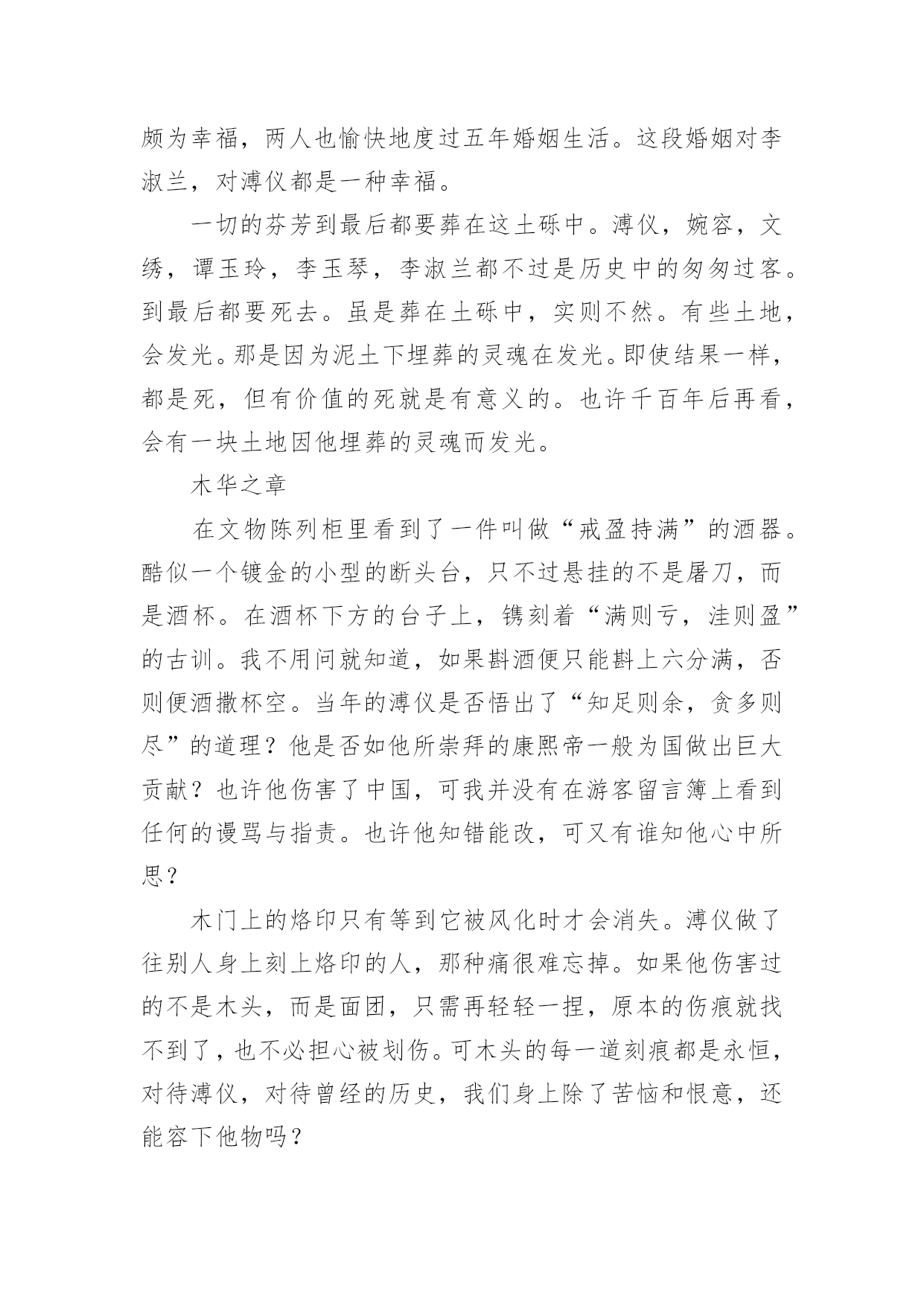 伪皇宫观后感伪皇宫观后感当认真看完一部影视作品后,相信大家的视野一定开拓了不少吧,不能光会看哦,写一篇观后感吧。那么我们该怎么去写观后感呢?下面是小编精心整理的伪皇宫观后感,欢迎阅读与收藏。序带着一身寒气和北国银装素裹的凛冽之风,我整理我的校服,佩戴好团徽,庄严坚定地走进伪满皇宫。刚刚在班车上的“笑骂成文章”的轻松早已不知何去何从,只剩下一群风华正茂的少年,列队等候。我走进了伪满皇宫。这座充满着屈辱的“伪”皇宫。1932年,日本帝国主义扶持早已退位的清末皇帝溥仪,在长春成立伪满洲政权,意图将东北三省分裂出中国大陆,一座并不奢华的伪满皇宫,蕴藏着的是傀儡的悲哀,和民族的复兴。从众之章溥仪从小便是一个傀儡,3岁登基,称宣统帝。做了隆裕太后的傀儡,三年的皇帝生涯结束于辛亥革命,隆裕太后被迫带着六岁的溥仪宣布退位。这段历史,我先从电影中和历史书中了解到,很难想象,那样一个只会吃喝玩乐哭鼻子的小孩,居然会有如此传奇,如此曲折的一生。退位后,他仍然过着“小朝廷”的生活,张勋兵变,12岁的他收到了一份特殊的礼物——龙椅12日游。两废两立,和胤倒有几分相似。这也导致了他在被逼宫后的那段时间里的野心勃勃。静园不静,是因为他那颗复苏的野心无法做到静坐观天。今天和北洋军阀称兄道弟,明天和日本天皇俯首称臣,终于迎来的他的第三次登基。签订《日满议定书》,成为万人唾骂的卖国贼,住进伪皇宫,终于再次过上了皇帝的生活。如愿以偿的他却快乐不起来。他万万没有想到,在日本人眼中,这些人都只是工具而已,只不过他溥仪,用着比较顺手。二战结束后,他沦为战犯,一个高高在上的皇帝成了阶下囚。他死不认罪,后来经过共产主义的改造,他成为了一个中国公民。那《我的前半生》,殊不知是字字泣血。芸芸众生,溥仪不过是沧海一粟。三人成众,众生指的不过就是人罢了,佛家有云,有灵魂的生命才会成为普度的对象。而所谓的“众”,不过是生命的集合。但是净化灵魂的方向却是“从”,比“众”少了一个人。“从”是一种境界,只是在众生的基础上忽略掉一个人,就是自己。从和众的区别在于态度。若只为他人做事却在心中惦念名利地位,所作非出自于心,不仅灵魂得不到超脱,心中的杂念也连累的他人。完全忽视自己,反而能够超脱。溥仪不是没有悟到,而是恰恰搞反了顺序。在退位后本该清闲享受自己的大好光阴,却是“众”的情态;作为傀儡时,反倒超脱像“从”。不过,人就是这样。溥仪应该明白,世间最痛苦的事不是难以选择,而是别无选择。土砾之章王的后宫,佳丽三千。溥仪的一生经历了五个女人:婉容,文绣,谭玉玲,李玉琴,李淑兰。若说最值得扼腕叹息的便是婉容的一生。17岁嫁给溥仪做了皇后,和其他嫔妃一样,免不了勾心斗角。她的主要对手便是文绣。起初,溥仪在婉容和文绣之间明显偏向婉容,她得到了生性多疑的溥仪的信任。可是嫉妒送她走入了冷宫。一位才女,和鸦片打上了交道,日本人的暴行,使她彻底变成精神分裂。或许婉容九泉之下,也会慨叹自己生不逢时,嫁错郎君。相比婉容皇后,谭玉玲幸运不少。虽说红颜薄命,可他得到了夫君的宠爱。被溥仪称为“我的最亲爱的玉玲”。想来,如此受宠幸的嫔妃在历史上也不多。不管嫁给溥仪是不是她所愿意的,他都得到了溥仪的宠爱,甚至为了她声泪俱下地在法庭中控诉。早逝也未必不是好事,至少,躲过了那么多离乱感伤。文绣和李玉琴倒也有几分相似。文绣敢于冲破禁锢,大胆休夫,历史上还是独一份儿,我为她的果决与魄力叫好。而李玉琴,这位长春的汉族姑娘同样主动提出离婚,得到善终。也算是对溥仪的离婚的宽慰吧。李淑兰是溥仪的最后一位妻子,37岁嫁给了已经是中国公民身份的溥仪,在周总理的安排下结为伉俪。婚后生活也颇为幸福,两人也愉快地度过五年婚姻生活。这段婚姻对李淑兰,对溥仪都是一种幸福。一切的芬芳到最后都要葬在这土砾中。溥仪,婉容,文绣,谭玉玲,李玉琴,李淑兰都不过是历史中的匆匆过客。到最后都要死去。虽是葬在土砾中,实则不然。有些土地,会发光。那是因为泥土下埋葬的灵魂在发光。即使结果一样,都是死,但有价值的死就是有意义的。也许千百年后再看,会有一块土地因他埋葬的灵魂而发光。木华之章在文物陈列柜里看到了一件叫做“戒盈持满”的酒器。酷似一个镀金的小型的断头台,只不过悬挂的不是屠刀,而是酒杯。在酒杯下方的台子上,镌刻着“满则亏,洼则盈”的古训。我不用问就知道,如果斟酒便只能斟上六分满,否则便酒撒杯空。当年的溥仪是否悟出了“知足则余,贪多则尽”的道理?他是否如他所崇拜的康熙帝一般为国做出巨大贡献?也许他伤害了中国,可我并没有在游客留言簿上看到任何的谩骂与指责。也许他知错能改,可又有谁知他心中所思?木门上的烙印只有等到它被风化时才会消失。溥仪做了往别人身上刻上烙印的人,那种痛很难忘掉。如果他伤害过的不是木头,而是面团,只需再轻轻一捏,原本的伤痕就找不到了,也不必担心被划伤。可木