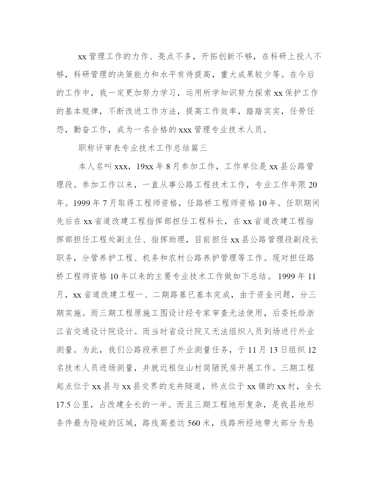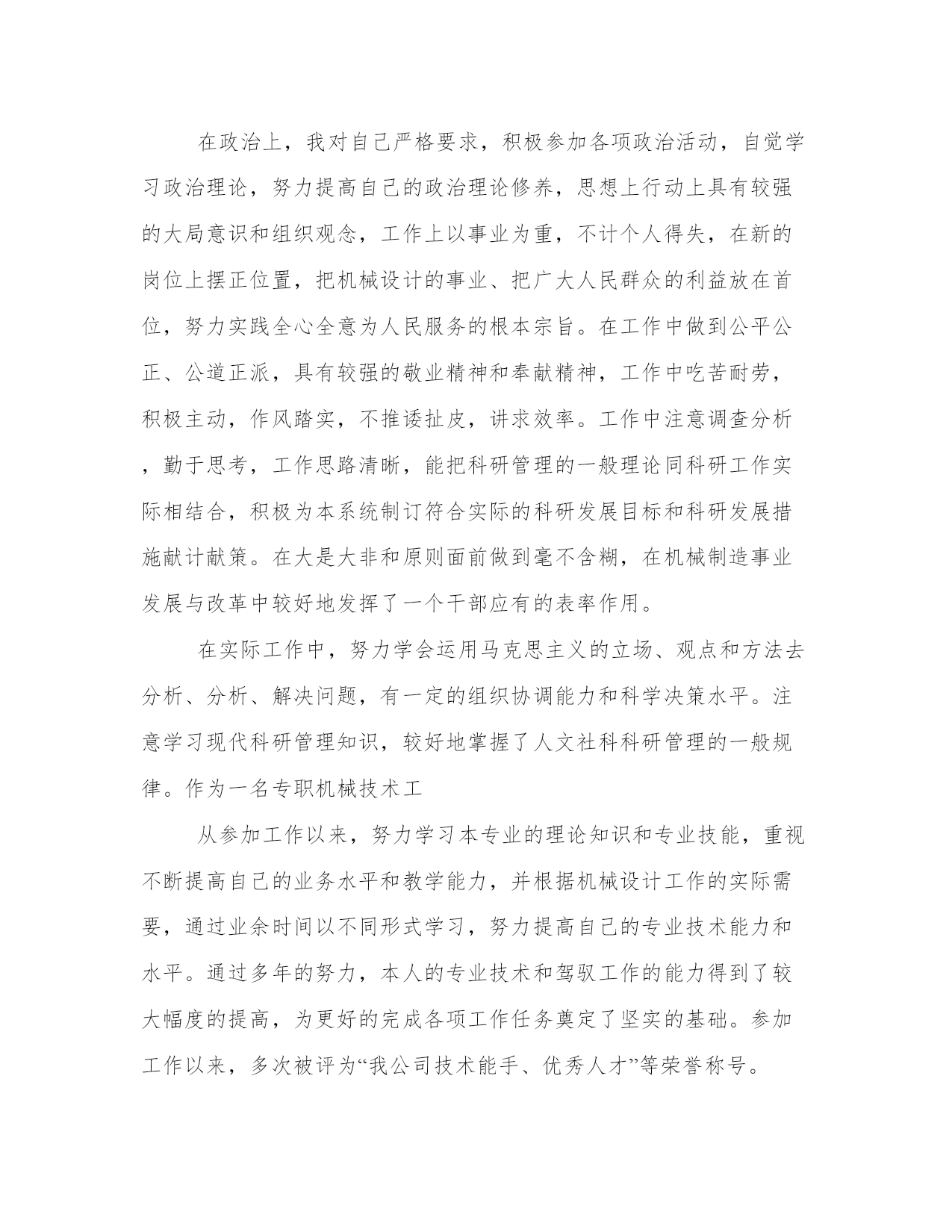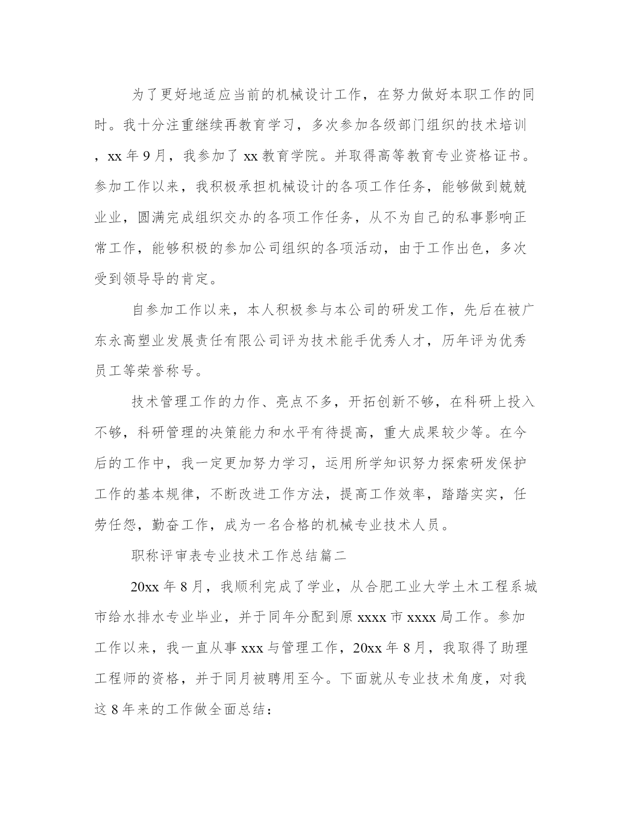 最新职称评审表专业技术工作总结(汇总8篇)当工作或学习进行到一定阶段或告一段落时,需要回过头来对所做的工作认真地分析分析一下,肯定成绩,找出问题,归纳出经验教训,提高认识,明确方向,以便进一步做好工作,并把这些用文字表述出来,就叫做总结。优秀的总结都具备一些什么特点呢?又该怎么写呢?下面是小编为大家带来的总结书优秀范文,希望大家可以喜欢。职称评审表专业技术工作总结篇一20xx年xx月,我顺利完成了学业,从吉林工程技术实验中专毕业,并于同年来到广州市花都区广东永高塑业发展有限公司工作。参加工作以来,我一直从事机械制造工作,20xx年6月,我取得了技术员的资格,并于同月被聘用至今。下面就从专业技术角度,对我这5年来的工作做一次全面总结:本人于20xx年2月正式参加工作,当时我被分配至广东永高塑业发展有限公司工作。工作伊始,我发现学校里学到的专业知识同实际工作有很大的不同和差距,为了尽快转变角色,适应工作的要求,我努力学习机械工程专业知识,努力提高自己的岗位技能,在短短的半年内,我通过自己的努力及同事的帮助,能比较熟练地进行较复杂的机械制造等日常事务工作。在政治上,我对自己严格要求,积极参加各项政治活动,自觉学习政治理论,努力提高自己的政治理论修养,思想上行动上具有较强的大局意识和组织观念,工作上以事业为重,不计个人得失,在新的岗位上摆正位置,把机械设计的事业、把广大人民群众的利益放在首位,努力实践全心全意为人民服务的根本宗旨。在工作中做到公平公正、公道正派,具有较强的敬业精神和奉献精神,工作中吃苦耐劳,积极主动,作风踏实,不推诿扯皮,讲求效率。工作中注意调查分析,勤于思考,工作思路清晰,能把科研管理的一般理论同科研工作实际相结合,积极为本系统制订符合实际的科研发展目标和科研发展措施献计献策。在大是大非和原则面前做到毫不含糊,在机械制造事业发展与改革中较好地发挥了一个干部应有的表率作用。在实际工作中,努力学会运用马克思主义的立场、观点和方法去分析、分析、解决问题,有一定的组织协调能力和科学决策水平。注意学习现代科研管理知识,较好地掌握了人文社科科研管理的一般规律。作为一名专职机械技术工从参加工作以来,努力学习本专业的理论知识和专业技能,重视不断提高自己的业务水平和教学能力,并根据机械设计工作的实际需要,通过业余时间以不同形式学习,努力提高自己的专业技术能力和水平。通过多年的努力,本人的专业技术和驾驭工作的能力得到了较大幅度的提高,为更好的完成各项工作任务奠定了坚实的基础。参加工作以来,多次被评为“我公司技术能手、优秀人才”等荣誉称号。为了更好地适应当前的机械设计工作,在努力做好本职工作的同时。我十分注重继续再教育学习,多次参加各级部门组织的技术培训,xx年9月,我参加了xx教育学院。并取得高等教育专业资格证书。参加工作以来,我积极承担机械设计的各项工作任务,能够做到兢兢业业,圆满完成组织交办的各项工作任务,从不为自己的私事影响正常工作,能够积极的参加公司组织的各项活动,由于工作出色,多次受到领导导的肯定。自参加工作以来,本人积极参与本公司的研发工作,先后在被广东永高塑业发展责任有限公司评为技术能手优秀人才,历年评为优秀员工等荣誉称号。技术管理工作的力作、亮点不多,开拓创新不够,在科研上投入不够,科研管理的决策能力和水平有待提高,重大成果较少等。在今后的工作中,我一定更加努力学习,运用所学知识努力探索研发保护工作的基本规律,不断改进工作方法,提高工作效率,踏踏实实,任劳任怨,勤奋工作,成为一名合格的机械专业技术人员。职称评审表专业技术工作总结篇二20xx年8月,我顺利完成了学业,从合肥工业大学土木工程系城市给水排水专业毕业,并于同年分配到原xxxx市xxxx局工作。参加工作以来,我一直从事xxx与管理工作,20xx年8月,我取得了助理工程师的资格,并于同月被聘用至今。下面就从专业技术角度,对我这8年来的工作做全面总结:本人于20xx年7月正式参加工作,当时我被分配至原xxxx市xxx局xx室从事xx工作。工作伊始,我发现学校里学到的专业知识同实际工作有很大的不同和差距,为了尽快转变角色,适应工作的要求,我努力学习了xx专业知识,专业技术努力提高自己的岗位技能,在短短的半年内,我通过自己的努力及同事的帮助,能比较熟练地进行较复杂的xxxx等日常事务工作。在政治上,我对自己严格要求,积极参加各项政治活动,自觉学习政治理论,尤其注重对“三个代表”重要思想的学习,努力提高自己的政治理论修养,思想上行动上同党中央保持一致。具有较强的大局意识和组织观念,工作上以事业为重,不计个人得失,在新的岗位上摆正位置,把xxxx的事业、把广大人民群众的利益放在首位,努力实践全心全意为人民服务的根本宗旨。在工作中做到公平公正、公道