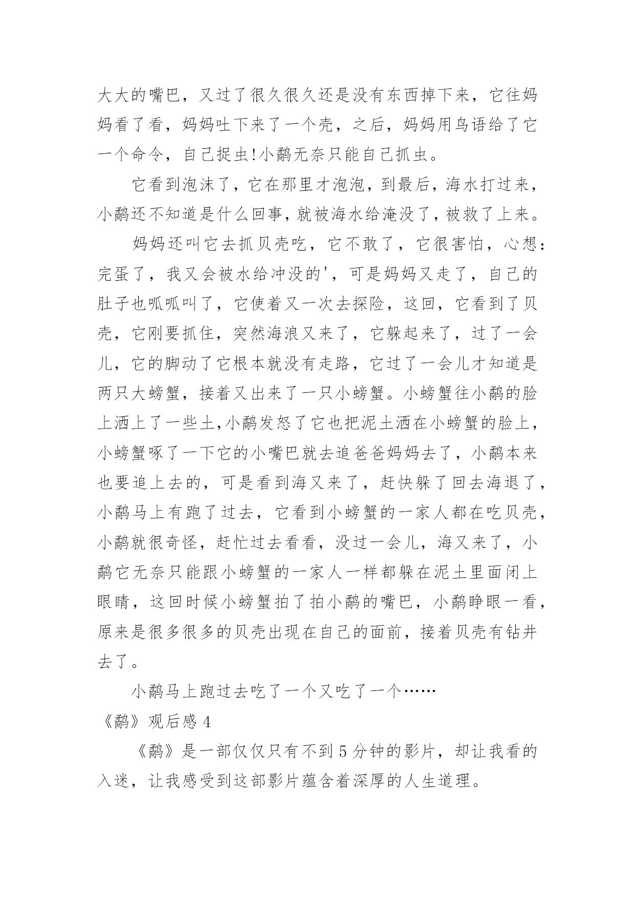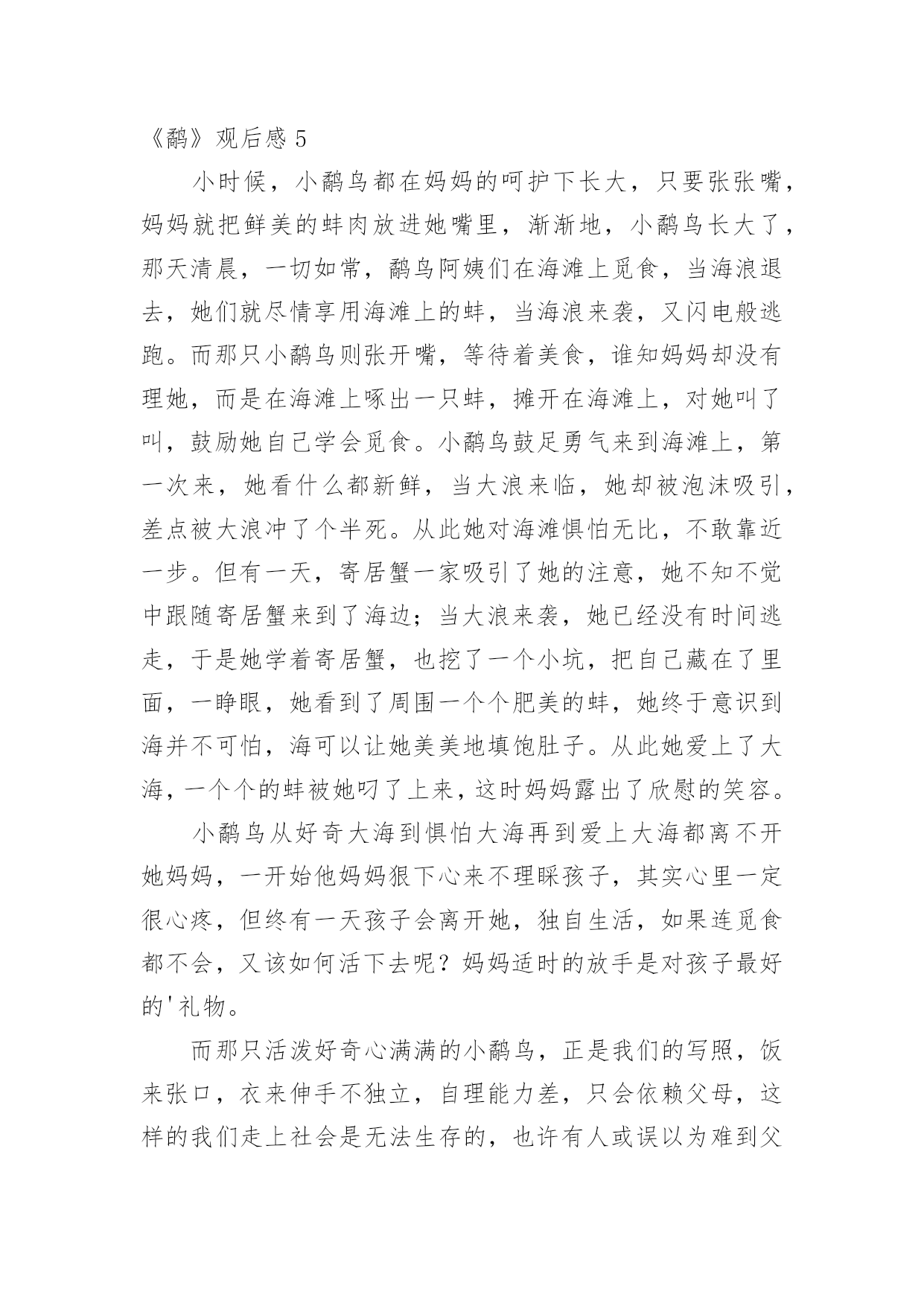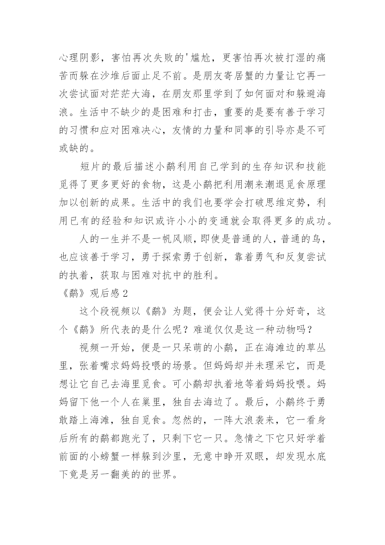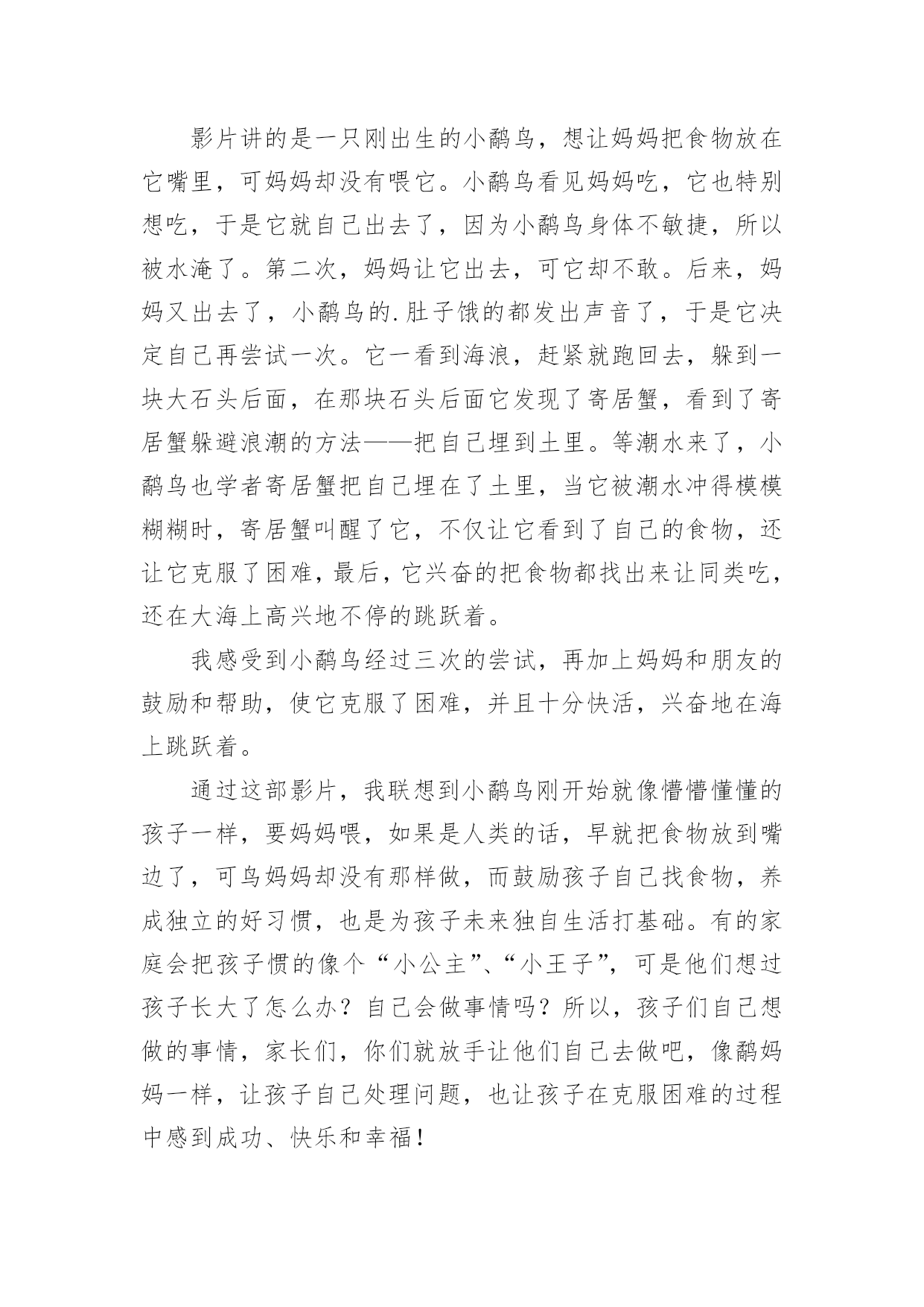 《鹬》观后感《鹬》观后感当看完一部影视作品后,相信大家有很多值得分享的东西吧,需要回过头来写一写观后感了。观后感你想好怎么写了吗?以下是小编整理的《鹬》观后感,欢迎大家分享。《鹬》观后感1看过《鹬》的人都会觉得其中的道理很浅显,短片的设计也显得平凡。可是6分钟里的每一个细节,都折射着我们生活中富有寓意的道理。短片的开始描述了小鹬很懒惰,与生俱来的本能让它向着天空张开嘴,期待着妈妈能直接把食物抛喂给它;而鹬妈妈的用心良苦也表现得淋漓尽致,这些明确的告诉我们在生活中要勇于探索,而不是沉溺于温柔乡。通过鹬妈妈精心引导小鹬觅食,明确说明了不管是工作中还是生活中授之以鱼不如授之以渔的道理。当潮来潮退的时候,鹬们利于极短的时间觅食,反映在生活中我们要抓住机遇顺势而为,而不要眼望着茫茫大海而手足失措,纵使再大的困难也一定会有转机的。短片利用鹬们瞬间觅食大海做背景预示着不管是多大的困难都会有办法解决的。当小鹬经历了第一次失败后,它又有了经验主义带来的心理阴影,害怕再次失败的'尴尬,更害怕再次被打湿的痛苦而躲在沙堆后面止足不前。是朋友寄居蟹的力量让它再一次尝试面对茫茫大海,在朋友那里学到了如何面对和躲避海浪。生活中不缺少的是困难和打击,重要的是要有善于学习的习惯和应对困难决心,友情的力量和同事的引导亦是不可或缺的。短片的最后描述小鹬利用自己学到的生存知识和技能觅得了更多更好的食物,这是小鹬把利用潮来潮退觅食原理加以创新的成果。生活中的我们也要学会打破思维定势,利用已有的经验和知识或许小小的变通就会取得更多的成功。人的一生并不是一帆风顺,即使是普通的人,普通的鸟,也应该善于学习,勇于探索勇于创新,靠着勇气和反复尝试的执着,获取与困难对抗中的胜利。《鹬》观后感2这个段视频以《鹬》为题,便会让人觉得十分好奇,这个《鹬》所代表的是什么呢?难道仅仅是这一种动物吗?视频一开始,便是一只呆萌的小鹬,正在海滩边的草丛里,张着嘴求妈妈投喂的场景。但妈妈却并未理采它,而是想让它自己去海里觅食。可小鹬却执着地等着妈妈投喂。妈妈留下他一个人在巢里,独自去海边了。最后,小鹬终于勇敢踏上海滩,独自觅食。忽然的,一阵大浪袭来,它一看身后所有的鹬都跑光了,只剩下它一只。急情之下它只好学着前面的小螃蟹一样躲到沙里,无意中睁开双眼,却发现水底下竟是另一翻美的的世界。海水透明的如同钻石一般,沙地里探出了一个个蚌,似乎是故意透出来给小鹬看的。就这样,小鹬便变得勇敢了,勇于探索,勇于去寻找。就像是生活中陷入泥泽的时候忽然抓住的一根稻草,忽然就挣脱了恐惧,又变回了原来那个勇往直前,无所畏谓的我。“宝剑锋从磨砺出,梅花香自苦寒来。”在生活中,我们难免会遇到各种各样的挫折与磨难,而这些磨难,正是我们通往成功的必经之路。如果想要渡过成功的一生,渡过没有遗憾的一生,那经历这些风风雨雨是必要的。以前,我最不喜欢的就是写数学计算题了。但却因为自己的数学确实不好,所以不得不去做一些原本不用做的课外练习。我尽管不愿意,但还是去做了——我知道只有这样做才能提高自己的.数学计算能力。不经过风雨,怎能看见彩虹。每一个人的成功一定是经历了不断的努力,不断的经历挫折,成功之路永远不会比你想像的要轻松。所以,我们要像那只小鹬一样勇敢地去探索,去尝试,勇敢面对,这样才能成长,才能更好的迎接未来。《鹬》观后感3从前有一群的鹬,有一天一只鹬生下了一只小鹬,小鹬看见妈妈出去了在寻找东西,它看到妈妈捉到了一个贝壳,它张大嘴,要让妈妈给它食物,它等了很久很久都还没有等到妈妈给虫子到它嘴里,它就很疑惑的看着妈妈,它看懂了,妈妈让它过来,它飞奔而来,到了妈妈那里,又一次的张开大大的嘴巴,又过了很久很久还是没有东西掉下来,它往妈妈看了看,妈妈吐下来了一个壳,之后,妈妈用鸟语给了它一个命令,自己捉虫!小鹬无奈只能自己抓虫。它看到泡沫了,它在那里才泡泡,到最后,海水打过来,小鹬还不知道是什么回事,就被海水给淹没了,被救了上来。妈妈还叫它去抓贝壳吃,它不敢了,它很害怕,心想:完蛋了,我又会被水给冲没的',可是妈妈又走了,自己的肚子也呱呱叫了,它使着又一次去探险,这回,它看到了贝壳,它刚要抓住,突然海浪又来了,它躲起来了,过了一会儿,它的脚动了它根本就没有走路,它过了一会儿才知道是两只大螃蟹,接着又出来了一只小螃蟹。小螃蟹往小鹬的脸上洒上了一些土,小鹬发怒了它也把泥土洒在小螃蟹的脸上,小螃蟹啄了一下它的小嘴巴就去追爸爸妈妈去了,小鹬本来也要追上去的,可是看到海又来了,赶快躲了回去海退了,小鹬马上有跑了过去,它看到小螃蟹的一家人都在吃贝壳,小鹬就很奇怪,赶忙过去看看,没过一会儿,海又来了,小鹬它无奈只能跟小螃蟹的一家人一样都躲在泥土里面闭上眼睛,这回时候小螃蟹拍了拍小鹬的嘴巴,小鹬睁眼一看,原来是很多很多的贝壳出现在自己的面前,接着贝壳有