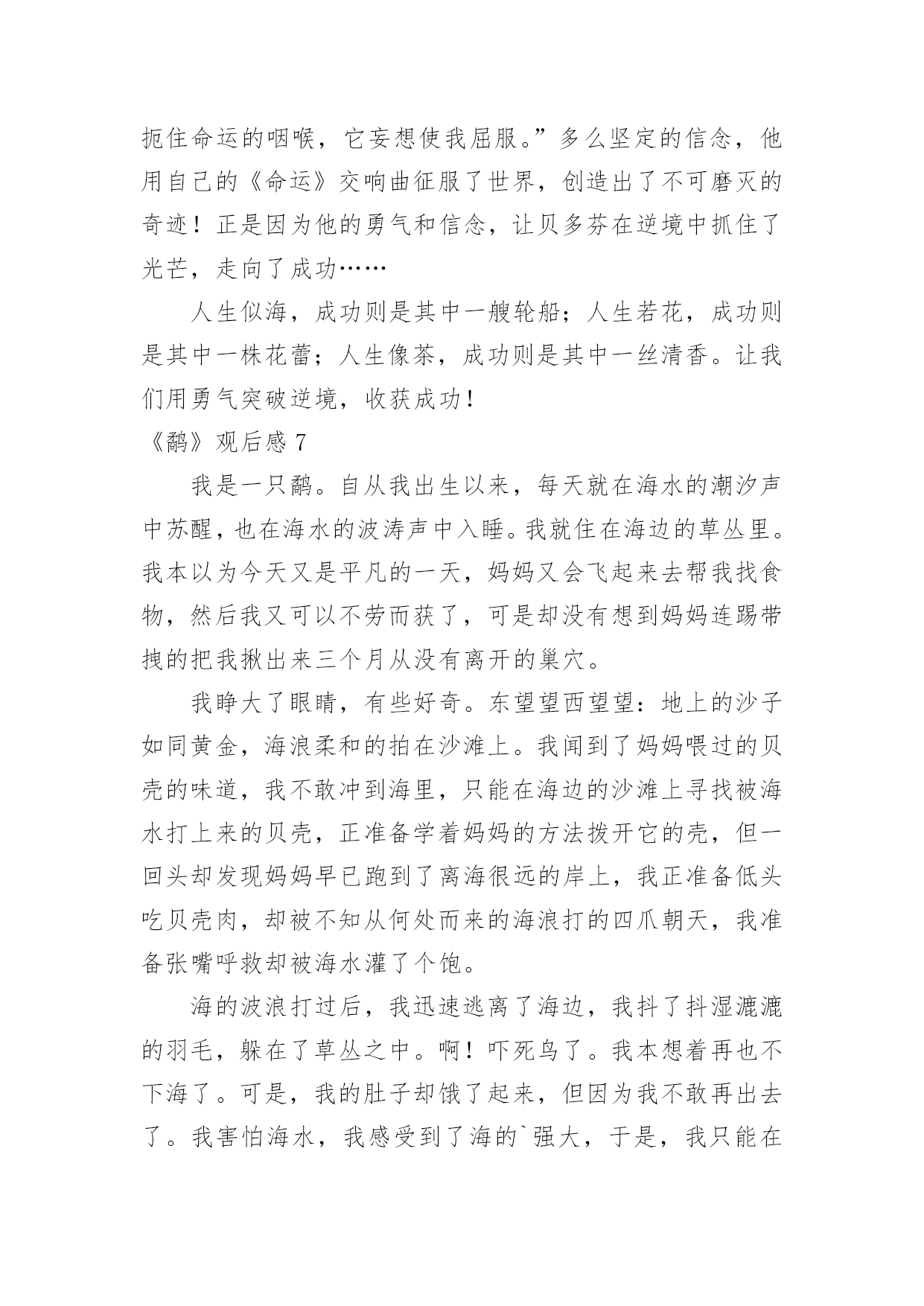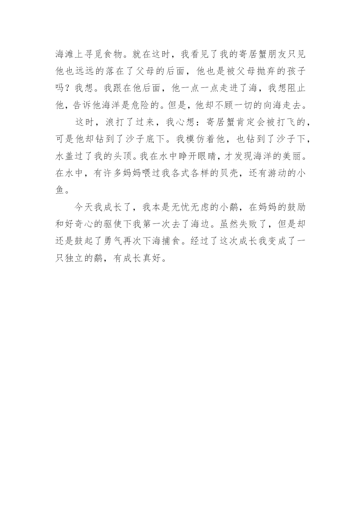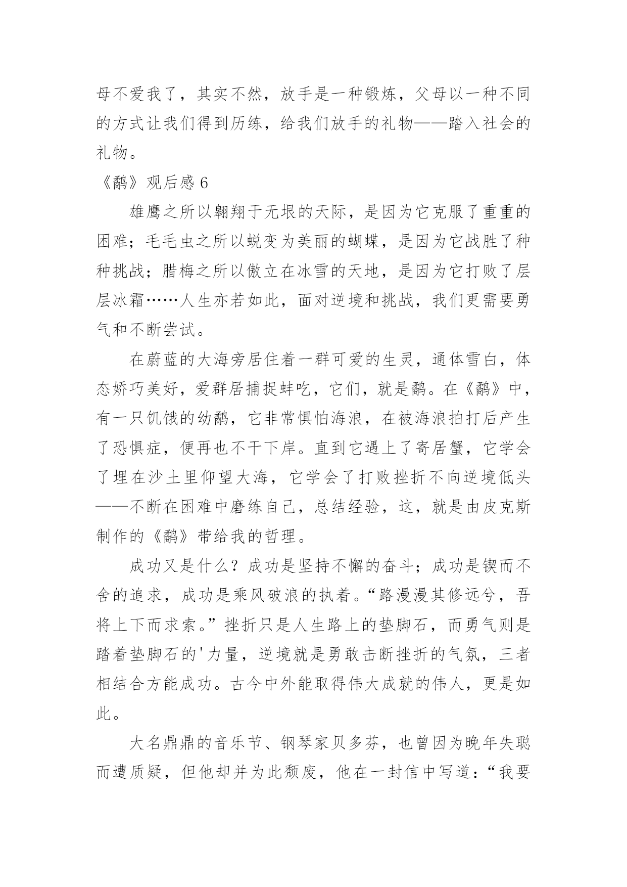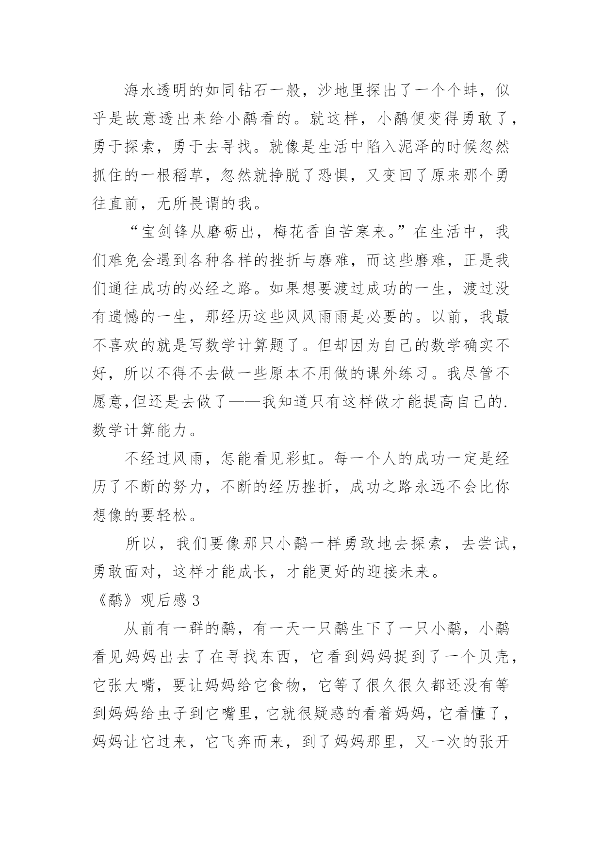 《鹬》观后感《鹬》观后感当看完一部影视作品后,相信大家有很多值得分享的东西吧,需要回过头来写一写观后感了。观后感你想好怎么写了吗?以下是小编整理的《鹬》观后感,欢迎大家分享。《鹬》观后感1看过《鹬》的人都会觉得其中的道理很浅显,短片的设计也显得平凡。可是6分钟里的每一个细节,都折射着我们生活中富有寓意的道理。短片的开始描述了小鹬很懒惰,与生俱来的本能让它向着天空张开嘴,期待着妈妈能直接把食物抛喂给它;而鹬妈妈的用心良苦也表现得淋漓尽致,这些明确的告诉我们在生活中要勇于探索,而不是沉溺于温柔乡。通过鹬妈妈精心引导小鹬觅食,明确说明了不管是工作中还是生活中授之以鱼不如授之以渔的道理。当潮来潮退的时候,鹬们利于极短的时间觅食,反映在生活中我们要抓住机遇顺势而为,而不要眼望着茫茫大海而手足失措,纵使再大的困难也一定会有转机的。短片利用鹬们瞬间觅食大海做背景预示着不管是多大的困难都会有办法解决的。当小鹬经历了第一次失败后,它又有了经验主义带来的心理阴影,害怕再次失败的'尴尬,更害怕再次被打湿的痛苦而躲在沙堆后面止足不前。是朋友寄居蟹的力量让它再一次尝试面对茫茫大海,在朋友那里学到了如何面对和躲避海浪。生活中不缺少的是困难和打击,重要的是要有善于学习的习惯和应对困难决心,友情的力量和同事的引导亦是不可或缺的。短片的最后描述小鹬利用自己学到的生存知识和技能觅得了更多更好的食物,这是小鹬把利用潮来潮退觅食原理加以创新的成果。生活中的我们也要学会打破思维定势,利用已有的经验和知识或许小小的变通就会取得更多的成功。人的一生并不是一帆风顺,即使是普通的人,普通的鸟,也应该善于学习,勇于探索勇于创新,靠着勇气和反复尝试的执着,获取与困难对抗中的胜利。《鹬》观后感2这个段视频以《鹬》为题,便会让人觉得十分好奇,这个《鹬》所代表的是什么呢?难道仅仅是这一种动物吗?视频一开始,便是一只呆萌的小鹬,正在海滩边的草丛里,张着嘴求妈妈投喂的场景。但妈妈却并未理采它,而是想让它自己去海里觅食。可小鹬却执着地等着妈妈投喂。妈妈留下他一个人在巢里,独自去海边了。最后,小鹬终于勇敢踏上海滩,独自觅食。忽然的,一阵大浪袭来,它一看身后所有的鹬都跑光了,只剩下它一只。急情之下它只好学着前面的小螃蟹一样躲到沙里,无意中睁开双眼,却发现水底下竟是另一翻美的的世界。海水透明的如同钻石一般,沙地里探出了一个个蚌,似乎是故意透出来给小鹬看的。就这样,小鹬便变得勇敢了,勇于探索,勇于去寻找。就像是生活中陷入泥泽的时候忽然抓住的一根稻草,忽然就挣脱了恐惧,又变回了原来那个勇往直前,无所畏谓的我。“宝剑锋从磨砺出,梅花香自苦寒来。”在生活中,我们难免会遇到各种各样的挫折与磨难,而这些磨难,正是我们通往成功的必经之路。如果想要渡过成功的一生,渡过没有遗憾的一生,那经历这些风风雨雨是必要的。以前,我最不喜欢的就是写数学计算题了。但却因为自己的数学确实不好,所以不得不去做一些原本不用做的课外练习。我尽管不愿意,但还是去做了——我知道只有这样做才能提高自己的.数学计算能力。不经过风雨,怎能看见彩虹。每一个人的成功一定是经历了不断的努力,不断的经历挫折,成功之路永远不会比你想像的要轻松。所以,我们要像那只小鹬一样勇敢地去探索,去尝试,勇敢面对,这样才能成长,才能更好的迎接未来。《鹬》观后感3从前有一群的鹬,有一天一只鹬生下了一只小鹬,小鹬看见妈妈出去了在寻找东西,它看到妈妈捉到了一个贝壳,它张大嘴,要让妈妈给它食物,它等了很久很久都还没有等到妈妈给虫子到它嘴里,它就很疑惑的看着妈妈,它看懂了,妈妈让它过来,它飞奔而来,到了妈妈那里,又一次的张开大大的嘴巴,又过了很久很久还是没有东西掉下来,它往妈妈看了看,妈妈吐下来了一个壳,之后,妈妈用鸟语给了它一个命令,自己捉虫!小鹬无奈只能自己抓虫。它看到泡沫了,它在那里才泡泡,到最后,海水打过来,小鹬还不知道是什么回事,就被海水给淹没了,被救了上来。妈妈还叫它去抓贝壳吃,它不敢了,它很害怕,心想:完蛋了,我又会被水给冲没的',可是妈妈又走了,自己的肚子也呱呱叫了,它使着又一次去探险,这回,它看到了贝壳,它刚要抓住,突然海浪又来了,它躲起来了,过了一会儿,它的脚动了它根本就没有走路,它过了一会儿才知道是两只大螃蟹,接着又出来了一只小螃蟹。小螃蟹往小鹬的脸上洒上了一些土,小鹬发怒了它也把泥土洒在小螃蟹的脸上,小螃蟹啄了一下它的小嘴巴就去追爸爸妈妈去了,小鹬本来也要追上去的,可是看到海又来了,赶快躲了回去海退了,小鹬马上有跑了过去,它看到小螃蟹的一家人都在吃贝壳,小鹬就很奇怪,赶忙过去看看,没过一会儿,海又来了,小鹬它无奈只能跟小螃蟹的一家人一样都躲在泥土里面闭上眼睛,这回时候小螃蟹拍了拍小鹬的嘴巴,小鹬睁眼一看,原来是很多很多的贝壳出现在自己的面前,接着贝壳有