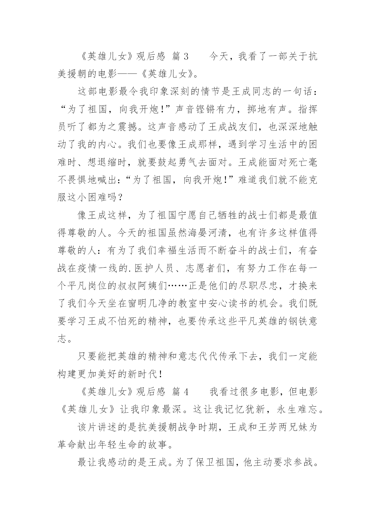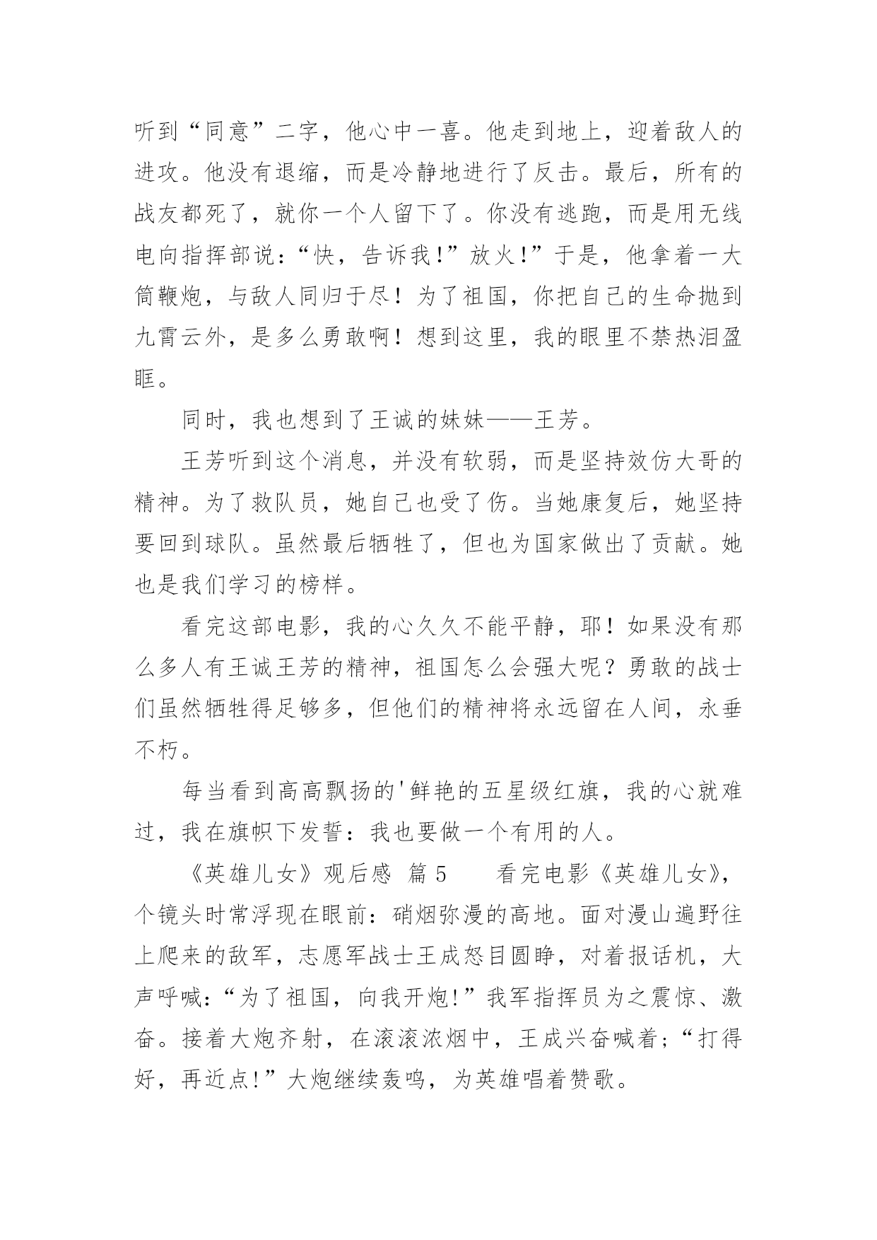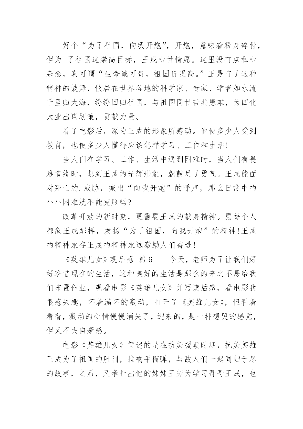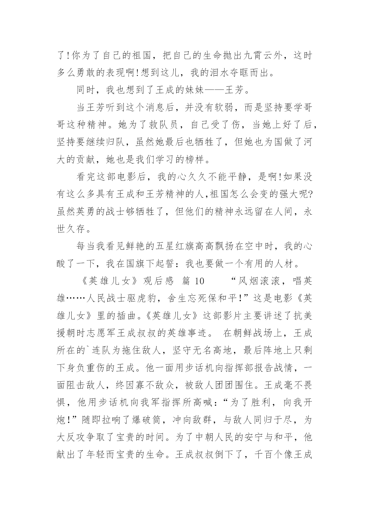 《英雄儿女》观后感《英雄儿女》观后感细细品味一部作品以后,这次观看让你有什么体会呢?这时候最关键的观后感不能忘了。那么你真的懂得怎么写观后感吗?以下是小编精心整理的《英雄儿女》观后感,供大家参考借鉴,希望可以帮助到有需要的朋友。《英雄儿女》观后感篇1抗美援朝是个让人振奋的词汇。自1950年开始,到1953年结束,从中涌现出的英雄儿女,数不胜数,其中最典型的例子就是王成和王芳。王成和王芳是陕北人,因日本鬼子把房子烧了,所以他们跟着父母背井离乡,来到了上海浦东区,在那里,他们的爸爸给外国老板做活,受尽了屈辱,他们俩从小就立志为家父报仇。1950年,抗美援朝战争打响了,王成作为东北边防军的一名战士,来到了朝鲜,而王芳却作为文工团的'一名成员,随王成一起来到了朝鲜。来到朝鲜之后,王成立刻投入了战斗,在一片不起眼的丘陵地带,王成所在的那个团守卫着这片土地上的一块无名高地,这个无名高地一旦落入美国人手中,将会牺牲很多的同志,而这片高地上的四号阵地却是关键中的关键,可那块四号阵地上只有一个人,王成不顾团长的劝阻,来到了这片阵地上,他找到正在守卫这片高地的步话员,没想到步话员已经奄奄一息了,而这时敌人正在往上走,王成摘下步话员的步话机,向指挥部说出了现在的情况,并请指挥部增援他。《英雄儿女》观后感篇2以前的我对《英雄儿女》这部老电影并不熟悉,但一个偶然的机会使我了解了它。故事发生在抗美援朝时期。王成、王芳兄妹俩参加志愿军,来到了硝烟弥漫、槍林弹雨的朝鲜战场,和朝鲜人民并肩作战,一同打击美国侵略军。哥哥王成在前线与敌人直接战斗,妹妹王芳作为文工团员用歌声和舞蹈鼓舞中朝人民的斗志。一次,王成参加了保卫阵地的战斗。战斗十分惨烈,战友们先后都英勇牺牲了,整个阵地上只剩下王成一人孤军奋战,但因为敌众我寡,无法击退蜂拥而至的敌人,此时,王成作出了一个我意想不到的决定:王成拉燃了最终一支爆破筒,毅然扑进敌群,与敌人同归于尽!王芳得知哥哥牺牲的噩耗后十分悲伤,但没有只沉浸在悲痛之中,而是化悲痛为力量,用自我的`歌声和舞蹈来鼓舞战友们更加狠狠地打击敌人。王成宁为玉碎也不为瓦全,哪怕献出自我的生命与敌人同归于尽,也要守住阵地,决不投降。那种大无畏的英雄气概无比珍贵,深深地震撼了我。“为什么战旗美如画?英雄的鲜血染红了它。为什么大地春常在?英雄的生命开鲜花。”是啊!千千万万个王成把他们的鲜血洒在了异国土地上,用他们那年轻的生命守住了阵地,保卫了祖国,这种舍生忘死保家卫国的英雄精神多么值得我们学习!《英雄儿女》观后感篇3今天,我看了一部关于抗美援朝的电影——《英雄儿女》。这部电影最令我印象深刻的情节是王成同志的一句话:“为了祖国,向我开炮!”声音铿锵有力,掷地有声。指挥员听了都为之震撼。这声音感动了王成战友们,也深深地触动了我的内心。我们也要像王成那样,遇到学习生活中的困难时、想退缩时,就要鼓起勇气去面对。王成能面对死亡毫不畏惧地喊出:“为了祖国,向我开炮!”难道我们就不能克服这小困难吗?像王成这样,为了祖国宁愿自己牺牲的战士们都是最值得尊敬的人。今天的祖国虽然海晏河清,也有许多这样值得尊敬的人:有为了我们幸福生活而不断奋斗的战士们,有奋战在疫情一线的.医护人员、志愿者们,有努力工作在每一个平凡岗位的叔叔阿姨们……正是他们的尽职尽忠,才换来了我们今天坐在窗明几净的教室中安心读书的机会。我们既要学习王成不怕死的精神,也要传承这些平凡英雄的钢铁意志。只要能把英雄的精神和意志代代传承下去,我们一定能构建更加美好的新时代!《英雄儿女》观后感篇4我看过很多电影,但电影《英雄儿女》让我印象最深。这让我记忆犹新,永生难忘。该片讲述的是抗美援朝战争时期,王成和王芳两兄妹为革命献出年轻生命的故事。最让我感动的是王成。为了保卫祖国,他主动要求参战。听到“同意”二字,他心中一喜。他走到地上,迎着敌人的进攻。他没有退缩,而是冷静地进行了反击。最后,所有的战友都死了,就你一个人留下了。你没有逃跑,而是用无线电向指挥部说:“快,告诉我!”放火!”于是,他拿着一大筒鞭炮,与敌人同归于尽!为了祖国,你把自己的生命抛到九霄云外,是多么勇敢啊!想到这里,我的眼里不禁热泪盈眶。同时,我也想到了王诚的妹妹——王芳。王芳听到这个消息,并没有软弱,而是坚持效仿大哥的精神。为了救队员,她自己也受了伤。当她康复后,她坚持要回到球队。虽然最后牺牲了,但也为国家做出了贡献。她也是我们学习的榜样。看完这部电影,我的心久久不能平静,耶!如果没有那么多人有王诚王芳的精神,祖国怎么会强大呢?勇敢的战士们虽然牺牲得足够多,但他们的精神将永远留在人间,永垂不朽。每当看到高高飘扬的'鲜艳的五星级红旗,我的心就难过,我在旗帜下发誓:我也要做一个有用的人。《英雄儿女》观后感篇5看完电影《英雄儿女》,个镜头时常浮现在眼前:硝烟弥漫的