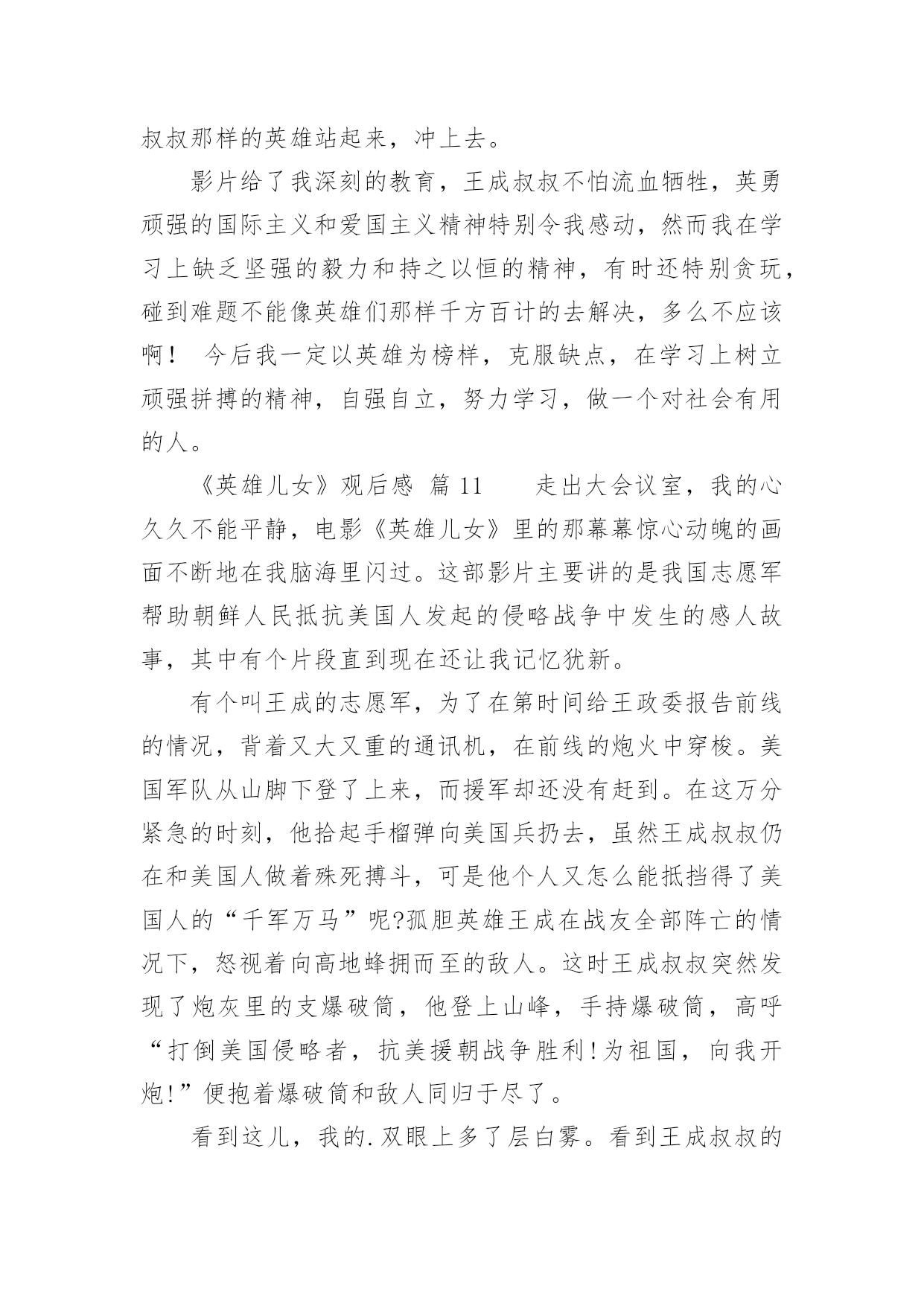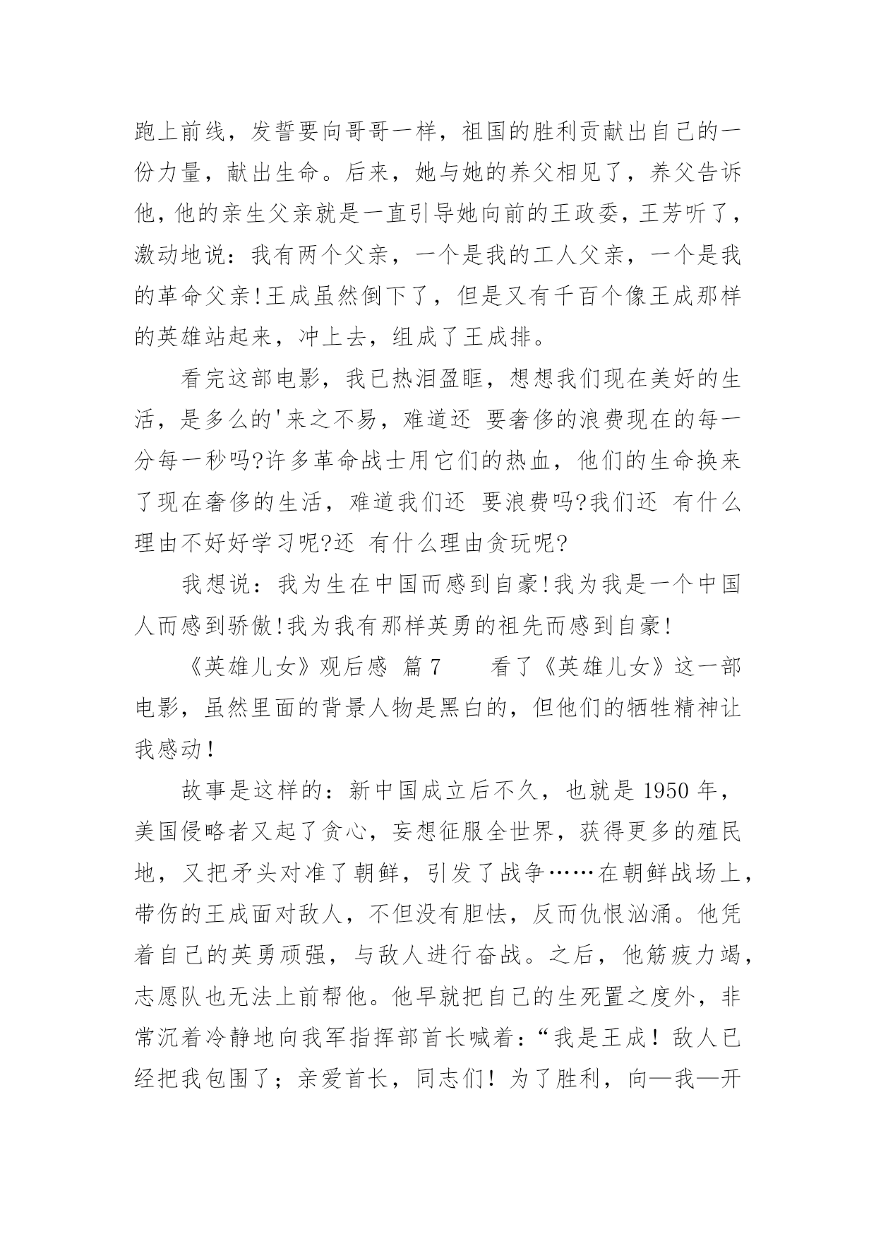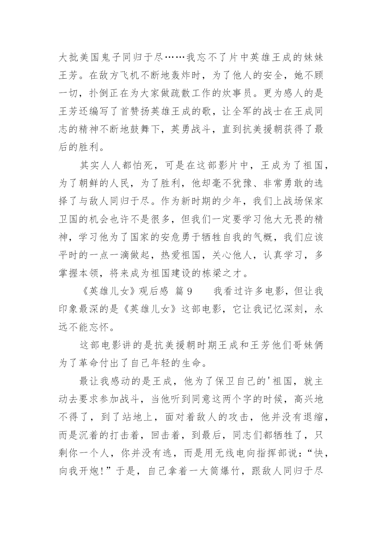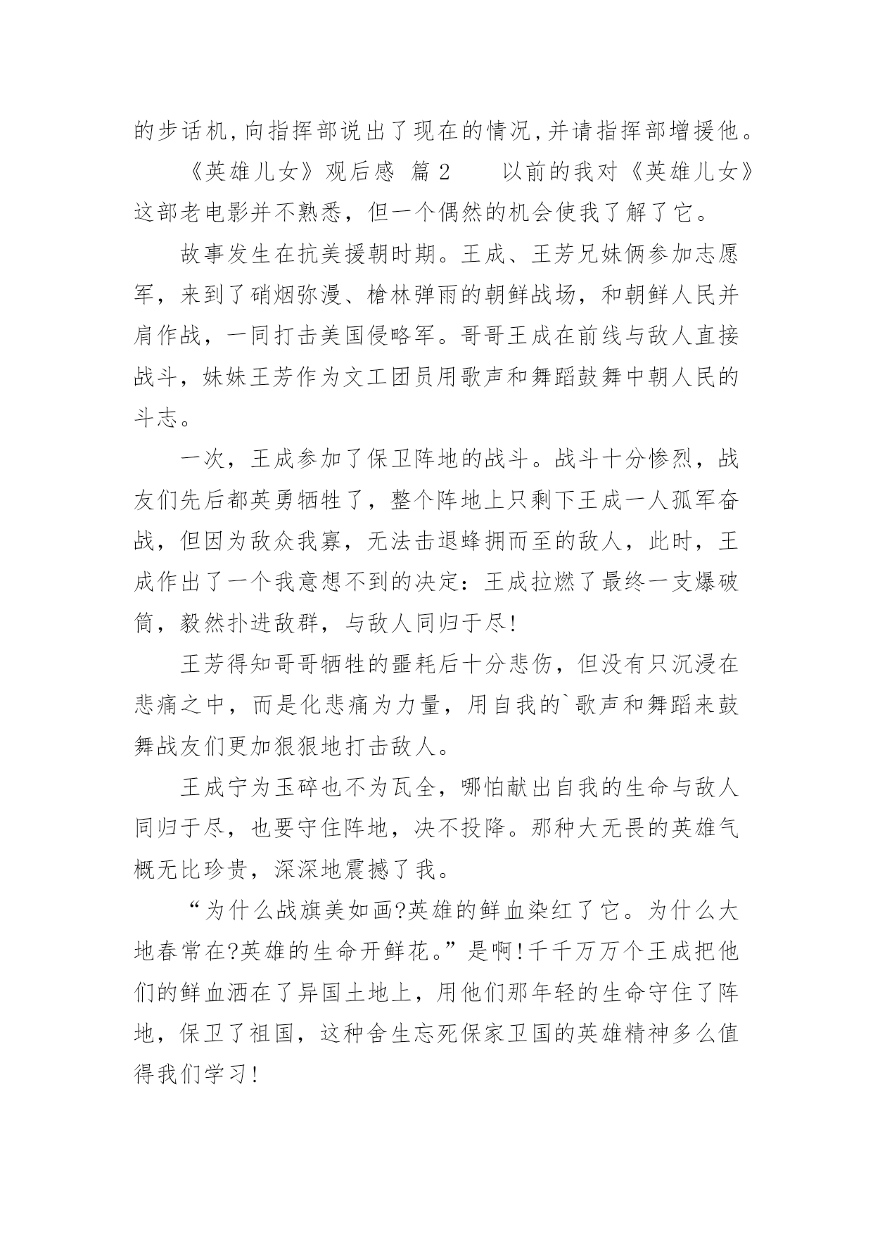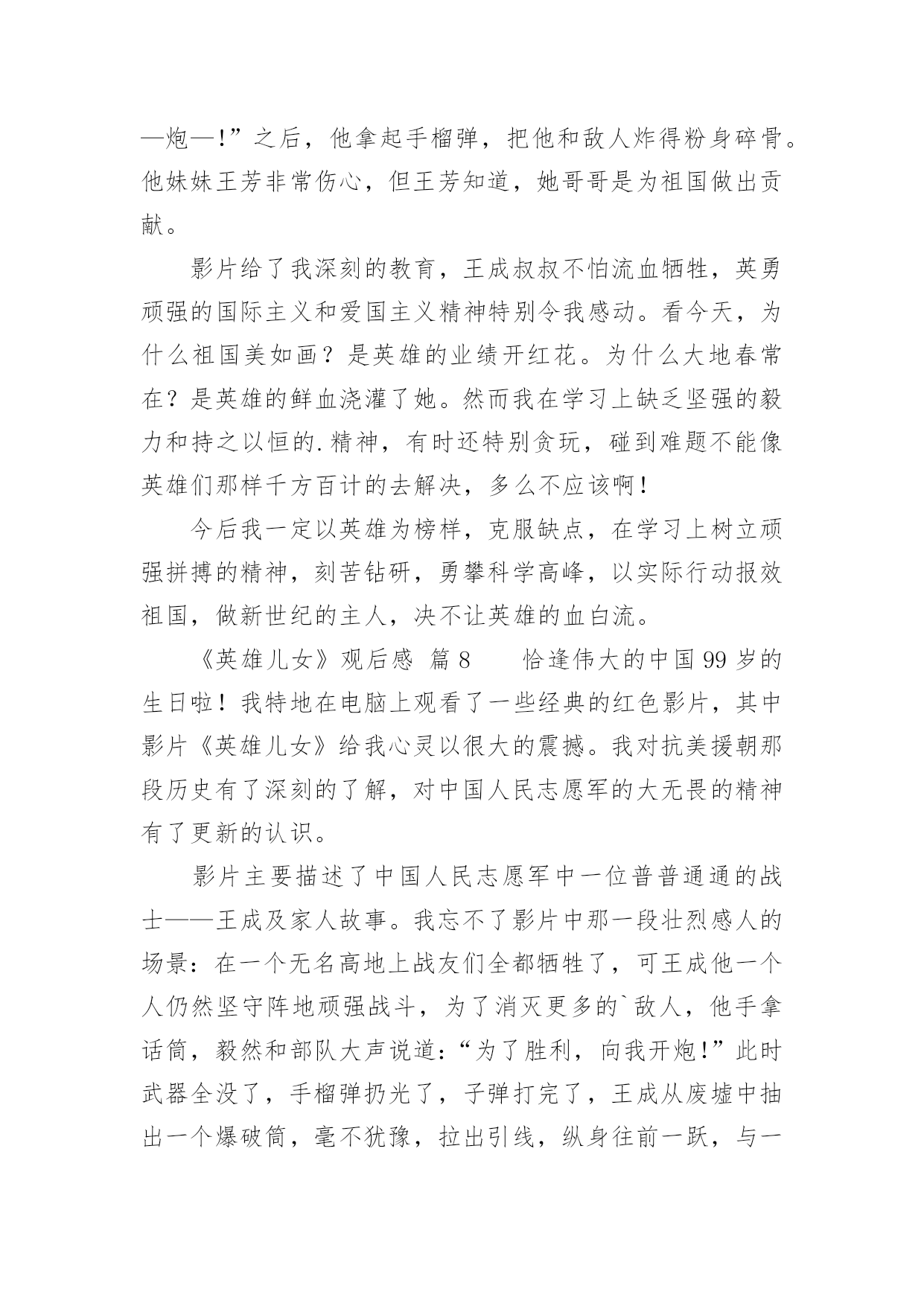 《英雄儿女》观后感《英雄儿女》观后感细细品味一部作品以后,这次观看让你有什么体会呢?这时候最关键的观后感不能忘了。那么你真的懂得怎么写观后感吗?以下是小编精心整理的《英雄儿女》观后感,供大家参考借鉴,希望可以帮助到有需要的朋友。《英雄儿女》观后感篇1抗美援朝是个让人振奋的词汇。自1950年开始,到1953年结束,从中涌现出的英雄儿女,数不胜数,其中最典型的例子就是王成和王芳。王成和王芳是陕北人,因日本鬼子把房子烧了,所以他们跟着父母背井离乡,来到了上海浦东区,在那里,他们的爸爸给外国老板做活,受尽了屈辱,他们俩从小就立志为家父报仇。1950年,抗美援朝战争打响了,王成作为东北边防军的一名战士,来到了朝鲜,而王芳却作为文工团的'一名成员,随王成一起来到了朝鲜。来到朝鲜之后,王成立刻投入了战斗,在一片不起眼的丘陵地带,王成所在的那个团守卫着这片土地上的一块无名高地,这个无名高地一旦落入美国人手中,将会牺牲很多的同志,而这片高地上的四号阵地却是关键中的关键,可那块四号阵地上只有一个人,王成不顾团长的劝阻,来到了这片阵地上,他找到正在守卫这片高地的步话员,没想到步话员已经奄奄一息了,而这时敌人正在往上走,王成摘下步话员的步话机,向指挥部说出了现在的情况,并请指挥部增援他。《英雄儿女》观后感篇2以前的我对《英雄儿女》这部老电影并不熟悉,但一个偶然的机会使我了解了它。故事发生在抗美援朝时期。王成、王芳兄妹俩参加志愿军,来到了硝烟弥漫、槍林弹雨的朝鲜战场,和朝鲜人民并肩作战,一同打击美国侵略军。哥哥王成在前线与敌人直接战斗,妹妹王芳作为文工团员用歌声和舞蹈鼓舞中朝人民的斗志。一次,王成参加了保卫阵地的战斗。战斗十分惨烈,战友们先后都英勇牺牲了,整个阵地上只剩下王成一人孤军奋战,但因为敌众我寡,无法击退蜂拥而至的敌人,此时,王成作出了一个我意想不到的决定:王成拉燃了最终一支爆破筒,毅然扑进敌群,与敌人同归于尽!王芳得知哥哥牺牲的噩耗后十分悲伤,但没有只沉浸在悲痛之中,而是化悲痛为力量,用自我的`歌声和舞蹈来鼓舞战友们更加狠狠地打击敌人。王成宁为玉碎也不为瓦全,哪怕献出自我的生命与敌人同归于尽,也要守住阵地,决不投降。那种大无畏的英雄气概无比珍贵,深深地震撼了我。“为什么战旗美如画?英雄的鲜血染红了它。为什么大地春常在?英雄的生命开鲜花。”是啊!千千万万个王成把他们的鲜血洒在了异国土地上,用他们那年轻的生命守住了阵地,保卫了祖国,这种舍生忘死保家卫国的英雄精神多么值得我们学习!《英雄儿女》观后感篇3今天,我看了一部关于抗美援朝的电影——《英雄儿女》。这部电影最令我印象深刻的情节是王成同志的一句话:“为了祖国,向我开炮!”声音铿锵有力,掷地有声。指挥员听了都为之震撼。这声音感动了王成战友们,也深深地触动了我的内心。我们也要像王成那样,遇到学习生活中的困难时、想退缩时,就要鼓起勇气去面对。王成能面对死亡毫不畏惧地喊出:“为了祖国,向我开炮!”难道我们就不能克服这小困难吗?像王成这样,为了祖国宁愿自己牺牲的战士们都是最值得尊敬的人。今天的祖国虽然海晏河清,也有许多这样值得尊敬的人:有为了我们幸福生活而不断奋斗的战士们,有奋战在疫情一线的.医护人员、志愿者们,有努力工作在每一个平凡岗位的叔叔阿姨们……正是他们的尽职尽忠,才换来了我们今天坐在窗明几净的教室中安心读书的机会。我们既要学习王成不怕死的精神,也要传承这些平凡英雄的钢铁意志。只要能把英雄的精神和意志代代传承下去,我们一定能构建更加美好的新时代!《英雄儿女》观后感篇4我看过很多电影,但电影《英雄儿女》让我印象最深。这让我记忆犹新,永生难忘。该片讲述的是抗美援朝战争时期,王成和王芳两兄妹为革命献出年轻生命的故事。最让我感动的是王成。为了保卫祖国,他主动要求参战。听到“同意”二字,他心中一喜。他走到地上,迎着敌人的进攻。他没有退缩,而是冷静地进行了反击。最后,所有的战友都死了,就你一个人留下了。你没有逃跑,而是用无线电向指挥部说:“快,告诉我!”放火!”于是,他拿着一大筒鞭炮,与敌人同归于尽!为了祖国,你把自己的生命抛到九霄云外,是多么勇敢啊!想到这里,我的眼里不禁热泪盈眶。同时,我也想到了王诚的妹妹——王芳。王芳听到这个消息,并没有软弱,而是坚持效仿大哥的精神。为了救队员,她自己也受了伤。当她康复后,她坚持要回到球队。虽然最后牺牲了,但也为国家做出了贡献。她也是我们学习的榜样。看完这部电影,我的心久久不能平静,耶!如果没有那么多人有王诚王芳的精神,祖国怎么会强大呢?勇敢的战士们虽然牺牲得足够多,但他们的精神将永远留在人间,永垂不朽。每当看到高高飘扬的'鲜艳的五星级红旗,我的心就难过,我在旗帜下发誓:我也要做一个有用的人。《英雄儿女》观后感篇5看完电影《英雄儿女》,个镜头时常浮现在眼前:硝烟弥漫的