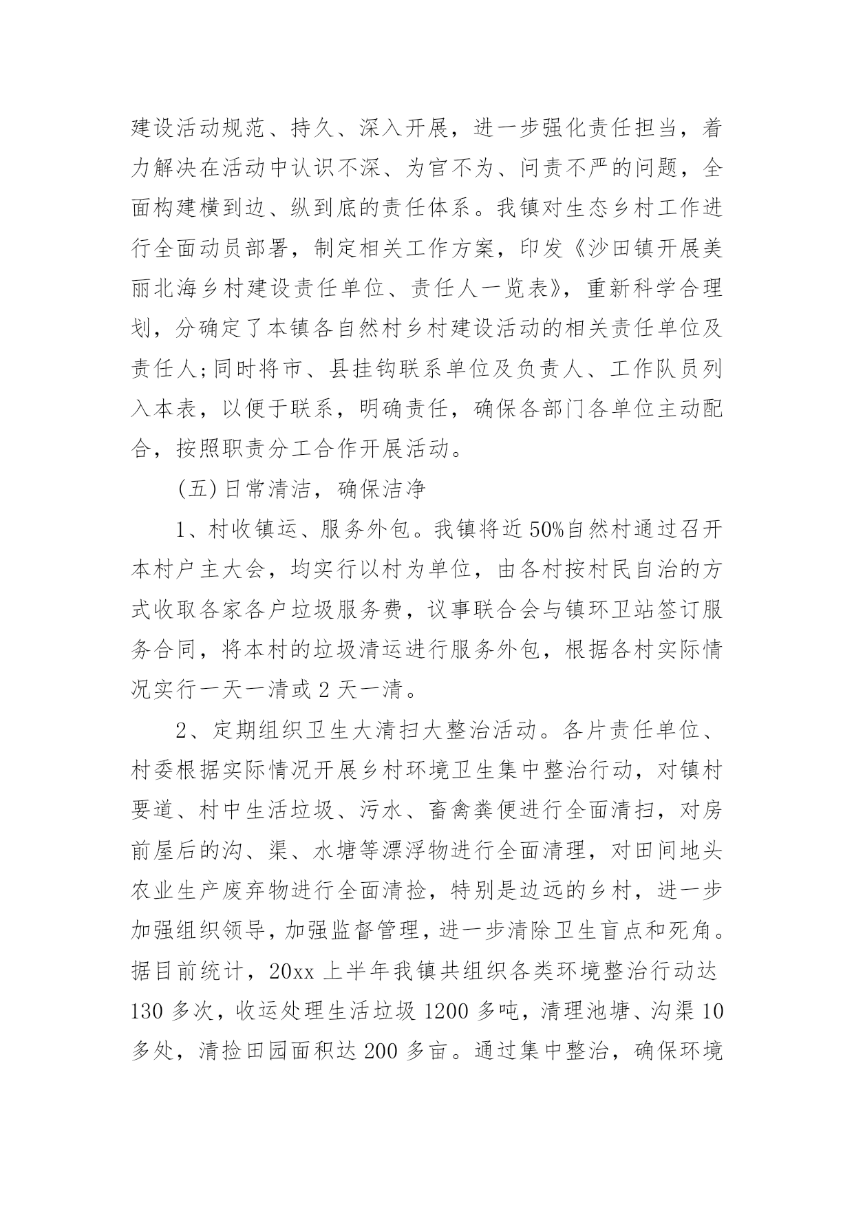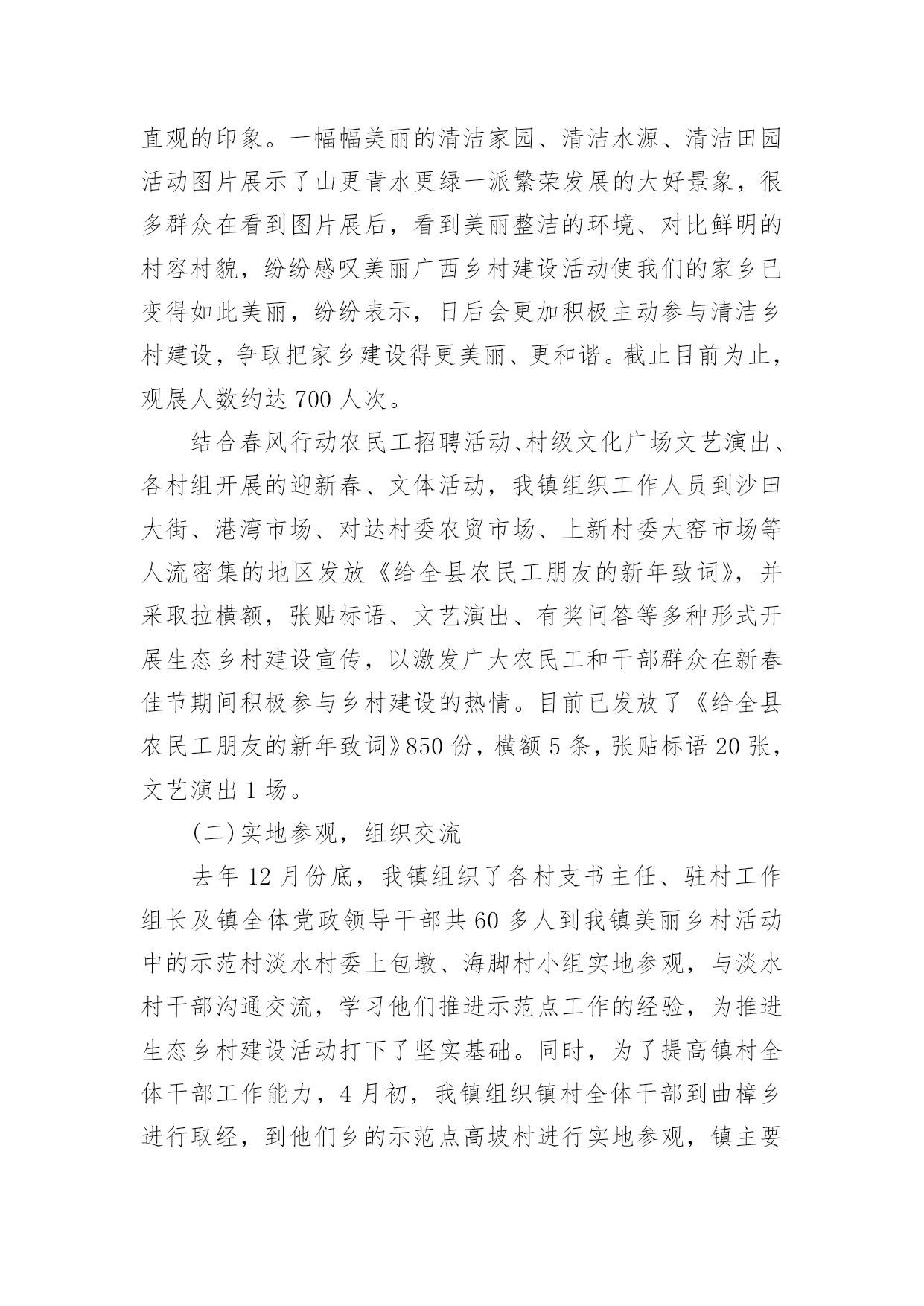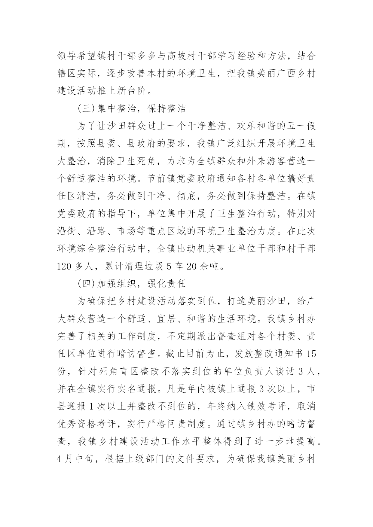 美丽乡村建设工作报告随着个人的素质不断提高,报告与我们的生活紧密相连,我们在写报告的时候要注意逻辑的合理性。相信很多朋友都对写报告感到非常苦恼吧,下面是小编整理的美丽乡村建设工作报告,希望能够帮助到大家。在美丽广西乡村活动不断推向深化过程中,按照上级部门与文件的精神要求,我镇及时对生态乡村建设工作进行了部署,重点打造典型的生态示范点,积极协调有关部门与挂点单位开展乡村建设活动,上半年沙田镇乡村建设工作已取得一定的成效,现将有关工作情况汇报如下:一、上半年工作情况(一)持续宣传,营造氛围自从去年底以来,美丽广西乡村建设活动升级为生态乡村活动,为了持续营造良好的活动氛围,充分调动广大群众的积极性与参与性,我镇开展春节慰问活动的同时,深入各村组开展走村串户宣传生态乡村活动的重要意义、目标任务、工作措施和我镇进展成效以及现存在的问题,切实让生态乡村活动深入人心,家喻户晓,入村入户,为推进沙田镇生态乡村建设奠定良好的基础。节前,我镇把美丽广西.清洁乡村图片粘贴摆在沙田政府门口外的宣传栏,利用春节期间镇篮球赛活动的有利契机,组织工作人员引导前来镇政府看球赛的群众观看,使广大干部群众对这活动过程有更加清晰、直观的印象。一幅幅美丽的清洁家园、清洁水源、清洁田园活动图片展示了山更青水更绿一派繁荣发展的大好景象,很多群众在看到图片展后,看到美丽整洁的环境、对比鲜明的村容村貌,纷纷感叹美丽广西乡村建设活动使我们的家乡已变得如此美丽,纷纷表示,日后会更加积极主动参与清洁乡村建设,争取把家乡建设得更美丽、更和谐。截止目前为止,观展人数约达700人次。结合春风行动农民工招聘活动、村级文化广场文艺演出、各村组开展的迎新春、文体活动,我镇组织工作人员到沙田大街、港湾市场、对达村委农贸市场、上新村委大窑市场等人流密集的地区发放《给全县农民工朋友的新年致词》,并采取拉横额,张贴标语、文艺演出、有奖问答等多种形式开展生态乡村建设宣传,以激发广大农民工和干部群众在新春佳节期间积极参与乡村建设的热情。目前已发放了《给全县农民工朋友的新年致词》850份,横额5条,张贴标语20张,文艺演出1场。(二)实地参观,组织交流去年12月份底,我镇组织了各村支书主任、驻村工作组长及镇全体党政领导干部共60多人到我镇美丽乡村活动中的示范村淡水村委上包墩、海脚村小组实地参观,与淡水村干部沟通交流,学习他们推进示范点工作的经验,为推进生态乡村建设活动打下了坚实基础。同时,为了提高镇村全体干部工作能力,4月初,我镇组织镇村全体干部到曲樟乡进行取经,到他们乡的示范点高坡村进行实地参观,镇主要领导希望镇村干部多多与高坡村干部学习经验和方法,结合辖区实际,逐步改善本村的环境卫生,把我镇美丽广西乡村建设活动推上新台阶。(三)集中整治,保持整洁为了让沙田群众过上一个干净整洁、欢乐和谐的五一假期,按照县委、县政府的要求,我镇广泛组织开展环境卫生大整治,消除卫生死角,力求为全镇群众和外来游客营造一个舒适整洁的环境。节前镇党委政府通知各村各单位搞好责任区清洁,务必做到干净、彻底,务必做到保持整洁。在镇党委政府的指导下,单位集中开展了卫生整治行动,特别对沿街、沿路、市场等重点区域的环境卫生整治力度。在此次环境综合整治行动中,全镇出动机关事业单位干部和村干部120多人,累计清理垃圾5车20余吨。(四)加强组织,强化责任为确保把乡村建设活动落实到位,打造美丽沙田,给广大群众营造一个舒适、宜居、和谐的生活环境。我镇乡村办完善了相关的工作制度,不定期派出督查组对各个村委、责任区单位进行暗访督查。截止目前为止,发放整改通知书15份,针对死角盲区整改不落实到位的单位负责人谈话3人,并在全镇实行实名通报。凡是年内被镇上通报3次以上,市县通报1次以上并整改不到位的,年终纳入绩效考评,取消优秀资格考评,实行严格问责制度。通过镇乡村办的暗访督查,我镇乡村建设活动工作水平整体得到了进一步地提高。4月中旬,根据上级部门的文件要求,为确保我镇美丽乡村建设活动规范、持久、深入开展,进一步强化责任担当,着力解决在活动中认识不深、为官不为、问责不严的问题,全面构建横到边、纵到底的责任体系。我镇对生态乡村工作进行全面动员部署,制定相关工作方案,印发《沙田镇开展美丽北海乡村建设责任单位、责任人一览表》,重新科学合理划,分确定了本镇各自然村乡村建设活动的相关责任单位及责任人;同时将市、县挂钩联系单位及负责人、工作队员列入本表,以便于联系,明确责任,确保各部门各单位主动配合,按照职责分工合作开展活动。(五)日常清洁,确保洁净1、村收镇运、服务外包。我镇将近50%自然村通过召开本村户主大会,均实行以村为单位,由各村按村民自治的方式收取各家各户垃圾服务费,议事联合会与镇环卫站签订服务合同,将本村的垃圾清运进行服务外包,根据各村实际情况实行一天一清