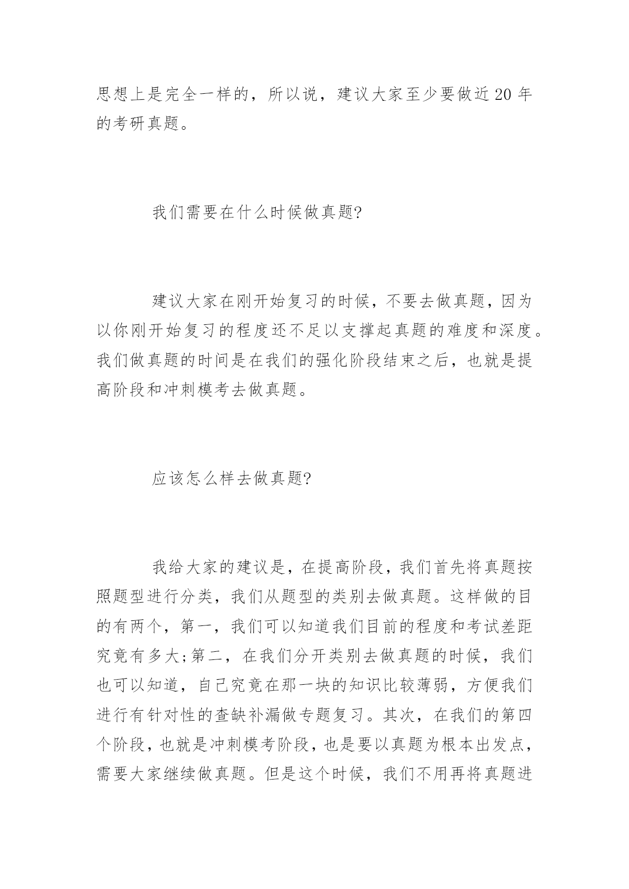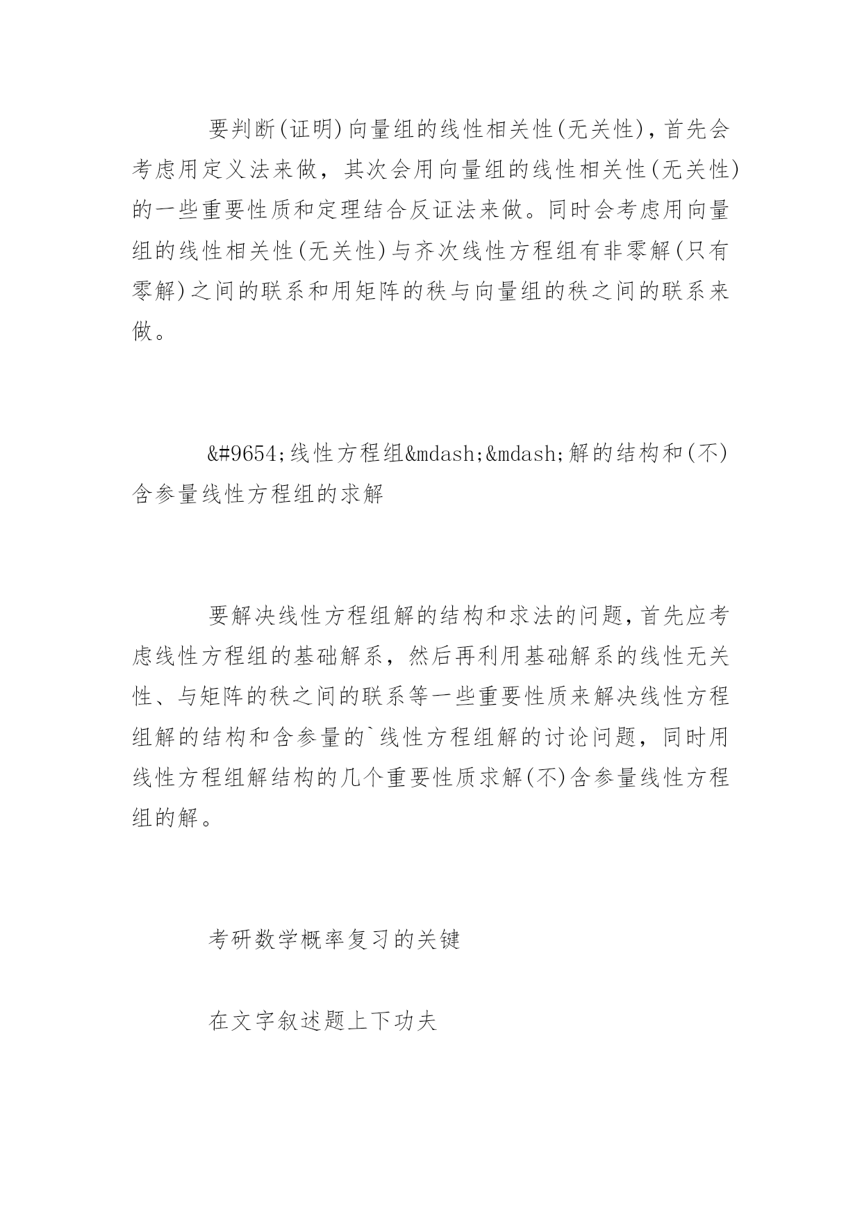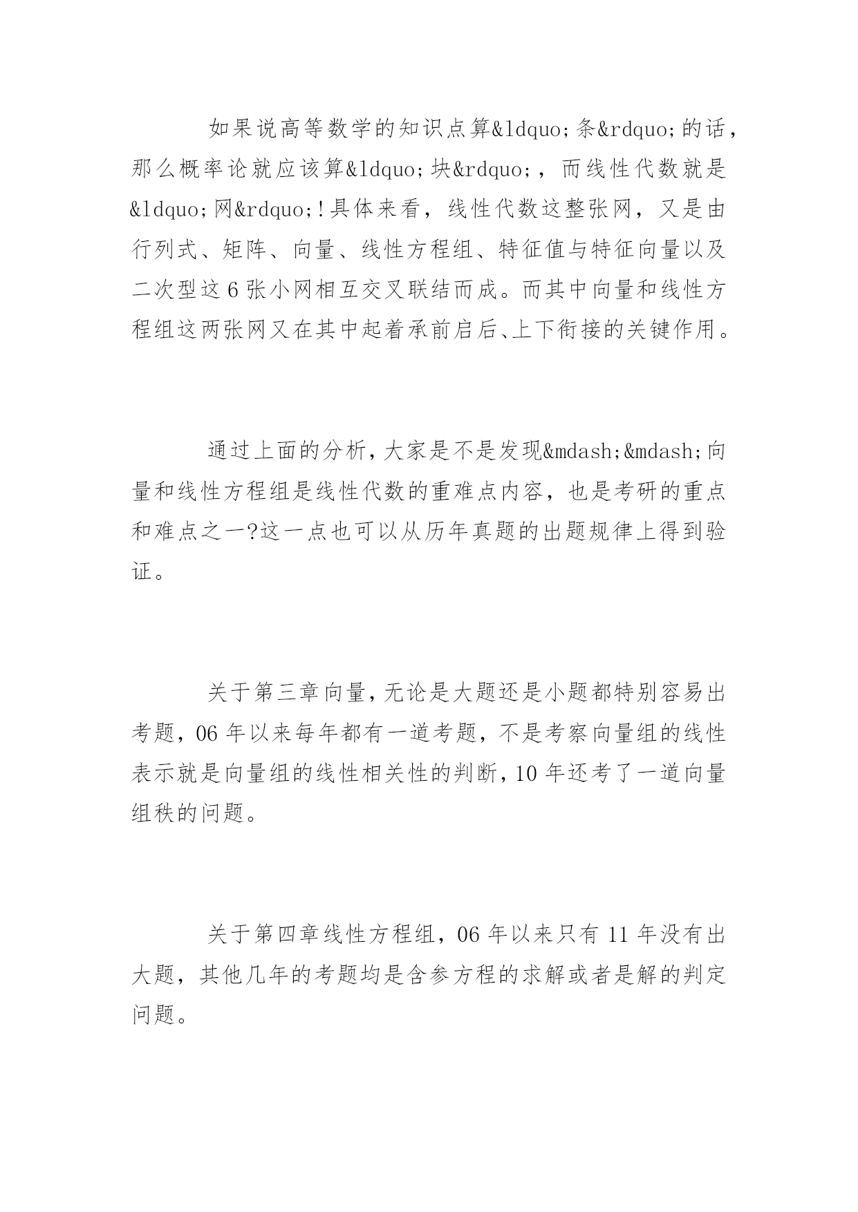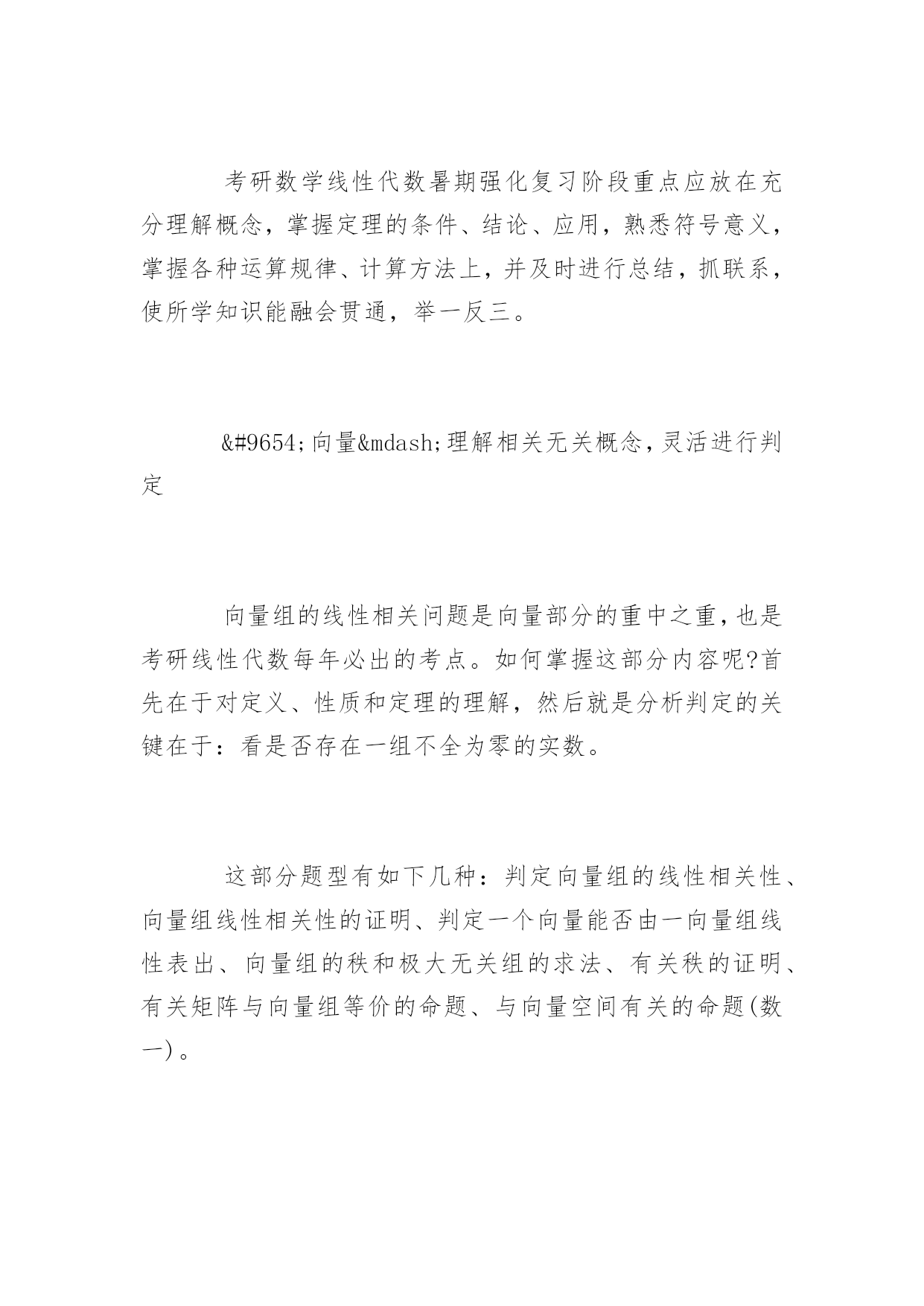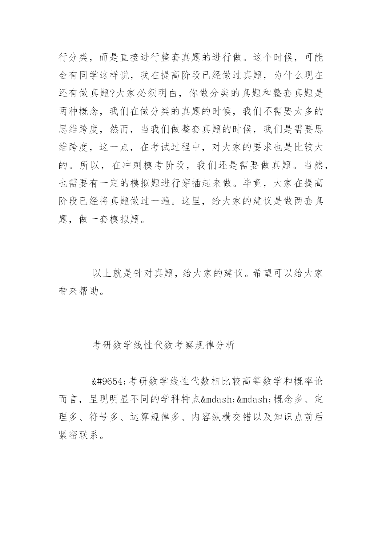 考研数学如何使用真题的方法考研数学如何使用真题的方法我们在准备考研数学的复习时,需要把使用真题的方法掌握好。小编为大家精心准备了考研数学如何使用真题的技巧,欢迎大家前来阅读。考研数学如何使用真题的问题我们究竟该做多少年的真题?在这里,建议大家至少要做近20年的真题,这是因为考研数学和考研英语、考研政治不一样,英语和政治的时代感比较强,时效性也比较强,比如说,大家在做10年前的英语和政治真题和现在真题是完全不一样的感觉。然而,数学恰恰与此相反,经过近28年的萃取,考研数学早已发展成熟,不会在知识点和深度上面有太多的变化。这个时候,有一些学生会问,考过的真题还会再考吗?给大家举一个例子,在2012年考过一道和1994年完全一样的题目,可以告诉大家,纵然不会考原题,至少也会在做题的思路和做题的思想上是完全一样的,所以说,建议大家至少要做近20年的考研真题。我们需要在什么时候做真题?建议大家在刚开始复习的时候,不要去做真题,因为以你刚开始复习的程度还不足以支撑起真题的难度和深度。我们做真题的时间是在我们的强化阶段结束之后,也就是提高阶段和冲刺模考去做真题。应该怎么样去做真题?我给大家的建议是,在提高阶段,我们首先将真题按照题型进行分类,我们从题型的类别去做真题。这样做的目的有两个,第一,我们可以知道我们目前的程度和考试差距究竟有多大;第二,在我们分开类别去做真题的时候,我们也可以知道,自己究竟在那一块的知识比较薄弱,方便我们进行有针对性的查缺补漏做专题复习。其次,在我们的第四个阶段,也就是冲刺模考阶段,也是要以真题为根本出发点,需要大家继续做真题。但是这个时候,我们不用再将真题进行分类,而是直接进行整套真题的进行做。这个时候,可能会有同学这样说,我在提高阶段已经做过真题,为什么现在还有做真题?大家必须明白,你做分类的真题和整套真题是两种概念,我们在做分类的真题的时候,我们不需要太多的思维跨度,然而,当我们做整套真题的时候,我们是需要思维跨度,这一点,在考试过程中,对大家的要求也是比较大的。所以,在冲刺模考阶段,我们还是需要做真题。当然,也需要有一定的模拟题进行穿插起来做。毕竟,大家在提高阶段已经将真题做过一遍。这里,给大家的建议是做两套真题,做一套模拟题。以上就是针对真题,给大家的建议。希望可以给大家带来帮助。考研数学线性代数考察规律分析▶考研数学线性代数相比较高等数学和概率论而言,呈现明显不同的学科特点——概念多、定理多、符号多、运算规律多、内容纵横交错以及知识点前后紧密联系。如果说高等数学的知识点算“条”的话,那么概率论就应该算“块”,而线性代数就是“网”!具体来看,线性代数这整张网,又是由行列式、矩阵、向量、线性方程组、特征值与特征向量以及二次型这6张小网相互交叉联结而成。而其中向量和线性方程组这两张网又在其中起着承前启后、上下衔接的关键作用。通过上面的分析,大家是不是发现——向量和线性方程组是线性代数的重难点内容,也是考研的重点和难点之一?这一点也可以从历年真题的出题规律上得到验证。关于第三章向量,无论是大题还是小题都特别容易出考题,06年以来每年都有一道考题,不是考察向量组的线性表示就是向量组的线性相关性的判断,10年还考了一道向量组秩的问题。关于第四章线性方程组,06年以来只有11年没有出大题,其他几年的考题均是含参方程的求解或者是解的判定问题。考研数学线性代数暑期强化复习阶段重点应放在充分理解概念,掌握定理的条件、结论、应用,熟悉符号意义,掌握各种运算规律、计算方法上,并及时进行总结,抓联系,使所学知识能融会贯通,举一反三。▶向量—理解相关无关概念,灵活进行判定向量组的线性相关问题是向量部分的重中之重,也是考研线性代数每年必出的考点。如何掌握这部分内容呢?首先在于对定义、性质和定理的理解,然后就是分析判定的关键在于:看是否存在一组不全为零的实数。这部分题型有如下几种:判定向量组的线性相关性、向量组线性相关性的证明、判定一个向量能否由一向量组线性表出、向量组的秩和极大无关组的求法、有关秩的证明、有关矩阵与向量组等价的命题、与向量空间有关的命题(数一)。要判断(证明)向量组的线性相关性(无关性),首先会考虑用定义法来做,其次会用向量组的线性相关性(无关性)的一些重要性质和定理结合反证法来做。同时会考虑用向量组的线性相关性(无关性)与齐次线性方程组有非零解(只有零解)之间的联系和用矩阵的秩与向量组的秩之间的联系来做。▶线性方程组——解的结构和(不)含参量线性方程组的求解要解决线性方程组解的结