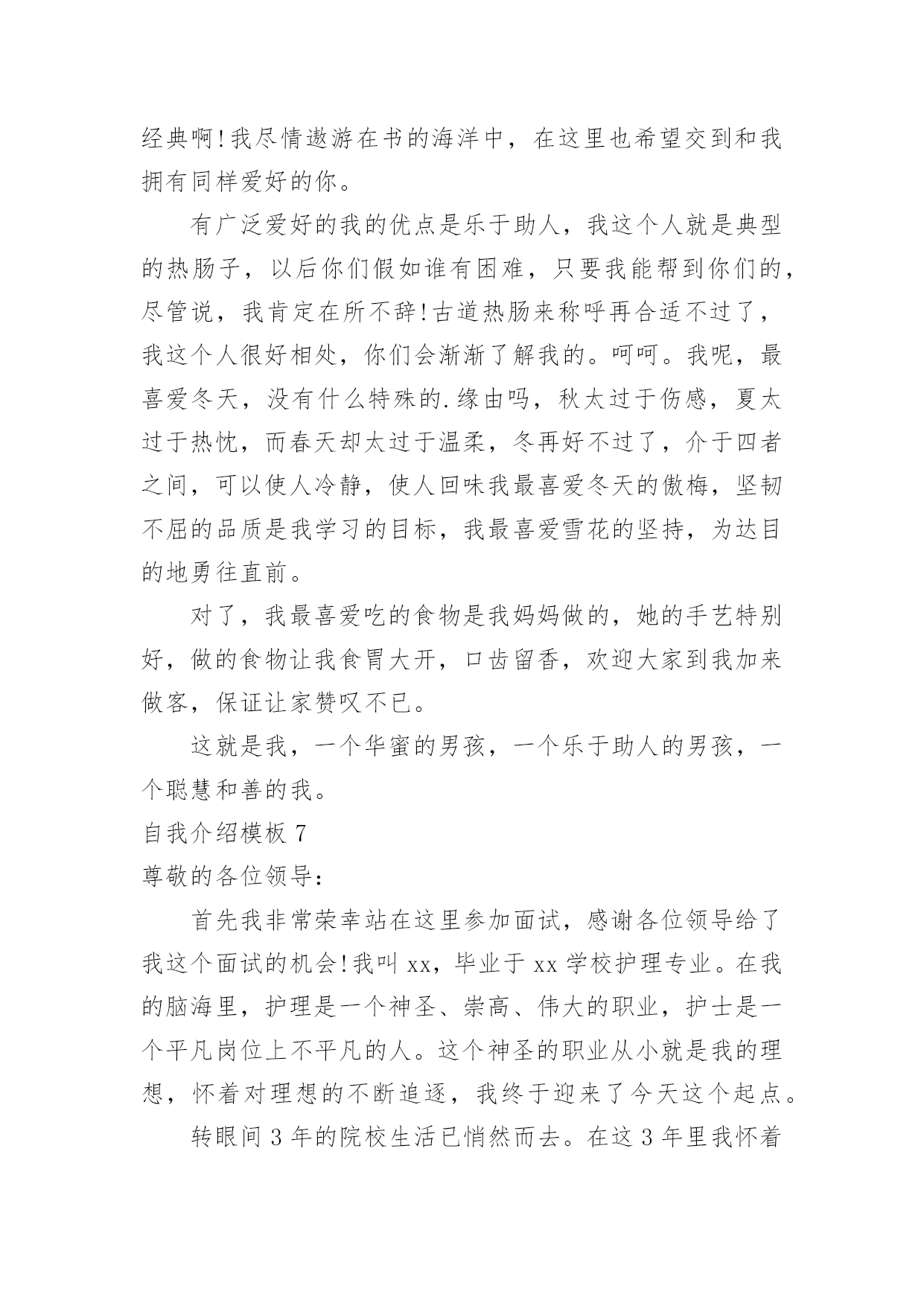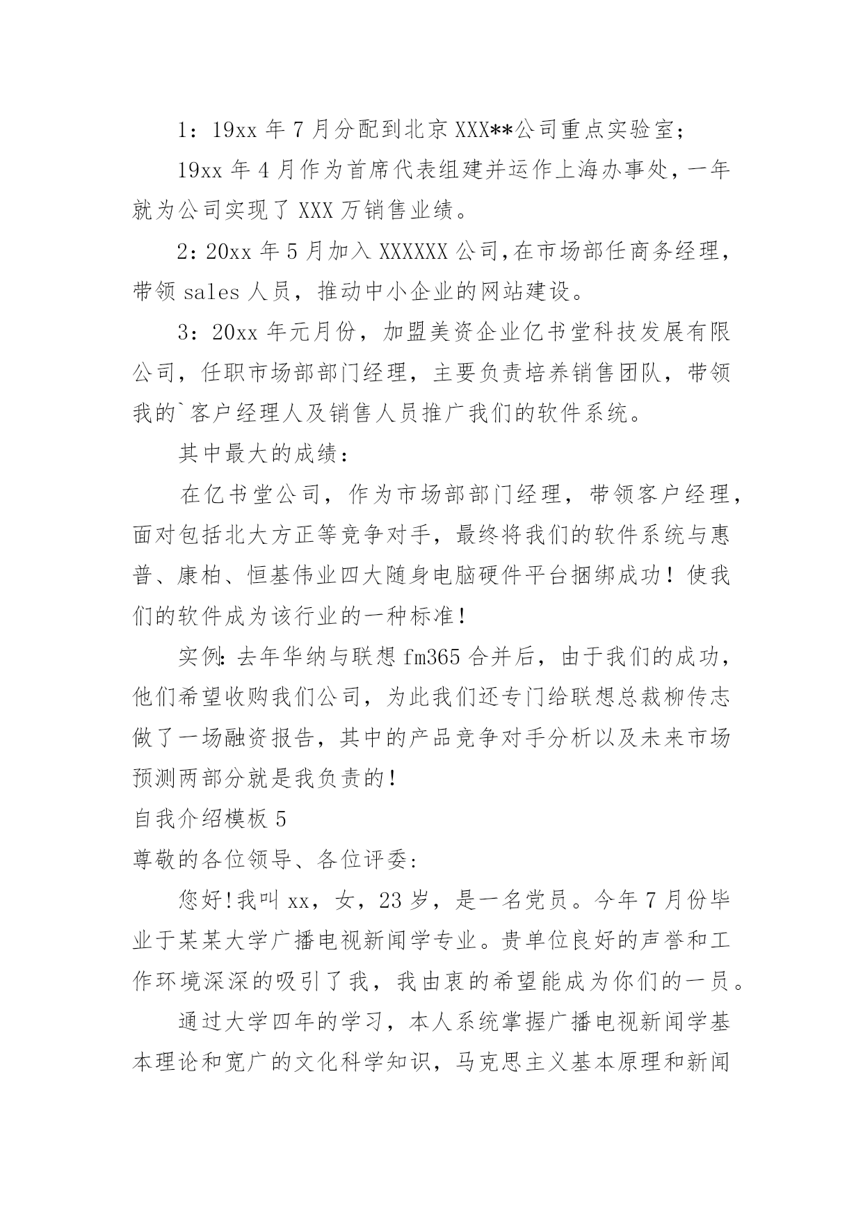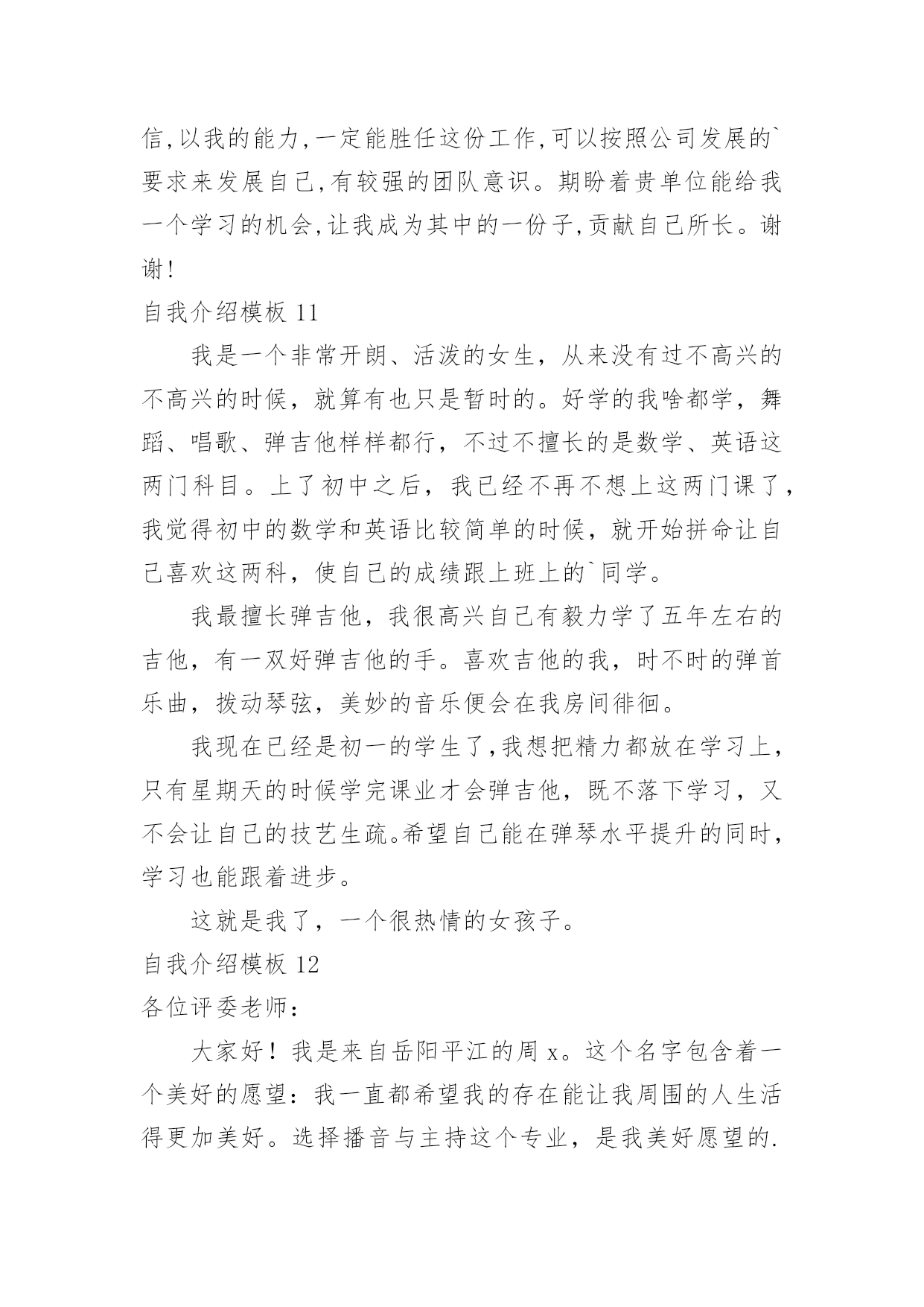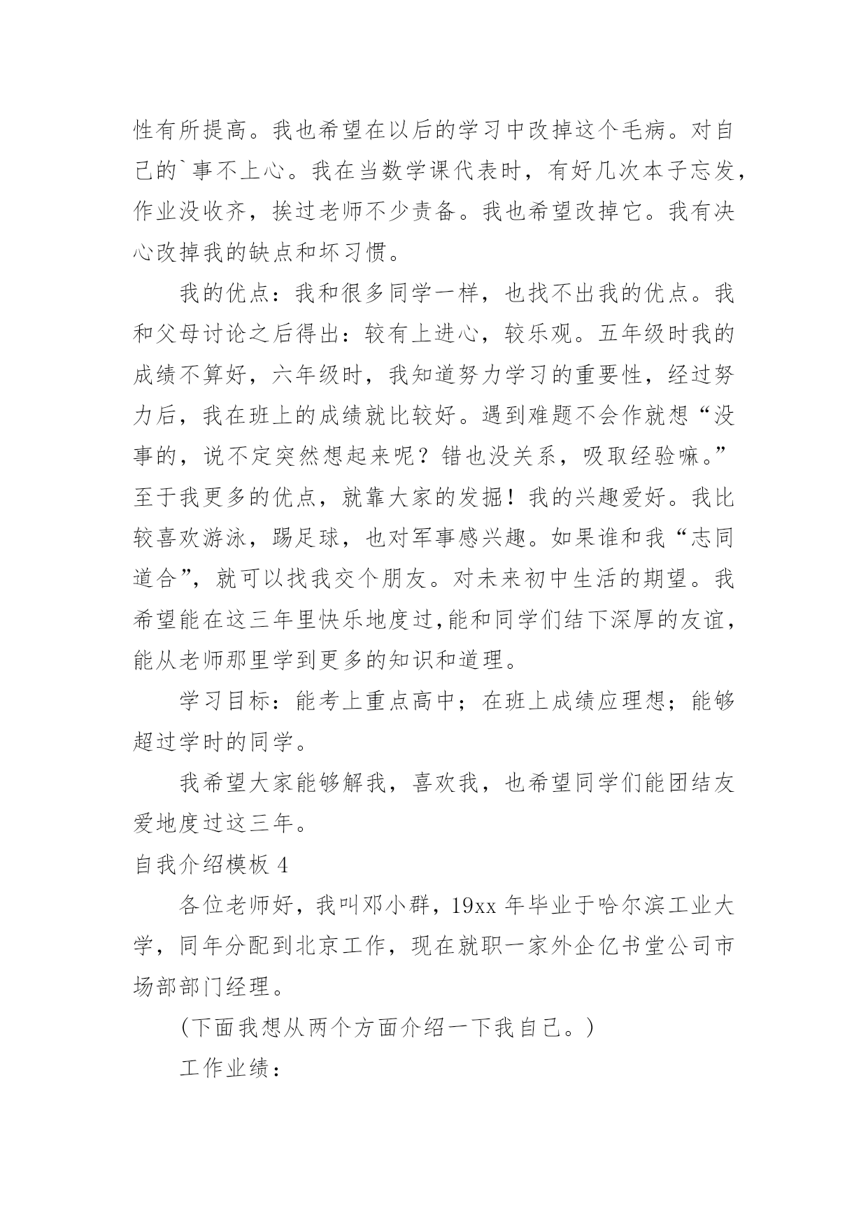自我介绍自我介绍当来到一个新环境时,进行自我介绍是必不可少的,通过自我介绍可以得到他人的认识。那么自我介绍要注意有什么内容呢?下面是小编精心整理的自我介绍模板,仅供参考,大家一起来看看吧。自我介绍模板1尊敬的面试官:早上好!我是一名普通的本科应届毕业生,来自xxx,我一直追求着自己的成就。我在校担任学生干部期间获得校级优秀学生干部的称号,有比较好的组织协调能力,在暑假期间多次勤工俭学,可以吃苦耐劳,参加xx省电子设计大赛获省二等奖,有很强的动手能力和学习能力,我可以能够在不同文化和工作人员的'背景下出色地工作。我的自我介绍完毕,谢谢!自我介绍模板2各位同学:大家好!有人说,看我觉得我是比较斯文滴。的确,我是挺斯文的。有人说,跟我相处,就觉得我是一个坏蛋,其实我也不是坏蛋,我是很善良的。其实,作为双子座的我,我觉得自己真的是一个双面人,该认真的时候,我是比较认真的,该疯狂的时候,我就真的很疯狂,所以通常有时候当我安静下来的时候,大家都会觉得有有点不对劲,但是实际上我只是在想东西而已。所以如果以后当我安静下来的'时候,大家就知道是怎么一回事了。安安静静、斯斯文文的我,不太能安安静静地坐着看书,但是总是能安安静静地听听歌、聊聊天啊。疯狂的我,喜欢在篮球场上乱叫,喜欢玩连连看和找茬,喜欢到处乱逛。能够相聚在武汉大学,相信这是我们的一种缘分,我会好好珍惜滴,希望在接下来的日子中,大家可以一起努力经营我们这个大家庭。自我介绍模板3大家好!我的名字叫郑博洋,郑成功的成,博士的博,海洋的洋,满族。我的个子不矮,但和班上的高个儿比起来,就逊色多。和大多数同学一样,我今年也是13岁。我的缺点。主要是作事不麻利,自觉性不高,对自己的事不上心。上六年级的时候,学校就在我家对面。我却常常是七点半起床,要做半个多时的准备才能出门,还经常迟到。因此同学们叫我“迟到大王”。现在,最起码六点多就要起床,才能有足够的时候吃饭、坐车等。这对我是个挑战。不过,我一定要借这个机会,改掉我不麻利的坏习惯。另外,自觉性不高,上课不免做些动作、讲话。前几天大家都参加军训,站着要一动也不动。我感到通过这次军训,我的自觉性有所提高。我也希望在以后的学习中改掉这个毛病。对自己的`事不上心。我在当数学课代表时,有好几次本子忘发,作业没收齐,挨过老师不少责备。我也希望改掉它。我有决心改掉我的缺点和坏习惯。我的优点:我和很多同学一样,也找不出我的优点。我和父母讨论之后得出:较有上进心,较乐观。五年级时我的成绩不算好,六年级时,我知道努力学习的重要性,经过努力后,我在班上的成绩就比较好。遇到难题不会作就想“没事的,说不定突然想起来呢?错也没关系,吸取经验嘛。”至于我更多的优点,就靠大家的发掘!我的兴趣爱好。我比较喜欢游泳,踢足球,也对军事感兴趣。如果谁和我“志同道合”,就可以找我交个朋友。对未来初中生活的期望。我希望能在这三年里快乐地度过,能和同学们结下深厚的友谊,能从老师那里学到更多的知识和道理。学习目标:能考上重点高中;在班上成绩应理想;能够超过学时的同学。我希望大家能够解我,喜欢我,也希望同学们能团结友爱地度过这三年。自我介绍模板4各位老师好,我叫邓小群,19xx年毕业于哈尔滨工业大学,同年分配到北京工作,现在就职一家外企亿书堂公司市场部部门经理。(下面我想从两个方面介绍一下我自己。)工作业绩:1:19xx年7月分配到北京XXX**公司重点实验室;19xx年4月作为首席代表组建并运作上海办事处,一年就为公司实现了XXX万销售业绩。2:20xx年5月加入XXXXXX公司,在市场部任商务经理,带领sales人员,推动中小企业的网站建设。3:20xx年元月份,加盟美资企业亿书堂科技发展有限公司,任职市场部部门经理,主要负责培养销售团队,带领我的`客户经理人及销售人员推广我们的软件系统。其中最大的成绩:在亿书堂公司,作为市场部部门经理,带领客户经理,面对包括北大方正等竞争对手,最终将我们的软件系统与惠普、康柏、恒基伟业四大随身电脑硬件平台捆绑成功!使我们的软件成为该行业的一种标准!实例:去年华纳与联想fm365合并后,由于我们的成功,他们希望收购我们公司,为此我们还专门给联想总裁柳传志做了一场融资报告,其中的产品竞争对手分析以及未来市场预测两部分就是我负责的!自我介绍模板5尊敬的各位领导、各位评委:您好!我叫xx,女,23岁,是一名党员。今年7月份毕业于某某大学广播电视新闻学专业。贵单位良好的声誉和工作环境深深的吸引了我,我由衷的希望能成为你们的一员。通过大学四年的学习,本人系统掌握广播电视新闻学基本理论和宽广的文化科学知识,马克思主义基本原理和新闻学、广播电视学、以及与广播电视有关学科的`基本理论和基础知识,受到广播电视新闻采访、写作、编导、播音、节日主持等方面的基本训练,具有广播电