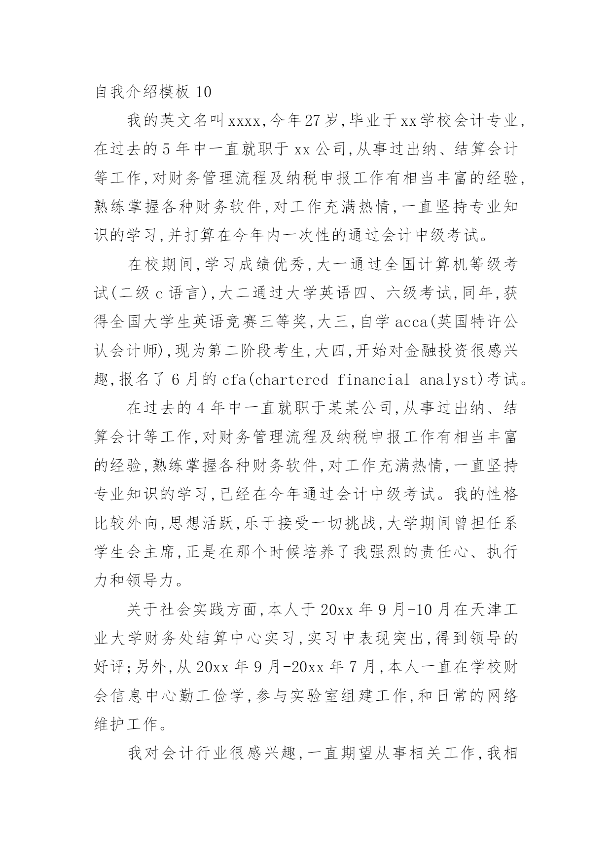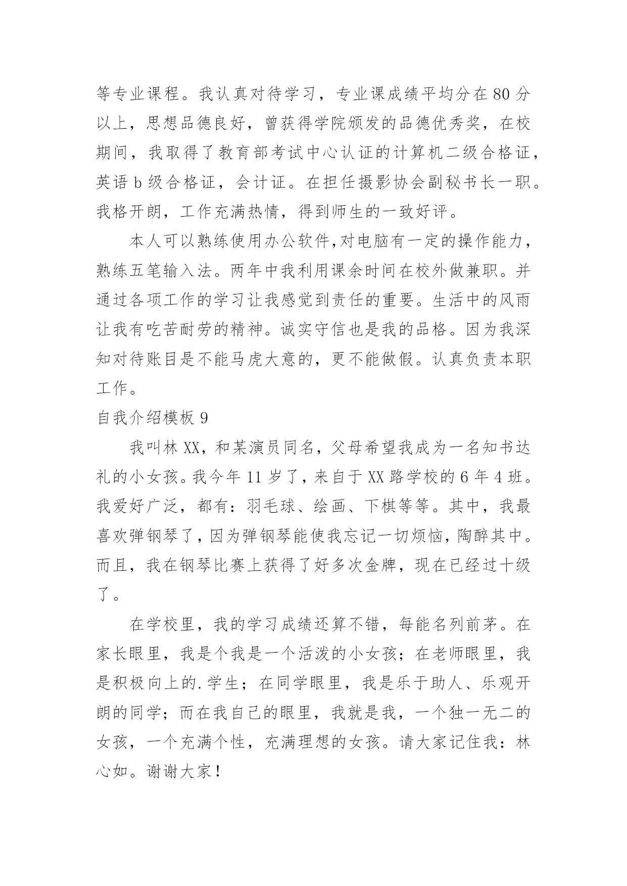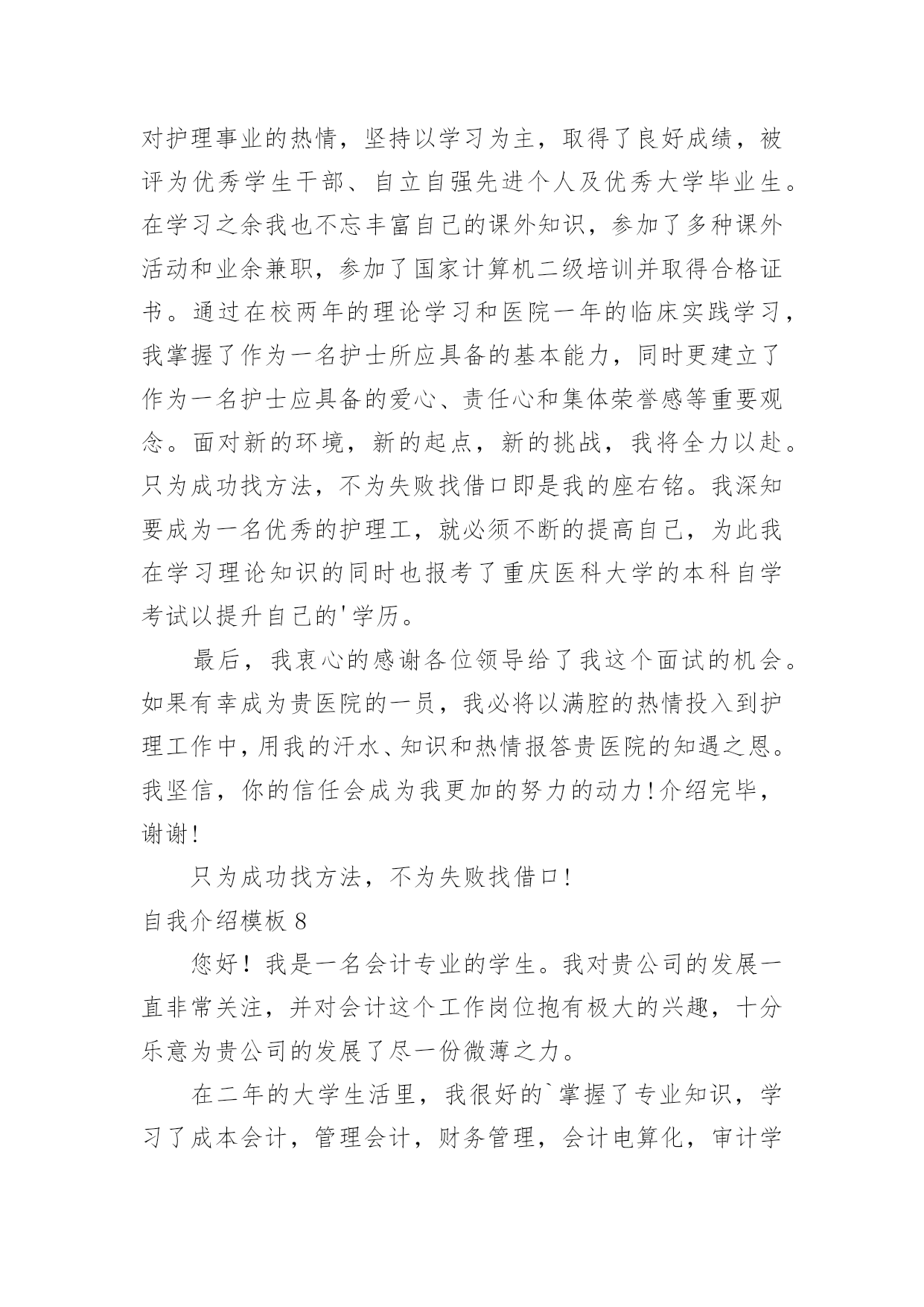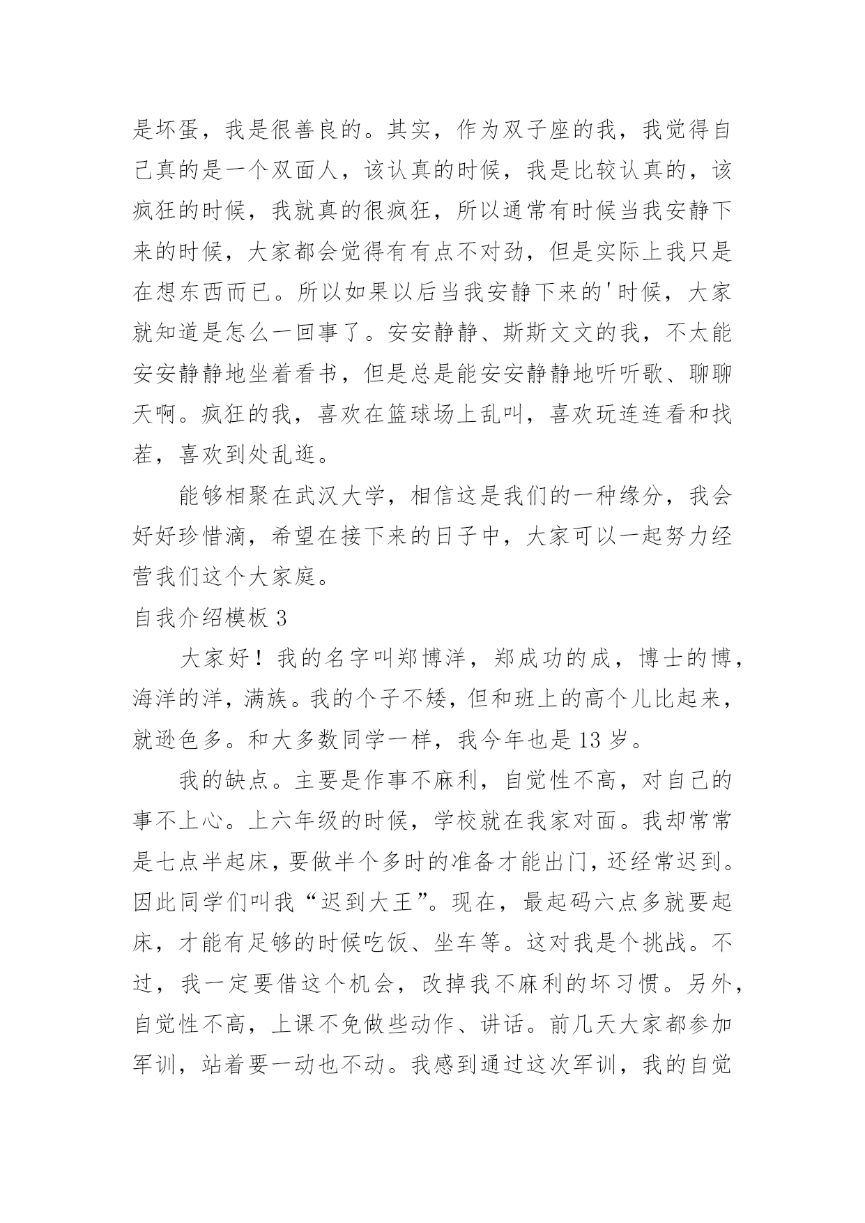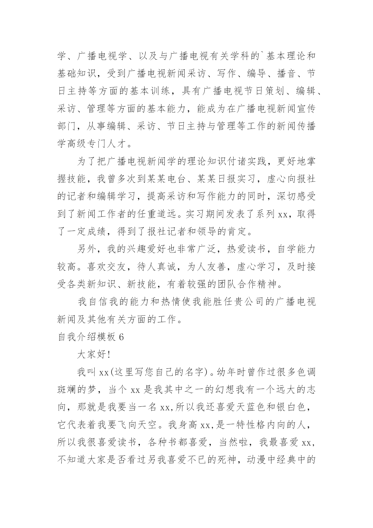 自我介绍自我介绍当来到一个新环境时,进行自我介绍是必不可少的,通过自我介绍可以得到他人的认识。那么自我介绍要注意有什么内容呢?下面是小编精心整理的自我介绍模板,仅供参考,大家一起来看看吧。自我介绍模板1尊敬的面试官:早上好!我是一名普通的本科应届毕业生,来自xxx,我一直追求着自己的成就。我在校担任学生干部期间获得校级优秀学生干部的称号,有比较好的组织协调能力,在暑假期间多次勤工俭学,可以吃苦耐劳,参加xx省电子设计大赛获省二等奖,有很强的动手能力和学习能力,我可以能够在不同文化和工作人员的'背景下出色地工作。我的自我介绍完毕,谢谢!自我介绍模板2各位同学:大家好!有人说,看我觉得我是比较斯文滴。的确,我是挺斯文的。有人说,跟我相处,就觉得我是一个坏蛋,其实我也不是坏蛋,我是很善良的。其实,作为双子座的我,我觉得自己真的是一个双面人,该认真的时候,我是比较认真的,该疯狂的时候,我就真的很疯狂,所以通常有时候当我安静下来的时候,大家都会觉得有有点不对劲,但是实际上我只是在想东西而已。所以如果以后当我安静下来的'时候,大家就知道是怎么一回事了。安安静静、斯斯文文的我,不太能安安静静地坐着看书,但是总是能安安静静地听听歌、聊聊天啊。疯狂的我,喜欢在篮球场上乱叫,喜欢玩连连看和找茬,喜欢到处乱逛。能够相聚在武汉大学,相信这是我们的一种缘分,我会好好珍惜滴,希望在接下来的日子中,大家可以一起努力经营我们这个大家庭。自我介绍模板3大家好!我的名字叫郑博洋,郑成功的成,博士的博,海洋的洋,满族。我的个子不矮,但和班上的高个儿比起来,就逊色多。和大多数同学一样,我今年也是13岁。我的缺点。主要是作事不麻利,自觉性不高,对自己的事不上心。上六年级的时候,学校就在我家对面。我却常常是七点半起床,要做半个多时的准备才能出门,还经常迟到。因此同学们叫我“迟到大王”。现在,最起码六点多就要起床,才能有足够的时候吃饭、坐车等。这对我是个挑战。不过,我一定要借这个机会,改掉我不麻利的坏习惯。另外,自觉性不高,上课不免做些动作、讲话。前几天大家都参加军训,站着要一动也不动。我感到通过这次军训,我的自觉性有所提高。我也希望在以后的学习中改掉这个毛病。对自己的`事不上心。我在当数学课代表时,有好几次本子忘发,作业没收齐,挨过老师不少责备。我也希望改掉它。我有决心改掉我的缺点和坏习惯。我的优点:我和很多同学一样,也找不出我的优点。我和父母讨论之后得出:较有上进心,较乐观。五年级时我的成绩不算好,六年级时,我知道努力学习的重要性,经过努力后,我在班上的成绩就比较好。遇到难题不会作就想“没事的,说不定突然想起来呢?错也没关系,吸取经验嘛。”至于我更多的优点,就靠大家的发掘!我的兴趣爱好。我比较喜欢游泳,踢足球,也对军事感兴趣。如果谁和我“志同道合”,就可以找我交个朋友。对未来初中生活的期望。我希望能在这三年里快乐地度过,能和同学们结下深厚的友谊,能从老师那里学到更多的知识和道理。学习目标:能考上重点高中;在班上成绩应理想;能够超过学时的同学。我希望大家能够解我,喜欢我,也希望同学们能团结友爱地度过这三年。自我介绍模板4各位老师好,我叫邓小群,19xx年毕业于哈尔滨工业大学,同年分配到北京工作,现在就职一家外企亿书堂公司市场部部门经理。(下面我想从两个方面介绍一下我自己。)工作业绩:1:19xx年7月分配到北京XXX**公司重点实验室;19xx年4月作为首席代表组建并运作上海办事处,一年就为公司实现了XXX万销售业绩。2:20xx年5月加入XXXXXX公司,在市场部任商务经理,带领sales人员,推动中小企业的网站建设。3:20xx年元月份,加盟美资企业亿书堂科技发展有限公司,任职市场部部门经理,主要负责培养销售团队,带领我的`客户经理人及销售人员推广我们的软件系统。其中最大的成绩:在亿书堂公司,作为市场部部门经理,带领客户经理,面对包括北大方正等竞争对手,最终将我们的软件系统与惠普、康柏、恒基伟业四大随身电脑硬件平台捆绑成功!使我们的软件成为该行业的一种标准!实例:去年华纳与联想fm365合并后,由于我们的成功,他们希望收购我们公司,为此我们还专门给联想总裁柳传志做了一场融资报告,其中的产品竞争对手分析以及未来市场预测两部分就是我负责的!自我介绍模板5尊敬的各位领导、各位评委:您好!我叫xx,女,23岁,是一名党员。今年7月份毕业于某某大学广播电视新闻学专业。贵单位良好的声誉和工作环境深深的吸引了我,我由衷的希望能成为你们的一员。通过大学四年的学习,本人系统掌握广播电视新闻学基本理论和宽广的文化科学知识,马克思主义基本原理和新闻学、广播电视学、以及与广播电视有关学科的`基本理论和基础知识,受到广播电视新闻采访、写作、编导、播音、节日主持等方面的基本训练,具有广播电