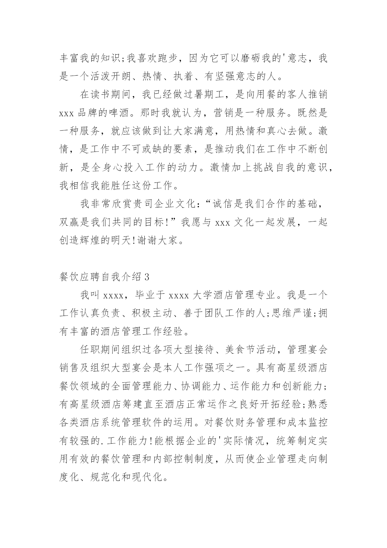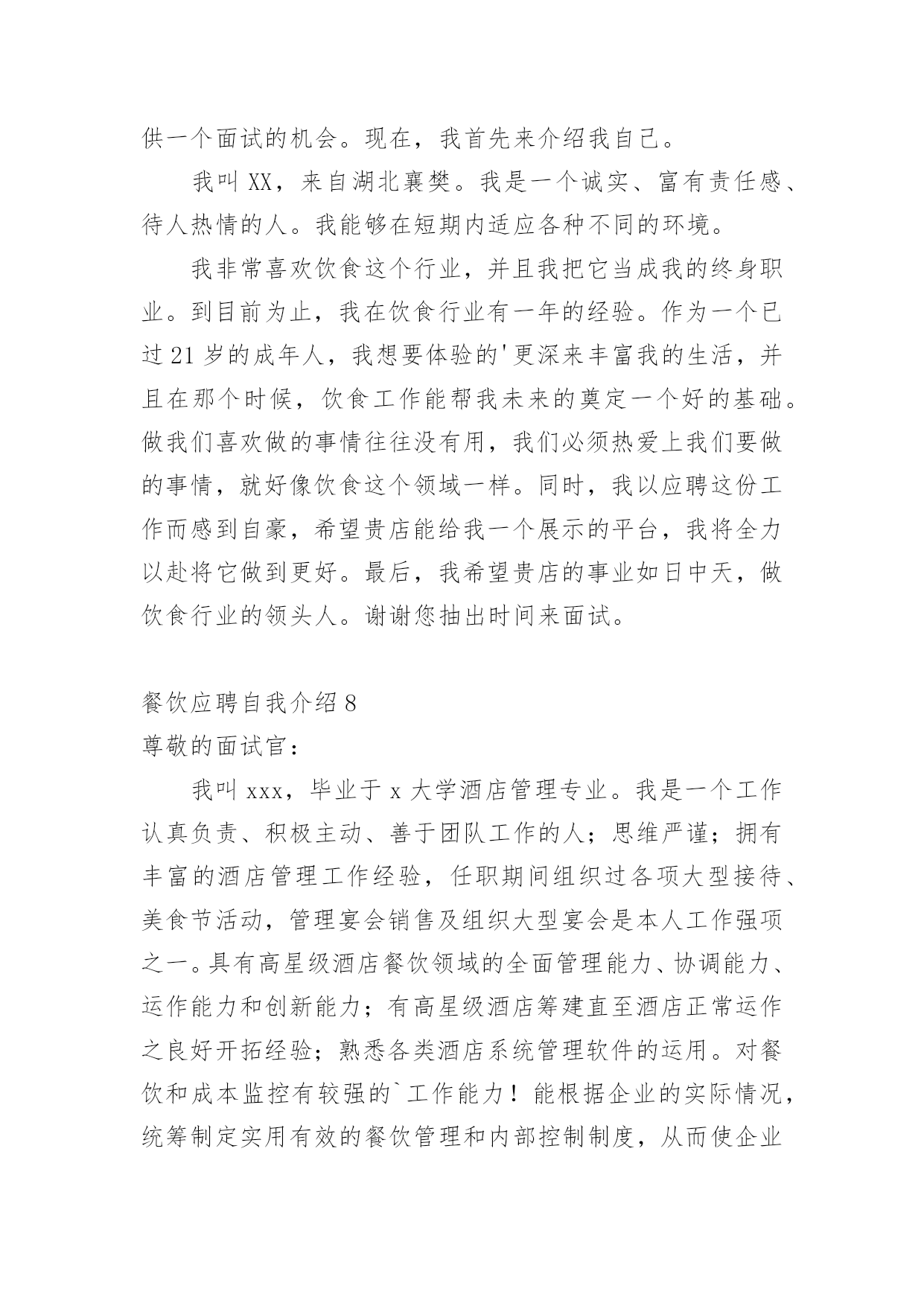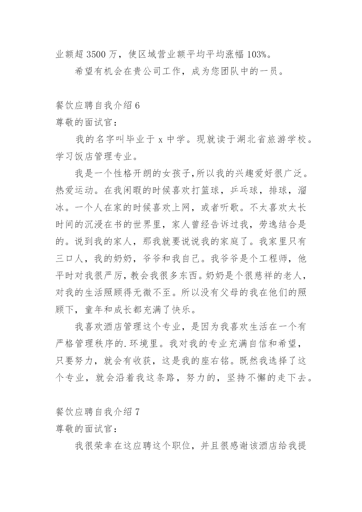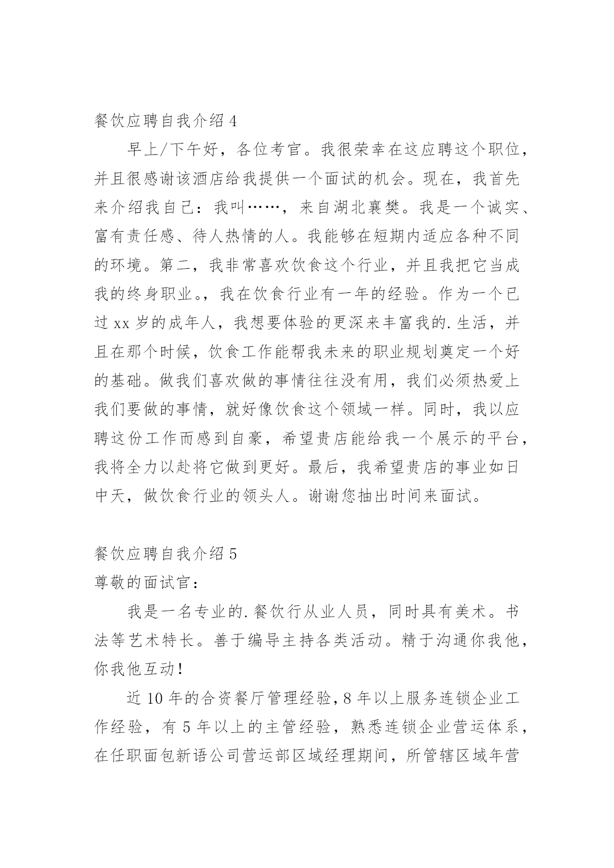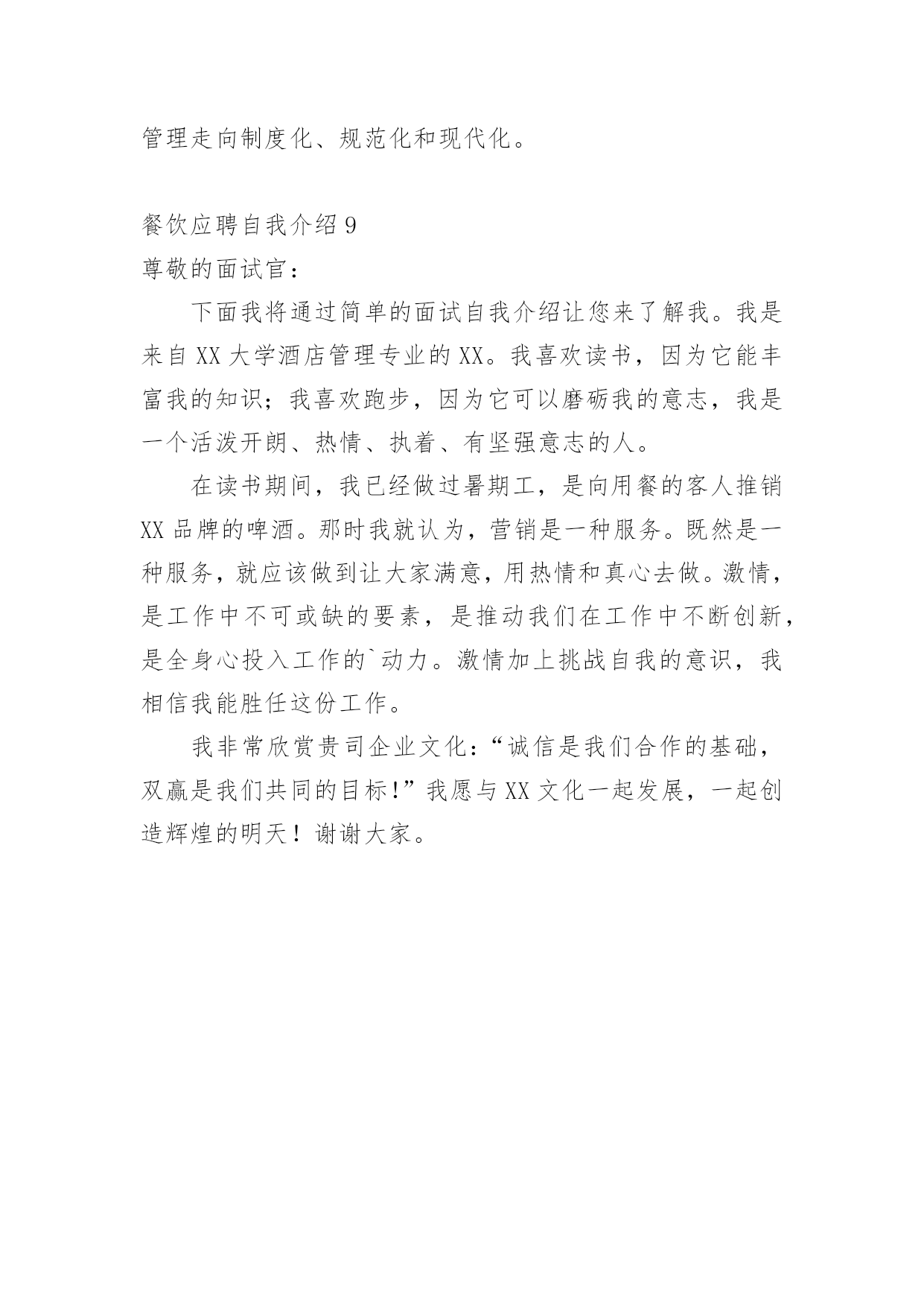 餐饮应聘自我介绍当来到一个陌生的地方时,我们不得不需要向他人介绍自己,自我介绍可以给陌生人留下一个好的印象。那么自我介绍要注意有什么内容呢?下面是小编帮大家整理的餐饮应聘自我介绍,仅供参考,大家一起来看看吧。餐饮应聘自我介绍1尊敬的面试官:我叫XX,毕业于x大学酒店管理专业。我是一个工作认真负责、积极主动、善于团队工作的'人;思维严谨;拥有丰富的酒店管理工作经验,任职期间组织过各项大型接待、美食节活动,管理宴会销售及组织大型宴会是本人工作强项之一。具有高星级酒店餐饮领域的全面管理能力、协调能力、运作能力和创新能力;有高星级酒店筹建直至酒店正常运作之良好开拓经验;熟悉各类酒店系统管理软件的运用。对餐饮和成本监控有较强的工作能力!能根据企业的实际情况,统筹制定实用有效的餐饮管理和内部控制制度,从而使企业管理走向制度化、规范化和现代化。餐饮应聘自我介绍2尊敬的面试官:下面我将通过简单的面试自我介绍让您来了解我。我是来自xxx大学酒店管理专业的xxxx。我喜欢读书,因为它能丰富我的知识;我喜欢跑步,因为它可以磨砺我的'意志,我是一个活泼开朗、热情、执着、有坚强意志的人。在读书期间,我已经做过暑期工,是向用餐的客人推销xxx品牌的啤酒。那时我就认为,营销是一种服务。既然是一种服务,就应该做到让大家满意,用热情和真心去做。激情,是工作中不可或缺的要素,是推动我们在工作中不断创新,是全身心投入工作的动力。激情加上挑战自我的意识,我相信我能胜任这份工作。我非常欣赏贵司企业文化:“诚信是我们合作的基础,双赢是我们共同的目标!”我愿与xxx文化一起发展,一起创造辉煌的明天!谢谢大家。餐饮应聘自我介绍3我叫xxxx,毕业于xxxx大学酒店管理专业。我是一个工作认真负责、积极主动、善于团队工作的人;思维严谨;拥有丰富的酒店管理工作经验。任职期间组织过各项大型接待、美食节活动,管理宴会销售及组织大型宴会是本人工作强项之一。具有高星级酒店餐饮领域的全面管理能力、协调能力、运作能力和创新能力;有高星级酒店筹建直至酒店正常运作之良好开拓经验;熟悉各类酒店系统管理软件的运用。对餐饮财务管理和成本监控有较强的.工作能力!能根据企业的'实际情况,统筹制定实用有效的餐饮管理和内部控制制度,从而使企业管理走向制度化、规范化和现代化。餐饮应聘自我介绍4早上/下午好,各位考官。我很荣幸在这应聘这个职位,并且很感谢该酒店给我提供一个面试的机会。现在,我首先来介绍我自己:我叫……,来自湖北襄樊。我是一个诚实、富有责任感、待人热情的人。我能够在短期内适应各种不同的环境。第二,我非常喜欢饮食这个行业,并且我把它当成我的终身职业。,我在饮食行业有一年的经验。作为一个已过xx岁的成年人,我想要体验的更深来丰富我的.生活,并且在那个时候,饮食工作能帮我未来的职业规划奠定一个好的基础。做我们喜欢做的事情往往没有用,我们必须热爱上我们要做的事情,就好像饮食这个领域一样。同时,我以应聘这份工作而感到自豪,希望贵店能给我一个展示的平台,我将全力以赴将它做到更好。最后,我希望贵店的事业如日中天,做饮食行业的领头人。谢谢您抽出时间来面试。餐饮应聘自我介绍5尊敬的面试官:我是一名专业的.餐饮行从业人员,同时具有美术。书法等艺术特长。善于编导主持各类活动。精于沟通你我他,你我他互动!近10年的合资餐厅管理经验,8年以上服务连锁企业工作经验,有5年以上的主管经验,熟悉连锁企业营运体系,在任职面包新语公司营运部区域经理期间,所管辖区域年营业额超3500万,使区域营业额平均平均涨幅103%。希望有机会在贵公司工作,成为您团队中的一员。餐饮应聘自我介绍6尊敬的面试官:我的名字叫毕业于x中学。现就读于湖北省旅游学校。学习饭店管理专业。我是一个性格开朗的女孩子,所以我的兴趣爱好很广泛。热爱运动。在我闲暇的时候喜欢打篮球,乒乓球,排球,溜冰。一个人在家的时候喜欢上网,或者听歌。不太喜欢太长时间的沉浸在书的世界里,家人曾经告诉过我,劳逸结合是的。说到我的家人,那我就要说说我的家庭了。我家里只有三口人,我的奶奶,爷爷和我自己。我爷爷是个工程师,他平时对我很严厉,教会我很多东西。奶奶是个很慈祥的老人,对我的生活照顾得无微不至。所以没有父母的我在他们的照顾下,童年和成长都充满了快乐。我喜欢酒店管理这个专业,是因为我喜欢生活在一个有严格管理秩序的.环境里。我对我的专业充满自信和希望,只要努力,就会有收获,这是我的座右铭。既然我选择了这个专业,就会沿着我这条路,努力的,坚持不懈的走下去。餐饮应聘自我介绍7尊敬的面试官:我很荣幸在这应聘这个职位,并且很感谢该酒店给我提供一个面试的机会。现在,我首先来介绍我自己。我叫XX,来自湖北襄樊。我是一个诚实、富有责任感、待人热情的人。我能够在短期内适应各种不同的环境。我非常喜欢饮食这个