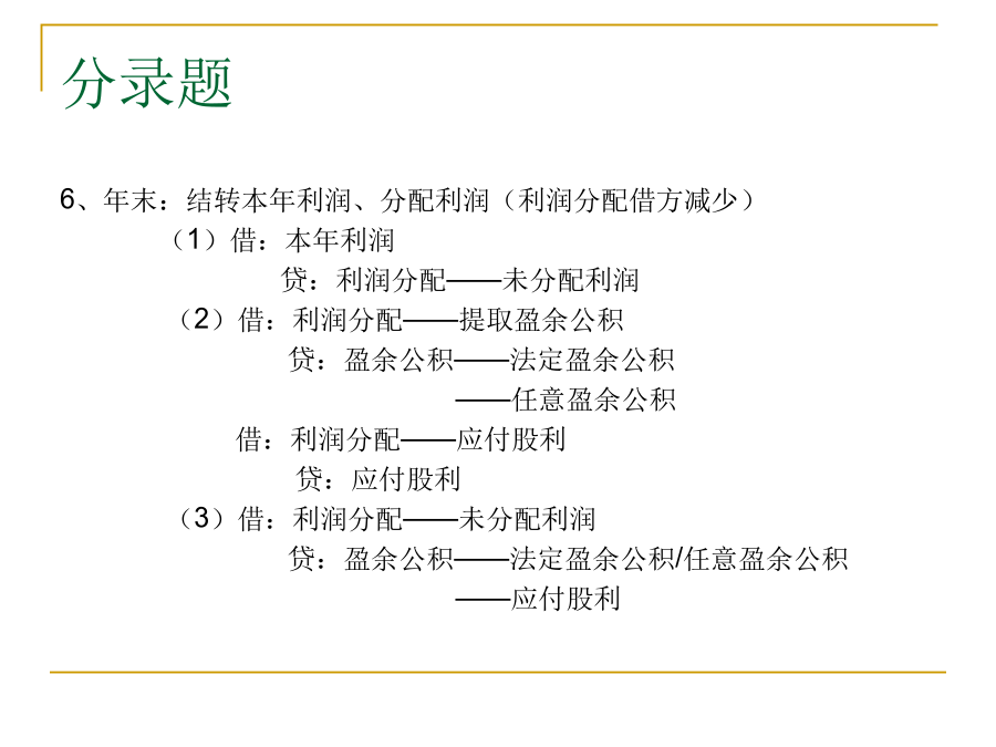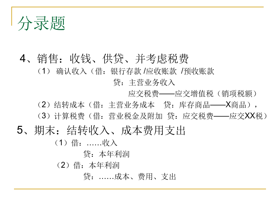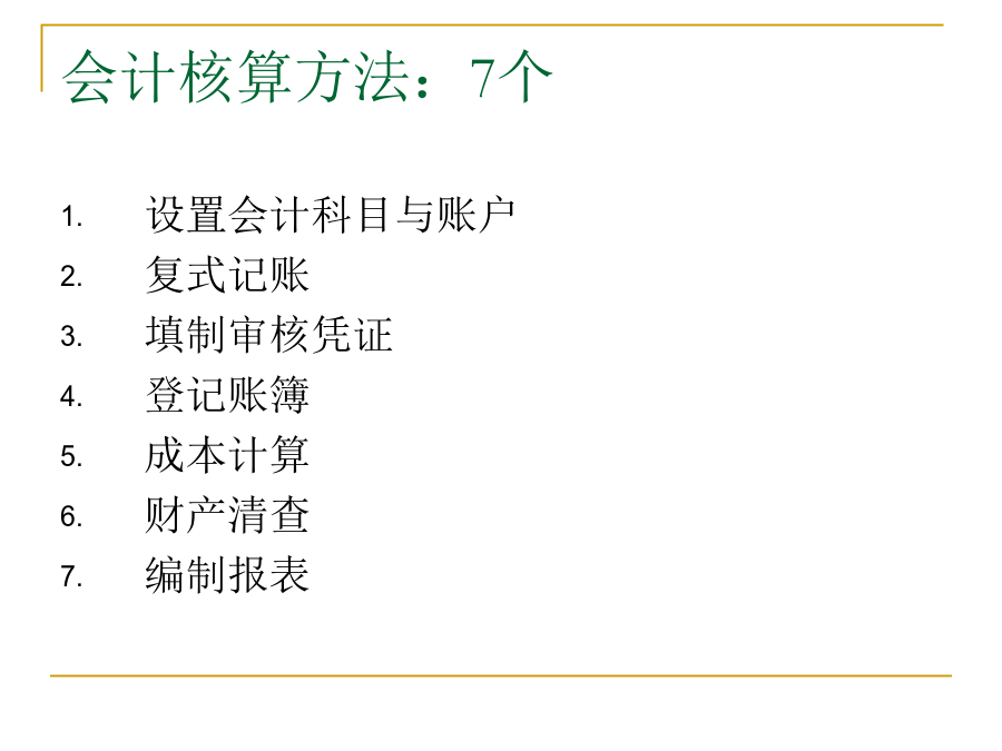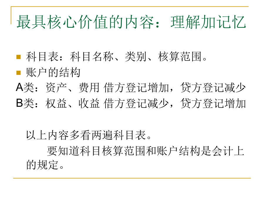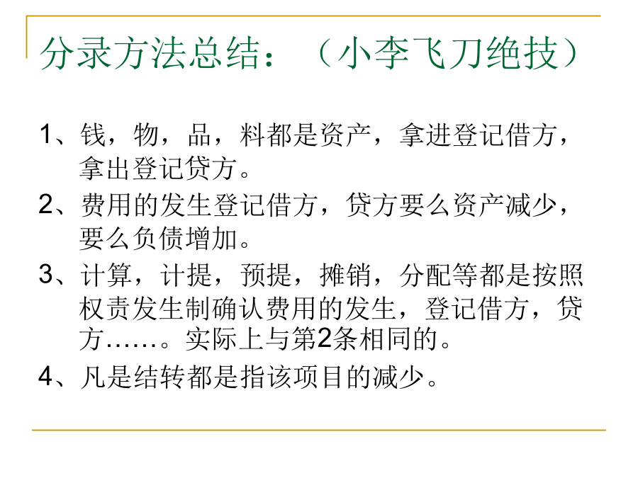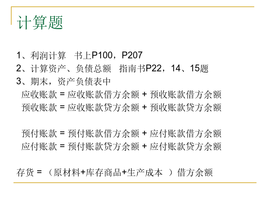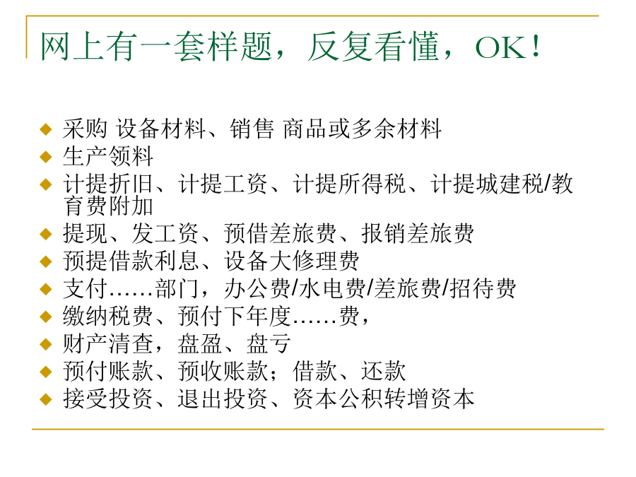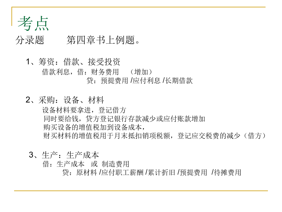 会计从业资格串讲会计核算方法:7个账务处理程序最具核心价值的内容:理解加记忆考点分录题分录题分录方法总结:(小李飞刀绝技)网上有一套样题,反复看懂,OK!计算题客观题:一单选、二多选、三判断四、简答题:第一章总论第一章总论1、账务处理程序1、筹集资金(1)2、生产准备业务(1):购买固定资产2、生产准备业务(2):购买材料3、产品生产业务:生产成本构成情况3、产品生产业务(3):核算简图4、产品销售业务(1)5、结转收入、成本、费用、支出6、利润分配——提取盈余公积、分配给投资者利润