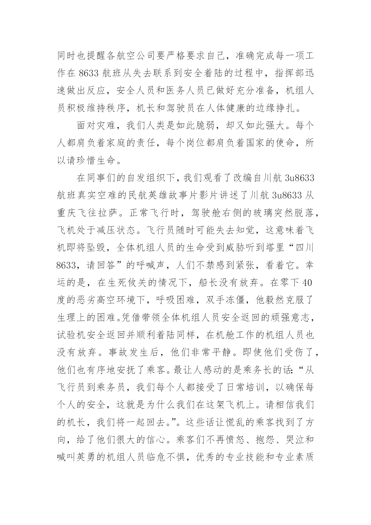 《中国机长》观后感关于《中国机长》观后感范文当认真看完一部作品后,一定有不少感悟吧,这时候十分有必须要写一篇观后感了!那么你会写观后感吗?以下是小编精心整理的关于《中国机长》观后感范文,供大家参考借鉴,希望可以帮助到有需要的朋友。一句热情的问候,几句调皮的聊天,一段痛苦的过去,一个期待的眼神,一颗奢华的心,一颗纯洁的心,一个无知的女孩和一位经验丰富的船长,把这群人绑在一起,经历了一个生与死的循环就像中国的`两颗豌豆一样,中国飞机的机长告诉我们,早上好是笑声和笑声的混合体。一架名为8633的航班从重庆飞往拉萨。飞机上的一切都和平常一模一样。每个人都处于放松状态。突然,飞机的前挡风玻璃破了,副驾驶被半个身体吸了出来,暴露在空气中。整个飞机突然变得一片混乱,女孩们哭泣,女孩们抱怨,男人们愤怒,每个人都害怕。然而,有五名船员负有神圣的责任。他们迅速维持机舱秩序,帮助乘客戴上氧气面罩,安抚大家的情绪,虽然他们的内心也非常害怕,但他们仍然选择相信船长,坚持自己的责任。船长刘长坚以其高超的技术成功地穿越了几乎不可能的云层,拯救了100多名乘客的生命。最后,8633航班成功着陆8633航班的成功着陆确实是航空史上一个值得纪念的事件。它象征着中国航空驾驶技术的快速发展,但同时也提醒各航空公司要严格要求自己,准确完成每一项工作在8633航班从失去联系到安全着陆的过程中,指挥部迅速做出反应,安全人员和医务人员已做好充分准备,机组人员积极维持秩序,机长和驾驶员在人体健康的边缘挣扎。面对灾难,我们人类是如此脆弱,却又如此强大。每个人都肩负着家庭的责任,每个岗位都肩负着国家的使命,所以请珍惜生命。在同事们的自发组织下,我们观看了改编自川航3u8633航班真实空难的民航英雄故事片影片讲述了川航3u8633从重庆飞往拉萨。正常飞行时,驾驶舱右侧的玻璃突然脱落,飞机处于减压状态。飞行员随时可能失去知觉,这意味着飞机即将坠毁,全体机组人员的生命受到威胁听到塔里“四川8633,请回答”的呼喊声,人们不禁感到紧张,看着它。幸运的是,在生死攸关的情况下,船长没有放弃。在零下40度的恶劣高空环境下,呼吸困难,双手冻僵,他毅然克服了生理上的困难。凭借带领全体机组人员安全返回的顽强意志,试验机安全返回并顺利着陆同样,在机舱工作的机组人员也没有放弃。事故发生后,他们非常平静。即使他们受伤了,他们也有序地安抚了乘客。最让人感动的是乘务长的话:“从飞行员到乘务员,我们每个人都接受了日常培训,以确保每个人的安全,这就是为什么我们在这架飞机上。请相信我们的机长,我们将一起回去。”。这些话让慌乱的乘客找到了方向,给了他们很大的信心。乘客们不再愤怒、抱怨、哭泣和喊叫英勇的机组人员临危不惧,优秀的专业技能和专业素质值得所有民航人员学习,尤其是我们的安全检查,毕竟,安全是重中之重,安全责任比泰山更重要。更重要的是,我们不能懈怠和玩忽职守。只有通过刻苦的学习和实践,我们才能拥有优秀的专业技能,最大限度地降低风险,让每一个航班安全着陆,让每一位乘客安全抵达。