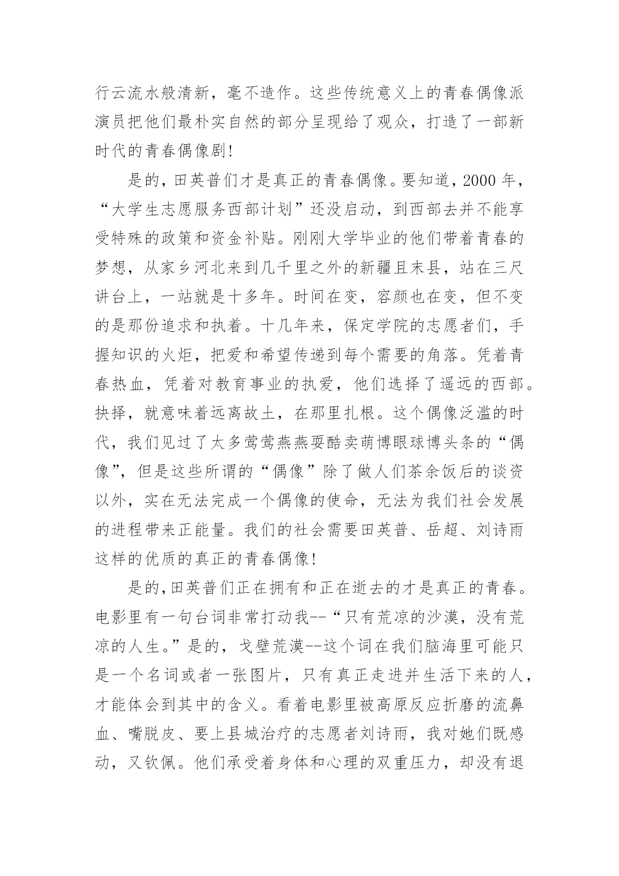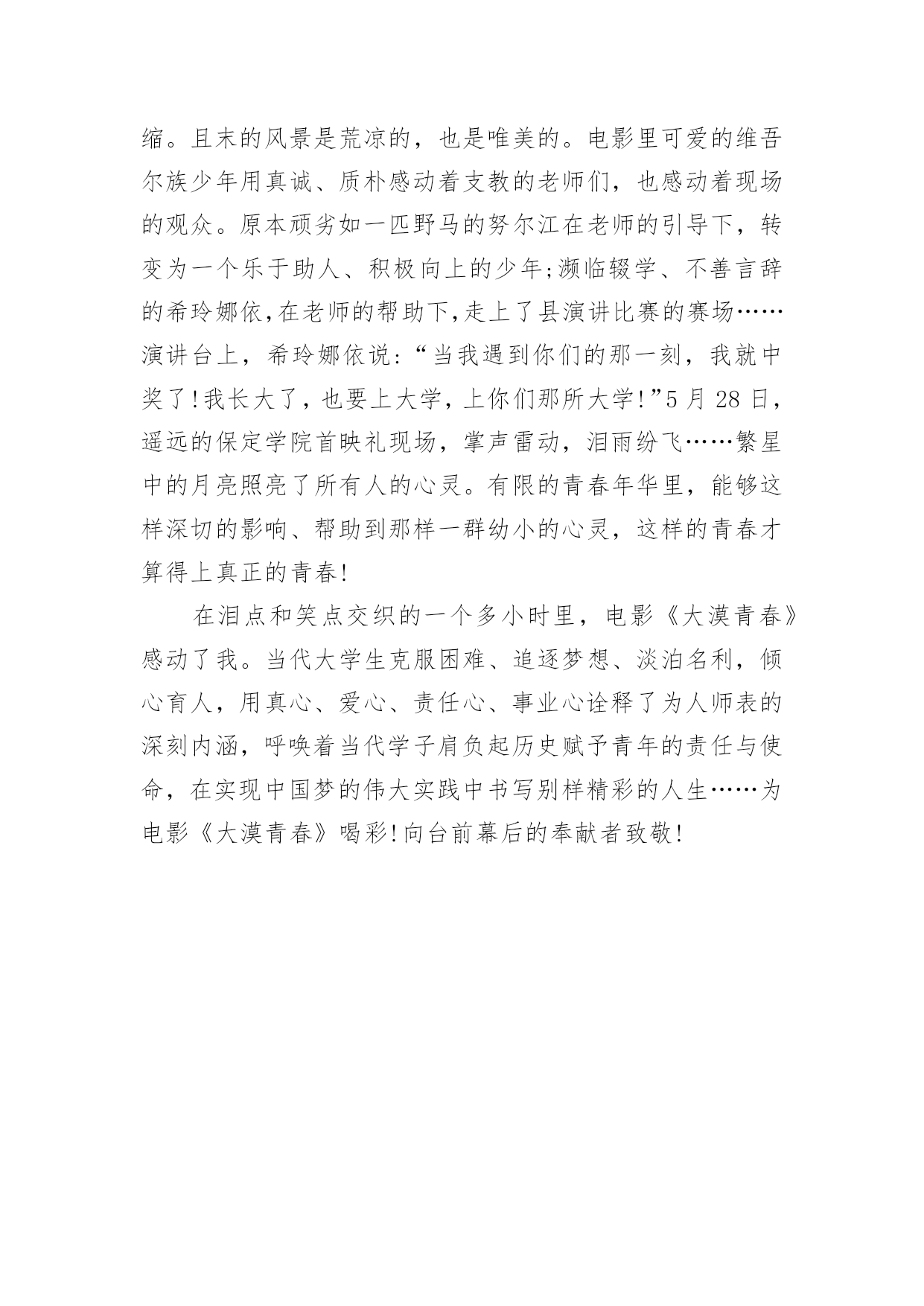 大漠青春观后感当看完一部作品后,这次观看让你有什么体会呢?撰写观后感可以帮助我们提升自己。你想知道观后感怎么写吗?以下是小编精心整理的大漠青春观后感,供大家参考借鉴,希望可以帮助到有需要的朋友。很多人说,这是一个缺乏信仰的时代。对时下热炒的一些青春偶像剧,我只能付之一笑。5月28日,在---复信保定学院西部支教毕业生群体一周年之际,由团中央宣传部监制的电影《大漠青春》全国首映式在河北保定学院举行,我很久不曾被撼动的心被这部真正的青春偶像剧深深的震撼了。是的,这才是一部真正的青春偶像剧。电影《大漠青春》是共青团中央宣传部与河北好人缘影视制作发行有限责任公司、山西飞天影视传媒、北京九州同映数字电影院线联合摄制的。电影《大漠青春》以保定学院毕业生田英普、岳超和志愿者刘诗雨怀着“献身西部、绽放青春”的理想,扎根新疆且末县中学任教为主线,艺术地再现了保定学院西部支教毕业生群体淡泊名利、克服困难、乐观向上、倾心育人的感人故事。来自保定本土的编剧袁凤岐胡杨红柳般的坚持终于有了收获,整个剧本脉络清晰、高潮迭起,现场笑点泪点交织、掌声连连。导演智磊和贡米、吕聿来、赵千紫等深受青少年喜爱的青年演员给观众带来了无数惊喜,他们的表演行云流水般清新,毫不造作。这些传统意义上的青春偶像派演员把他们最朴实自然的部分呈现给了观众,打造了一部新时代的青春偶像剧!是的,田英普们才是真正的青春偶像。要知道,2000年,“大学生志愿服务西部计划”还没启动,到西部去并不能享受特殊的政策和资金补贴。刚刚大学毕业的他们带着青春的梦想,从家乡河北来到几千里之外的新疆且末县,站在三尺讲台上,一站就是十多年。时间在变,容颜也在变,但不变的是那份追求和执着。十几年来,保定学院的志愿者们,手握知识的火炬,把爱和希望传递到每个需要的角落。凭着青春热血,凭着对教育事业的执爱,他们选择了遥远的西部。抉择,就意味着远离故土,在那里扎根。这个偶像泛滥的时代,我们见过了太多莺莺燕燕耍酷卖萌博眼球博头条的“偶像”,但是这些所谓的“偶像”除了做人们茶余饭后的谈资以外,实在无法完成一个偶像的使命,无法为我们社会发展的进程带来正能量。我们的社会需要田英普、岳超、刘诗雨这样的优质的真正的青春偶像!是的,田英普们正在拥有和正在逝去的才是真正的青春。电影里有一句台词非常打动我--“只有荒凉的沙漠,没有荒凉的人生。”是的,戈壁荒漠--这个词在我们脑海里可能只是一个名词或者一张图片,只有真正走进并生活下来的人,才能体会到其中的含义。看着电影里被高原反应折磨的流鼻血、嘴脱皮、要上县城治疗的志愿者刘诗雨,我对她们既感动,又钦佩。他们承受着身体和心理的双重压力,却没有退缩。且末的风景是荒凉的,也是唯美的。电影里可爱的维吾尔族少年用真诚、质朴感动着支教的老师们,也感动着现场的观众。原本顽劣如一匹野马的努尔江在老师的引导下,转变为一个乐于助人、积极向上的少年;濒临辍学、不善言辞的希玲娜依,在老师的帮助下,走上了县演讲比赛的赛场……演讲台上,希玲娜依说:“当我遇到你们的那一刻,我就中奖了!我长大了,也要上大学,上你们那所大学!”5月28日,遥远的保定学院首映礼现场,掌声雷动,泪雨纷飞……繁星中的月亮照亮了所有人的心灵。有限的青春年华里,能够这样深切的影响、帮助到那样一群幼小的心灵,这样的青春才算得上真正的青春!在泪点和笑点交织的一个多小时里,电影《大漠青春》感动了我。当代大学生克服困难、追逐梦想、淡泊名利,倾心育人,用真心、爱心、责任心、事业心诠释了为人师表的深刻内涵,呼唤着当代学子肩负起历史赋予青年的责任与使命,在实现中国梦的伟大实践中书写别样精彩的人生……为电影《大漠青春》喝彩!向台前幕后的奉献者致敬!