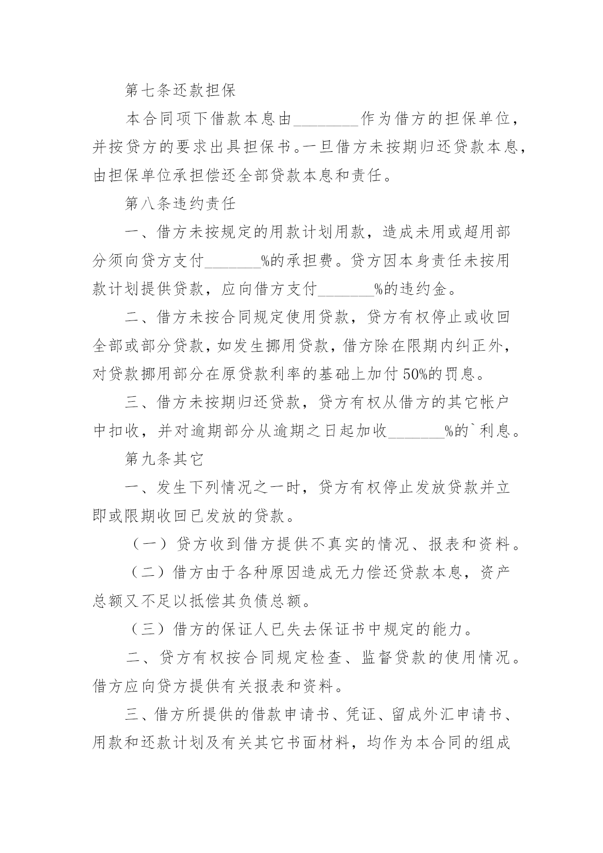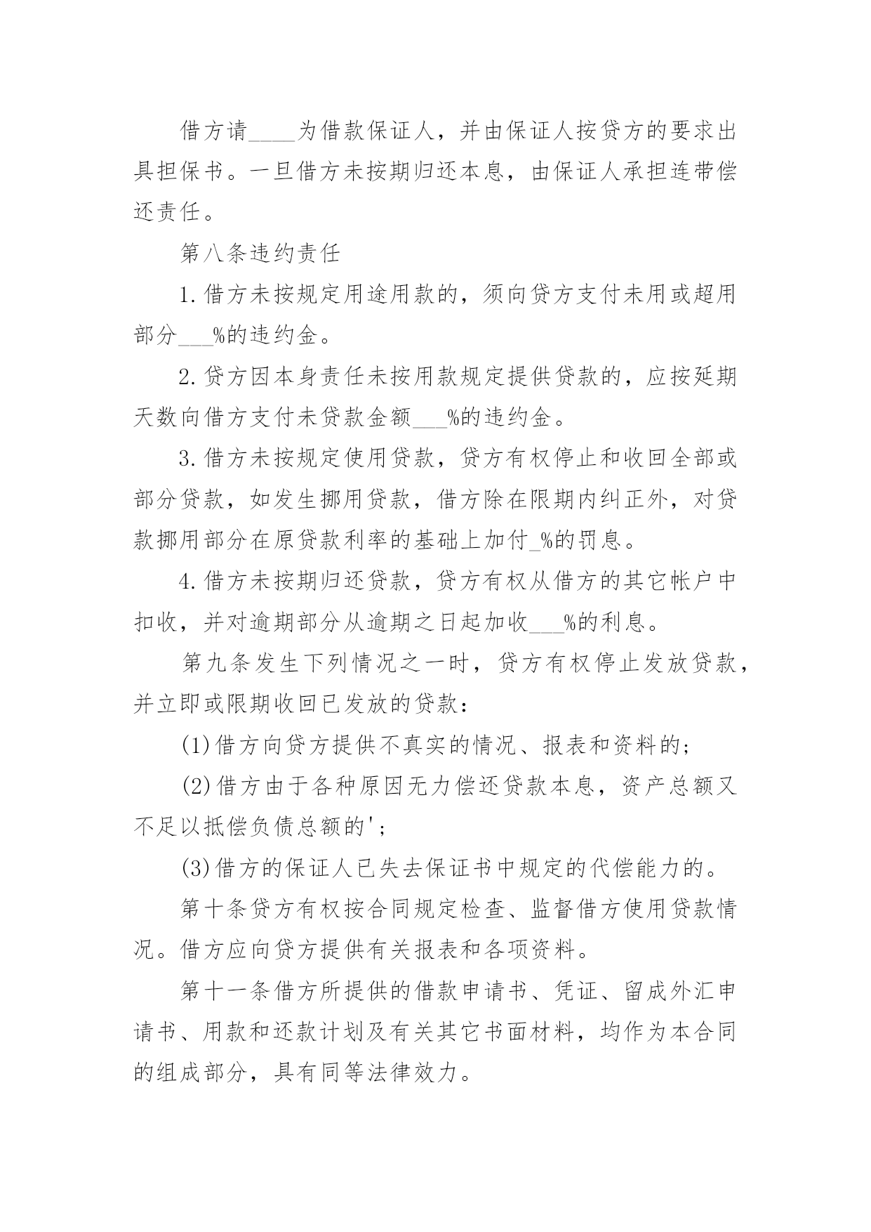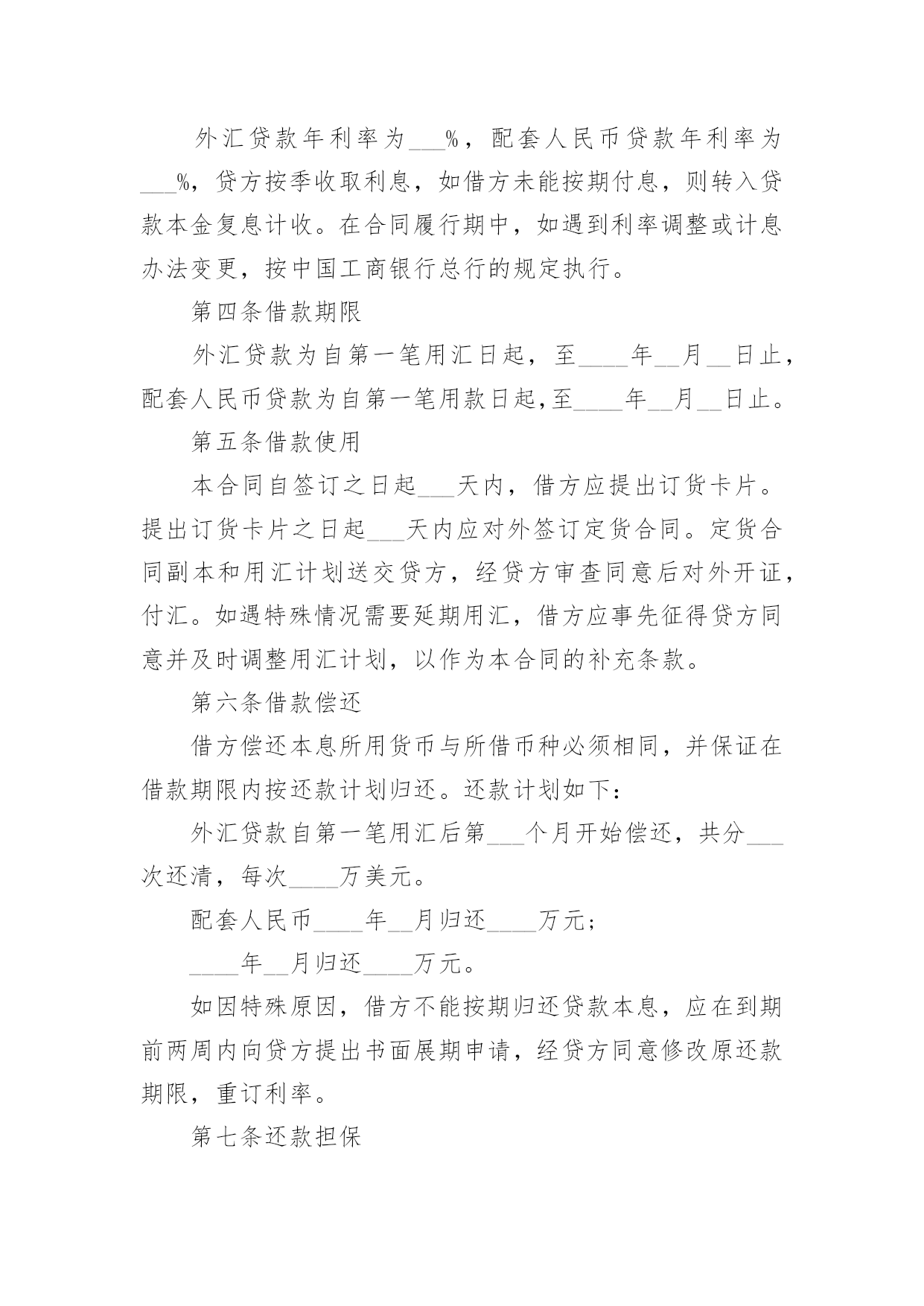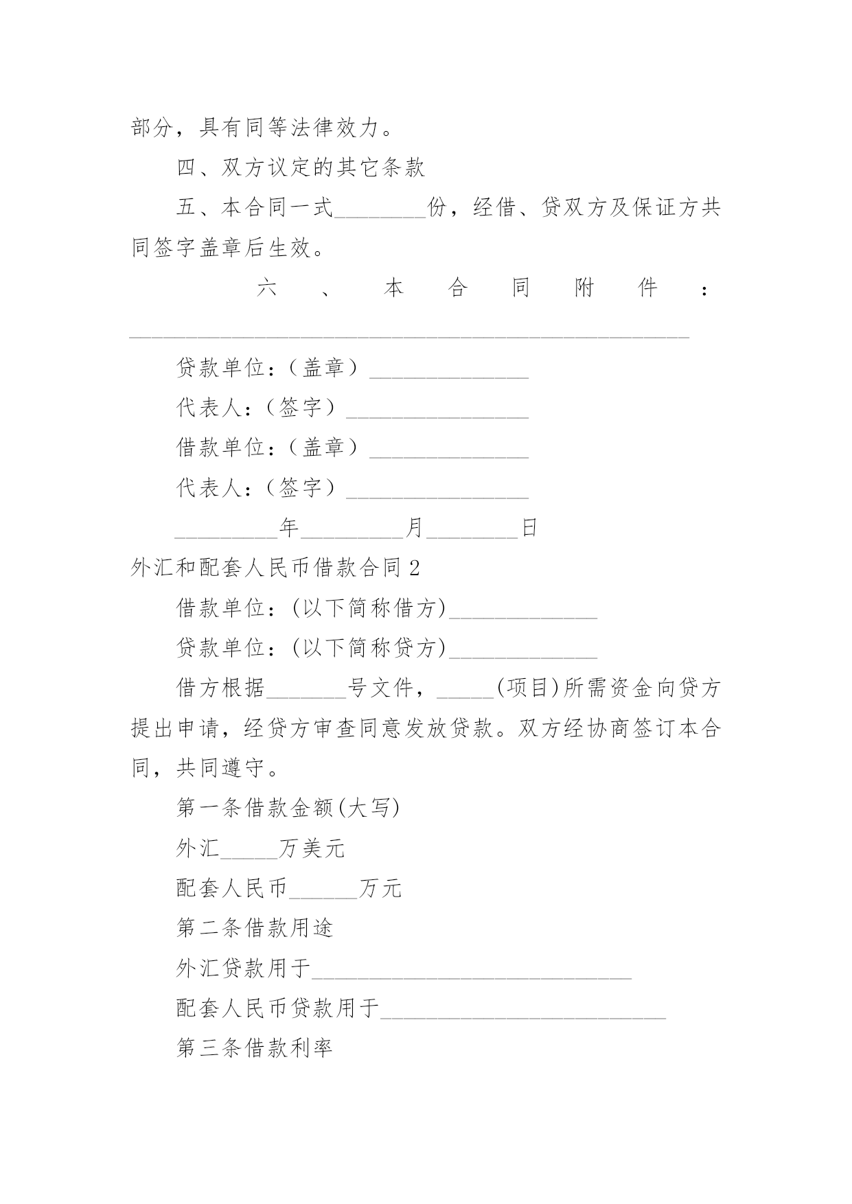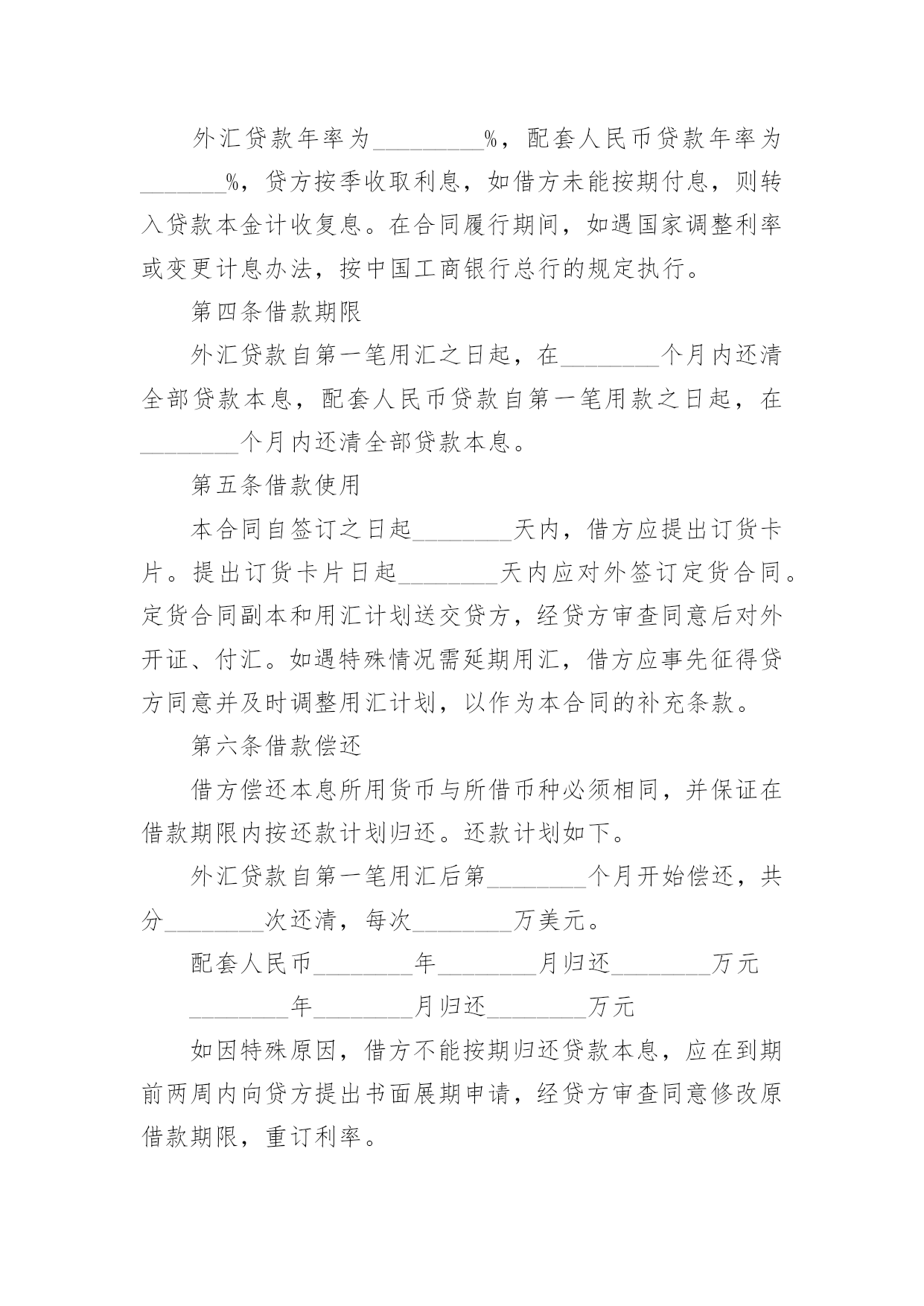 外汇和配套人民币借款合同外汇和配套人民币借款合同在人们越来越相信法律的社会中,合同在生活中的使用越来越广泛,合同协调着人与人,人与事之间的关系。那么相关的合同到底怎么写呢?以下是小编帮大家整理的外汇和配套人民币借款合同,希望能够帮助到大家。外汇和配套人民币借款合同1借款单位:________________________(以下简称借方)贷款银行:中国工商银行__________行(以下简称贷方)借方根据________号文件,(项目)________________所需资金向贷方提出申请,经贷方审查同意发放贷款。双方经协商签订本合同,共同遵守。第一条借款金额(大写)外汇____________万美元配套人民币____________万元第二条借款用途外汇贷款用于______________________________________配套人民币贷款用于________________________________第三条借款利率外汇贷款年率为_________%,配套人民币贷款年率为_______%,贷方按季收取利息,如借方未能按期付息,则转入贷款本金计收复息。在合同履行期间,如遇国家调整利率或变更计息办法,按中国工商银行总行的规定执行。第四条借款期限外汇贷款自第一笔用汇之日起,在________个月内还清全部贷款本息,配套人民币贷款自第一笔用款之日起,在________个月内还清全部贷款本息。第五条借款使用本合同自签订之日起________天内,借方应提出订货卡片。提出订货卡片日起________天内应对外签订定货合同。定货合同副本和用汇计划送交贷方,经贷方审查同意后对外开证、付汇。如遇特殊情况需延期用汇,借方应事先征得贷方同意并及时调整用汇计划,以作为本合同的补充条款。第六条借款偿还借方偿还本息所用货币与所借币种必须相同,并保证在借款期限内按还款计划归还。还款计划如下。外汇贷款自第一笔用汇后第________个月开始偿还,共分________次还清,每次________万美元。配套人民币________年________月归还________万元________年________月归还________万元如因特殊原因,借方不能按期归还贷款本息,应在到期前两周内向贷方提出书面展期申请,经贷方审查同意修改原借款期限,重订利率。第七条还款担保本合同项下借款本息由________作为借方的担保单位,并按贷方的要求出具担保书。一旦借方未按期归还贷款本息,由担保单位承担偿还全部贷款本息和责任。第八条违约责任一、借方未按规定的用款计划用款,造成未用或超用部分须向贷方支付_______%的承担费。贷方因本身责任未按用款计划提供贷款,应向借方支付_______%的违约金。二、借方未按合同规定使用贷款,贷方有权停止或收回全部或部分贷款,如发生挪用贷款,借方除在限期内纠正外,对贷款挪用部分在原贷款利率的基础上加付50%的罚息。三、借方未按期归还贷款,贷方有权从借方的其它帐户中扣收,并对逾期部分从逾期之日起加收_______%的`利息。第九条其它一、发生下列情况之一时,贷方有权停止发放贷款并立即或限期收回已发放的贷款。(一)贷方收到借方提供不真实的情况、报表和资料。(二)借方由于各种原因造成无力偿还贷款本息,资产总额又不足以抵偿其负债总额。(三)借方的保证人已失去保证书中规定的能力。二、贷方有权按合同规定检查、监督贷款的使用情况。借方应向贷方提供有关报表和资料。三、借方所提供的借款申请书、凭证、留成外汇申请书、用款和还款计划及有关其它书面材料,均作为本合同的组成部分,具有同等法律效力。四、双方议定的其它条款五、本合同一式________份,经借、贷双方及保证方共同签字盖章后生效。六、本合同附件:_________________________________________________贷款单位:(盖章)______________代表人:(签字)________________借款单位:(盖章)______________代表人:(签字)_________________________年_________月________日外汇和配套人民币借款合同2借款单位:(以下简称借方)_____________贷款单位:(以下简称贷方)_____________借方根据_______号文件,_____(项目)所需资金向贷方提出申请,经贷方审查同意发放贷款。双方经协商签订本合同,共同遵守。第一条借款金额(大写)外汇_____万美元配套人民币______万元第二条借款用途外汇贷款用于____________________________配套人民币贷款用于_________________________第三条借款利率外汇贷款年利率为___%,