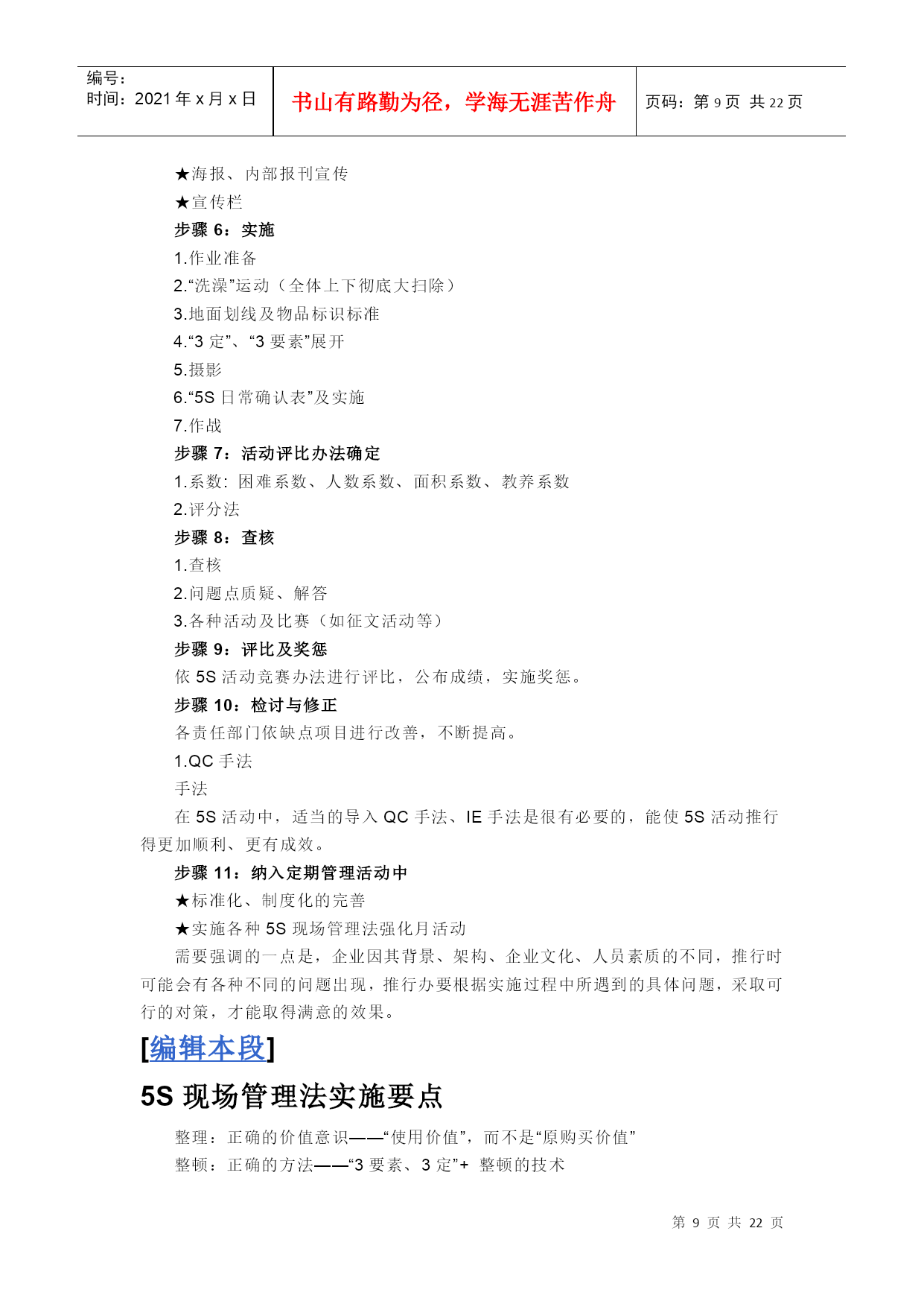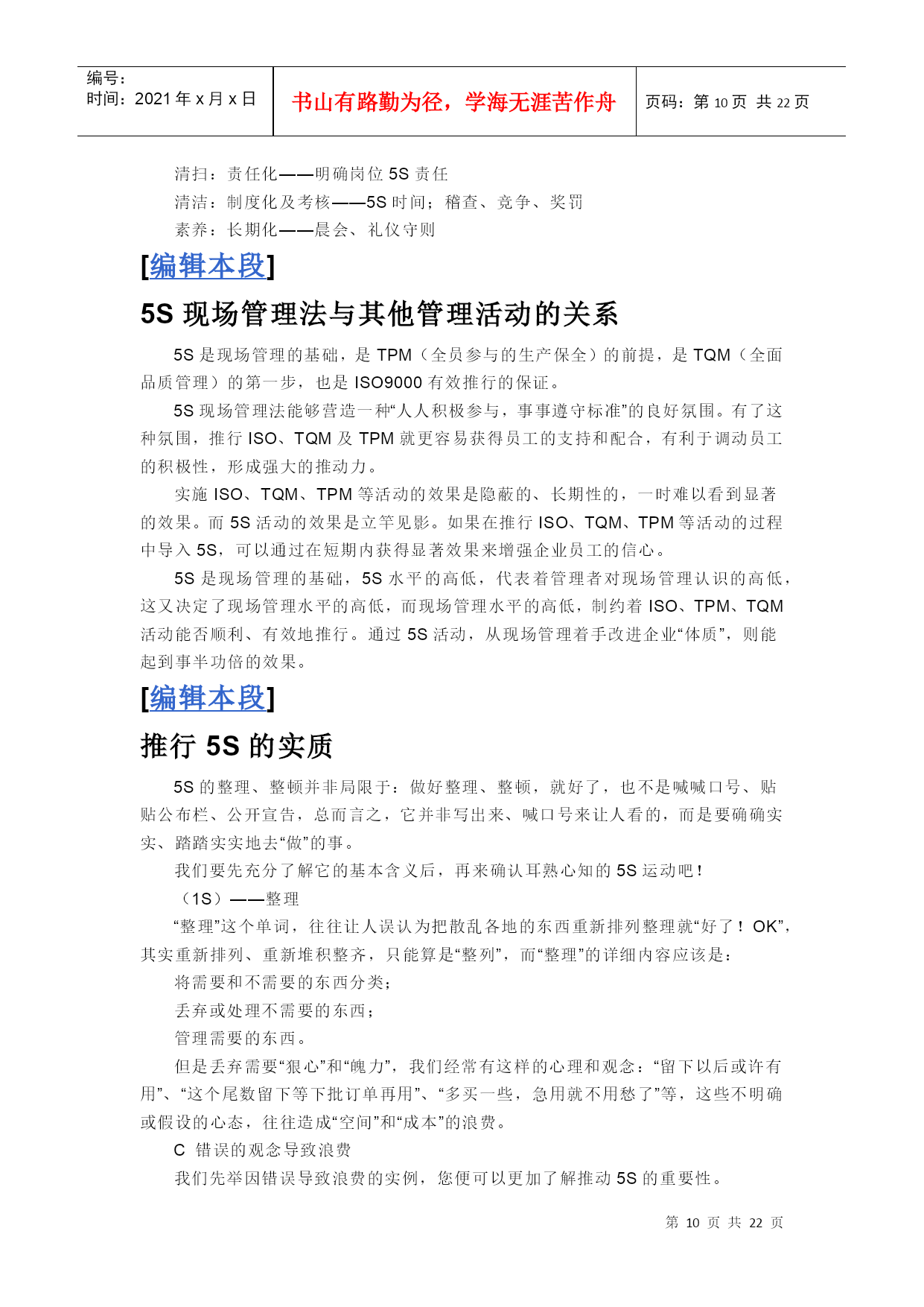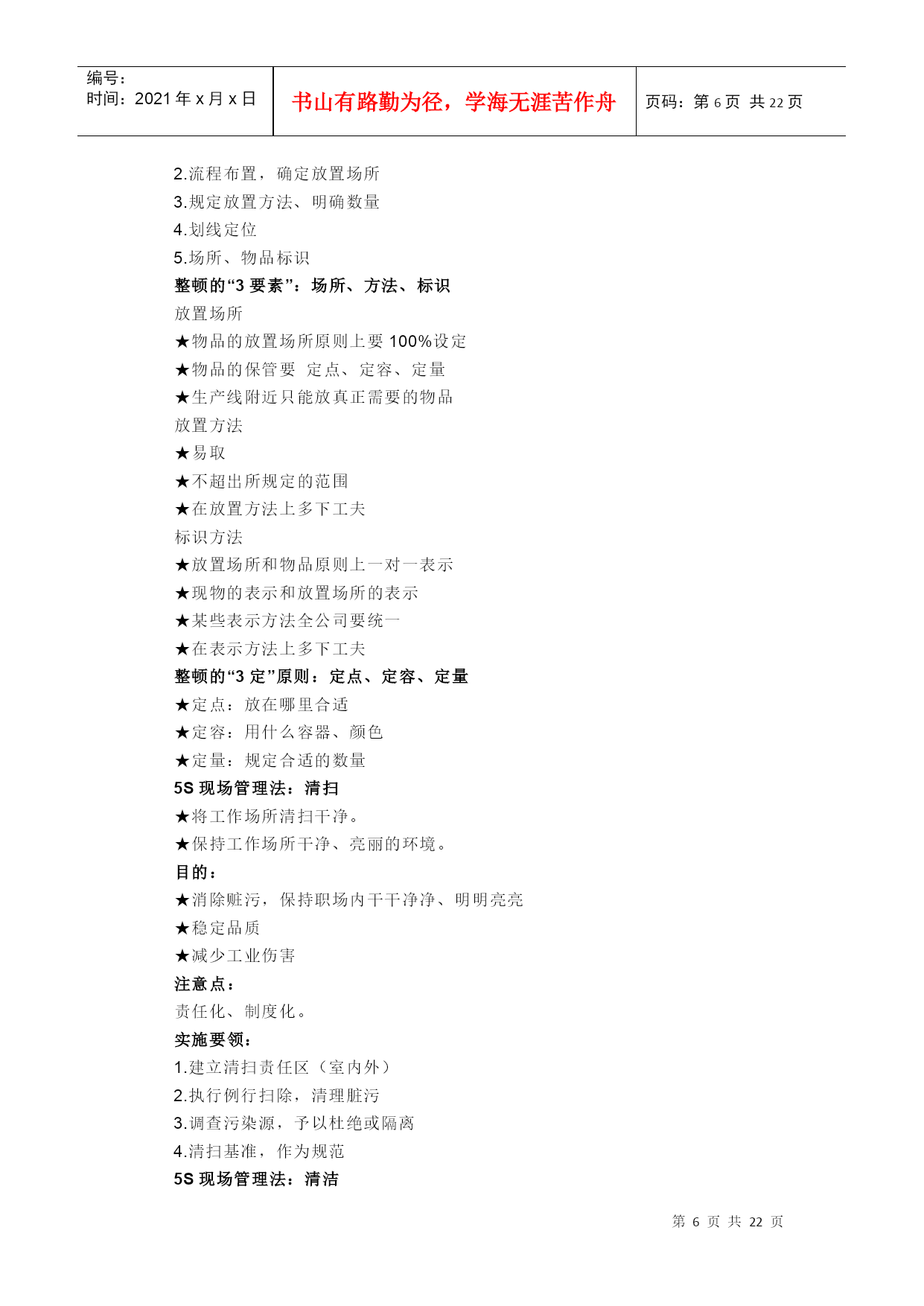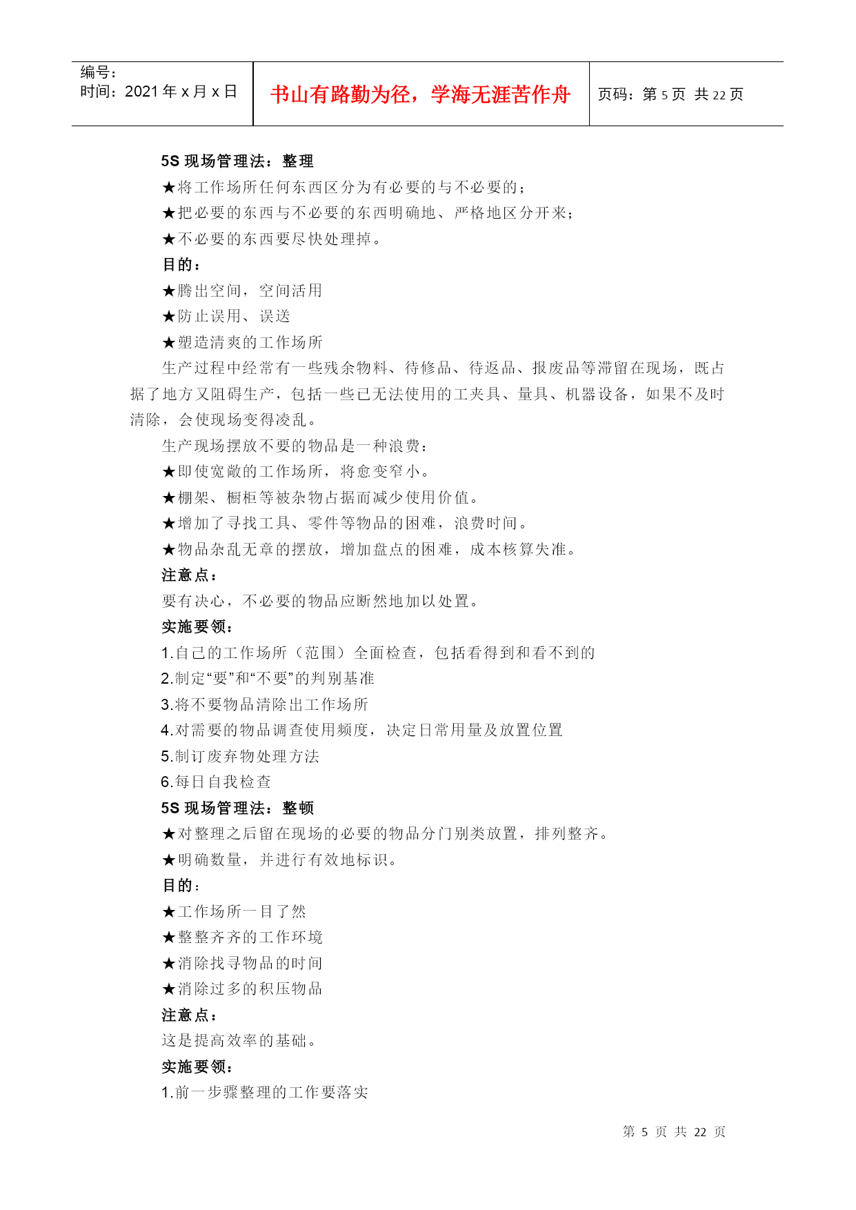 编号:时间:2021年x月x日书山有路勤为径,学海无涯苦作舟页码:第PAGE22页共NUMPAGES22页第PAGE\*MERGEFORMAT22页共NUMPAGES\*MERGEFORMAT22页[HYPERLINK"http://baike.baidu.com/view/53099.htm?fr=ala0_1_1"\l"#"编辑本段]什么叫5S管理“5S”是整理(Seiri)、整顿(Seiton)、清扫(Seiso)、清洁(Seiketsu)和素养(Shitsuke)这5个词的缩写。因为这5个词日语中罗马拼音的第一个字母都是“S”,所以简称为“5S”,开展以整理、整顿、清扫、清洁和修身为内容的活动,称为“5S”活动。一、“5S”活动的含义“5S”活动起源于日本,并在日本企业中广泛推行,它相当于我国企业开展的文明生产活动。“5S”活动的对象是现场的“环境”,它对生产现场环境全局进行综合考虑,并制订切实可行的计划与措施,从而达到规范化管理。“5S”活动的核心和精髓是修身,如果没有职工队伍修身的相应提高,“5S”活动就难以开展和坚持下去。二、“5S”活动的内容(一)整理把要与不要的人、事、物分开,再将不需要的人、事、物加以处理,这是开始改善生产现场的第一步。其要点是对生产现场的现实摆放和停滞的各种物品进行分类,区分什么是现场需要的,什么是现场不需要的;其次,对于现场不需要的物品,诸如用剩的材料、多余的半成品、切下的料头、切屑、垃圾、废品、多余的工具、报废的设备、工人的个人生活用品等,要坚决清理出生产现场,这项工作的重点在于坚决把现场不需要的东西清理掉。对于车间里各个工位或设备的前后、通道左右、厂房上下、工具箱内外,以及车间的各个死角,都要彻底搜寻和清理,达到现场无不用之物。坚决做好这一步,是树立好作风的开始。日本有的公司提出口号:效率和安全始于整理!整理的目的是:①改善和增加作业面积;②现场无杂物,行道通畅,提高工作效率;③减少磕碰的机会,保障安全,提高质量;④消除管理上的混放、混料等差错事故;⑤有利于减少库存量,节约资金;③改变作风,提高工作情绪。(二)整顿把需要的人、事、物加以定量、定位。通过前一步整理后,对生产现场需要留下的物品进行科学合理的布置和摆放,以便用最快的速度取得所需之物,在最有效的规章、制度和最简捷的流程下完成作业。整顿活动的要点是:①物品摆放要有固定的地点和区域,以便于寻找,消除因混放而造成的差错;②物品摆放地点要科学合理。例如,根据物品使用的频率,经常使用的东西应放得近些(如放在作业区内),偶而使用或不常使用的东西则应放得远些(如集中放在车间某处);③物品摆放目视化,使定量装载的物品做到过目知数,摆放不同物品的区域采用不同的色彩和标记加以区别。生产现场物品的合理摆放有利于提高工作效率和产品质量,保障生产安全。这项工作已发展成一项专门的现场管理方法——定置管理(其内容将在第三节中进一步介绍)。(三)清扫把工作场所打扫干净,设备异常时马上修理,使之恢复正常。生产现场在生产过程中会产生灰尘、油污、铁屑、垃圾等,从而使现场变脏。脏的现场会使设备精度降低,故障多发,影响产品质量,使安全事故防不胜防;脏的现场更会影响人们的工作情绪,使人不愿久留。因此,必须通过清扫活动来清除那些脏物,创建一个明快、舒畅的工作环境。清扫活动的要点是:①自己使用的物品,如设备、工具等,要自己清扫,而不要依赖他人,不增加专门的清扫工;②对设备的清扫,着眼于对设备的维护保养。清扫设备要同设备的点检结合起来,清扫即点检;清扫设备要同时做设备的润滑工作,清扫也是保养;③清扫也是为了改善。当清扫地面发现有飞屑和油水泄漏时,要查明原因,并采取措施加以改进。(四)清洁整理、整顿、清扫之后要认真维护,使现场保持完美和最佳状态。清洁,是对前三项活动的坚持与深入,从而消除发生安全事故的根源。创造一个良好的工作环境,使职工能愉快地工作。清洁活动的要点是:(1)车间环境不仅要整齐,而且要做到清洁卫生,保证工人身体健康,提高工人劳动热情;(2)不仅物品要清洁,而且工人本身也要做到清洁,如工作服要清洁,仪表要整洁,及时理发、刮须、修指甲、洗澡等;(3)工人不仅要做到形体上的清洁,而且要做到精神上的“清洁”,待人要讲礼貌、要尊重别人;(4)要使环境不受污染,进一步消除混浊的空气、粉尘、噪音和污染源,消灭职业病。(五)素养素养即努力提高人员的修身,养成严格遵守规章制度的习惯和作风,这是“5S”活动的核心。没有人员素质的提高,各项活动就不能顺利开展,开展了也坚持不了。所以,抓“5S”活动,要始终着眼于提高人的素质。三、开展“5S”活动的原则(一)自我管理的原则良好的工作环境,不能单靠添置设