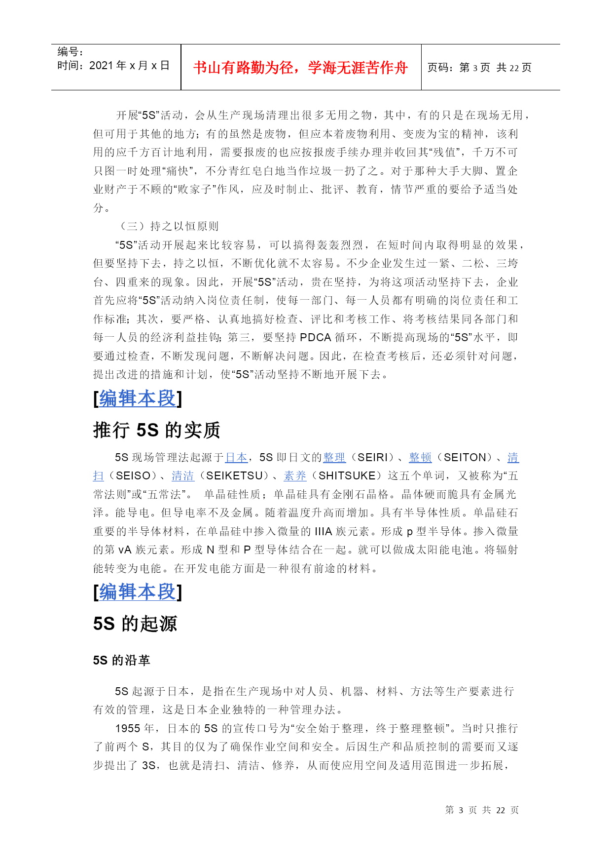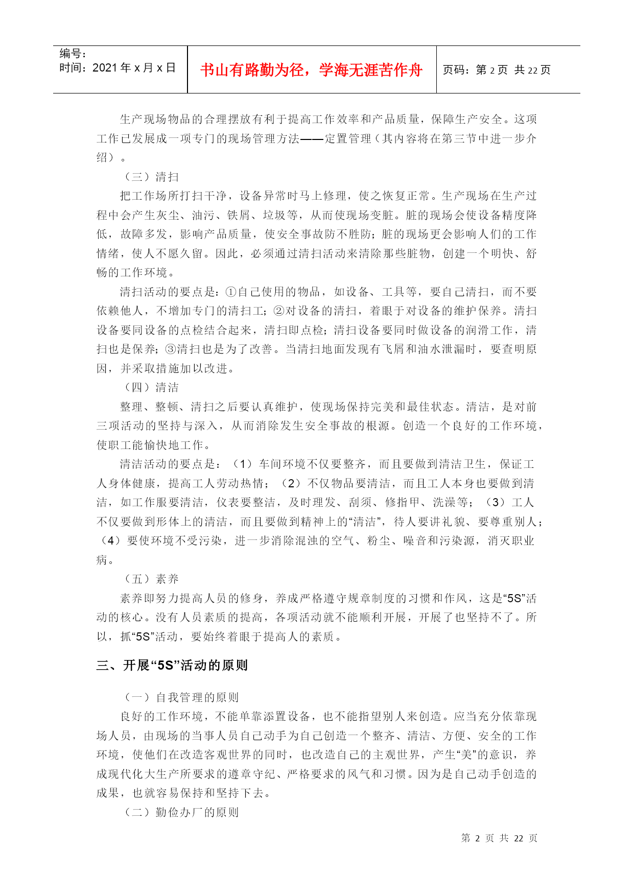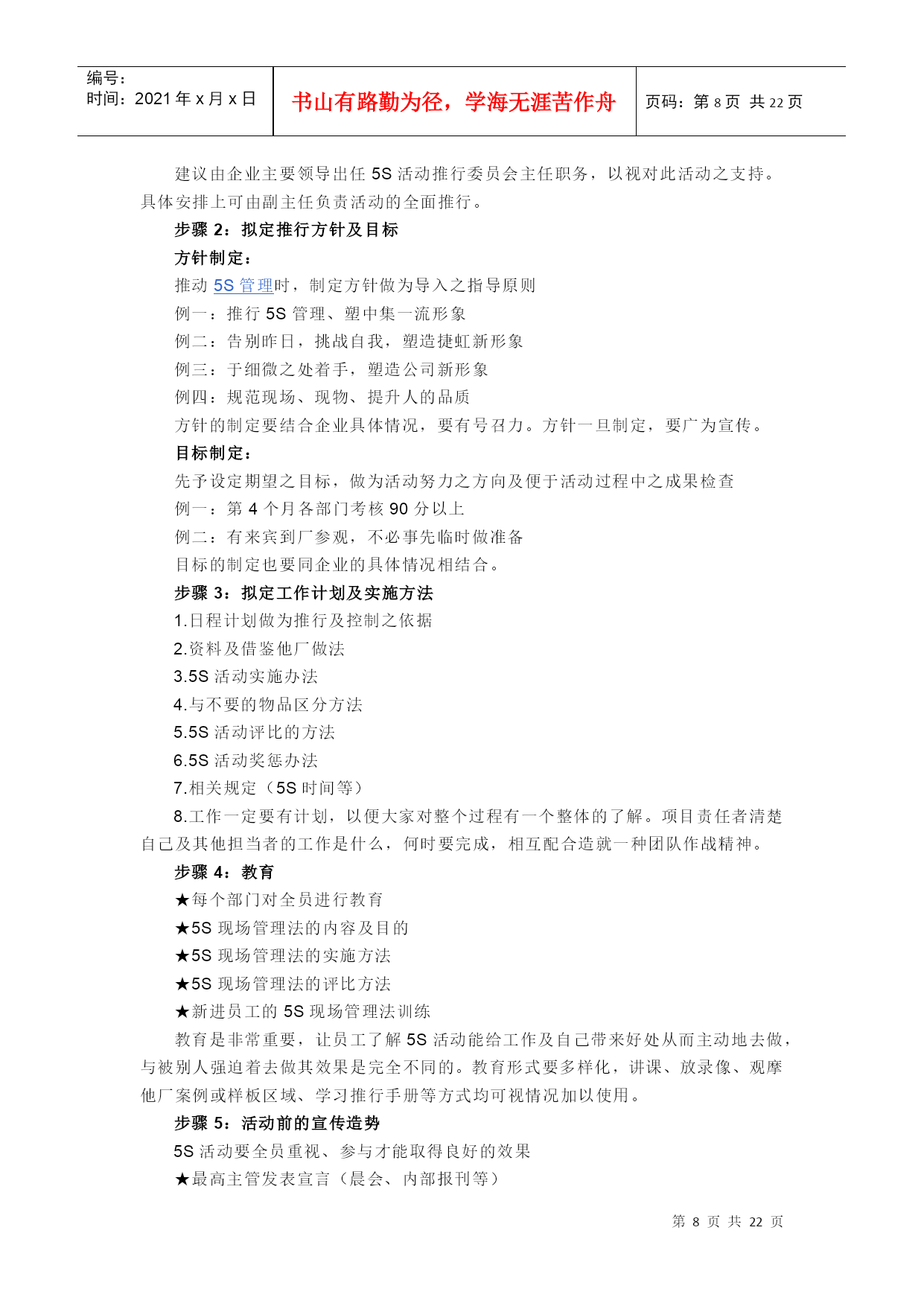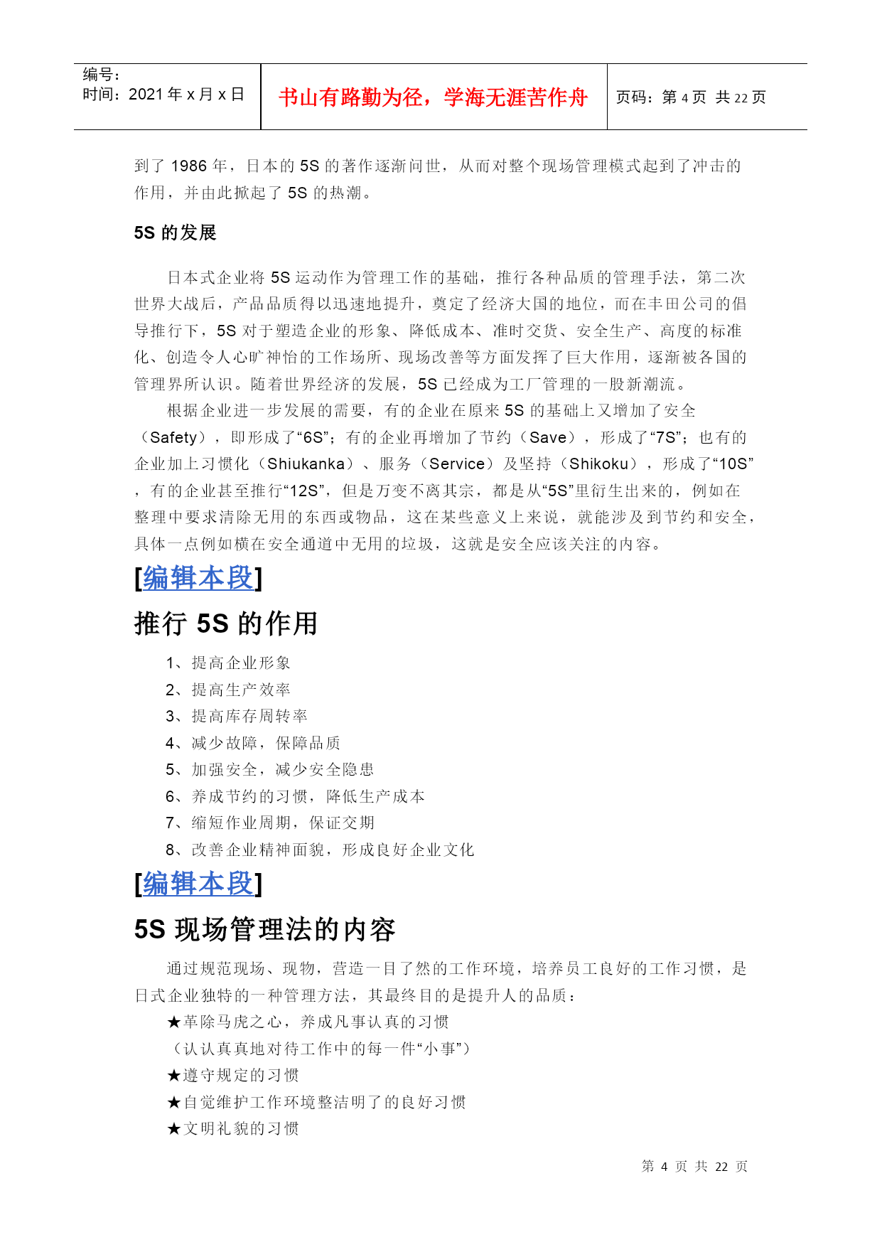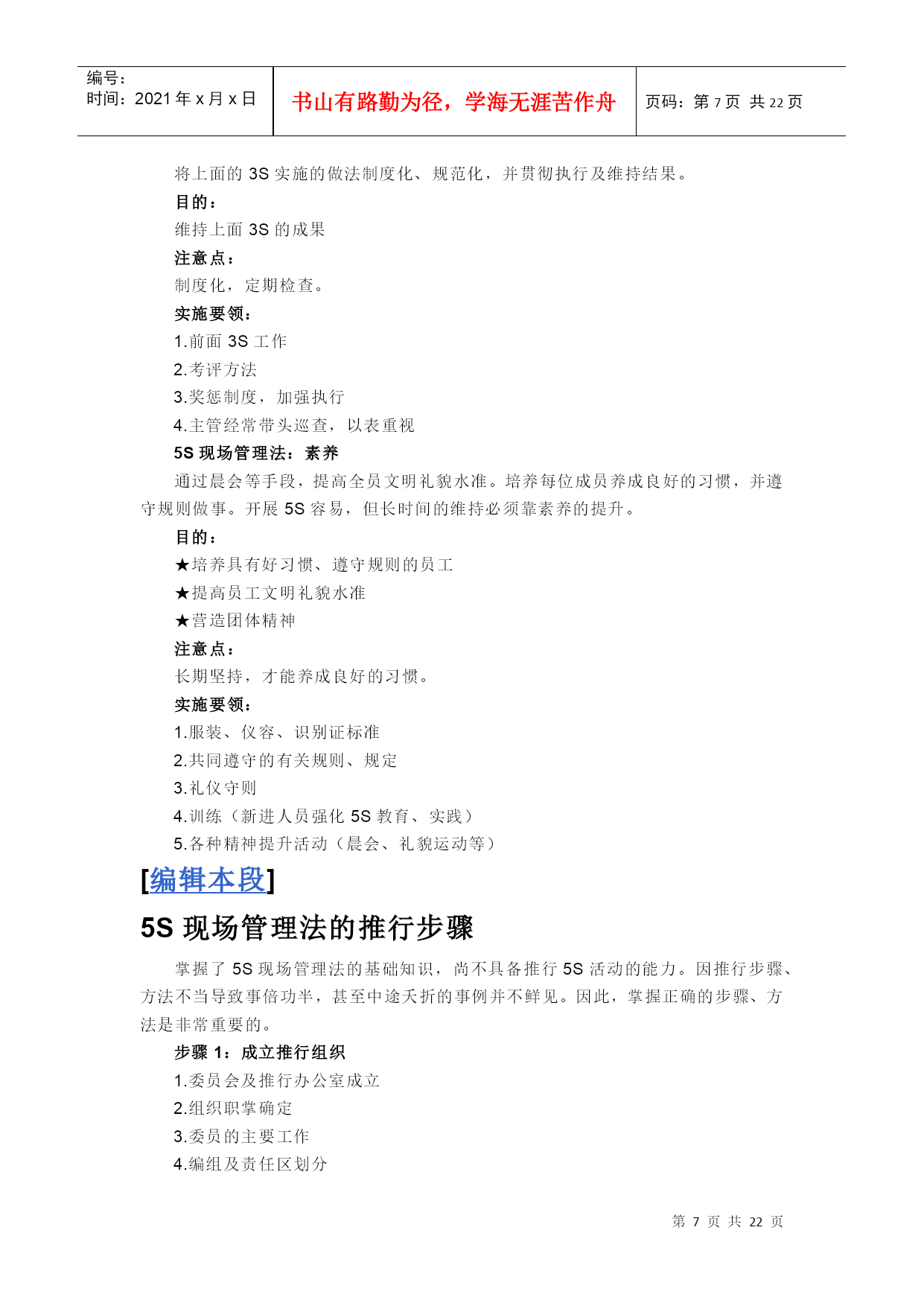 编号:时间:2021年x月x日书山有路勤为径,学海无涯苦作舟页码:第PAGE22页共NUMPAGES22页第PAGE\*MERGEFORMAT22页共NUMPAGES\*MERGEFORMAT22页[HYPERLINK"http://baike.baidu.com/view/53099.htm?fr=ala0_1_1"\l"#"编辑本段]什么叫5S管理“5S”是整理(Seiri)、整顿(Seiton)、清扫(Seiso)、清洁(Seiketsu)和素养(Shitsuke)这5个词的缩写。因为这5个词日语中罗马拼音的第一个字母都是“S”,所以简称为“5S”,开展以整理、整顿、清扫、清洁和修身为内容的活动,称为“5S”活动。一、“5S”活动的含义“5S”活动起源于日本,并在日本企业中广泛推行,它相当于我国企业开展的文明生产活动。“5S”活动的对象是现场的“环境”,它对生产现场环境全局进行综合考虑,并制订切实可行的计划与措施,从而达到规范化管理。“5S”活动的核心和精髓是修身,如果没有职工队伍修身的相应提高,“5S”活动就难以开展和坚持下去。二、“5S”活动的内容(一)整理把要与不要的人、事、物分开,再将不需要的人、事、物加以处理,这是开始改善生产现场的第一步。其要点是对生产现场的现实摆放和停滞的各种物品进行分类,区分什么是现场需要的,什么是现场不需要的;其次,对于现场不需要的物品,诸如用剩的材料、多余的半成品、切下的料头、切屑、垃圾、废品、多余的工具、报废的设备、工人的个人生活用品等,要坚决清理出生产现场,这项工作的重点在于坚决把现场不需要的东西清理掉。对于车间里各个工位或设备的前后、通道左右、厂房上下、工具箱内外,以及车间的各个死角,都要彻底搜寻和清理,达到现场无不用之物。坚决做好这一步,是树立好作风的开始。日本有的公司提出口号:效率和安全始于整理!整理的目的是:①改善和增加作业面积;②现场无杂物,行道通畅,提高工作效率;③减少磕碰的机会,保障安全,提高质量;④消除管理上的混放、混料等差错事故;⑤有利于减少库存量,节约资金;③改变作风,提高工作情绪。(二)整顿把需要的人、事、物加以定量、定位。通过前一步整理后,对生产现场需要留下的物品进行科学合理的布置和摆放,以便用最快的速度取得所需之物,在最有效的规章、制度和最简捷的流程下完成作业。整顿活动的要点是:①物品摆放要有固定的地点和区域,以便于寻找,消除因混放而造成的差错;②物品摆放地点要科学合理。例如,根据物品使用的频率,经常使用的东西应放得近些(如放在作业区内),偶而使用或不常使用的东西则应放得远些(如集中放在车间某处);③物品摆放目视化,使定量装载的物品做到过目知数,摆放不同物品的区域采用不同的色彩和标记加以区别。生产现场物品的合理摆放有利于提高工作效率和产品质量,保障生产安全。这项工作已发展成一项专门的现场管理方法——定置管理(其内容将在第三节中进一步介绍)。(三)清扫把工作场所打扫干净,设备异常时马上修理,使之恢复正常。生产现场在生产过程中会产生灰尘、油污、铁屑、垃圾等,从而使现场变脏。脏的现场会使设备精度降低,故障多发,影响产品质量,使安全事故防不胜防;脏的现场更会影响人们的工作情绪,使人不愿久留。因此,必须通过清扫活动来清除那些脏物,创建一个明快、舒畅的工作环境。清扫活动的要点是:①自己使用的物品,如设备、工具等,要自己清扫,而不要依赖他人,不增加专门的清扫工;②对设备的清扫,着眼于对设备的维护保养。清扫设备要同设备的点检结合起来,清扫即点检;清扫设备要同时做设备的润滑工作,清扫也是保养;③清扫也是为了改善。当清扫地面发现有飞屑和油水泄漏时,要查明原因,并采取措施加以改进。(四)清洁整理、整顿、清扫之后要认真维护,使现场保持完美和最佳状态。清洁,是对前三项活动的坚持与深入,从而消除发生安全事故的根源。创造一个良好的工作环境,使职工能愉快地工作。清洁活动的要点是:(1)车间环境不仅要整齐,而且要做到清洁卫生,保证工人身体健康,提高工人劳动热情;(2)不仅物品要清洁,而且工人本身也要做到清洁,如工作服要清洁,仪表要整洁,及时理发、刮须、修指甲、洗澡等;(3)工人不仅要做到形体上的清洁,而且要做到精神上的“清洁”,待人要讲礼貌、要尊重别人;(4)要使环境不受污染,进一步消除混浊的空气、粉尘、噪音和污染源,消灭职业病。(五)素养素养即努力提高人员的修身,养成严格遵守规章制度的习惯和作风,这是“5S”活动的核心。没有人员素质的提高,各项活动就不能顺利开展,开展了也坚持不了。所以,抓“5S”活动,要始终着眼于提高人的素质。三、开展“5S”活动的原则(一)自我管理的原则良好的工作环境,不能单靠添置设