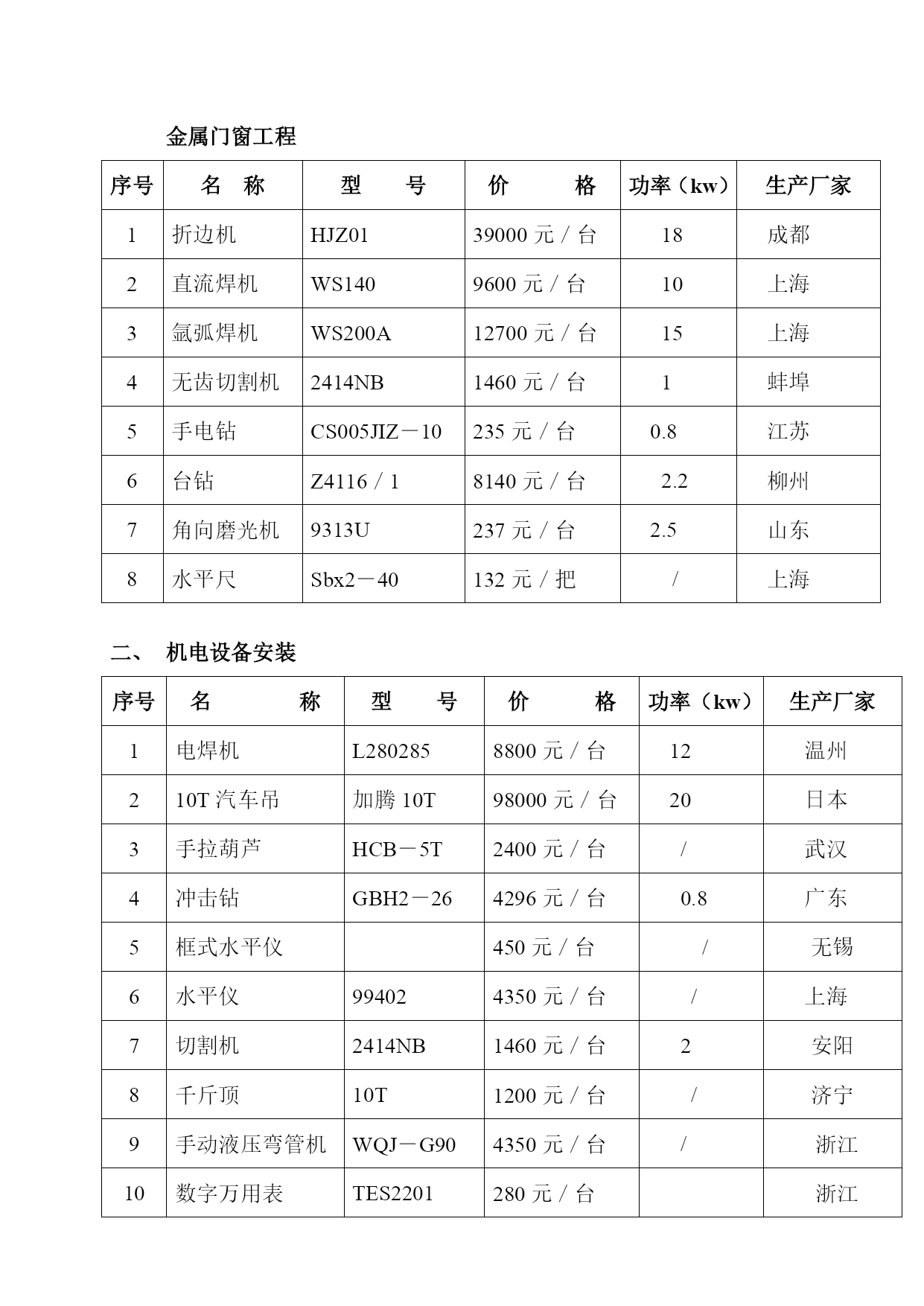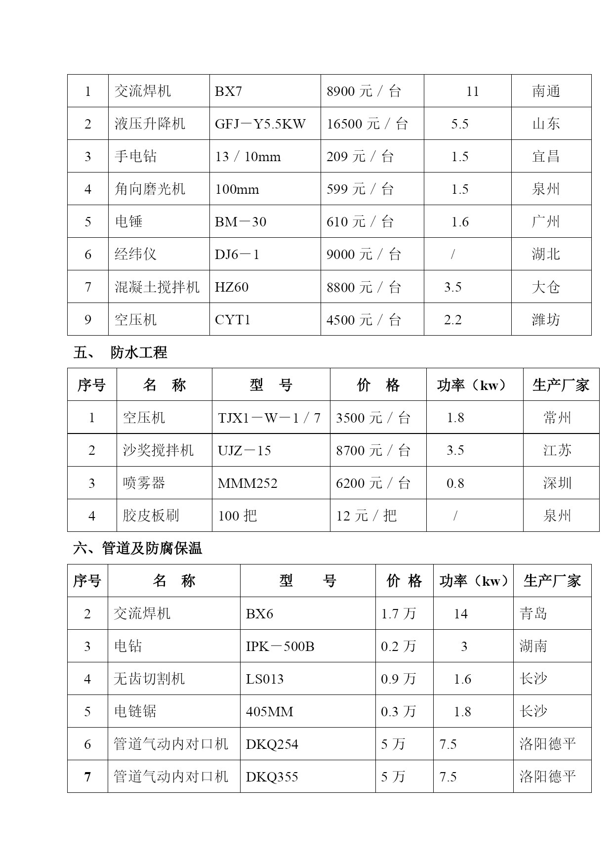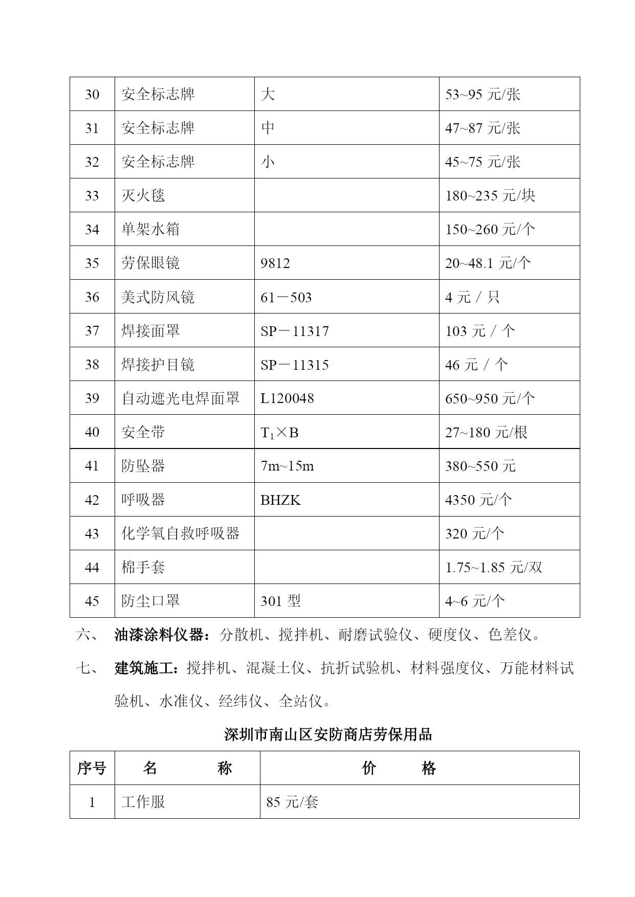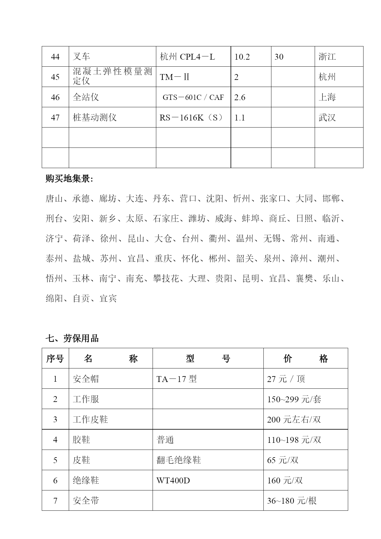 工具设备及劳保用品价格(完整版)(文档可以直接使用,也可根据实际需要修改使用,可编辑欢迎下载)金属门窗工程序号名称型号价格功率(kw)生产厂家1折边机HJZ0139000元/台18成都2直流焊机WS1409600元/台10上海3氩弧焊机WS200A12700元/台15上海4无齿切割机2414NB1460元/台1蚌埠5手电钻CS005JIZ-10235元/台0.8江苏6台钻Z4116/18140元/台2.2柳州7角向磨光机9313U237元/台2.5山东8水平尺Sbx2-40132元/把/上海机电设备安装序号名称型号价格功率(kw)生产厂家1电焊机L2802858800元/台12温州210T汽车吊加腾10T98000元/台20日本3手拉葫芦HCB-5T2400元/台/武汉4冲击钻GBH2-264296元/台0.8广东5框式水平仪450元/台/无锡6水平仪994024350元/台/上海7切割机2414NB1460元/台2安阳8千斤顶10T1200元/台/济宁9手动液压弯管机WQJ-G904350元/台/浙江10数字万用表TES2201280元/台浙江11数位式万用表PROVA8032570元/台台湾12数位式万用表CENTER102380元/台浙江13数位式万用表PROVA2700元/台台湾装修工程序号名称型号价格功率(kw)生产厂家1交流焊机BX65700元/台200南通2元齿切割机LSC0134600元/台4山东3电钻1PK-500B-2375元/台1江苏4角向磨光机100/125mm379元/台0.8浙江5电链锯405mm980元/台1.2徐州6水平尺Sbx2-40450元/把/苏州7混凝土搅拌机JS15005400元/台4.5刑台8振动棒ZN-50130元/根2.2昆山9空压机CYT17000元/台10浙江10木工园盘锯MJ105A13500元/台4河南11木工平刨机MB504MB5039000元/台3佛山12木工平刨机MB5239000元/台3佛山幕墙装饰工程序号名称型号价格功率(kw)生产厂家1交流焊机BX78900元/台11南通2液压升降机GFJ-Y5.5KW16500元/台5.5山东3手电钻13/10mm209元/台1.5宜昌4角向磨光机100mm599元/台1.5泉州5电锤BM-30610元/台1.6广州6经纬仪DJ6-19000元/台/湖北7混凝土搅拌机HZ608800元/台3.5大仓9空压机CYT14500元/台2.2潍坊防水工程序号名称型号价格功率(kw)生产厂家1空压机TJX1-W-1/73500元/台1.8常州2沙奖搅拌机UJZ-158700元/台3.5江苏3喷雾器MMM2526200元/台0.8深圳4胶皮板刷100把12元/把/泉州六、管道及防腐保温序号名称型号价格功率(kw)生产厂家2交流焊机BX61.7万14青岛3电钻IPK-500B0.2万3湖南4无齿切割机LS0130.9万1.6长沙5电链锯405MM0.3万1.8长沙6管道气动内对口机DKQ2545万7.5洛阳德平7管道气动内对口机DKQ3555万7.5洛阳德平8液压弯管机WC278.8万15马鞍山9单头液压弯管机DW168/DW168NC9.5万18张家港10液压弯管机W27Y-219C12.5万22洛阳11试压泵4D-SY63/160.3万1.1河北饶阳12试压泵DSB-160.385万1.1泰州13试压泵4DZY-63-160.54万1.1温州14水平钻孔机PZ-759万92KW唐山15水平定向钻孔机中联KSD25B9.9万120KW长沙16超声波探伤仪HY-282.8南通17超声波探伤仪HY-262.26南通18磁粉探伤仪CJE-1/20.3南通19超声波测厚仪UTM-101H0.39南通20手动压弧机TF-0.3徐州21脚踏式剪板机JF-0.65徐州22咬口机YF-0.26徐州23回收式喷丸机RBM-10A7.83.3北京24手动巻板机TF-1300型0.44徐州25涂层测厚仪Tt2401.4北京26非金属超声检测仪ZBL-U5201.8北京七、地基与基础序号名称型号价格功率(kw)生产厂家2徐工汽车起重机(二手)QY16、16T16万37徐州3徐工汽车起重机QY16C、1650万184徐州4徐工汽车起重机QY8D、8T25.5万75徐州5徐工汽车起重机QY12D、12T36.8万78徐州6长江汽车起重机QY8F、8T23.6万105泸州7山推推土机山推1609.5万120上海8推土机东方红T100G9万81洛阳9推土机东方红T120N9.9万88.2洛阳10推土机现代130-59万60韩国11推土机玉柴YCT306-38.2万22广西玉林12推土机移山TY22022.6万36天津13推土机黄山TY160