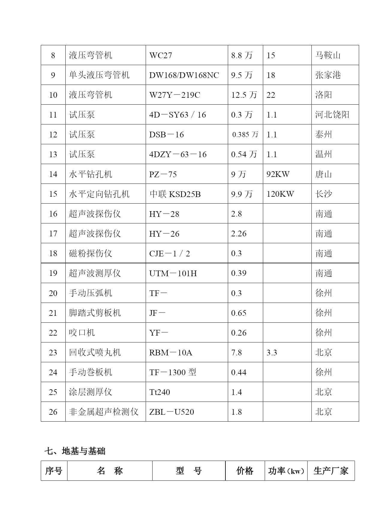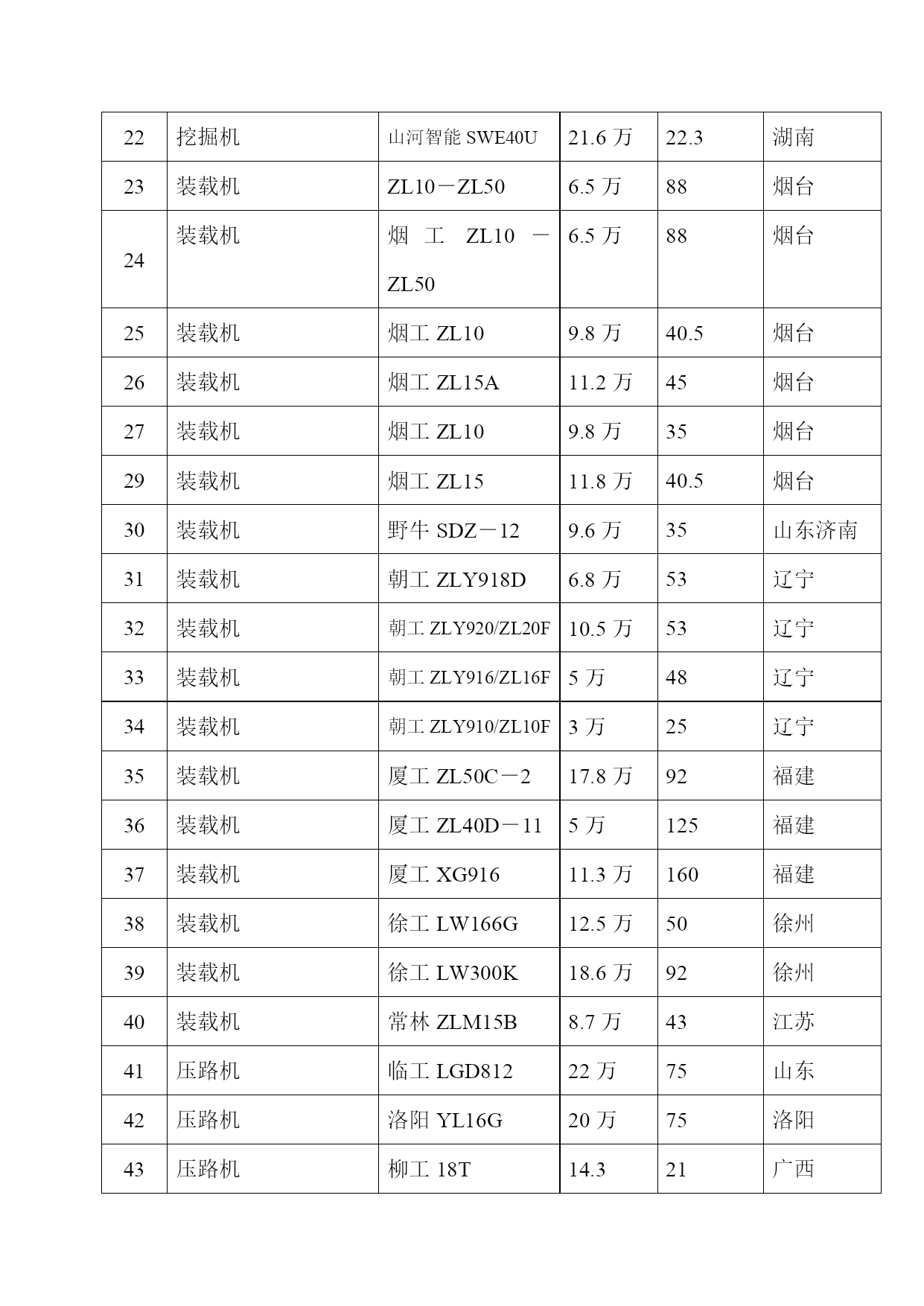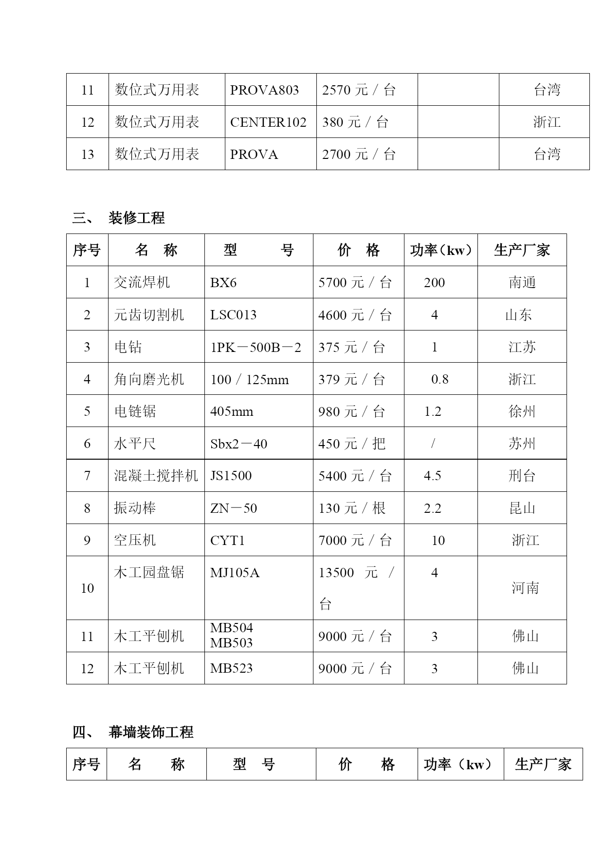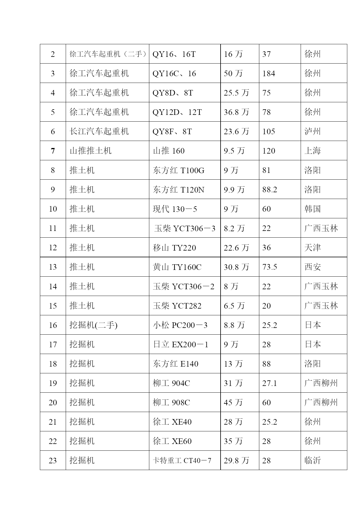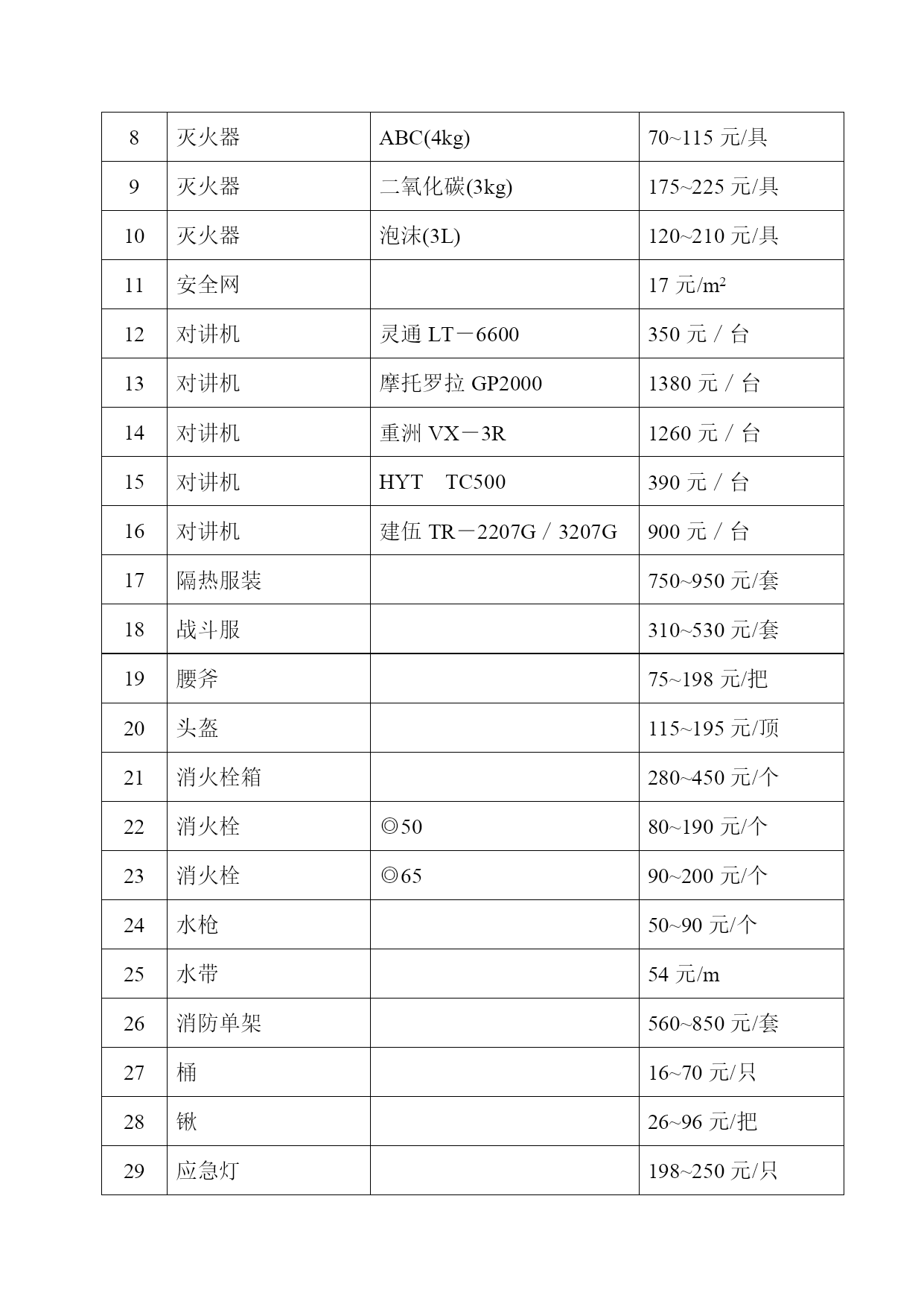 工具设备及劳保用品价格(完整版)(文档可以直接使用,也可根据实际需要修改使用,可编辑欢迎下载)金属门窗工程序号名称型号价格功率(kw)生产厂家1折边机HJZ0139000元/台18成都2直流焊机WS1409600元/台10上海3氩弧焊机WS200A12700元/台15上海4无齿切割机2414NB1460元/台1蚌埠5手电钻CS005JIZ-10235元/台0.8江苏6台钻Z4116/18140元/台2.2柳州7角向磨光机9313U237元/台2.5山东8水平尺Sbx2-40132元/把/上海机电设备安装序号名称型号价格功率(kw)生产厂家1电焊机L2802858800元/台12温州210T汽车吊加腾10T98000元/台20日本3手拉葫芦HCB-5T2400元/台/武汉4冲击钻GBH2-264296元/台0.8广东5框式水平仪450元/台/无锡6水平仪994024350元/台/上海7切割机2414NB1460元/台2安阳8千斤顶10T1200元/台/济宁9手动液压弯管机WQJ-G904350元/台/浙江10数字万用表TES2201280元/台浙江11数位式万用表PROVA8032570元/台台湾12数位式万用表CENTER102380元/台浙江13数位式万用表PROVA2700元/台台湾装修工程序号名称型号价格功率(kw)生产厂家1交流焊机BX65700元/台200南通2元齿切割机LSC0134600元/台4山东3电钻1PK-500B-2375元/台1江苏4角向磨光机100/125mm379元/台0.8浙江5电链锯405mm980元/台1.2徐州6水平尺Sbx2-40450元/把/苏州7混凝土搅拌机JS15005400元/台4.5刑台8振动棒ZN-50130元/根2.2昆山9空压机CYT17000元/台10浙江10木工园盘锯MJ105A13500元/台4河南11木工平刨机MB504MB5039000元/台3佛山12木工平刨机MB5239000元/台3佛山幕墙装饰工程序号名称型号价格功率(kw)生产厂家1交流焊机BX78900元/台11南通2液压升降机GFJ-Y5.5KW16500元/台5.5山东3手电钻13/10mm209元/台1.5宜昌4角向磨光机100mm599元/台1.5泉州5电锤BM-30610元/台1.6广州6经纬仪DJ6-19000元/台/湖北7混凝土搅拌机HZ608800元/台3.5大仓9空压机CYT14500元/台2.2潍坊防水工程序号名称型号价格功率(kw)生产厂家1空压机TJX1-W-1/73500元/台1.8常州2沙奖搅拌机UJZ-158700元/台3.5江苏3喷雾器MMM2526200元/台0.8深圳4胶皮板刷100把12元/把/泉州六、管道及防腐保温序号名称型号价格功率(kw)生产厂家2交流焊机BX61.7万14青岛3电钻IPK-500B0.2万3湖南4无齿切割机LS0130.9万1.6长沙5电链锯405MM0.3万1.8长沙6管道气动内对口机DKQ2545万7.5洛阳德平7管道气动内对口机DKQ3555万7.5洛阳德平8液压弯管机WC278.8万15马鞍山9单头液压弯管机DW168/DW168NC9.5万18张家港10液压弯管机W27Y-219C12.5万22洛阳11试压泵4D-SY63/160.3万1.1河北饶阳12试压泵DSB-160.385万1.1泰州13试压泵4DZY-63-160.54万1.1温州14水平钻孔机PZ-759万92KW唐山15水平定向钻孔机中联KSD25B9.9万120KW长沙16超声波探伤仪HY-282.8南通17超声波探伤仪HY-262.26南通18磁粉探伤仪CJE-1/20.3南通19超声波测厚仪UTM-101H0.39南通20手动压弧机TF-0.3徐州21脚踏式剪板机JF-0.65徐州22咬口机YF-0.26徐州23回收式喷丸机RBM-10A7.83.3北京24手动巻板机TF-1300型0.44徐州25涂层测厚仪Tt2401.4北京26非金属超声检测仪ZBL-U5201.8北京七、地基与基础序号名称型号价格功率(kw)生产厂家2徐工汽车起重机(二手)QY16、16T16万37徐州3徐工汽车起重机QY16C、1650万184徐州4徐工汽车起重机QY8D、8T25.5万75徐州5徐工汽车起重机QY12D、12T36.8万78徐州6长江汽车起重机QY8F、8T23.6万105泸州7山推推土机山推1609.5万120上海8推土机东方红T100G9万81洛阳9推土机东方红T120N9.9万88.2洛阳10推土机现代130-59万60韩国11推土机玉柴YCT306-38.2万22广西玉林12推土机移山TY22022.6万36天津13推土机黄山TY160