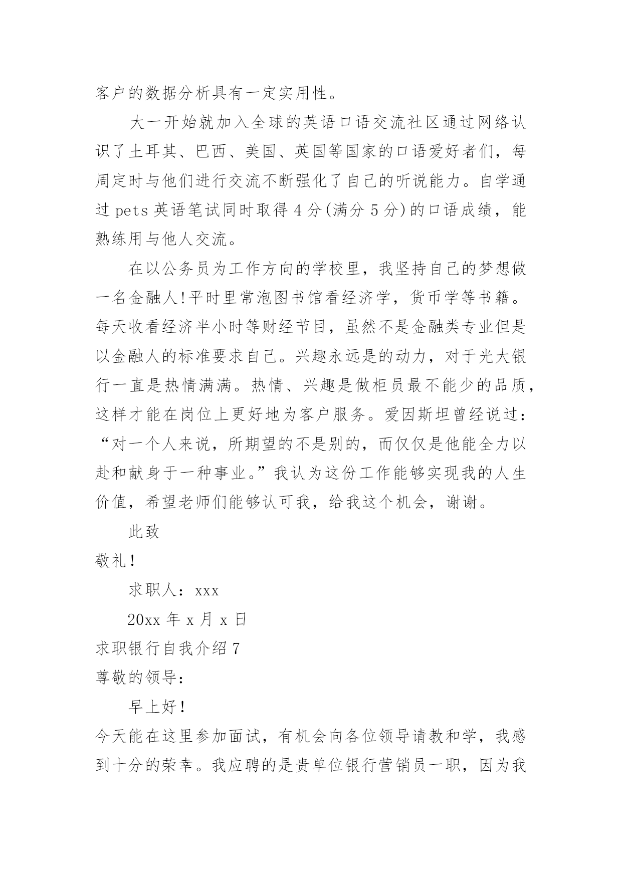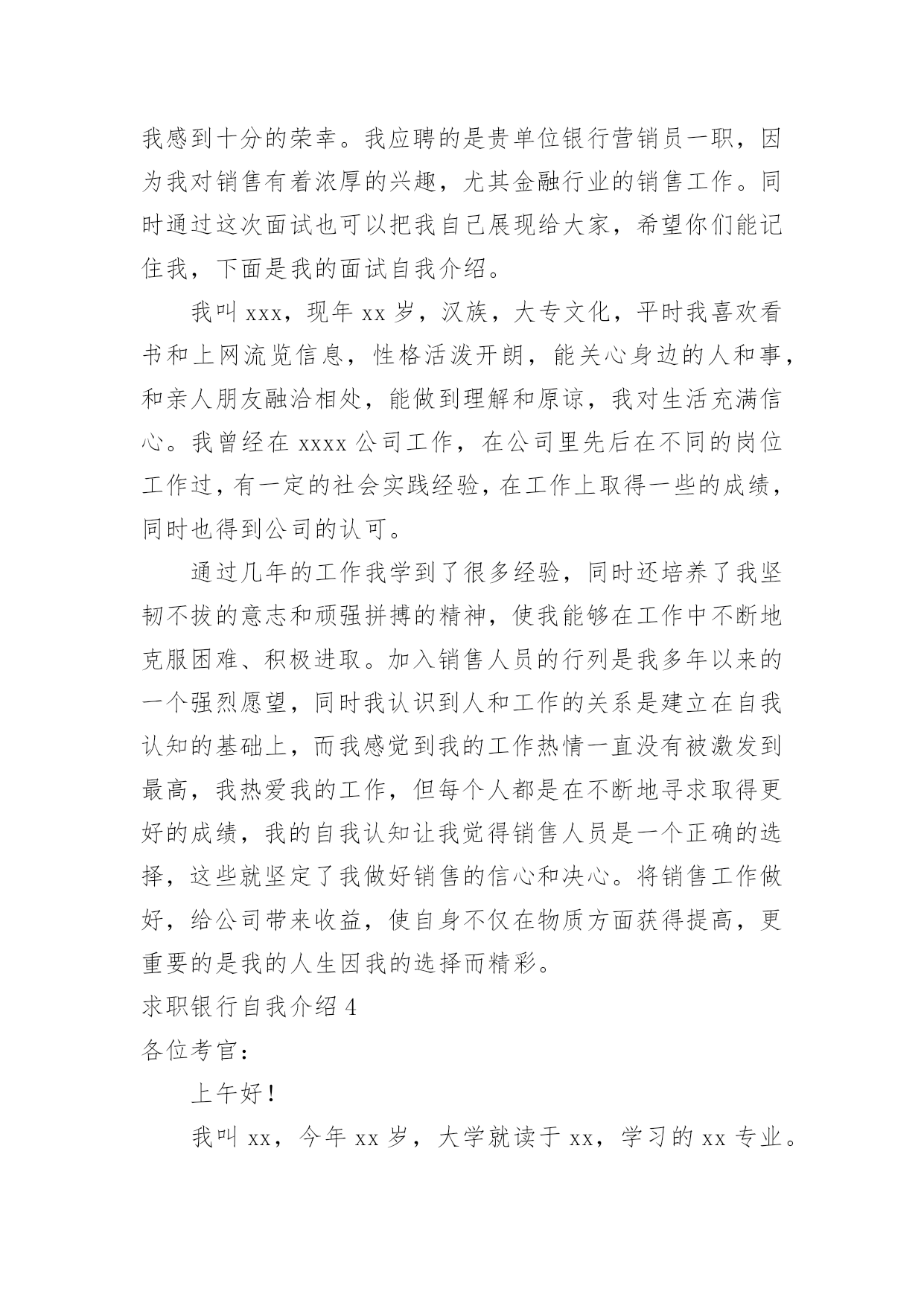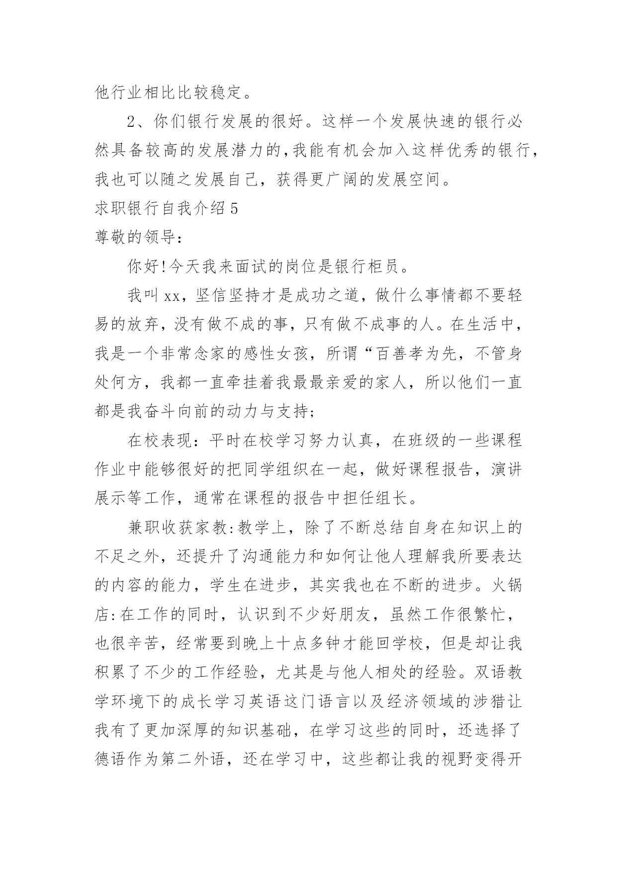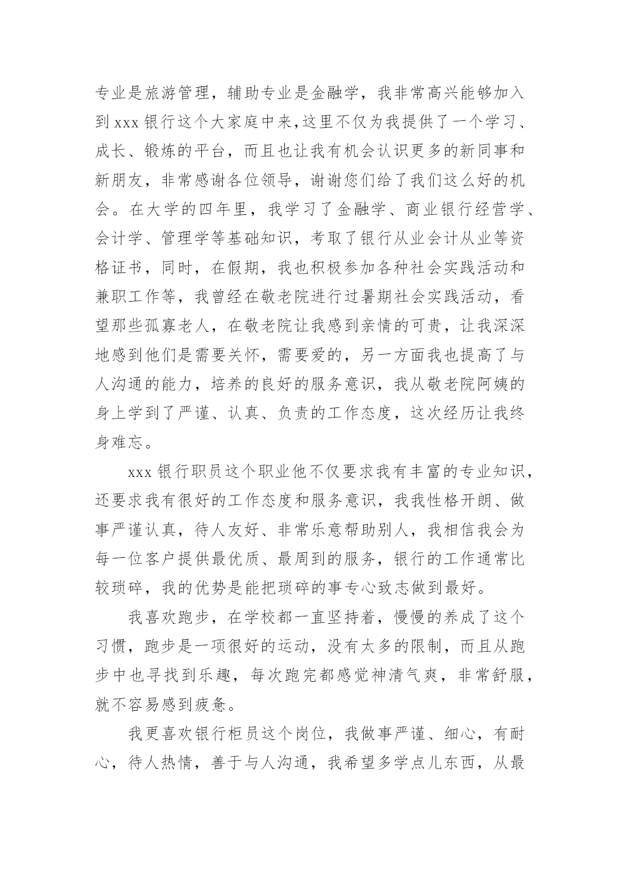 求职银行自我介绍求职银行自我介绍来到一个完全陌生的环境,通常需要我们进行自我介绍,通过自我介绍可以得到他人的认可。千万不能认为自我介绍随便应付就可以,以下是小编精心整理的求职银行自我介绍,供大家参考借鉴,希望可以帮助到有需要的朋友。求职银行自我介绍1尊敬的各位领导、评委:大家好!我叫x,来自x,x年毕业于x大学,我的专业是x,硕士研究生学历。毕业后在建设银行上海分行x支行担任客户经理。我手中有很多客户资源,工作业绩非常突出我有丰富的银行产品营销、客户管理、信贷管理、风险管理经验;精通银行信贷管理、风险控制、银行会计等相关业务,具有很强的业务拓展能力。另外,我对人热情,能够很好的和别人交流,表达能力强,我希望您能给我一次机会,我相信我可以做得很好。我今天应聘建设银行x分行的x职位,相信我的加盟,建设银行在x的业务将发展得更好!谢谢大家!求职银行自我介绍2尊敬的各位领导:大家好,我叫xxx,毕业于xxx大学,在大学期间主修专业是旅游管理,辅助专业是金融学,我非常高兴能够加入到xxx银行这个大家庭中来,这里不仅为我提供了一个学习、成长、锻炼的平台,而且也让我有机会认识更多的新同事和新朋友,非常感谢各位领导,谢谢您们给了我们这么好的机会。在大学的四年里,我学习了金融学、商业银行经营学、会计学、管理学等基础知识,考取了银行从业会计从业等资格证书,同时,在假期,我也积极参加各种社会实践活动和兼职工作等,我曾经在敬老院进行过暑期社会实践活动,看望那些孤寡老人,在敬老院让我感到亲情的可贵,让我深深地感到他们是需要关怀,需要爱的,另一方面我也提高了与人沟通的能力,培养的良好的服务意识,我从敬老院阿姨的身上学到了严谨、认真、负责的工作态度,这次经历让我终身难忘。xxx银行职员这个职业他不仅要求我有丰富的专业知识,还要求我有很好的工作态度和服务意识,我我性格开朗、做事严谨认真,待人友好、非常乐意帮助别人,我相信我会为每一位客户提供最优质、最周到的服务,银行的工作通常比较琐碎,我的优势是能把琐碎的事专心致志做到最好。我喜欢跑步,在学校都一直坚持着,慢慢的养成了这个习惯,跑步是一项很好的运动,没有太多的限制,而且从跑步中也寻找到乐趣,每次跑完都感觉神清气爽,非常舒服,就不容易感到疲惫。我更喜欢银行柜员这个岗位,我做事严谨、细心,有耐心,待人热情,善于与人沟通,我希望多学点儿东西,从最低层做起,精通银行的业务,不断地提高和完善自己,使自己能够应付繁忙的柜面工作我的职业生涯规划是我希望能借我所学和专长,并且也吸收xxx银行在这方面的经验,按照xxx银行的管理思路发展,希望自己能够在银行领域有所作为,在10年的时间内,成为一名银行的专业人士。xxx银行坚持“专注于心,高效于行”的理念,有其独特的价值观,我十分看好xxx银行所在的行业。我发现,xxx银行的工作环境,氛围和待遇,。都是我心中一直所追求的完美单位,。来到这里我很高兴。我想融入这个大家庭接受考验锻炼自己,为xxx银行献出自己的一份力。对于一个刚走出校园的学生来说,我想在今后的工作上还有很多的东西需要我去学习,我会以最快的时间去适应xxx行的新环境,努力学习各项业务知识,提高自己的业务水平,尽快进入工作到角色(状态),在以后的工作中,我会虚心请教,多学多问,认认真真,踏踏实实的做好本职工作,高效的完成单位领导安排的每一项工作,使自己成为一名合格的xxx银行人,为xx银行的明天贡献自己的一份力量。谢谢大家!求职银行自我介绍3尊敬的领导:早上好!今天能在这里参加面试,有机会向各位领导请教和学习,我感到十分的荣幸。我应聘的是贵单位银行营销员一职,因为我对销售有着浓厚的兴趣,尤其金融行业的销售工作。同时通过这次面试也可以把我自己展现给大家,希望你们能记住我,下面是我的面试自我介绍。我叫xxx,现年xx岁,汉族,大专文化,平时我喜欢看书和上网流览信息,性格活泼开朗,能关心身边的人和事,和亲人朋友融洽相处,能做到理解和原谅,我对生活充满信心。我曾经在xxxx公司工作,在公司里先后在不同的岗位工作过,有一定的社会实践经验,在工作上取得一些的成绩,同时也得到公司的认可。通过几年的工作我学到了很多经验,同时还培养了我坚韧不拔的意志和顽强拼搏的精神,使我能够在工作中不断地克服困难、积极进取。加入销售人员的行列是我多年以来的一个强烈愿望,同时我认识到人和工作的关系是建立在自我认知的基础上,而我感觉到我的工作热情一直没有被激发到最高,我热爱我的工作,但每个人都是在不断地寻求取得更好的成绩,我的自我认知让我觉得销售人员是一个正确的选择,这些就坚定了我做好销售的信心和决心。将销售工作做好,给公司带来收益,使自身不仅在物质方面获得提高,更重要的是我的人生因我的选择而精彩。求职银行自我介绍4各位考官:上午好!我叫xx,今年xx岁
