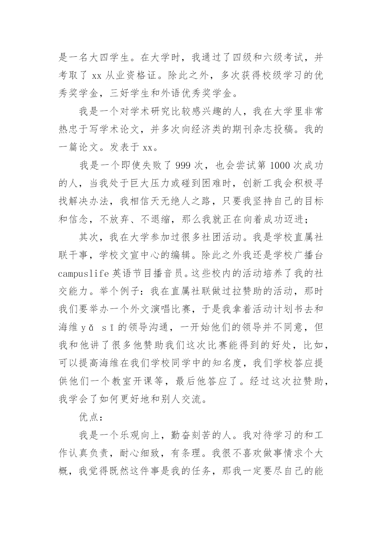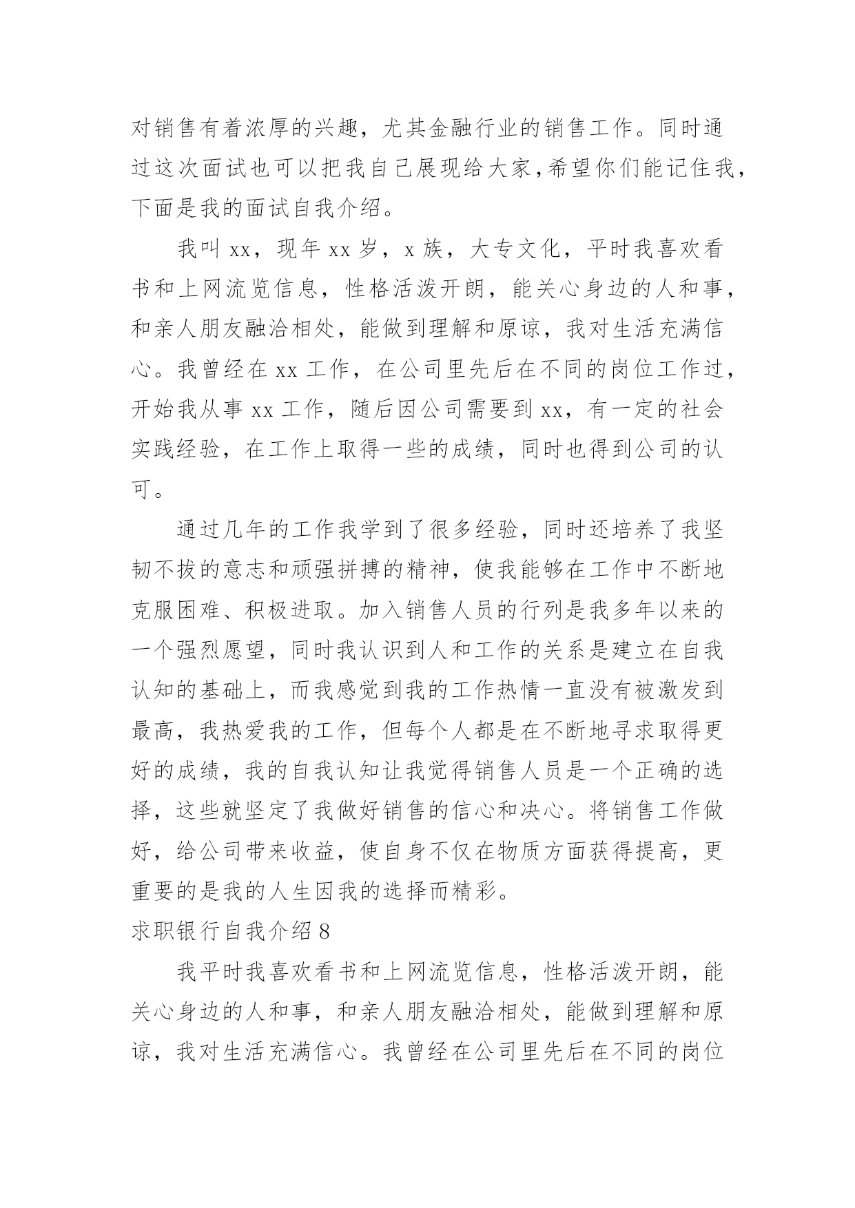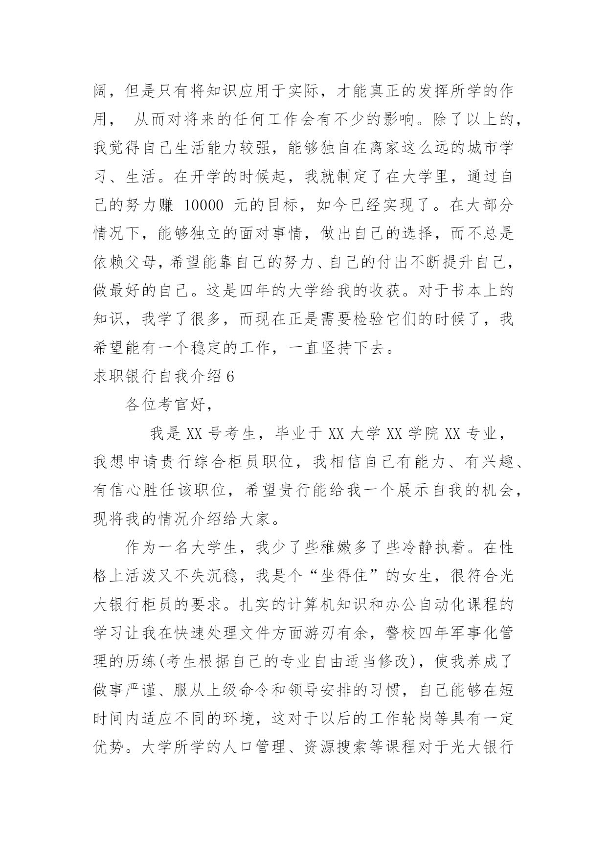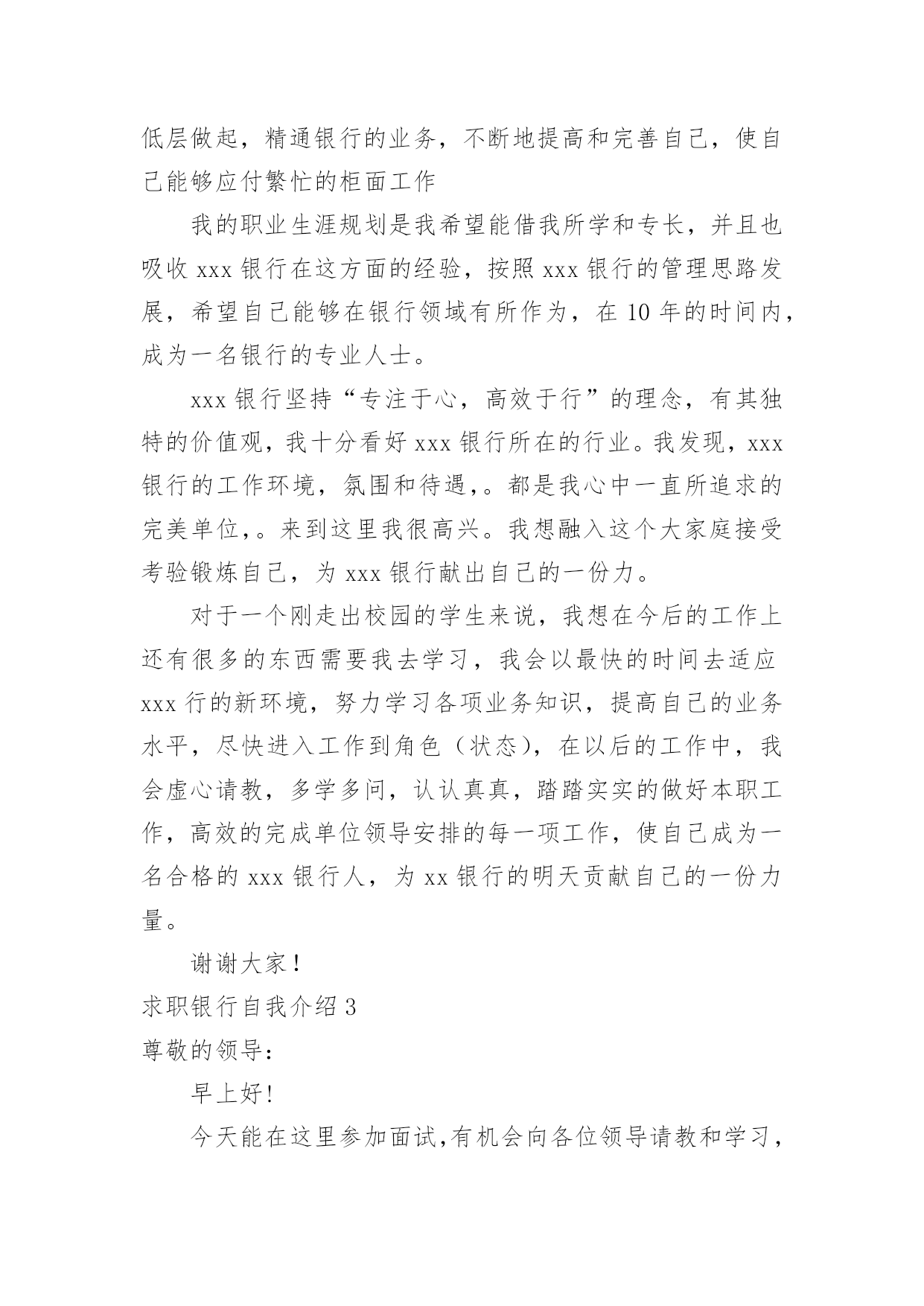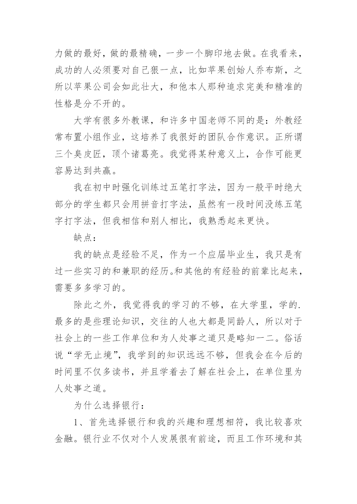 求职银行自我介绍求职银行自我介绍来到一个完全陌生的环境,通常需要我们进行自我介绍,通过自我介绍可以得到他人的认可。千万不能认为自我介绍随便应付就可以,以下是小编精心整理的求职银行自我介绍,供大家参考借鉴,希望可以帮助到有需要的朋友。求职银行自我介绍1尊敬的各位领导、评委:大家好!我叫x,来自x,x年毕业于x大学,我的专业是x,硕士研究生学历。毕业后在建设银行上海分行x支行担任客户经理。我手中有很多客户资源,工作业绩非常突出我有丰富的银行产品营销、客户管理、信贷管理、风险管理经验;精通银行信贷管理、风险控制、银行会计等相关业务,具有很强的业务拓展能力。另外,我对人热情,能够很好的和别人交流,表达能力强,我希望您能给我一次机会,我相信我可以做得很好。我今天应聘建设银行x分行的x职位,相信我的加盟,建设银行在x的业务将发展得更好!谢谢大家!求职银行自我介绍2尊敬的各位领导:大家好,我叫xxx,毕业于xxx大学,在大学期间主修专业是旅游管理,辅助专业是金融学,我非常高兴能够加入到xxx银行这个大家庭中来,这里不仅为我提供了一个学习、成长、锻炼的平台,而且也让我有机会认识更多的新同事和新朋友,非常感谢各位领导,谢谢您们给了我们这么好的机会。在大学的四年里,我学习了金融学、商业银行经营学、会计学、管理学等基础知识,考取了银行从业会计从业等资格证书,同时,在假期,我也积极参加各种社会实践活动和兼职工作等,我曾经在敬老院进行过暑期社会实践活动,看望那些孤寡老人,在敬老院让我感到亲情的可贵,让我深深地感到他们是需要关怀,需要爱的,另一方面我也提高了与人沟通的能力,培养的良好的服务意识,我从敬老院阿姨的身上学到了严谨、认真、负责的工作态度,这次经历让我终身难忘。xxx银行职员这个职业他不仅要求我有丰富的专业知识,还要求我有很好的工作态度和服务意识,我我性格开朗、做事严谨认真,待人友好、非常乐意帮助别人,我相信我会为每一位客户提供最优质、最周到的服务,银行的工作通常比较琐碎,我的优势是能把琐碎的事专心致志做到最好。我喜欢跑步,在学校都一直坚持着,慢慢的养成了这个习惯,跑步是一项很好的运动,没有太多的限制,而且从跑步中也寻找到乐趣,每次跑完都感觉神清气爽,非常舒服,就不容易感到疲惫。我更喜欢银行柜员这个岗位,我做事严谨、细心,有耐心,待人热情,善于与人沟通,我希望多学点儿东西,从最低层做起,精通银行的业务,不断地提高和完善自己,使自己能够应付繁忙的柜面工作我的职业生涯规划是我希望能借我所学和专长,并且也吸收xxx银行在这方面的经验,按照xxx银行的管理思路发展,希望自己能够在银行领域有所作为,在10年的时间内,成为一名银行的专业人士。xxx银行坚持“专注于心,高效于行”的理念,有其独特的价值观,我十分看好xxx银行所在的行业。我发现,xxx银行的工作环境,氛围和待遇,。都是我心中一直所追求的完美单位,。来到这里我很高兴。我想融入这个大家庭接受考验锻炼自己,为xxx银行献出自己的一份力。对于一个刚走出校园的学生来说,我想在今后的工作上还有很多的东西需要我去学习,我会以最快的时间去适应xxx行的新环境,努力学习各项业务知识,提高自己的业务水平,尽快进入工作到角色(状态),在以后的工作中,我会虚心请教,多学多问,认认真真,踏踏实实的做好本职工作,高效的完成单位领导安排的每一项工作,使自己成为一名合格的xxx银行人,为xx银行的明天贡献自己的一份力量。谢谢大家!求职银行自我介绍3尊敬的领导:早上好!今天能在这里参加面试,有机会向各位领导请教和学习,我感到十分的荣幸。我应聘的是贵单位银行营销员一职,因为我对销售有着浓厚的兴趣,尤其金融行业的销售工作。同时通过这次面试也可以把我自己展现给大家,希望你们能记住我,下面是我的面试自我介绍。我叫xxx,现年xx岁,汉族,大专文化,平时我喜欢看书和上网流览信息,性格活泼开朗,能关心身边的人和事,和亲人朋友融洽相处,能做到理解和原谅,我对生活充满信心。我曾经在xxxx公司工作,在公司里先后在不同的岗位工作过,有一定的社会实践经验,在工作上取得一些的成绩,同时也得到公司的认可。通过几年的工作我学到了很多经验,同时还培养了我坚韧不拔的意志和顽强拼搏的精神,使我能够在工作中不断地克服困难、积极进取。加入销售人员的行列是我多年以来的一个强烈愿望,同时我认识到人和工作的关系是建立在自我认知的基础上,而我感觉到我的工作热情一直没有被激发到最高,我热爱我的工作,但每个人都是在不断地寻求取得更好的成绩,我的自我认知让我觉得销售人员是一个正确的选择,这些就坚定了我做好销售的信心和决心。将销售工作做好,给公司带来收益,使自身不仅在物质方面获得提高,更重要的是我的人生因我的选择而精彩。求职银行自我介绍4各位考官:上午好!我叫xx,今年xx岁