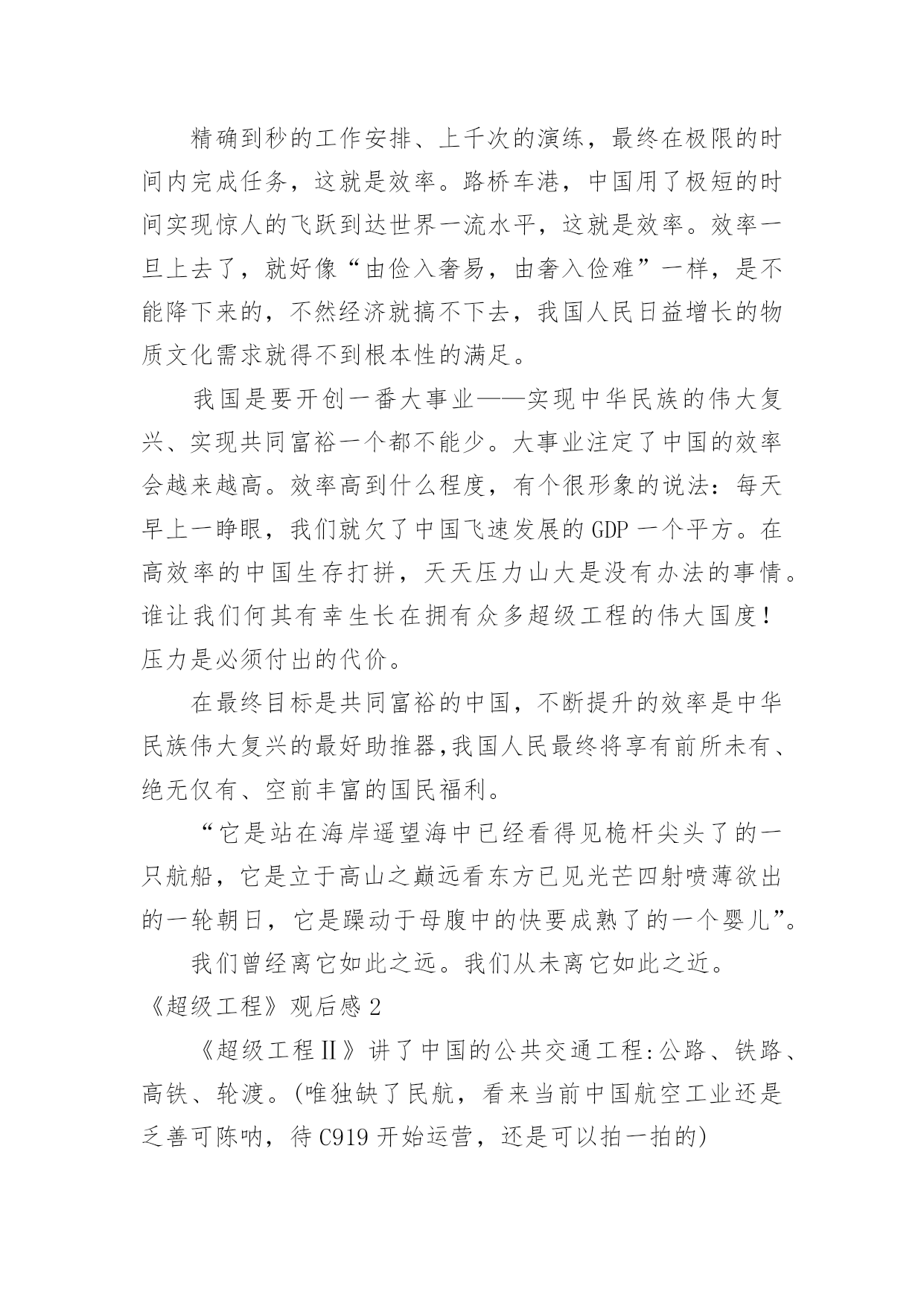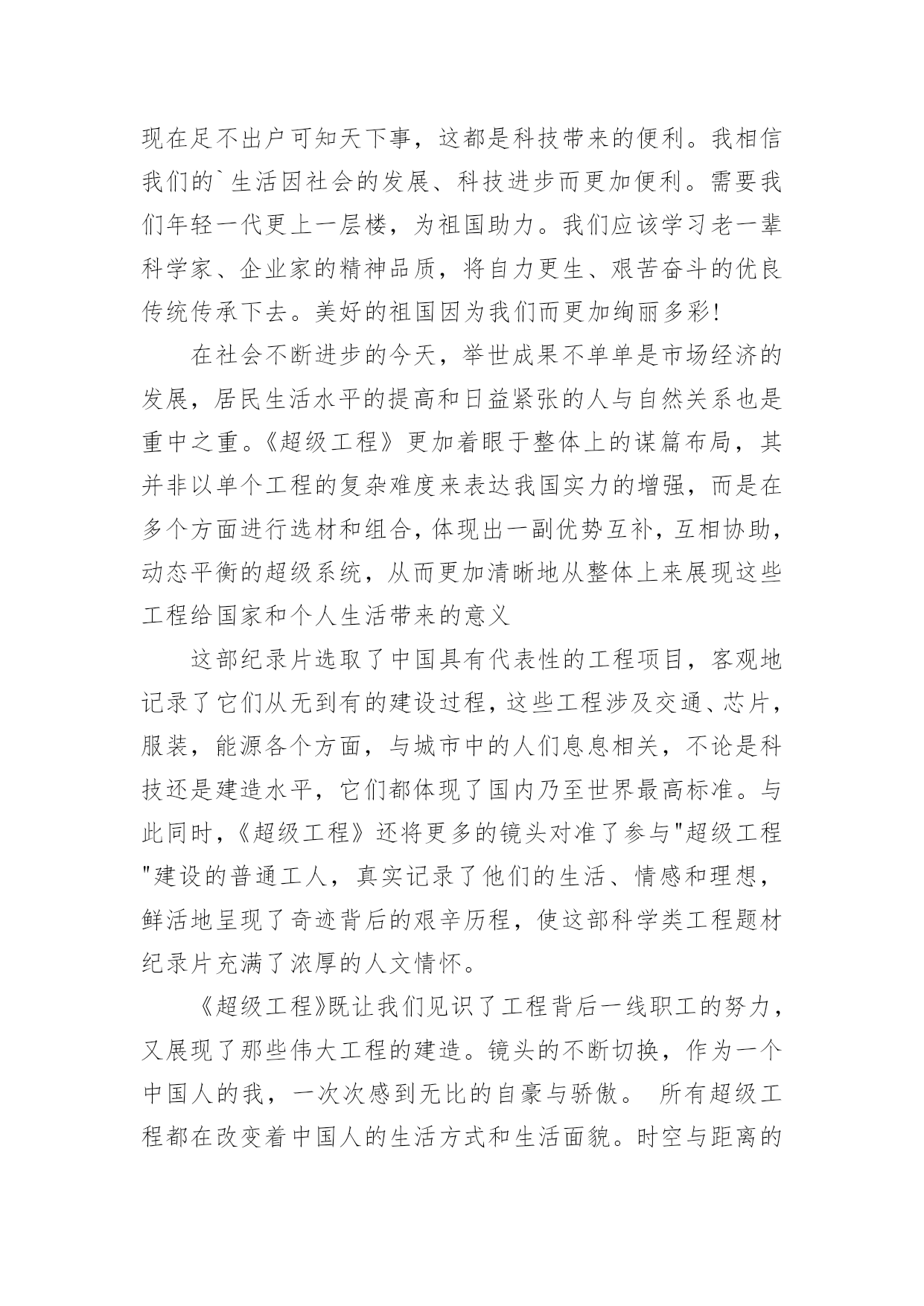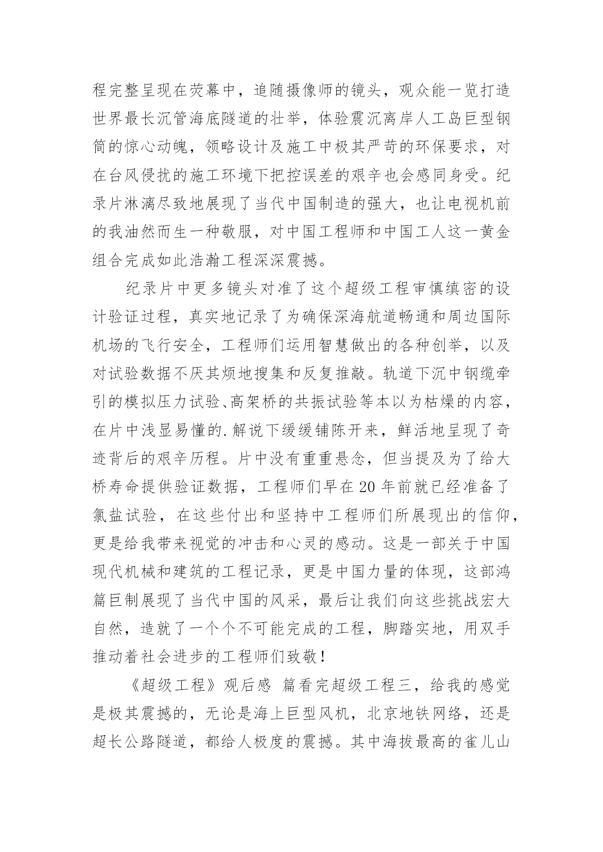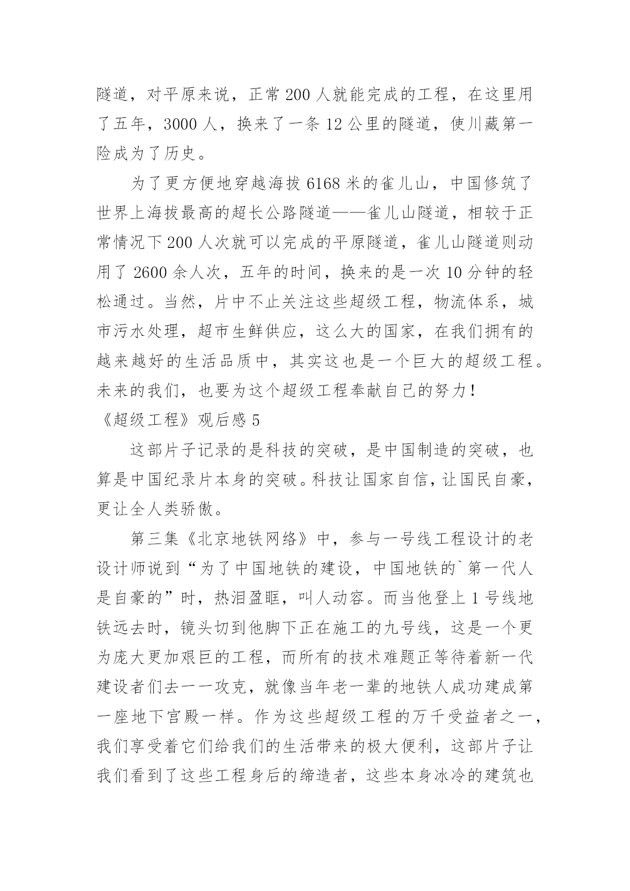 《超级工程》观后感【精华】《超级工程》观后感15篇看完一部影视作品以后,相信你一定有很多值得分享的收获,这时候最关键的观后感不能忘了。可是观后感怎么写才合适呢?以下是小编收集整理的《超级工程》观后感,仅供参考,大家一起来看看吧。《超级工程》观后感1今年国庆好看的节目挺多——纪录片《超级工程2》,新闻专题片《大国工匠》、新闻直播《江山多娇》……刚刚看完《超级工程2》,赶紧过来写感想。(文章写于20xx.10.05)20xx年《超级工程1》播出时中国才刚刚跃居世界第二大经济体。20xx年《超级工程2》,中国雄心勃勃,已经开始提出“全球经济治理”的说法。(20xx年我国国内生产总值跃居64万亿元,国家统计局的数据)。高速增长的经济,离不开这些超级工程。工业肌肉必须得要秀,要让更多人知道我们国家在高端装备制造的成绩。《超级工程2》四个部分:路桥车港,说的就是我们庞大便捷的交通网络。交通网络的关键词是什么?就是效率二字。“时间是生命,效率是金钱”,现代工业社会,要想脱颖而出一骑绝尘,无论是个人还是国家,效率是最最关键的因素。怎么样提高效率?“科学技术是第一生产力”,就是科技。科技上来了,效率就提高了,经济发展了,社会福利好了,人民生活才和谐,国家才真正长治久安。这也是国家近年来十分重视理科工科的原因。从个人的角度上说,要提高做事情的效率,两个层面:客观和主观。一要依靠科技,不断地适用新的技术工具,学习改进做事情的方法,二做事情必须专注,尽量减少其他事情的打扰,一鼓作气把一件事情做完,拒绝碎片化,思维必须要完整。《超级工程2》有不少关于效率的内容:1.高速公路里程世界第一2.跨江跨海大桥“天堑变通途”,两岸通勤时间从数小时缩短到几十分钟3.高铁发车密集最高时速能达到486km/h,春运40多天能够“搬运”30多亿人次4.世界集装箱吞吐量排名前十的港口有7个在中国(上海港、深圳港、宁波-舟山港、香港港、青岛港、广州港、天津港)在《超级工程2》中最能体现效率我觉得有两件事:1.最高峰1小时通过1.3万辆车的.三元桥仅仅用了43个小时就成功地换桥。2.徐郑线只用30分钟正式连接到高铁网络上(室内换20xx+条线、室外拆装200+套设备、50+套软件系统完成升级)精确到秒的工作安排、上千次的演练,最终在极限的时间内完成任务,这就是效率。路桥车港,中国用了极短的时间实现惊人的飞跃到达世界一流水平,这就是效率。效率一旦上去了,就好像“由俭入奢易,由奢入俭难”一样,是不能降下来的,不然经济就搞不下去,我国人民日益增长的物质文化需求就得不到根本性的满足。我国是要开创一番大事业——实现中华民族的伟大复兴、实现共同富裕一个都不能少。大事业注定了中国的效率会越来越高。效率高到什么程度,有个很形象的说法:每天早上一睁眼,我们就欠了中国飞速发展的GDP一个平方。在高效率的中国生存打拼,天天压力山大是没有办法的事情。谁让我们何其有幸生长在拥有众多超级工程的伟大国度!压力是必须付出的代价。在最终目标是共同富裕的中国,不断提升的效率是中华民族伟大复兴的最好助推器,我国人民最终将享有前所未有、绝无仅有、空前丰富的国民福利。“它是站在海岸遥望海中已经看得见桅杆尖头了的一只航船,它是立于高山之巅远看东方已见光芒四射喷薄欲出的一轮朝日,它是躁动于母腹中的快要成熟了的一个婴儿”。我们曾经离它如此之远。我们从未离它如此之近。《超级工程》观后感2《超级工程Ⅱ》讲了中国的公共交通工程:公路、铁路、高铁、轮渡。(唯独缺了民航,看来当前中国航空工业还是乏善可陈呐,待C919开始运营,还是可以拍一拍的)总的来说,这部纪录片,画面还算精美,数据也比较详实,但叙述实在杂碎每个工程只讲了一点,也不够专业。同样是讲交通,更喜欢第一部里讲地铁的那一集。要想富,先修路,这话不是瞎讲的。经济的腾飞,城镇化的发展,社会分工的经济化导致人口、物品的大规模流动。这片要是我来拍,还可以再拍拍快递物流什么的是如何运转的,涉及到多种交通方式联运,穿连起前面四集。子在川上曰:逝者如斯夫!风樯动,龟蛇静,起宏图。一桥飞架南北,天堑变通途。更立西江石壁,截断巫山云雨,高峡出平湖。架设四通八达的.交通网络构想正在实现,但我们的交通时常拥堵,还不够高效,如何改进交通网络,优化运行程序,或许会成为交通运输行业的新命题。一句话总结:这纪录片在春运时候看,很应景。《超级工程》观后感3xxxx年11月22日,由院学生会组织发起的观看大型纪录片《超级工程》活动在L8-619举行,随着纪录片镜头的转换,同学们见证了那些工程在建设过程中面临的种种挑战;见证了贯穿于工程建设每个环节的匠人精神;也见证了建筑工人用汗水浇筑超级工程。他们的智慧、努力、梦想和严格要求自己的精神,震撼着所有在场观看的同学超级工程,大国典范。时代飞速发展,科技发展的