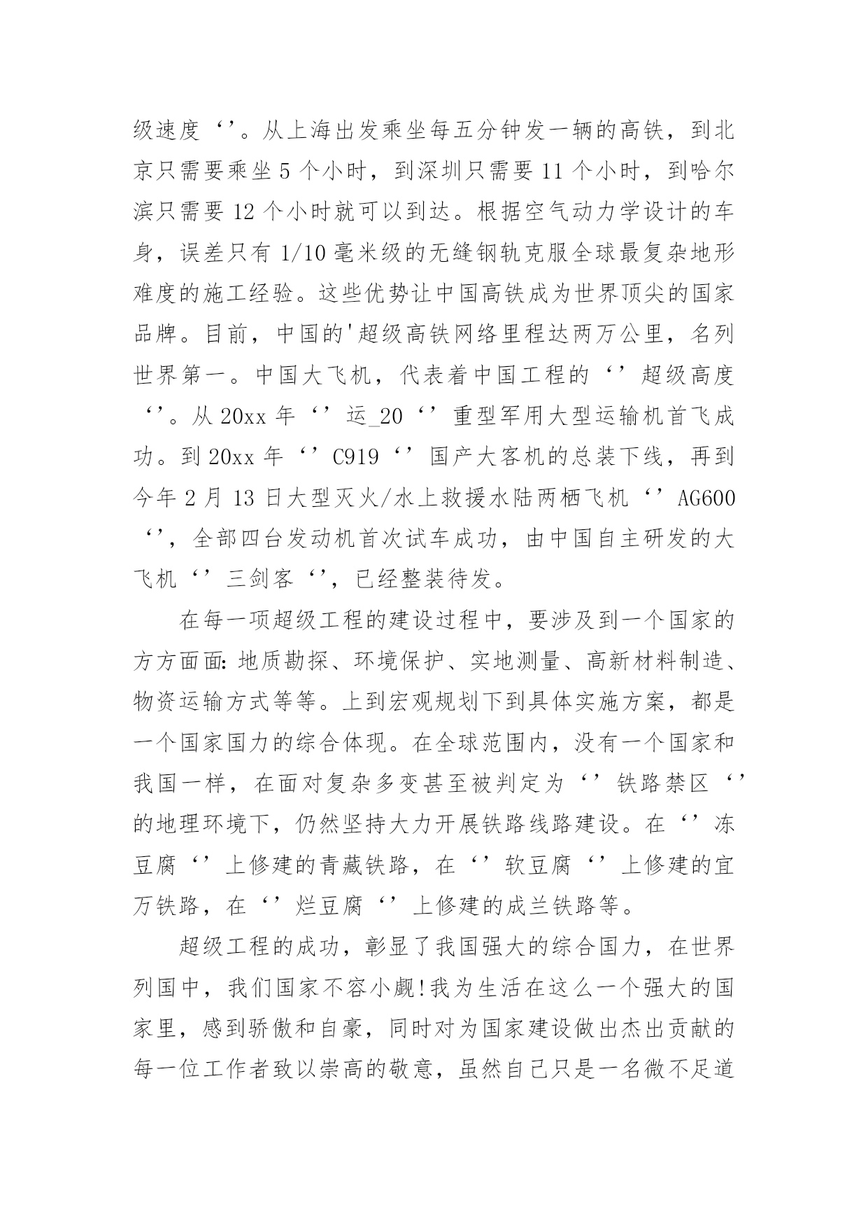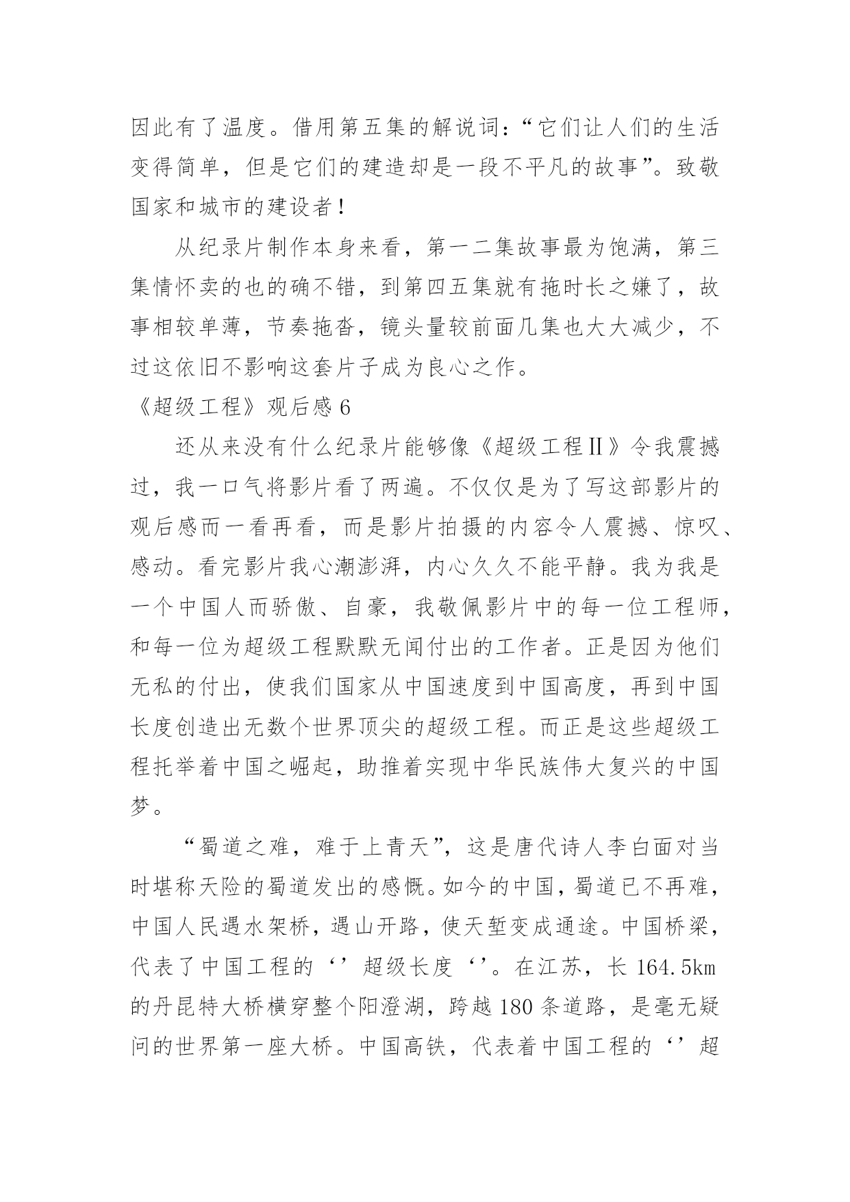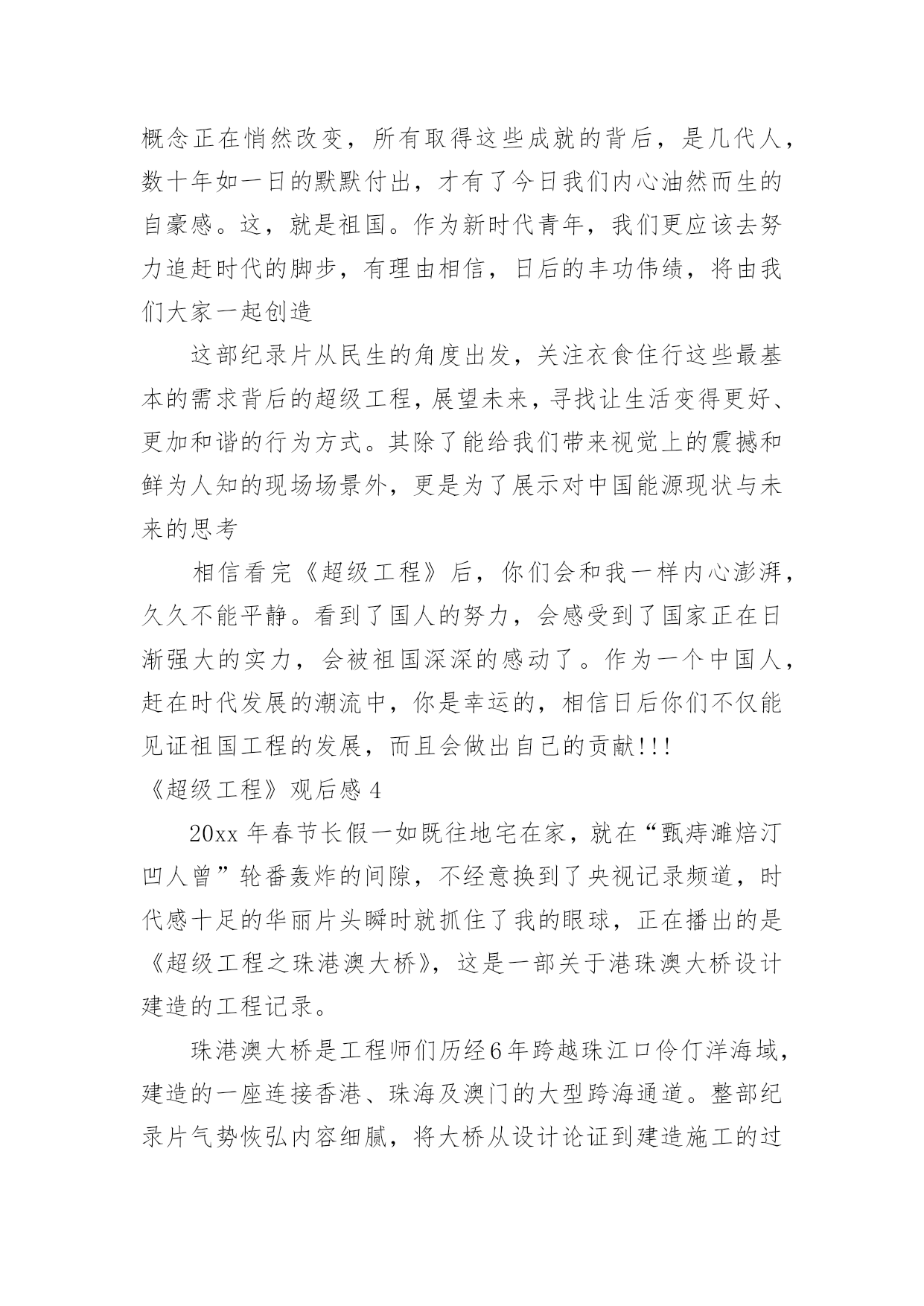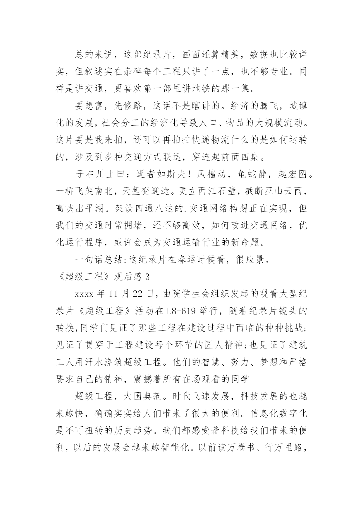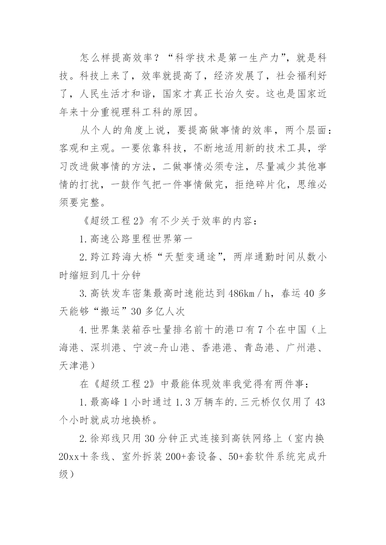 《超级工程》观后感【精华】《超级工程》观后感15篇看完一部影视作品以后,相信你一定有很多值得分享的收获,这时候最关键的观后感不能忘了。可是观后感怎么写才合适呢?以下是小编收集整理的《超级工程》观后感,仅供参考,大家一起来看看吧。《超级工程》观后感1今年国庆好看的节目挺多——纪录片《超级工程2》,新闻专题片《大国工匠》、新闻直播《江山多娇》……刚刚看完《超级工程2》,赶紧过来写感想。(文章写于20xx.10.05)20xx年《超级工程1》播出时中国才刚刚跃居世界第二大经济体。20xx年《超级工程2》,中国雄心勃勃,已经开始提出“全球经济治理”的说法。(20xx年我国国内生产总值跃居64万亿元,国家统计局的数据)。高速增长的经济,离不开这些超级工程。工业肌肉必须得要秀,要让更多人知道我们国家在高端装备制造的成绩。《超级工程2》四个部分:路桥车港,说的就是我们庞大便捷的交通网络。交通网络的关键词是什么?就是效率二字。“时间是生命,效率是金钱”,现代工业社会,要想脱颖而出一骑绝尘,无论是个人还是国家,效率是最最关键的因素。怎么样提高效率?“科学技术是第一生产力”,就是科技。科技上来了,效率就提高了,经济发展了,社会福利好了,人民生活才和谐,国家才真正长治久安。这也是国家近年来十分重视理科工科的原因。从个人的角度上说,要提高做事情的效率,两个层面:客观和主观。一要依靠科技,不断地适用新的技术工具,学习改进做事情的方法,二做事情必须专注,尽量减少其他事情的打扰,一鼓作气把一件事情做完,拒绝碎片化,思维必须要完整。《超级工程2》有不少关于效率的内容:1.高速公路里程世界第一2.跨江跨海大桥“天堑变通途”,两岸通勤时间从数小时缩短到几十分钟3.高铁发车密集最高时速能达到486km/h,春运40多天能够“搬运”30多亿人次4.世界集装箱吞吐量排名前十的港口有7个在中国(上海港、深圳港、宁波-舟山港、香港港、青岛港、广州港、天津港)在《超级工程2》中最能体现效率我觉得有两件事:1.最高峰1小时通过1.3万辆车的.三元桥仅仅用了43个小时就成功地换桥。2.徐郑线只用30分钟正式连接到高铁网络上(室内换20xx+条线、室外拆装200+套设备、50+套软件系统完成升级)精确到秒的工作安排、上千次的演练,最终在极限的时间内完成任务,这就是效率。路桥车港,中国用了极短的时间实现惊人的飞跃到达世界一流水平,这就是效率。效率一旦上去了,就好像“由俭入奢易,由奢入俭难”一样,是不能降下来的,不然经济就搞不下去,我国人民日益增长的物质文化需求就得不到根本性的满足。我国是要开创一番大事业——实现中华民族的伟大复兴、实现共同富裕一个都不能少。大事业注定了中国的效率会越来越高。效率高到什么程度,有个很形象的说法:每天早上一睁眼,我们就欠了中国飞速发展的GDP一个平方。在高效率的中国生存打拼,天天压力山大是没有办法的事情。谁让我们何其有幸生长在拥有众多超级工程的伟大国度!压力是必须付出的代价。在最终目标是共同富裕的中国,不断提升的效率是中华民族伟大复兴的最好助推器,我国人民最终将享有前所未有、绝无仅有、空前丰富的国民福利。“它是站在海岸遥望海中已经看得见桅杆尖头了的一只航船,它是立于高山之巅远看东方已见光芒四射喷薄欲出的一轮朝日,它是躁动于母腹中的快要成熟了的一个婴儿”。我们曾经离它如此之远。我们从未离它如此之近。《超级工程》观后感2《超级工程Ⅱ》讲了中国的公共交通工程:公路、铁路、高铁、轮渡。(唯独缺了民航,看来当前中国航空工业还是乏善可陈呐,待C919开始运营,还是可以拍一拍的)总的来说,这部纪录片,画面还算精美,数据也比较详实,但叙述实在杂碎每个工程只讲了一点,也不够专业。同样是讲交通,更喜欢第一部里讲地铁的那一集。要想富,先修路,这话不是瞎讲的。经济的腾飞,城镇化的发展,社会分工的经济化导致人口、物品的大规模流动。这片要是我来拍,还可以再拍拍快递物流什么的是如何运转的,涉及到多种交通方式联运,穿连起前面四集。子在川上曰:逝者如斯夫!风樯动,龟蛇静,起宏图。一桥飞架南北,天堑变通途。更立西江石壁,截断巫山云雨,高峡出平湖。架设四通八达的.交通网络构想正在实现,但我们的交通时常拥堵,还不够高效,如何改进交通网络,优化运行程序,或许会成为交通运输行业的新命题。一句话总结:这纪录片在春运时候看,很应景。《超级工程》观后感3xxxx年11月22日,由院学生会组织发起的观看大型纪录片《超级工程》活动在L8-619举行,随着纪录片镜头的转换,同学们见证了那些工程在建设过程中面临的种种挑战;见证了贯穿于工程建设每个环节的匠人精神;也见证了建筑工人用汗水浇筑超级工程。他们的智慧、努力、梦想和严格要求自己的精神,震撼着所有在场观看的同学超级工程,大国典范。时代飞速发展,科技发展的