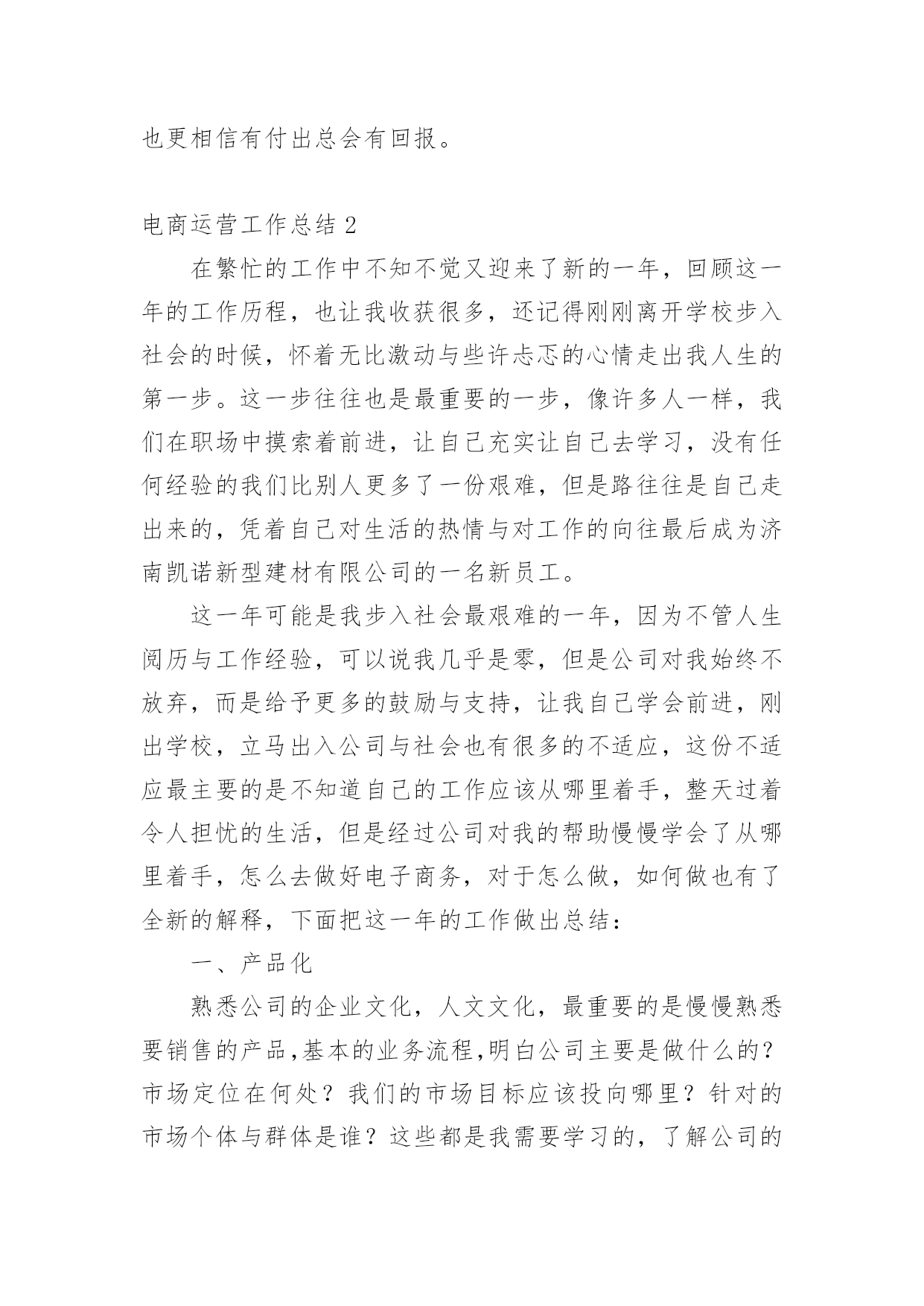 电商运营工作总结电商运营工作总结(通用)总结是对取得的成绩、存在的问题及得到的经验和教训等方面情况进行评价与描述的一种书面材料,它可以帮助我们有寻找学习和工作中的规律,因此好好准备一份总结吧。但是却发现不知道该写些什么,以下是小编收集整理的电商运营工作总结,希望对大家有所帮助。电商运营工作总结1xx已悄然离去,回想起来,风风火火的这一年或许可以算的上是自己经历的最大转变的一年,在xx的开始,我仍在校园中晃晃悠悠,每天过的没心没肺,从未考虑过将来,如今,一年未到,我却转型为正式的一名员工,能够坚持着早起晚归,朝九晚五,和每一个上班族一样过着很有规律的生活,真的自己都很难想象,尤其结合自己工作任务,以一个完全门外汉的身份接触着淘宝,经历了曾经让我掏空钱包的双十一、双十二,每天乐此不疲的搜罗着天猫红包的藏身之处,每一样都可以称之为不可思议。犹记得当初被通知来面试时,自己的心情依然记得,那时候自己也没有什么职业规划,什么工作,面试什么也全然不顾,只知道傻傻的抱着简历来了,东哥问我会玩微博吗,平时淘宝吗,内心疑惑着到底是什么神秘的工作,可以这么愉快,既能逛淘宝,还能玩微博,如今,终于解开了这个面具,以一个电商执行者熟悉着淘宝,接触者它的世界,也适应着它的规则。执行,顾名思义是贯彻实行的意思,电商的运营执行也符合着它的.字面意思,4月份加入电商部,也正是开始了执行的工作,每天熟悉着淘宝后台,接触着产品的上下架,各类工具的操作执行,我也总结为是最基本的执行工作,忙着唯路易每周三的定时上新,忙着它的每款产品新的促销,新的折扣,接近大半个月时间,就是我每天的工作任务,其实现在回想起来,那时候其实才是生活中最忙碌的一段时间,白天几个小时的工作,晚上回家还需要忙着毕业设计与论文,对比请假回校的同学,自己竟然坚持了下来,那一段时间也是自己面对完全陌生的淘宝,自己最快熟悉成长起来的阶段,执行的工作也很快变成了自己的擅长熟悉的领域,因而在后面的餐中王、萨雷以及目前的利兹马项目,虽然仍然做着执行的工作,但是因为是自己熟悉的一块,内心也会变得很有自信。每一次使用自己熟悉而简单的后台操作就能够帮助解决掉顾客的各种麻烦时,心情自然感到很开心。接触推广工作其实自己也很意外,从最初的推广,到现在实战中的付费推广,每一项都是一种新的体验,第一次投放使用推广费用,那时双手或许都有冒冷汗吧,简单的一个投放计划都需要再三确认里面数据是否精准,是否还有遗漏,兢兢战战的点击完成按钮后,每时每刻都关注着后台数据,反馈的每一张报表都尝试分析,即使很多数据都不太明白,如今回顾才发现,再神秘再高深的世界,接触了、尝试了才能揭开它的面纱,一探究竟,才能知道自己是不是也可以做到。在过去的一年,每一项任务都是自己面对的一种尝试,一种挑战,有失败,有成功,这其中都必须感谢着主管所给与的督促与机会,让自己能够有实战的机会,被允许犯错,其中每一次的失误更好的让自己认识到不足之处,同时自己也时刻进行着反思,在执行前更是进行着多次的检查核实,以便及时发现和减少错误的发生,告诫自己同一个错误控制着不能犯第二次。目前的职业规划制定的是在自己的岗位上朝着店长的方向迈进,但是也清楚的认识到自己目前所拥有的仅仅是对于执行推广所涵盖的工作内容,但是同样的,成为一名店长,掌管着手中多个项目,自己所欠缺的漏洞非常巨大,首先便是对于整个项目的把控能力就很薄弱,自己经常从自己的角度出发,因而洞察问题的能力也非常局限。其次便是必备的沟通协调能力非常欠缺,或许也是性格使然,克服起来难度很大,也是在后面的工作中自己必须加强训练的地方。新的一年已经到来了,自己也可以成为一位老员工,缺乏经验的自己目前最需要的就是总结经验和教训,工作还在继续,相信学习得更多,总结得很多,更有利于自己前行,也更相信有付出总会有回报。电商运营工作总结2在繁忙的工作中不知不觉又迎来了新的一年,回顾这一年的工作历程,也让我收获很多,还记得刚刚离开学校步入社会的时候,怀着无比激动与些许忐忑的心情走出我人生的第一步。这一步往往也是最重要的一步,像许多人一样,我们在职场中摸索着前进,让自己充实让自己去学习,没有任何经验的我们比别人更多了一份艰难,但是路往往是自己走出来的,凭着自己对生活的热情与对工作的向往最后成为济南凯诺新型建材有限公司的一名新员工。这一年可能是我步入社会最艰难的一年,因为不管人生阅历与工作经验,可以说我几乎是零,但是公司对我始终不放弃,而是给予更多的鼓励与支持,让我自己学会前进,刚出学校,立马出入公司与社会也有很多的不适应,这份不适应最主要的是不知道自己的工作应该从哪里着手,整天过着令人担忧的生活,但是经过公司对我的帮助慢慢学会了从哪里着手,怎么去做好电子商务,对于怎么做,如何做也有了全新的解释,下面把这一年的工作做出总结:一、产品化熟悉公