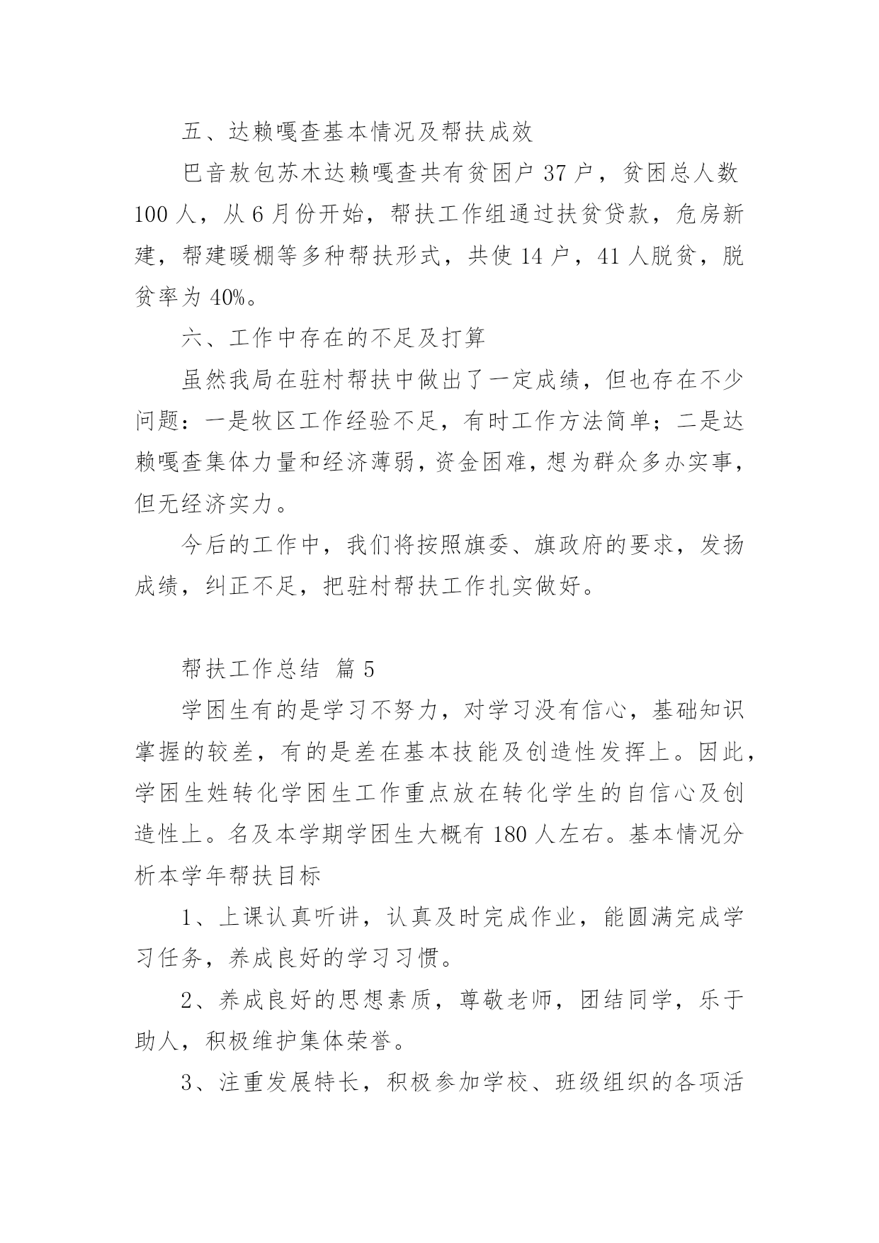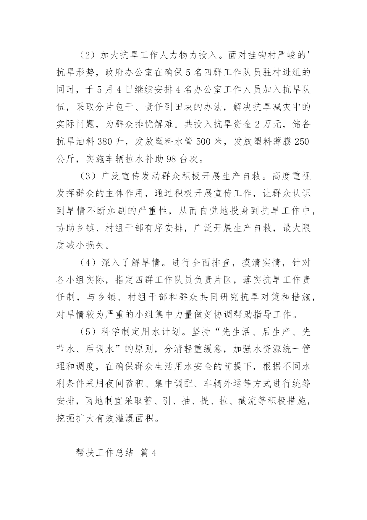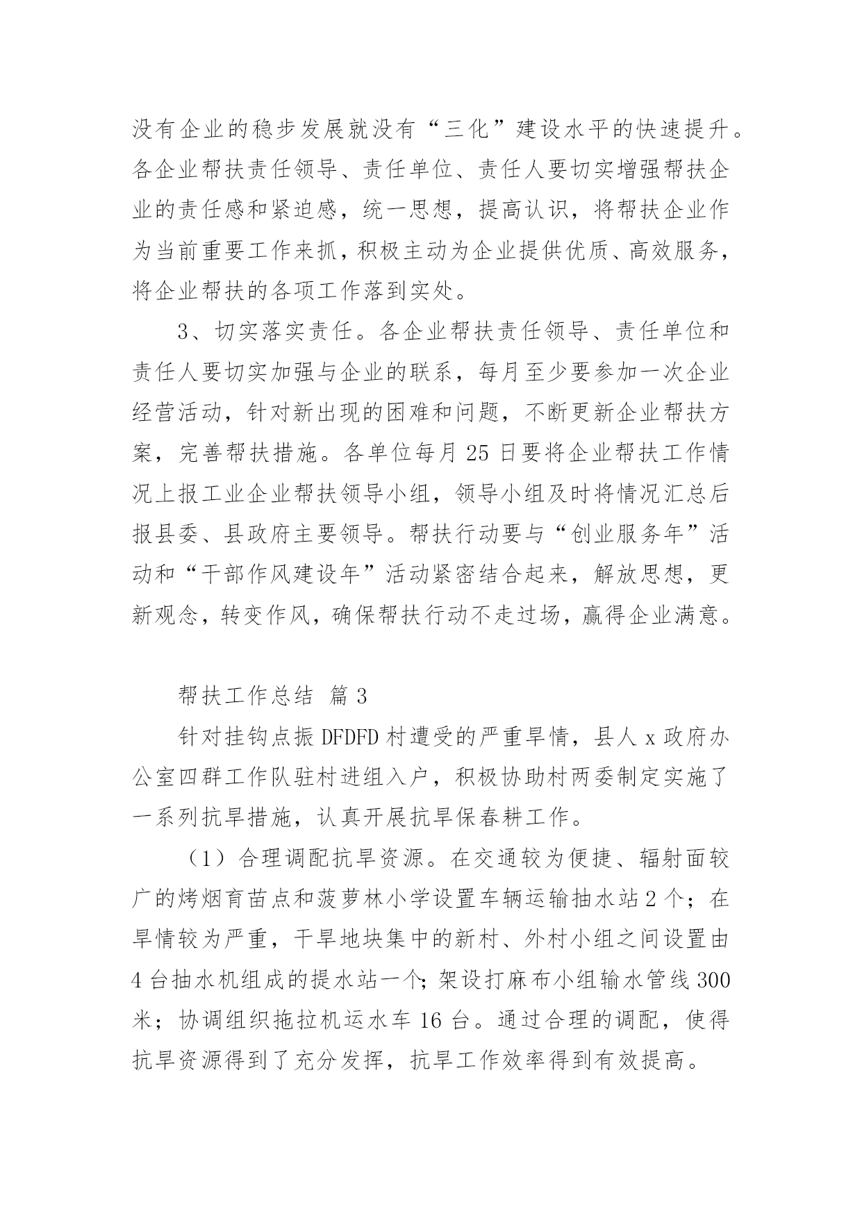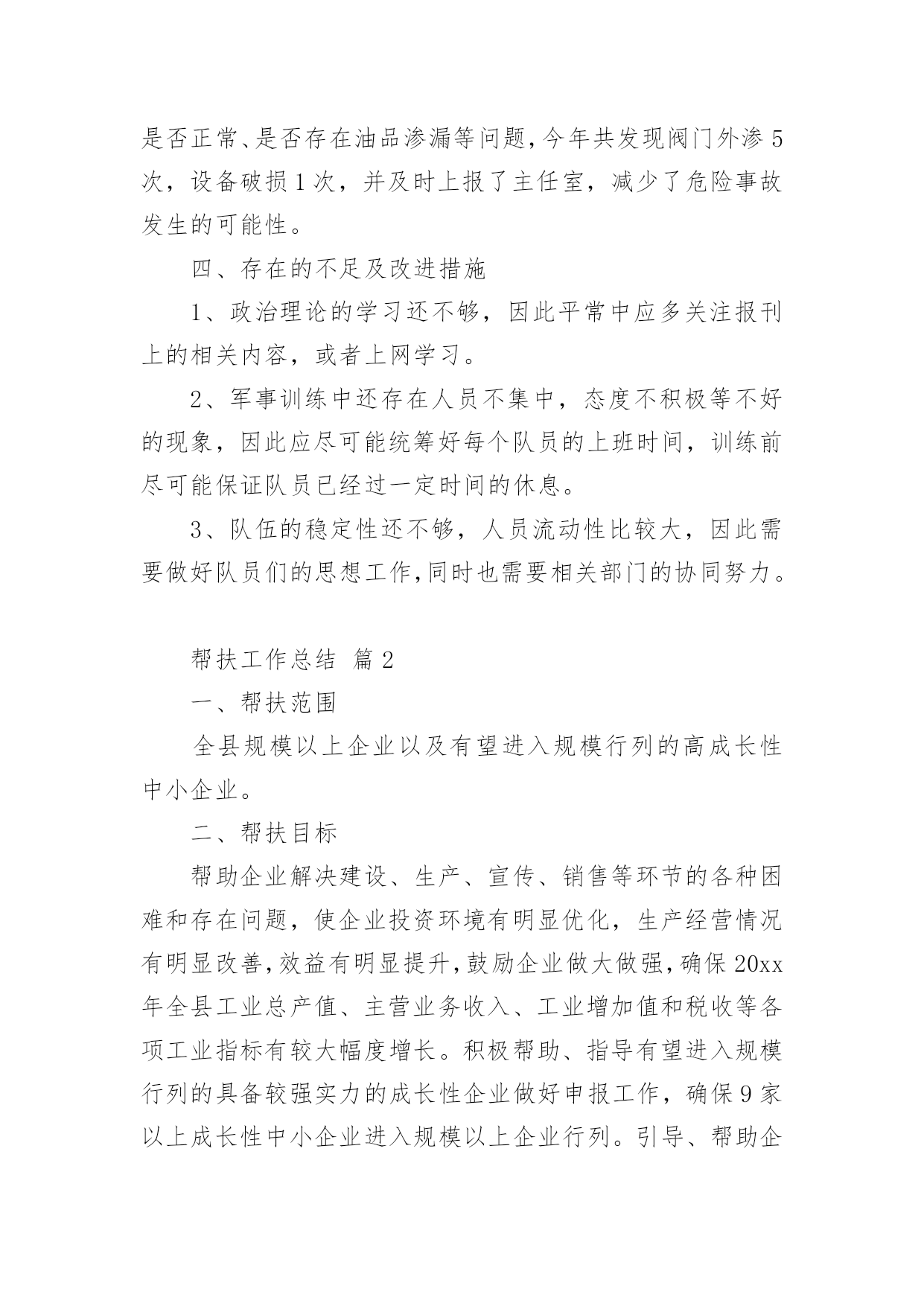 帮扶工作总结总结是对某一特定时间段内的学习和工作生活等表现情况加以回顾和分析的一种书面材料,通过它可以全面地、系统地了解以往的学习和工作情况,是时候写一份总结了。那么你真的懂得怎么写总结吗?下面是小编帮大家整理的帮扶工作总结,仅供参考,欢迎大家阅读。帮扶工作总结篇1不知不觉间,20xx年上半年已经过去了,在公司各级领导、经—文保大队正确的指导和全体员工的大力配合下,我们警队能够顺利完成上级赋予的各项安全工作。虽然在过去一年的时间里取得了一定的成绩,但是我们也清醒地认识到存在一些问题,现将上半年的工作情况从以下几方面做个总结:一、加强队伍建设提升业务水平加强队伍的建设是我们警队全年工作的重点,针对警队工作地点在油库这一区域的特殊性,严格要求每位警员牢牢绷紧安全弦,牢记“安全第一,预防为主,综合治理”的安全生产方针;结合油库全年安全工作和杭州市治安维稳的形势,学习分析和总结了今年发生的各类重大、特大事件的原因和教训,从而加强了我们队员在平时工作中的安全意识。让队员们了解油库文化服务的理念和经—文保大队的工作指示意见,文明执勤,提升服务质量,树立了良好的窗口形象,受到了各级领导和前来参观的友人的好评,提高了队员们工作的积极性,为队伍的建设打下了良好的基础二、加强军事训练提高作战能力鉴于工作性质的特殊性,警队要求队员们在体能和技能上比油库普通员工具备更高的水平,每周一次的体能技能强化训练,大大提高了队员们作战能力。列队、军姿、长跑、短跑、水带操作、消防泵操作、灭火器使用等一系列的训练,队员间相互切磋、交换意见,进一步提升了工作的积极性,增进了队员们之间的'感情。此外,针对油库的应急预案,明确分工,让每位队员在遇到紧急事件的时候,知道自己的工作内容是什么,提高效率,完善应急处置能力,全年共进行消防实战演习20余次。三、搞好消防设备检查保养工作提升巡查能力具备再好的体能和技能的人离开了消防设备,是不可能把火扑灭的,这就要求我们在日常的工作中加强对消防设备的检查和保养。队员们严格按照“浙江杭州石油分公司消防设备检查保养细则”对应急照明灯、地下阀门、消火栓、冷却系统、泡沫系统、消防泵等设备定期和不定期进行检查和保养,确保设备完好有效,整齐干净。另外,油库要求白天每两小时巡查一次、夜间每小时巡检一次,其目的就是要及时发现存在的问题,把安全隐患消灭在萌芽状态,避免发生重大、特大事故。在巡查中,我们队员们也是相当仔细地检查设备运行是否正常、是否存在油品渗漏等问题,今年共发现阀门外渗5次,设备破损1次,并及时上报了主任室,减少了危险事故发生的可能性。四、存在的不足及改进措施1、政治理论的学习还不够,因此平常中应多关注报刊上的相关内容,或者上网学习。2、军事训练中还存在人员不集中,态度不积极等不好的现象,因此应尽可能统筹好每个队员的上班时间,训练前尽可能保证队员已经过一定时间的休息。3、队伍的稳定性还不够,人员流动性比较大,因此需要做好队员们的思想工作,同时也需要相关部门的协同努力。帮扶工作总结篇2一、帮扶范围全县规模以上企业以及有望进入规模行列的高成长性中小企业。二、帮扶目标帮助企业解决建设、生产、宣传、销售等环节的各种困难和存在问题,使企业投资环境有明显优化,生产经营情况有明显改善,效益有明显提升,鼓励企业做大做强,确保20xx年全县工业总产值、主营业务收入、工业增加值和税收等各项工业指标有较大幅度增长。积极帮助、指导有望进入规模行列的具备较强实力的成长性企业做好申报工作,确保9家以上成长性中小企业进入规模以上企业行列。引导、帮助企业充分利用闲置土地,切实提高园区土地利用率。三、帮扶措施建立健全“一家企业、一名县领导、一个部门、一套政策、一套服务措施”的“五个一”帮扶机制,在人才、资金、用地、供水供电、信贷、上市和服务等方面对纳入帮扶范围的企业进行倾斜支持(结对帮扶责任分工见附表)。1、采取行政、经济和服务等措施,完善人力资源市场,组织开展好各类招聘、招工活动,加强与外县市劳务合作,建立校企合作平台,加大奖励扶持力度,积极为企业解决招工难的问题。2、加强工业运行调度,加大对市场价格、用水用电等方面的检测和分析,密切政企、部门之间的协调和联动。3、采取专项协调会、项目对接会等形式,加强政银企合作,充分发挥各种担保平台作用,主动为企业融资牵线搭桥,积极加强和上级部门的对接沟通,为企业解决融资、上市等方面的难题。4、本着提高效率、方便企业的原则,简化、优化办事程序,减少审批环节,实行公开承诺制、限时办结制等制度,急事急办,特事特办,提高服务的质量和水平。四、帮扶步骤帮扶行动从5月5日至12月25日集中时间、集中人力进行。活动分四个阶段:1、宣传动员阶段(5月5至5月10日)。各帮扶责任领导和责任单位召开动员会进行安排部署,将帮扶的责任落实到个人,就帮