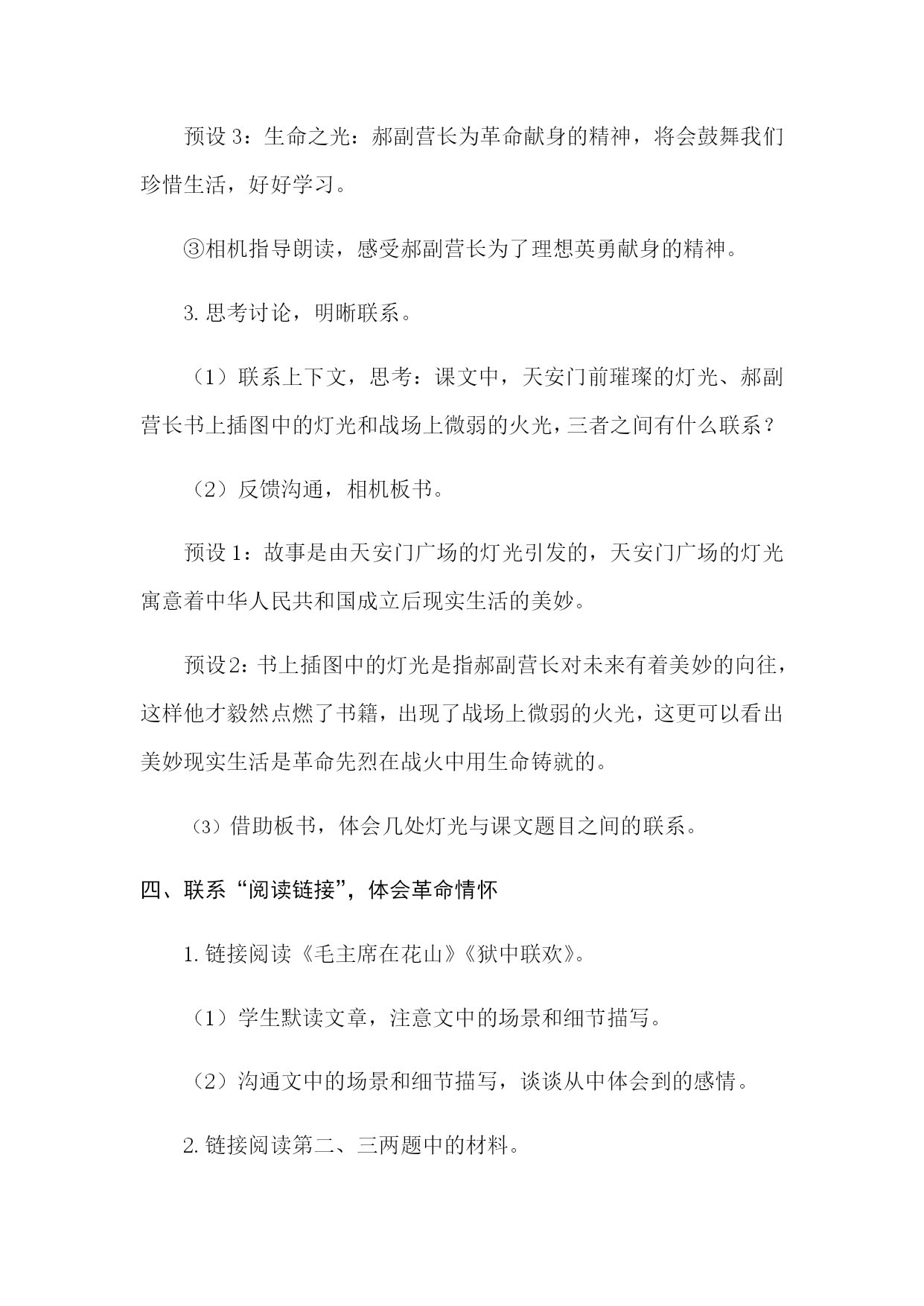 8*灯光[教学目标]1.了解课文中“灯光”与“火光”之间的关系,以及它们与课题之间的关系。2.读“阅读链接”,借助查找资料等方法把握内容,并关注场景和细节描写,体会思想感情。【语文要素】[教学重难点]1.了解课文中“灯光”与“火光”之间的关系,以及它们与课题之间的关系。2.读“阅读链接”,借助查找资料等方法把握内容,并关注场景和细节描写,体会思想感情。[教学课时]1课时一、直面“灯光”,了解故事背景1.导入:今天我们跟随当代著名作家王愿坚,去了解一个关于“灯光”的故事。(板书课题)2.朗读第3自然段,了解