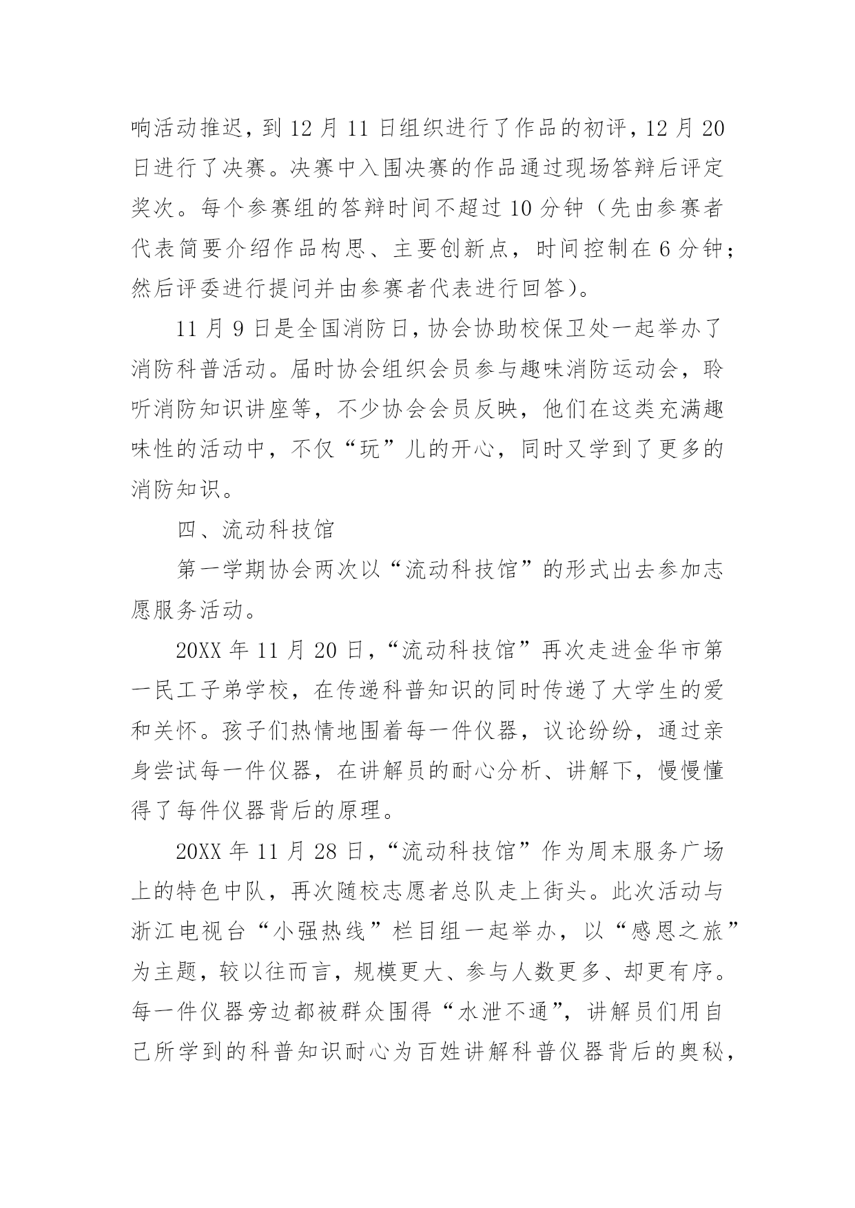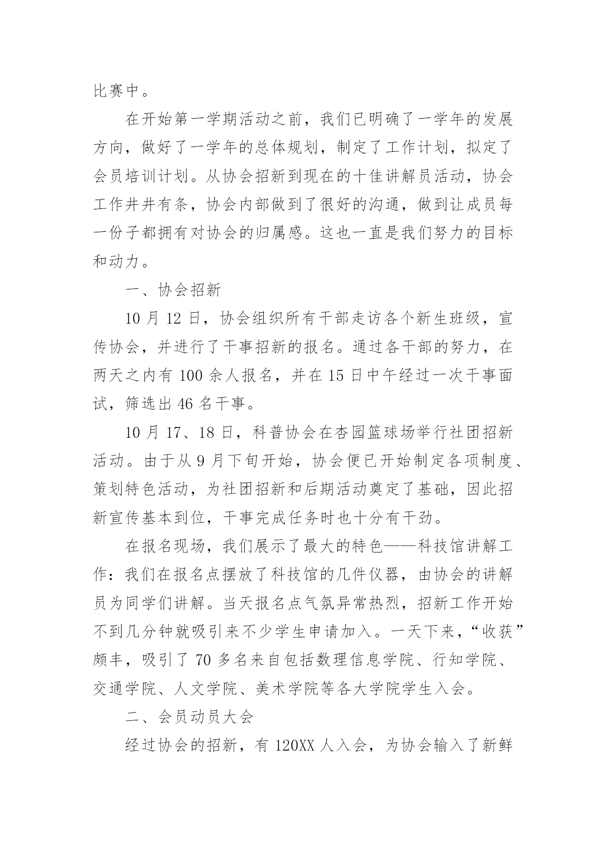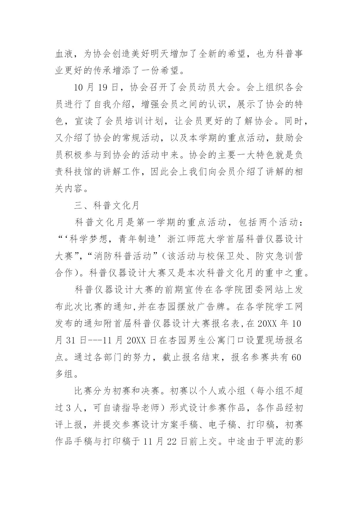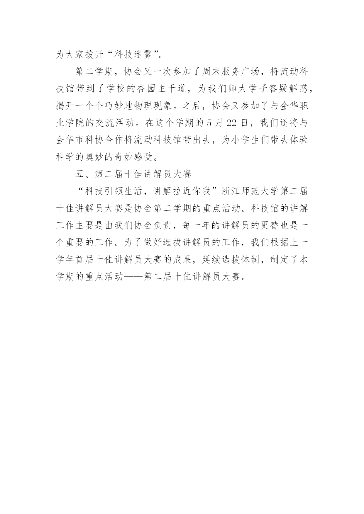 科普协会年度工作报告科普协会年度工作报告前言科普协会成为校级社团的第一学年,紧张而充实。协会始终保持着对科普的热情,满怀喜悦地开展着本学年的所有活动。经过不断的磨砺,协会正一天天地成长着;经过一学年的努力,协会也取得了许多成果。我们秉承“推广科学知识营造科学氛围提高科普能力提升科学素养”的宗旨,以“立足师大,面向社会,服务会员,推广科学”为主要方针,力争将科普知识传播到每个角落。同时,协会也将加强自身会员之间的交流,通过培训来满足会员学习兴趣,通过活动来丰富会员的业余生活。首先,第一学期协会各个方面都加强了协调和管理,健全了协会的体制,更好地完善了协会内部结构。具体来说,协会在保持先前的传统的规章制度基础上,又有所改进,每次大小会议进行出勤统计,留下会议记录,以供会后总结;其次明确了内部负责人的分工,使得工作组织起来更有效率、更井井有条;在交流宣传方面,协会拥有一个自己的交流博客和“流动科技馆”主体网站,以记录协会发展,增强协会的宣传,提供交流的平台。在做好协会内部工作的同时,也积极组织各项活动,第一学期有重点活动——“科普文化月”,其中包括两个子活动。第二学期有“第二届十佳讲解员大赛”,现还在紧张的比赛中。在开始第一学期活动之前,我们已明确了一学年的发展方向,做好了一学年的总体规划,制定了工作计划,拟定了会员培训计划。从协会招新到现在的十佳讲解员活动,协会工作井井有条,协会内部做到了很好的沟通,做到让成员每一份子都拥有对协会的归属感。这也一直是我们努力的目标和动力。一、协会招新10月12日,协会组织所有干部走访各个新生班级,宣传协会,并进行了干事招新的报名。通过各干部的努力,在两天之内有100余人报名,并在15日中午经过一次干事面试,筛选出46名干事。10月17、18日,科普协会在杏园篮球场举行社团招新活动。由于从9月下旬开始,协会便已开始制定各项制度、策划特色活动,为社团招新和后期活动奠定了基础,因此招新宣传基本到位,干事完成任务时也十分有干劲。在报名现场,我们展示了最大的特色——科技馆讲解工作:我们在报名点摆放了科技馆的几件仪器,由协会的讲解员为同学们讲解。当天报名点气氛异常热烈,招新工作开始不到几分钟就吸引来不少学生申请加入。一天下来,“收获”颇丰,吸引了70多名来自包括数理信息学院、行知学院、交通学院、人文学院、美术学院等各大学院学生入会。二、会员动员大会经过协会的招新,有120XX人入会,为协会输入了新鲜血液,为协会创造美好明天增加了全新的希望,也为科普事业更好的传承增添了一份希望。10月19日,协会召开了会员动员大会。会上组织各会员进行了自我介绍,增强会员之间的认识,展示了协会的特色,宣读了会员培训计划,让会员更好的了解协会。同时,又介绍了协会的常规活动,以及本学期的重点活动,鼓励会员积极参与到协会的活动中来。协会的主要一大特色就是负责科技馆的讲解工作,因此会上我们向会员介绍了讲解的相关内容。三、科普文化月科普文化月是第一学期的重点活动,包括两个活动:“‘科学梦想,青年制造’浙江师范大学首届科普仪器设计大赛”,“消防科普活动”(该活动与校保卫处、防灾急训营合作)。科普仪器设计大赛又是本次科普文化月的重中之重。科普仪器设计大赛的前期宣传在各学院团委网站上发布此次比赛的通知,并在杏园摆放广告牌。在各学院学工网发布的通知附首届科普仪器设计大赛报名表,在20XX年10月31日---11月20XX日在杏园男生公寓门口设置现场报名点。通过各部门的努力,截止报名结束,报名参赛共有60多组。比赛分为初赛和决赛。初赛以个人或小组(每小组不超过3人,可自请指导老师)形式设计参赛作品,各作品经初评上报,并提交参赛设计方案手稿、电子稿、打印稿,初赛作品手稿与打印稿于11月22日前上交。中途由于甲流的影响活动推迟,到12月11日组织进行了作品的初评,12月20日进行了决赛。决赛中入围决赛的作品通过现场答辩后评定奖次。每个参赛组的答辩时间不超过10分钟(先由参赛者代表简要介绍作品构思、主要创新点,时间控制在6分钟;然后评委进行提问并由参赛者代表进行回答)。11月9日是全国消防日,协会协助校保卫处一起举办了消防科普活动。届时协会组织会员参与趣味消防运动会,聆听消防知识讲座等,不少协会会员反映,他们在这类充满趣味性的活动中,不仅“玩”儿的开心,同时又学到了更多的消防知识。四、流动科技馆第一学期协会两次以“流动科技馆”的形式出去参加志愿服务活动。20XX年11月20日,“流动科技馆”再次走进金华市第一民工子弟学校,在传递科普知识的同时传递了大学生的爱和关怀。孩子们热情地围着每一件仪器,议论纷纷,通过亲身尝试每一件仪器,在讲解员的耐心分析、讲解下,慢慢懂得了每件仪器背后的原理。20XX年11月28日,“流动科技馆”作为周末服务广场上的特色中队,