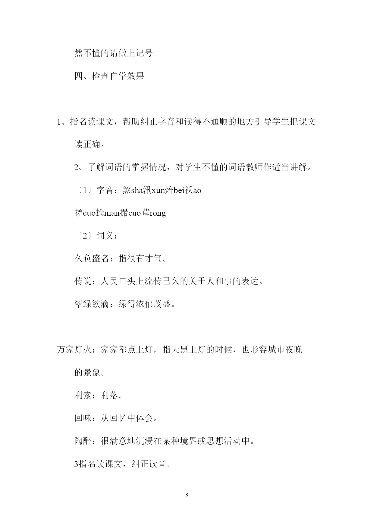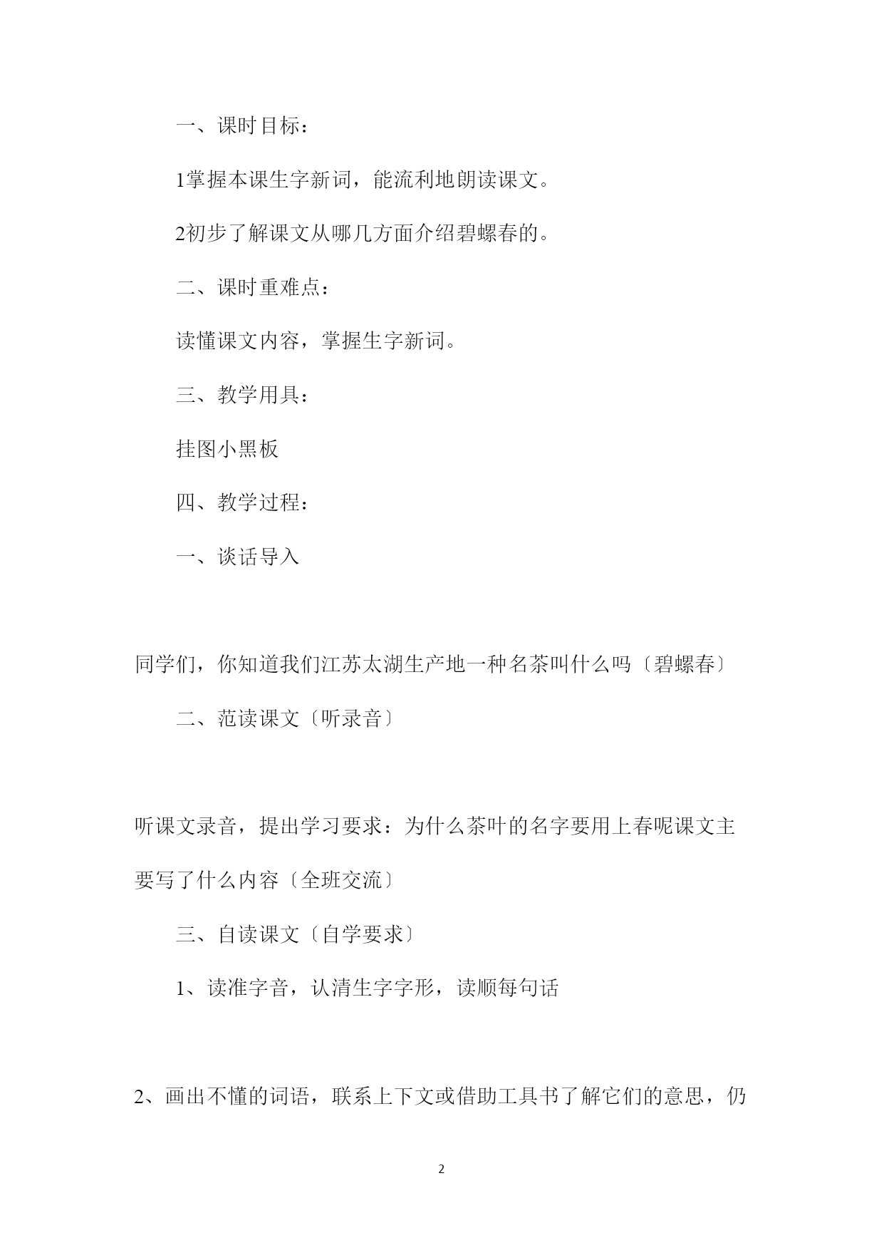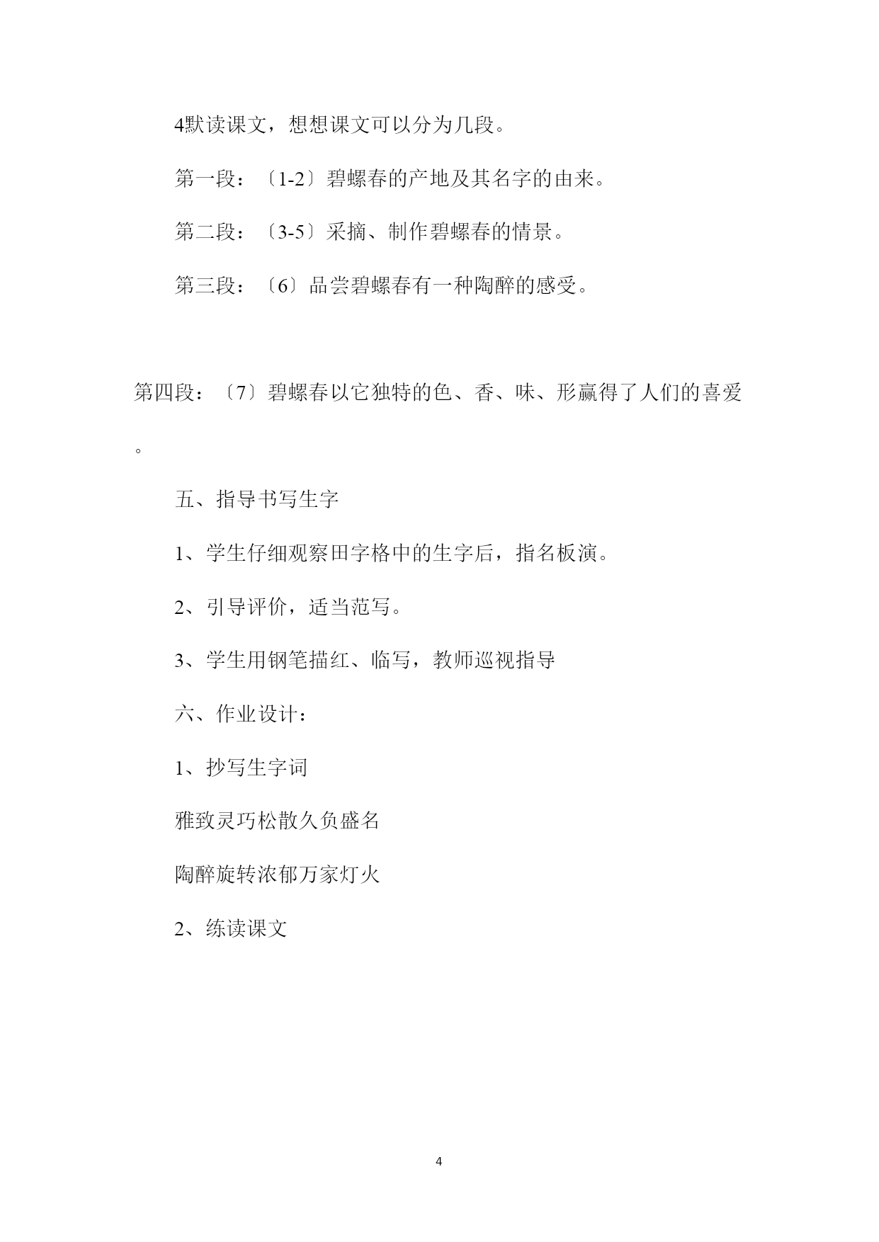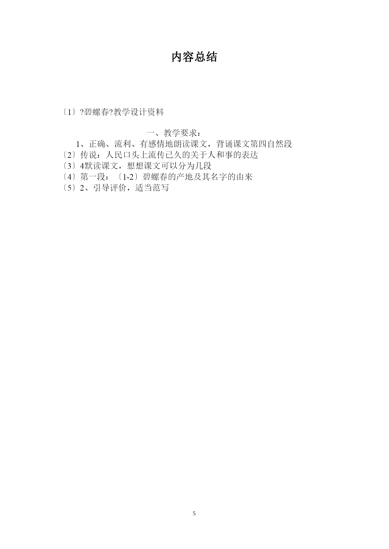 PAGEPAGE5?碧螺春?教学设计资料一、教学要求:1、正确、流利、有感情地朗读课文,背诵课文第四自然段。2、学会5个生字,认识1个多音字。理解由生字组成的词语。能用关于、如果那么造句。3、读懂课文内容,知道课文是从哪几方面介绍碧螺春的4、凭借具体的语言材料,感受碧螺春特有的色、香、味、形,体会劳动人民的勤劳和心灵手巧二、教学重难点:读懂课文内容,知道课文是从哪几方面介绍碧螺春的。感受碧螺春特有的色、香、味、形,体会劳动人民的勤劳和心灵手巧。三、教学时间:3课时四、分课时设计:第一课时一、课时目标:1掌握本课生字新词,能流利地朗读课文。2初步了解课文从哪几方面介绍碧螺春的。二、课时重难点:读懂课文内容,掌握生字新词。三、教学用具:挂图小黑板四、教学过程:一、谈话导入同学们,你知道我们江苏太湖生产地一种名茶叫什么吗〔碧螺春〕二、范读课文〔听录音〕听课文录音,提出学习要求:为什么茶叶的名字要用上春呢课文主要写了什么内容〔全班交流〕三、自读课文〔自学要求〕1、读准字音,认清生字字形,读顺每句话2、画出不懂的词语,联系上下文或借助工具书了解它们的意思,仍然不懂的请做上记号四、检查自学效果1、指名读课文,帮助纠正字音和读得不通顺的地方引导学生把课文读正确。2、了解词语的掌握情况,对学生不懂的词语教师作适当讲解。〔1〕字音:煞sha汛xun焙bei袄ao搓cuo捻nian撮cuo茸rong〔2〕词义:久负盛名:指很有才气。传说:人民口头上流传已久的关于人和事的表达。翠绿欲滴:绿得浓郁茂盛。万家灯火:家家都点上灯,指天黑上灯的时候,也形容城市夜晚的景象。利索:利落。回味:从回忆中体会。陶醉:很满意地沉浸在某种境界或思想活动中。3指名读课文,纠正读音。4默读课文,想想课文可以分为几段。第一段:〔1-2〕碧螺春的产地及其名字的由来。第二段:〔3-5〕采摘、制作碧螺春的情景。第三段:〔6〕品尝碧螺春有一种陶醉的感受。第四段:〔7〕碧螺春以它独特的色、香、味、形赢得了人们的喜爱。五、指导书写生字1、学生仔细观察田字格中的生字后,指名板演。2、引导评价,适当范写。3、学生用钢笔描红、临写,教师巡视指导六、作业设计:1、抄写生字词雅致灵巧松散久负盛名陶醉旋转浓郁万家灯火2、练读课文内容总结〔1〕?碧螺春?教学设计资料一、教学要求:1、正确、流利、有感情地朗读课文,背诵课文第四自然段〔2〕传说:人民口头上流传已久的关于人和事的表达〔3〕4默读课文,想想课文可以分为几段〔4〕第一段:〔1-2〕碧螺春的产地及其名字的由来〔5〕2、引导评价,适当范写