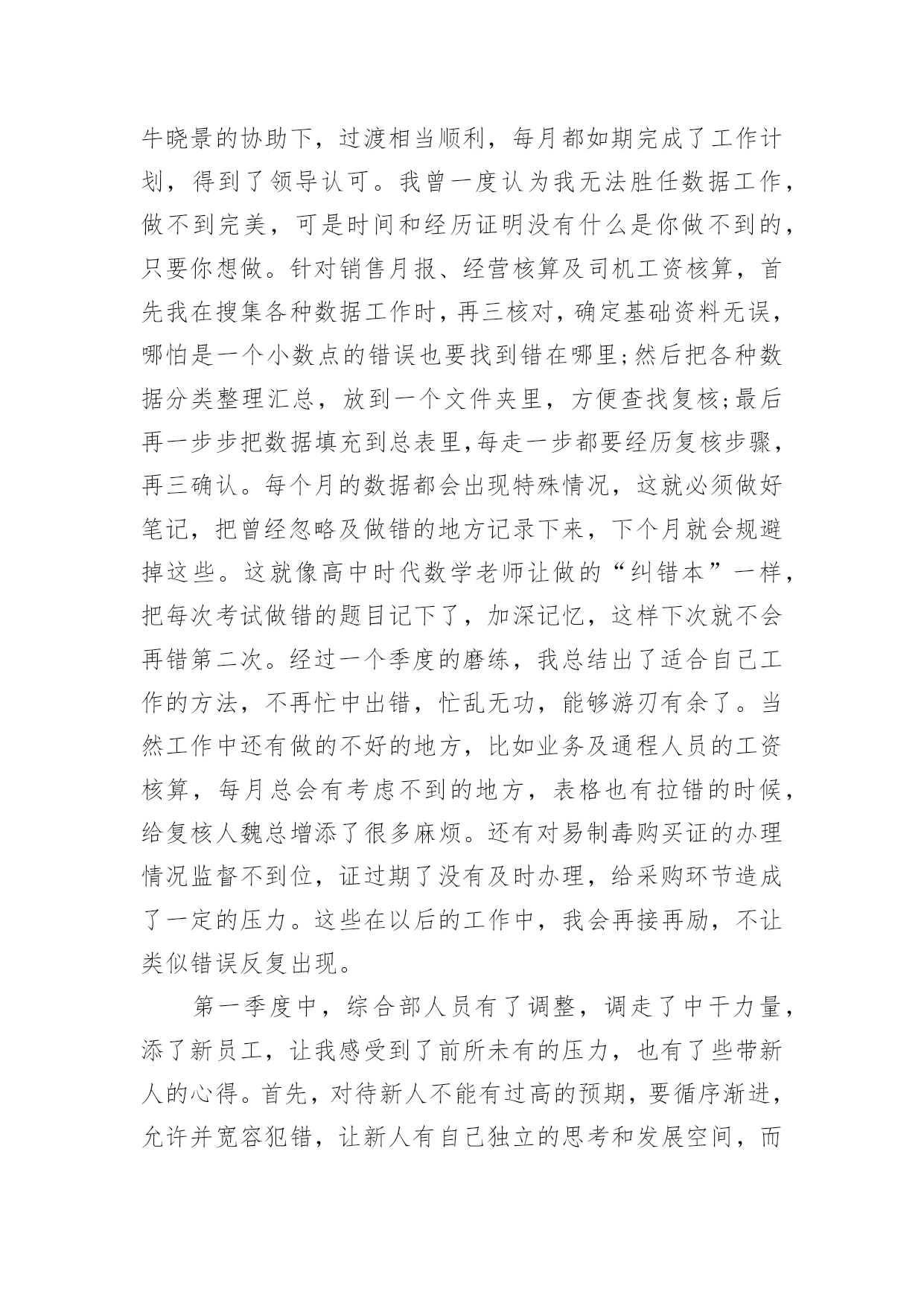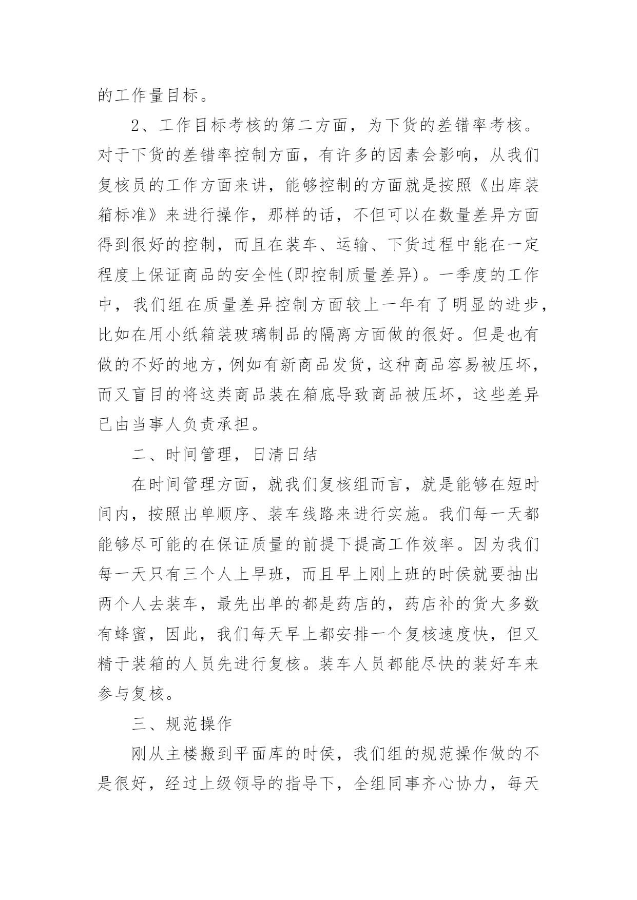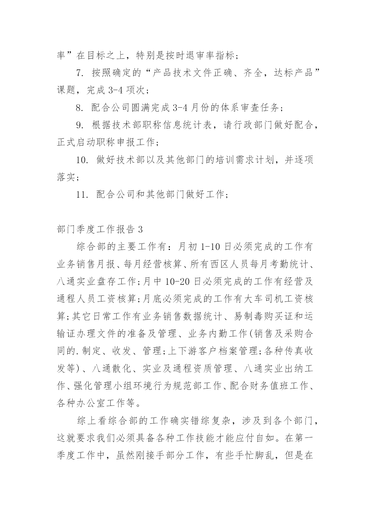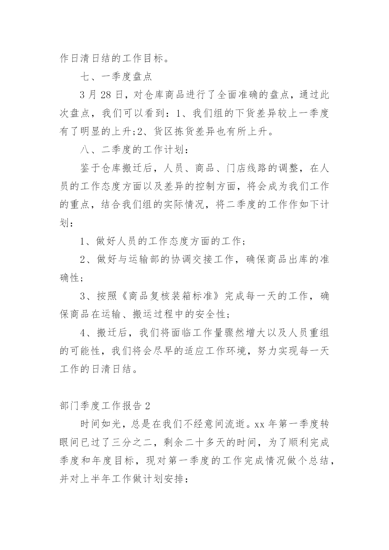 部门季度工作报告随着个人的文明素养不断提升,我们使用报告的情况越来越多,报告具有双向沟通性的特点。那么一般报告是怎么写的呢?以下是小编为大家收集的部门季度工作报告,希望对大家有所帮助。部门季度工作报告1一季度的工作,随着时间的推移,已经接近尾声。这三个月的时间里,我们组的工作总体而言有进步的方面,也有很多做得不好的地方。在这一个季度的时间里,我觉得我们组和我个人都学到了更多的知识。四月份即将来临,我们所要面对的是人员和商品不同程度的变动,还有每天复核工作线路的变动,这些表明了一个问题:我们将一切从“零”开始,重新学习新的工作流程和适应新的工作环境。我们全组人员都已经做好了准备,为下一季度的工作做了规划。现结合下一季度的工作计划,将一季度的工作总结如下:一、目标管理、沟通协调1、对于我们组的工作量考核方面,我们全组的工作考核为8XX品项/月,个人目标为24000品项,每个人每一天要完成的目标为924品项,按照正常的工作量而言,基本上每个人都能完成。只是有时工作很小的情况下,晚班不能完成,在这种情况下,我们组的同事在晚班各项工作完成后,去其他工作尚未结束的班组去帮忙,同时也是努力完成当天的工作量目标。2、工作目标考核的第二方面,为下货的差错率考核。对于下货的差错率控制方面,有许多的因素会影响,从我们复核员的工作方面来讲,能够控制的方面就是按照《出库装箱标准》来进行操作,那样的话,不但可以在数量差异方面得到很好的控制,而且在装车、运输、下货过程中能在一定程度上保证商品的安全性(即控制质量差异)。一季度的工作中,我们组在质量差异控制方面较上一年有了明显的进步,比如在用小纸箱装玻璃制品的隔离方面做的很好。但是也有做的不好的地方,例如有新商品发货,这种商品容易被压坏,而又盲目的将这类商品装在箱底导致商品被压坏,这些差异已由当事人负责承担。二、时间管理,日清日结在时间管理方面,就我们复核组而言,就是能够在短时间内,按照出单顺序、装车线路来进行实施。我们每一天都能够尽可能的在保证质量的前提下提高工作效率。因为我们每一天只有三个人上早班,而且早上刚上班的时侯就要抽出两个人去装车,最先出单的都是药店的,药店补的货大多数有蜂蜜,因此,我们每天早上都安排一个复核速度快,但又精于装箱的人员先进行复核。装车人员都能尽快的装好车来参与复核。三、规范操作刚从主楼搬到平面库的时侯,我们组的规范操作做的不是很好,经过上级领导的指导下,全组同事齐心协力,每天多做一点,多想一点,把我们的规范操作纳入日常工作来进行,现在已经成了一种习惯。大家都会观注每个人复核区域内的规范,比如卫生,整洁之类的。在各种表格填写方面,我们也做了不少的工作,每天下班前都会提醒大家把相关的表格填写完成后,做好下班前的交接工作。四、人员管理在人员管理方面,我认为一月份做的是比较好的,从我自己开始,每个人对每天的工作都满怀热情,每天都能够做到任劳任怨,高效完成。在一季度的工作中,我感受比较深,对于员工而言,他们都时时在看着自己,我做为一名领导,应该起到带头模范作用,这种带头作用不是用在满腹报怨,更多的是充满信心。当然,人都会有烦躁的时侯,有时侯,我也感觉到很烦,为什么我做了大量的工作,但是我们组的业绩总是上不去。不过,这些都是我要去面对的,就如同领导所说的,我们要做就做最好,不做就直接不做。在三月分的工作中,我们组出现了一人未到岗的情况,据了解,是由于未安排好生活与工作的时间、关系造成的,也是一种工作态度不端正的具体表现。这些与我个人的工作不到位是分不开的。下个月我们面临着人员、商品的重新组合,便利店改成日配的情况下,相信工作量会骤然增大。我将全身心投入工作,做好每一位员工的工作,端正工作态度,以实现全组人员同心协力,共同完成每一天工作的目标。五、互帮互学,共同完成在一季度的工作中,我们组总体效率还是高的,有时侯,工作量小时,我们会在下班前提前完成工作,这种情况下,领导会组织我们组到别的班组帮忙,在这个过程中,我们可以学到别的班组的规范操作和各种管理流程等。可以提高整个部门的工作效率,又可以让大家互相了解我们各班组的工作情况。周六的时间,我们会努力完成复核工作,有时间的话,可以帮助货区进行周末盘点和收货上架,他们也会帮我们准备复核时使用的各种小纸箱。六、学习与培训1月31日,公司组织了配送中心全体员工到总部学习公司企业文化。蓝总主要为(20xx国土资源局半年工作总结)我们进解了人生观,价值观以及细节决定成败。通过学习,我们对健之佳的未来更加充满信心,坚定工作信念,更加注重规范操作,以实现做好细节工作的目标。2月14日,参加了由公司张总主持的《行政管理》方面的讲解,通过此次培训,使我感受很深,将这些理论来对照我们现在的工作,觉得自己的业务水平还是很低,对于管理的方方面面觉得还做得不好。在今后的