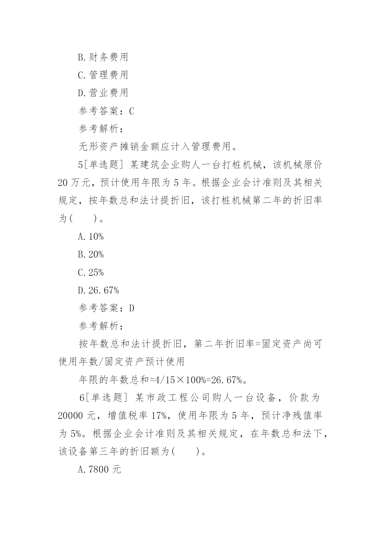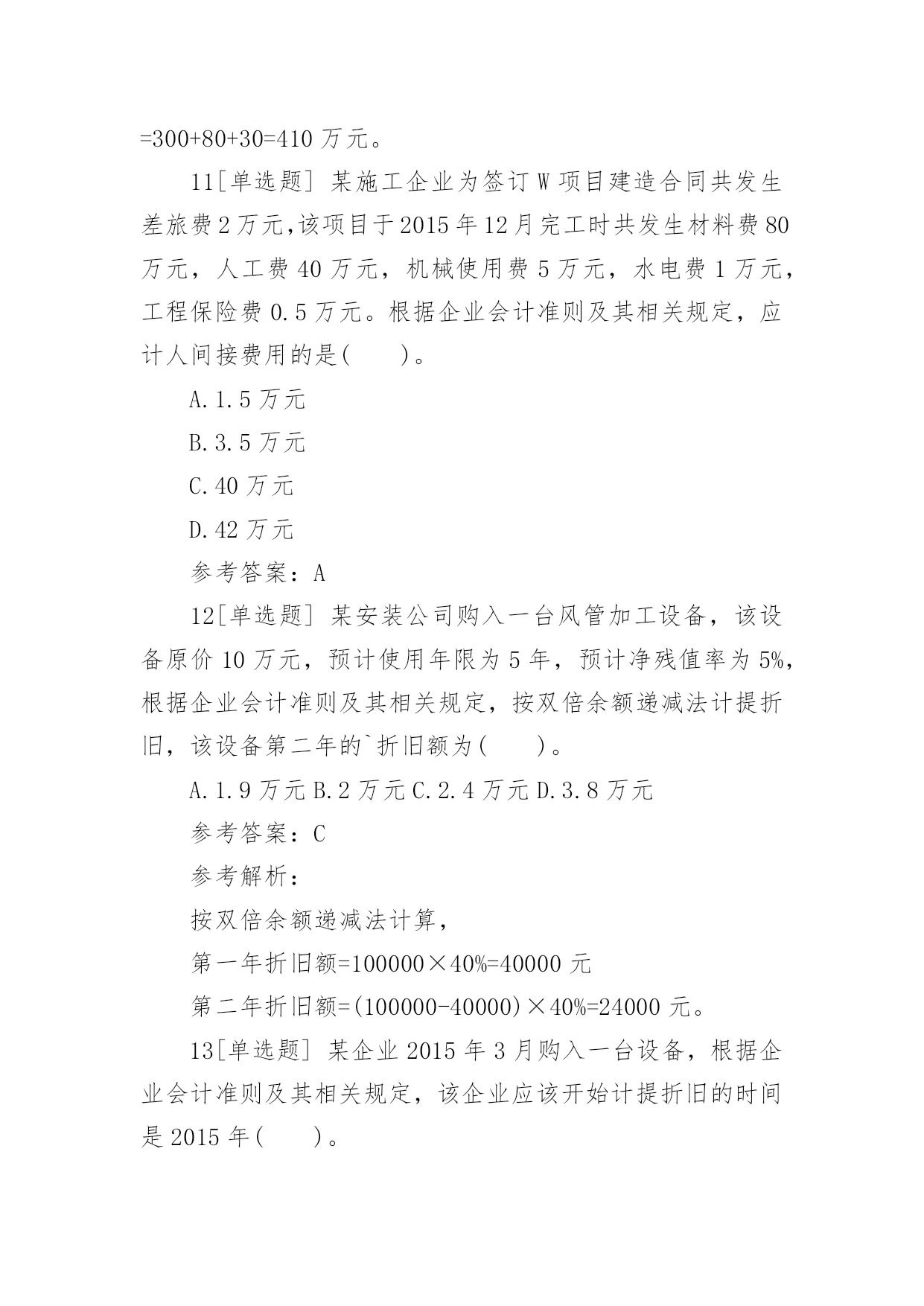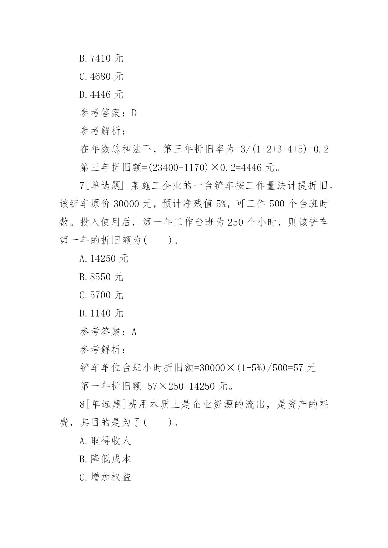 一建《工程经济》章节习题:成本与费用2017一建《工程经济》章节习题:成本与费用成本费用泛指企业在生产经营中所发生的各种资金耗费。成本费用可以综合反映企业工作质量,是推动企业提高经营管理水平的重要杠杆。下面给大家整理了2017一建《工程经济》章节习题:成本与费用,希望对大家有所帮助!2017一建《工程经济》章节习题:成本与费用1[单选题]某企业自行建造办公用房交付使用后,根据企业会计准则及相关规定,该项建造办公用房业务将导致该企业()。A.固定资产增加B.长期投资增加C.在建工程增加D.施工产品增加参考答案:A参考解析:已完工交付使用的自行建造的办公楼会导致固定资产增加。2[单选题]某建筑企业购人一台塔吊,购置成本为12万元,该塔吊使用年限为10年,净残值率为5%。根据企业会计准则及相关规定,按直线法计提折旧时,该塔吊第三年计提的折旧额为()。A.6250元B.11400元C.12400元D.22800元参考答案:B参考解析:按直线法计提折旧额,第三年折旧额=120000×9.5%=11400元。3[单选题]某企业购入一项固定资产,预计使用年限为10年,预计净残值率为8%,根据企业会计准则及其相关规定,按平均年限法计提折旧,该固定资产第二年的折旧率是()。A.9.2%B.10%C.17.2%D.18%参考答案:A参考解析:按平均年限法计提折旧,第二年折旧率=(1-净残值率)/使用年限=(1-8%)/10×100%=9.2%。4[单选题]某企业购买一项商标权,支付价款100万元。根据会计准则及其相关规定,该商标权摊销金额应计入企业的()。A.制造费用B.财务费用C.管理费用D.营业费用参考答案:C参考解析:无形资产摊销金额应计入管理费用。5[单选题]某建筑企业购人一台打桩机械,该机械原价20万元,预计使用年限为5年。根据企业会计准则及其相关规定,按年数总和法计提折旧,该打桩机械第二年的折旧率为()。A.10%B.20%C.25%D.26.67%参考答案:D参考解析:按年数总和法计提折旧,第二年折旧率=固定资产尚可使用年数/固定资产预计使用年限的年数总和=4/15×100%=26.67%。6[单选题]某市政工程公司购人一台设备,价款为20000元,增值税率17%,使用年限为5年,预计净残值率为5%。根据企业会计准则及其相关规定,在年数总和法下,该设备第三年的折旧额为()。A.7800元B.7410元C.4680元D.4446元参考答案:D参考解析:在年数总和法下,第三年折旧率为=3/(1+2+3+4+5)=0.2第三年折旧额=(23400-1170)×0.2=4446元。7[单选题]某施工企业的一台铲车按工作量法计提折旧。该铲车原价30000元,预计净残值5%,可工作500个台班时数。投入使用后,第一年工作台班为250个小时,则该铲车第一年的折旧额为()。A.14250元B.8550元C.5700元D.1140元参考答案:A参考解析:铲车单位台班小时折旧额=30000×(1-5%)/500=57元第一年折旧额=57×250=14250元。8[单选题]费用本质上是企业资源的流出,是资产的耗费,其目的是为了()。A.取得收人B.降低成本C.增加权益D.减少负债参考答案:A9[单选题]某企业购人一台设备,买价10万元,增值税率17%,运输费用2000元,安装费用1000元。根据企业会计准则及相关规定,该设备的购人成本为()。A.100000元B.117000元C.120000元D.13000元参考答案:C参考解析:购入成本=价款+增值税款+运输费用+安装费用=100000×(1+17%)+2000+1000=120000元。10[单选题]2015年9月,某企业自行建造一处办公设施,其中材料费300万元,人工费80万元,用于建造办公设施的借款利息为30万元。根据企业会计准则及相关规定,该办公设施的实际成本是()。A.300万元B.330万元C.380万元D.410万元参考答案:D参考解析:办公楼实际成本=材料费+人工费+借款利息=300+80+30=410万元。11[单选题]某施工企业为签订W项目建造合同共发生差旅费2万元,该项目于2015年12月完工时共发生材料费80万元,人工费40万元,机械使用费5万元,水电费1万元,工程保险费0.5万元。根据企业会计准则及其相关规定,应计人间接费用的是()。A.1.5万元B.3.5万元C.40万元D.42万元参考答案:A12[单选题]某安装公司购入一台风管加工设备,该设备原价10万元,预计使用年限为5年,预计净残值率为5%,根据企业会计准则及其相关规定,按双倍余额递减法计提折旧,该设备第二年的`折旧额为()。A.1.9万元B.2万元C.2.4万元D.3.8万元参考答案:C参考解析:按双倍余额递减