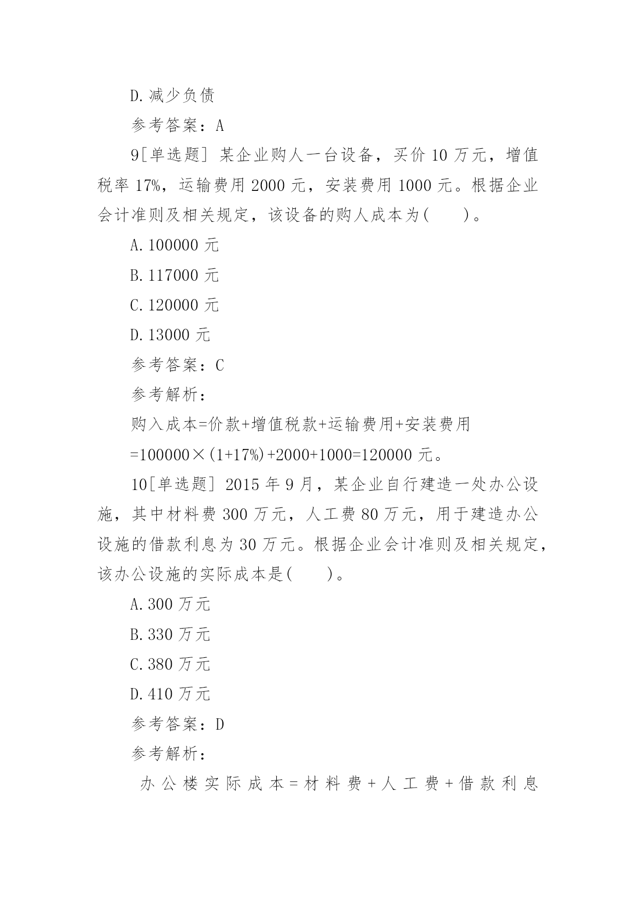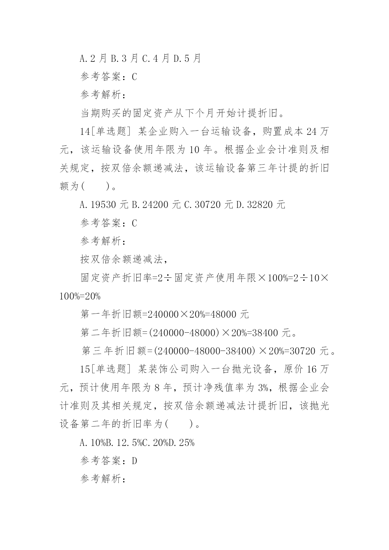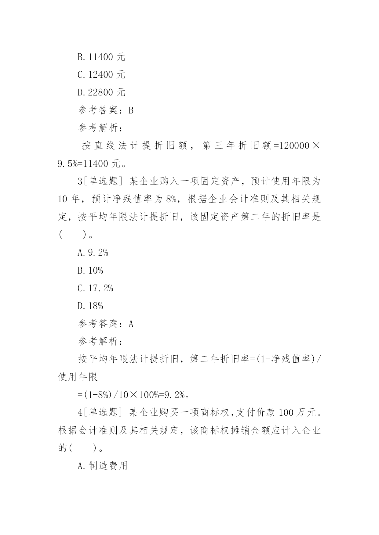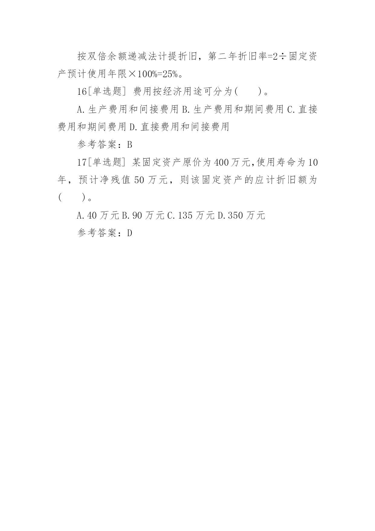 一建《工程经济》章节习题:成本与费用2017一建《工程经济》章节习题:成本与费用成本费用泛指企业在生产经营中所发生的各种资金耗费。成本费用可以综合反映企业工作质量,是推动企业提高经营管理水平的重要杠杆。下面给大家整理了2017一建《工程经济》章节习题:成本与费用,希望对大家有所帮助!2017一建《工程经济》章节习题:成本与费用1[单选题]某企业自行建造办公用房交付使用后,根据企业会计准则及相关规定,该项建造办公用房业务将导致该企业()。A.固定资产增加B.长期投资增加C.在建工程增加D.施工产品增加参考答案:A参考解析:已完工交付使用的自行建造的办公楼会导致固定资产增加。2[单选题]某建筑企业购人一台塔吊,购置成本为12万元,该塔吊使用年限为10年,净残值率为5%。根据企业会计准则及相关规定,按直线法计提折旧时,该塔吊第三年计提的折旧额为()。A.6250元B.11400元C.12400元D.22800元参考答案:B参考解析:按直线法计提折旧额,第三年折旧额=120000×9.5%=11400元。3[单选题]某企业购入一项固定资产,预计使用年限为10年,预计净残值率为8%,根据企业会计准则及其相关规定,按平均年限法计提折旧,该固定资产第二年的折旧率是()。A.9.2%B.10%C.17.2%D.18%参考答案:A参考解析:按平均年限法计提折旧,第二年折旧率=(1-净残值率)/使用年限=(1-8%)/10×100%=9.2%。4[单选题]某企业购买一项商标权,支付价款100万元。根据会计准则及其相关规定,该商标权摊销金额应计入企业的()。A.制造费用B.财务费用C.管理费用D.营业费用参考答案:C参考解析:无形资产摊销金额应计入管理费用。5[单选题]某建筑企业购人一台打桩机械,该机械原价20万元,预计使用年限为5年。根据企业会计准则及其相关规定,按年数总和法计提折旧,该打桩机械第二年的折旧率为()。A.10%B.20%C.25%D.26.67%参考答案:D参考解析:按年数总和法计提折旧,第二年折旧率=固定资产尚可使用年数/固定资产预计使用年限的年数总和=4/15×100%=26.67%。6[单选题]某市政工程公司购人一台设备,价款为20000元,增值税率17%,使用年限为5年,预计净残值率为5%。根据企业会计准则及其相关规定,在年数总和法下,该设备第三年的折旧额为()。A.7800元B.7410元C.4680元D.4446元参考答案:D参考解析:在年数总和法下,第三年折旧率为=3/(1+2+3+4+5)=0.2第三年折旧额=(23400-1170)×0.2=4446元。7[单选题]某施工企业的一台铲车按工作量法计提折旧。该铲车原价30000元,预计净残值5%,可工作500个台班时数。投入使用后,第一年工作台班为250个小时,则该铲车第一年的折旧额为()。A.14250元B.8550元C.5700元D.1140元参考答案:A参考解析:铲车单位台班小时折旧额=30000×(1-5%)/500=57元第一年折旧额=57×250=14250元。8[单选题]费用本质上是企业资源的流出,是资产的耗费,其目的是为了()。A.取得收人B.降低成本C.增加权益D.减少负债参考答案:A9[单选题]某企业购人一台设备,买价10万元,增值税率17%,运输费用2000元,安装费用1000元。根据企业会计准则及相关规定,该设备的购人成本为()。A.100000元B.117000元C.120000元D.13000元参考答案:C参考解析:购入成本=价款+增值税款+运输费用+安装费用=100000×(1+17%)+2000+1000=120000元。10[单选题]2015年9月,某企业自行建造一处办公设施,其中材料费300万元,人工费80万元,用于建造办公设施的借款利息为30万元。根据企业会计准则及相关规定,该办公设施的实际成本是()。A.300万元B.330万元C.380万元D.410万元参考答案:D参考解析:办公楼实际成本=材料费+人工费+借款利息=300+80+30=410万元。11[单选题]某施工企业为签订W项目建造合同共发生差旅费2万元,该项目于2015年12月完工时共发生材料费80万元,人工费40万元,机械使用费5万元,水电费1万元,工程保险费0.5万元。根据企业会计准则及其相关规定,应计人间接费用的是()。A.1.5万元B.3.5万元C.40万元D.42万元参考答案:A12[单选题]某安装公司购入一台风管加工设备,该设备原价10万元,预计使用年限为5年,预计净残值率为5%,根据企业会计准则及其相关规定,按双倍余额递减法计提折旧,该设备第二年的`折旧额为()。A.1.9万元B.2万元C.2.4万元D.3.8万元参考答案:C参考解析:按双倍余额递减