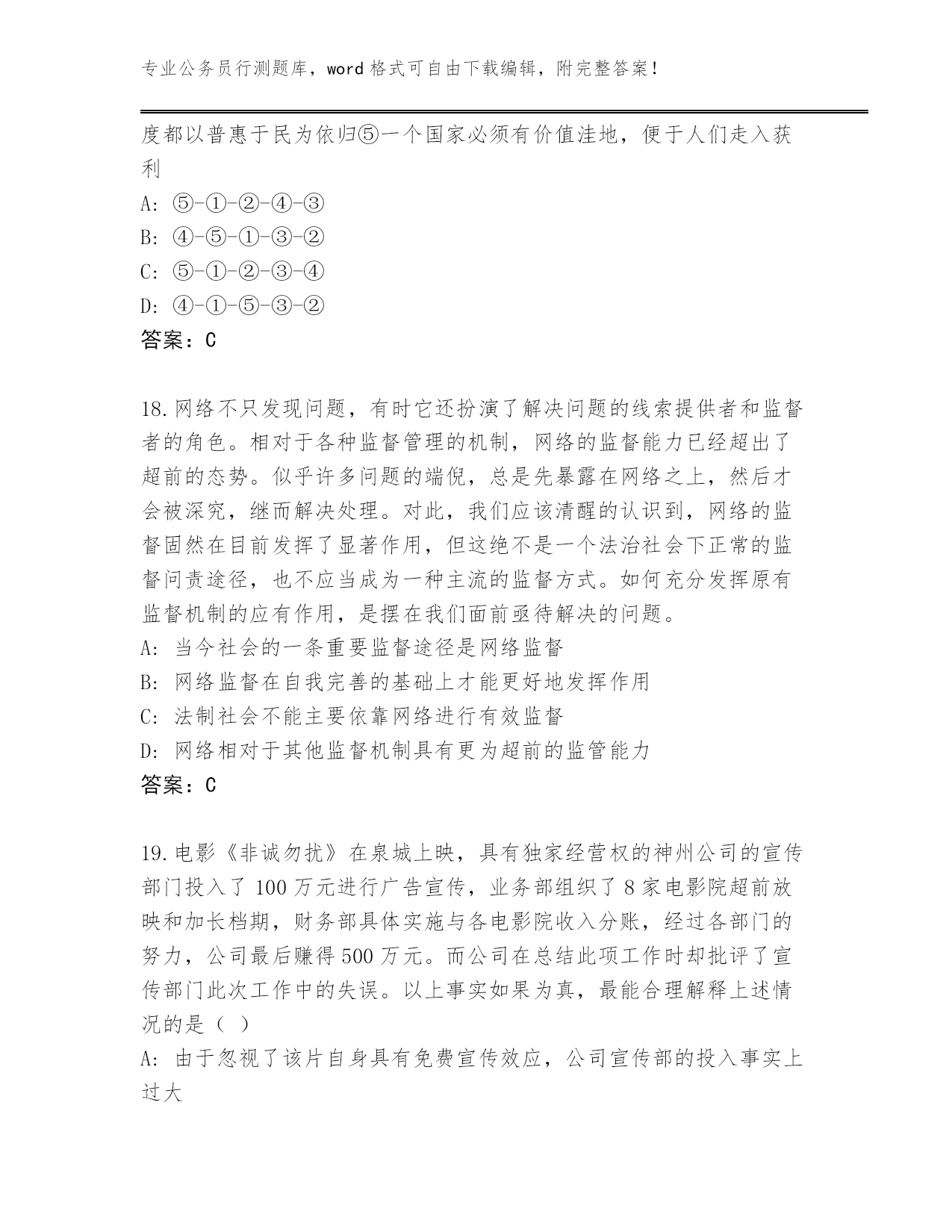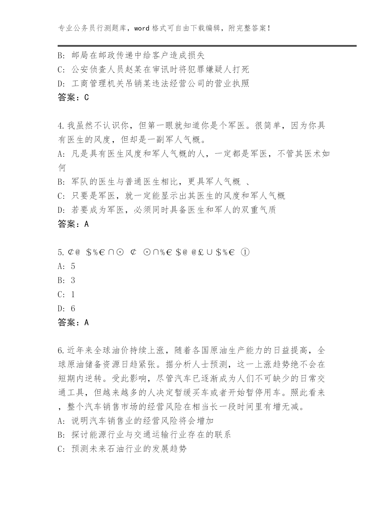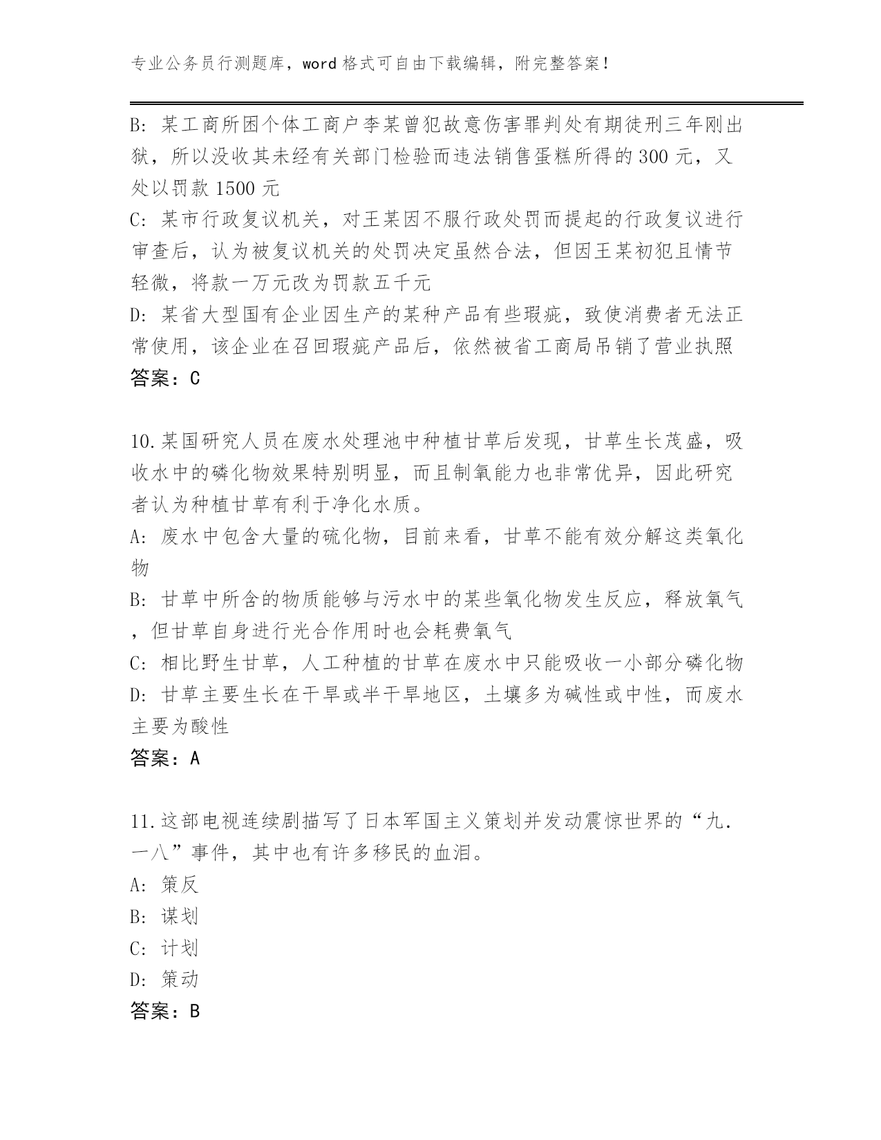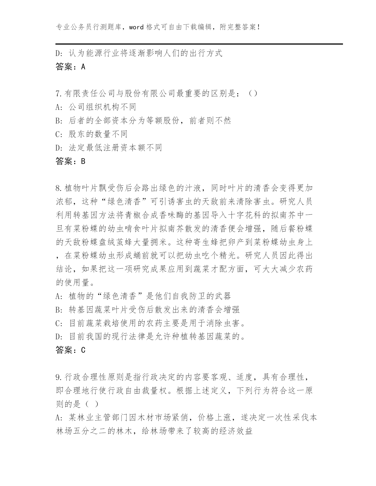 专业公务员行测题库,word格式可自由下载编辑,附完整答案!河北省冀州区2023-2024年公务员行测真题题库及答案【历年真题】第I部分单选题(100题)1.关于物质组成及其变化,下列说法正确的是:A:汽油挥发和形成水垢均是化学变化B:构成物质的三种微粒是分子、原子和电子C:地壳中含量最多的非金属元素是氮D:组成化合物种类最多的元素是碳答案:D2.下列选项中,没有语病的是()。A:意志坚强的人们绝不会因为暂时的挫折影响了他对获得最后胜利的信心B:《礼记》是从先秦至西汉关于《仪礼》解说、发挥的文字汇集,是我国秦汉以前的社会生活史和生活习俗、礼仪制度、人生经验C:我们知道.魏晋人在思想上崇尚放任、崇尚自由,因此其文学、艺术、哲学皆能彰显个性。然而在政治上.魏晋时期则为典型的衰世D:汉末之王充思想-是批评阴阳五行、天人感应及是古非今思想的代表人物答案:C3.国家赔偿:是指国家及其工作人员违法行使职权,侵犯公民、法人和其他组织的合法权益并造成损害的,由法律规定的赔偿义务机关对受害人予以赔偿的制度。据此定义,以下哪种情形,国家应承担赔偿责任?()A:银行工作人员利用职务之便挪用储户资金B:邮局在邮政传递中给客户造成损失C:公安侦查人员赵某在审讯时将犯罪嫌疑人打死D:工商管理机关吊销某违法经营公司的营业执照答案:C4.我虽然不认识你,但第一眼就知道你是个军医。很简单,因为你具有医生的风度,但却是一副军人气概。A:凡是具有医生风度和军人气概的人,一定都是军医,不管其医术如何B:军队的医生与普通医生相比,更具军人气概、C:只要是军医,就一定能显示出其医生的风度和军人气概D:若要成为军医,必须同时具备医生和军人的双重气质答案:A5.¢@$%€∩⊙¢⊙∩%€$@@£∪$%€①A:5B:3C:1D:6答案:A6.近年来全球油价持续上涨,随着各国原油生产能力的日益提高,全球原油储备资源日趋紧张。据分析人士预测,这一上涨趋势绝不会在短期内逆转。受此影响,尽管汽车已逐渐成为人们不可缺少的日常交通工具,但越来越多的人决定暂缓买车或者开始暂停用车。照此看来,整个汽车销售市场的经营风险在相当长一段时间里有增无减。A:说明汽车销售业的经营风险将会增加B:探讨能源行业与交通运输行业存在的联系C:预测未来石油行业的发展趋势D:认为能源行业将逐渐影响人们的出行方式答案:A7.有限责任公司与股份有限公司最重要的区别是:()A:公司组织机构不同B:后者的全部资本分为等额股份,前者则不然C:股东的数量不同D:法定最低注册资本额不同答案:B8.植物叶片飘受伤后会路出绿色的汁液,同时叶片的清香会变得更加浓郁,这种“绿色清香”可引诱害虫的天敌前来清除害虫。研究人员利用转基因方法将青椒合成香味酶的基因导入十字花科的拟南芥中一旦有菜粉蝶的幼虫啃食叶片拟南芥散发的清香便会增强,随后餐粉蝶的天敌粉蝶盘绒茧蜂大量拥米。这种寄生蜂把卵产到菜粉蝶幼虫身上,在菜粉蝶幼虫形成蛹前就可以把幼虫吃个精光。研究人员因此得出结论,如果把这一项研究成果应用到蔬菜才配方面,可大大减少农药的使用量。A:植物的“绿色清香”是他们自我防卫的武器B:转基因蔬菜叶片受伤后散发出来的清香会增强C:目前蔬菜栽培使用的农药主要是用于消除虫害。D:目前我国的现行法律是允许种植转基因蔬菜的。答案:C9.行政合理性原则是指行政决定的内容要客观、适度,具有合理性,即合理地行使行政自由裁量权。根据上述定义,下列行为符合这一原则的是()A:某林业主管部门因木材市场紧俏,价格上涨,遂决定一次性采伐本林场五分之二的林木,给林场带来了较高的经济效益B:某工商所困个体工商户李某曾犯故意伤害罪判处有期徒刑三年刚出狱,所以没收其未经有关部门检验而违法销售蛋糕所得的300元,又处以罚款1500元C:某市行政复议机关,对王某因不服行政处罚而提起的行政复议进行审查后,认为被复议机关的处罚决定虽然合法,但因王某初犯且情节轻微,将款一万元改为罚款五千元D:某省大型国有企业因生产的某种产品有些瑕疵,致使消费者无法正常使用,该企业在召回瑕疵产品后,依然被省工商局吊销了营业执照答案:C10.某国研究人员在废水处理池中种植甘草后发现,甘草生长茂盛,吸收水中的磷化物效果特别明显,而且制氧能力也非常优异,因此研究者认为种植甘草有利于净化水质。A:废水中包含大量的硫化物,目前来看,甘草不能有效分解这类氧化物B:甘草中所含的物质能够与污水中的某些氧化物发生反应,释放氧气,但甘草自身进行光合作用时也会耗费氧气C:相比野生甘草,人工种植的甘草在废水中只能吸收一小部分磷化物D:甘草主要生长在干旱或半干旱地区,土壤多为碱性或中性,而