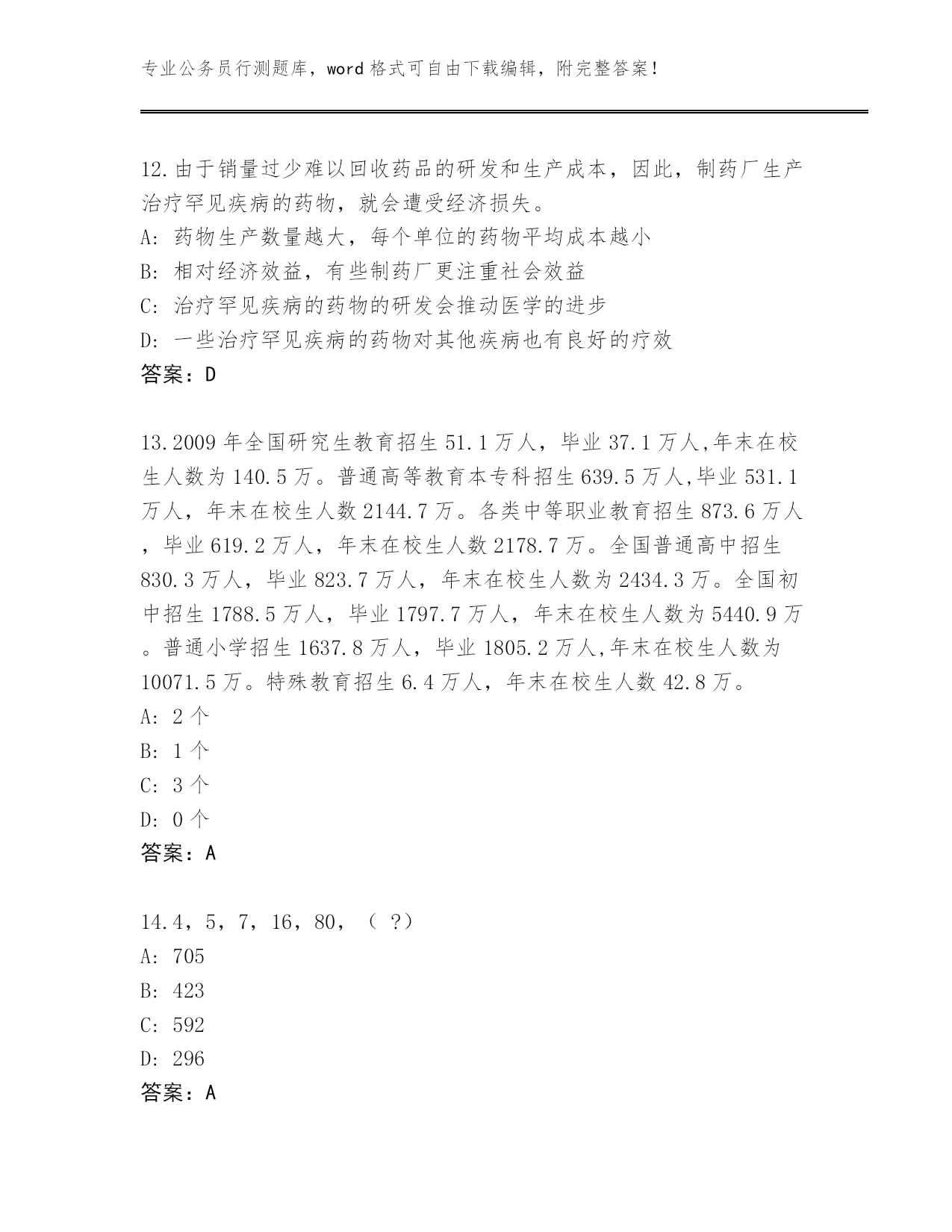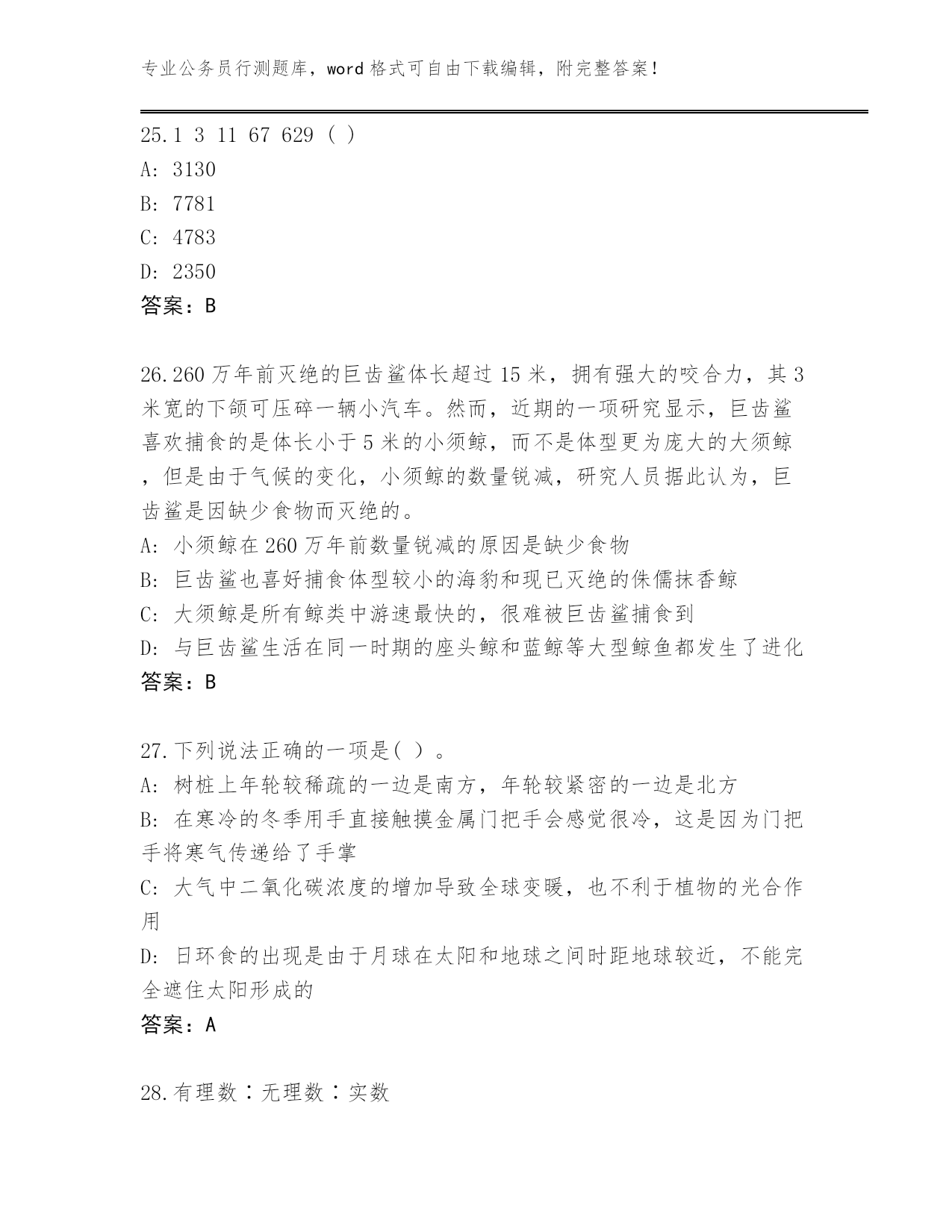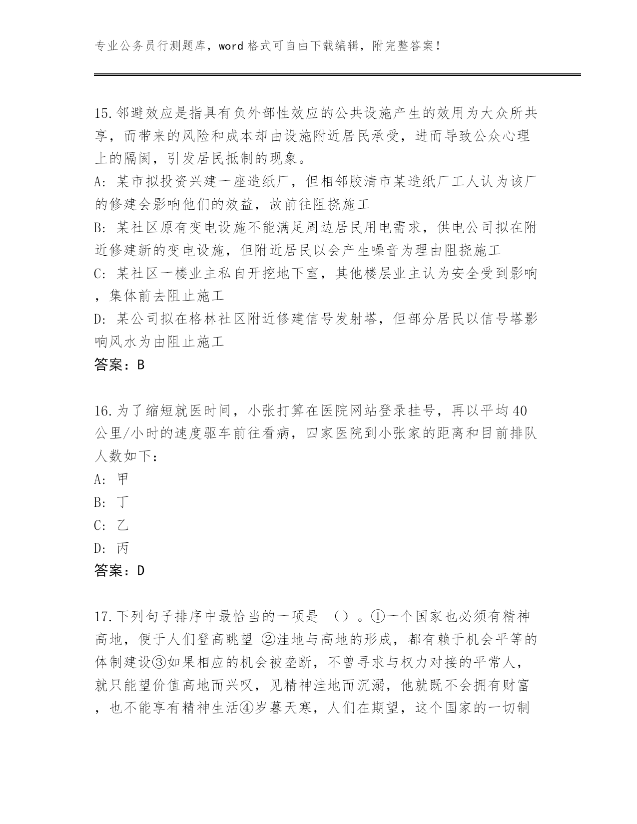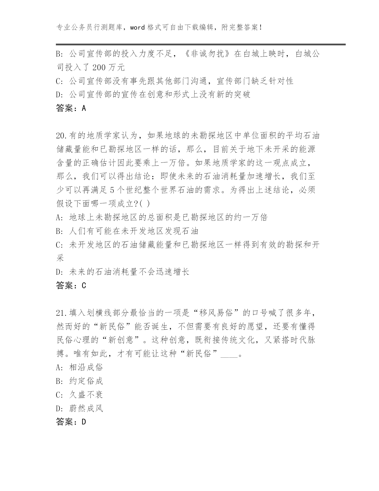 专业公务员行测题库,word格式可自由下载编辑,附完整答案!河北省冀州区2023-2024年公务员行测真题题库及答案【历年真题】第I部分单选题(100题)1.关于物质组成及其变化,下列说法正确的是:A:汽油挥发和形成水垢均是化学变化B:构成物质的三种微粒是分子、原子和电子C:地壳中含量最多的非金属元素是氮D:组成化合物种类最多的元素是碳答案:D2.下列选项中,没有语病的是()。A:意志坚强的人们绝不会因为暂时的挫折影响了他对获得最后胜利的信心B:《礼记》是从先秦至西汉关于《仪礼》解说、发挥的文字汇集,是我国秦汉以前的社会生活史和生活习俗、礼仪制度、人生经验C:我们知道.魏晋人在思想上崇尚放任、崇尚自由,因此其文学、艺术、哲学皆能彰显个性。然而在政治上.魏晋时期则为典型的衰世D:汉末之王充思想-是批评阴阳五行、天人感应及是古非今思想的代表人物答案:C3.国家赔偿:是指国家及其工作人员违法行使职权,侵犯公民、法人和其他组织的合法权益并造成损害的,由法律规定的赔偿义务机关对受害人予以赔偿的制度。据此定义,以下哪种情形,国家应承担赔偿责任?()A:银行工作人员利用职务之便挪用储户资金B:邮局在邮政传递中给客户造成损失C:公安侦查人员赵某在审讯时将犯罪嫌疑人打死D:工商管理机关吊销某违法经营公司的营业执照答案:C4.我虽然不认识你,但第一眼就知道你是个军医。很简单,因为你具有医生的风度,但却是一副军人气概。A:凡是具有医生风度和军人气概的人,一定都是军医,不管其医术如何B:军队的医生与普通医生相比,更具军人气概、C:只要是军医,就一定能显示出其医生的风度和军人气概D:若要成为军医,必须同时具备医生和军人的双重气质答案:A5.¢@$%€∩⊙¢⊙∩%€$@@£∪$%€①A:5B:3C:1D:6答案:A6.近年来全球油价持续上涨,随着各国原油生产能力的日益提高,全球原油储备资源日趋紧张。据分析人士预测,这一上涨趋势绝不会在短期内逆转。受此影响,尽管汽车已逐渐成为人们不可缺少的日常交通工具,但越来越多的人决定暂缓买车或者开始暂停用车。照此看来,整个汽车销售市场的经营风险在相当长一段时间里有增无减。A:说明汽车销售业的经营风险将会增加B:探讨能源行业与交通运输行业存在的联系C:预测未来石油行业的发展趋势D:认为能源行业将逐渐影响人们的出行方式答案:A7.有限责任公司与股份有限公司最重要的区别是:()A:公司组织机构不同B:后者的全部资本分为等额股份,前者则不然C:股东的数量不同D:法定最低注册资本额不同答案:B8.植物叶片飘受伤后会路出绿色的汁液,同时叶片的清香会变得更加浓郁,这种“绿色清香”可引诱害虫的天敌前来清除害虫。研究人员利用转基因方法将青椒合成香味酶的基因导入十字花科的拟南芥中一旦有菜粉蝶的幼虫啃食叶片拟南芥散发的清香便会增强,随后餐粉蝶的天敌粉蝶盘绒茧蜂大量拥米。这种寄生蜂把卵产到菜粉蝶幼虫身上,在菜粉蝶幼虫形成蛹前就可以把幼虫吃个精光。研究人员因此得出结论,如果把这一项研究成果应用到蔬菜才配方面,可大大减少农药的使用量。A:植物的“绿色清香”是他们自我防卫的武器B:转基因蔬菜叶片受伤后散发出来的清香会增强C:目前蔬菜栽培使用的农药主要是用于消除虫害。D:目前我国的现行法律是允许种植转基因蔬菜的。答案:C9.行政合理性原则是指行政决定的内容要客观、适度,具有合理性,即合理地行使行政自由裁量权。根据上述定义,下列行为符合这一原则的是()A:某林业主管部门因木材市场紧俏,价格上涨,遂决定一次性采伐本林场五分之二的林木,给林场带来了较高的经济效益B:某工商所困个体工商户李某曾犯故意伤害罪判处有期徒刑三年刚出狱,所以没收其未经有关部门检验而违法销售蛋糕所得的300元,又处以罚款1500元C:某市行政复议机关,对王某因不服行政处罚而提起的行政复议进行审查后,认为被复议机关的处罚决定虽然合法,但因王某初犯且情节轻微,将款一万元改为罚款五千元D:某省大型国有企业因生产的某种产品有些瑕疵,致使消费者无法正常使用,该企业在召回瑕疵产品后,依然被省工商局吊销了营业执照答案:C10.某国研究人员在废水处理池中种植甘草后发现,甘草生长茂盛,吸收水中的磷化物效果特别明显,而且制氧能力也非常优异,因此研究者认为种植甘草有利于净化水质。A:废水中包含大量的硫化物,目前来看,甘草不能有效分解这类氧化物B:甘草中所含的物质能够与污水中的某些氧化物发生反应,释放氧气,但甘草自身进行光合作用时也会耗费氧气C:相比野生甘草,人工种植的甘草在废水中只能吸收一小部分磷化物D:甘草主要生长在干旱或半干旱地区,土壤多为碱性或中性,而