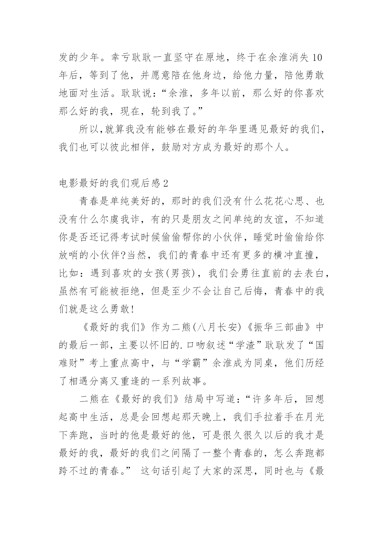 电影最好的我们观后感看完一部经典作品以后,相信大家一定领会了不少东西,不能光会看哦,写一篇观后感吧。可是观后感怎么写才合适呢?以下是小编为大家整理的电影最好的我们观后感,欢迎阅读,希望大家能够喜欢。电影最好的我们观后感1《最好的我们》这部电影是我认为所有的国产青春片中,最能真实反映我的青春的一部作品。我们的青春里,更多的是平淡无奇,有看中成绩的'老师和家长,有高考的压力,有做不完的习题,看不懂的知识点,和青春里暗恋的那个他。中考超常发挥的耿耿和失常发挥的余淮一同考进了振华中学,并阴差阳错的成为了同桌这个理科很优秀的男生会主动给耿耿讲数学题,因为耿耿上课没有听懂,主动请求老师再讲一遍。那时的余淮是最好的余淮,他张扬活力,头脑机灵;那时的耿耿是灰头土脑的耿耿,她为成绩焦虑,为前程担忧。但青春里最好的时光,他们都有彼此的陪伴,一起参加篮球赛,一起军训,一起大合唱,一起备战高考,他们分享了彼此的快乐和痛楚,他们将隐秘的爱慕埋藏在心底。是啊,我希望在我最美好的时光遇见你,但是,只要能遇见你,哪怕是我最落魄的时光,我也觉得非常开心。然而,十年后。耿耿成为了一个会发光的人,她是知名摄影师,此时的余淮为母亲的病而奔波,他已不再是意气风发的少年。幸亏耿耿一直坚守在原地,终于在余淮消失10年后,等到了他,并愿意陪在他身边,给他力量,陪他勇敢地面对生活。耿耿说:“余淮,多年以前,那么好的你喜欢那么好的我,现在,轮到我了。”所以,就算我没有能够在最好的年华里遇见最好的我们,我们也可以彼此相伴,鼓励对方成为最好的那个人。电影最好的我们观后感2青春是单纯美好的,那时的我们没有什么花花心思、也没有什么尔虞我诈,有的只是朋友之间单纯的友谊,不知道你是否还记得考试时候偷偷帮你的小伙伴,睡觉时偷偷给你放哨的小伙伴?当然,我们的青春中还有更多的横冲直撞,比如:遇到喜欢的女孩(男孩),我们会勇往直前的去表白,虽然有可能被拒绝,但是至少不会让自己后悔,青春中的我们就是这么勇敢!《最好的我们》作为二熊(八月长安)《振华三部曲》中的最后一部,主要以怀旧的.口吻叙述“学渣”耿耿发了“国难财”考上重点高中,与“学霸”余淮成为同桌,他们历经了相遇分离又重逢的一系列故事。二熊在《最好的我们》结局中写道:“许多年后,回想起高中生活,总是会回想起那天晚上,我们手拉着手在月光下奔跑,当时的他是最好的他,可是很久很久以后的我才是最好的我,最好的我们之间隔了一整个青春的,怎么奔跑都跨不过的青春。”这句话引起了大家的深思,同时也与《最好的我们》题目相得益彰。导演和编剧为了保证《最好的我们》的青春性,在演员上大部分选择90后新生代演员:男主角则是刚刚成年不久的小鲜肉刘昊然;女主角则是谭松韵,曾饰演《旋风少女》中阳光开朗、活力十足的晓莹。我们没有美如天仙的女主,我们也没有帅的惊天动地的男主角,更没有那些堕胎、车祸的青春代价,我们有的只是平凡大众的青春,更加贴近大家。