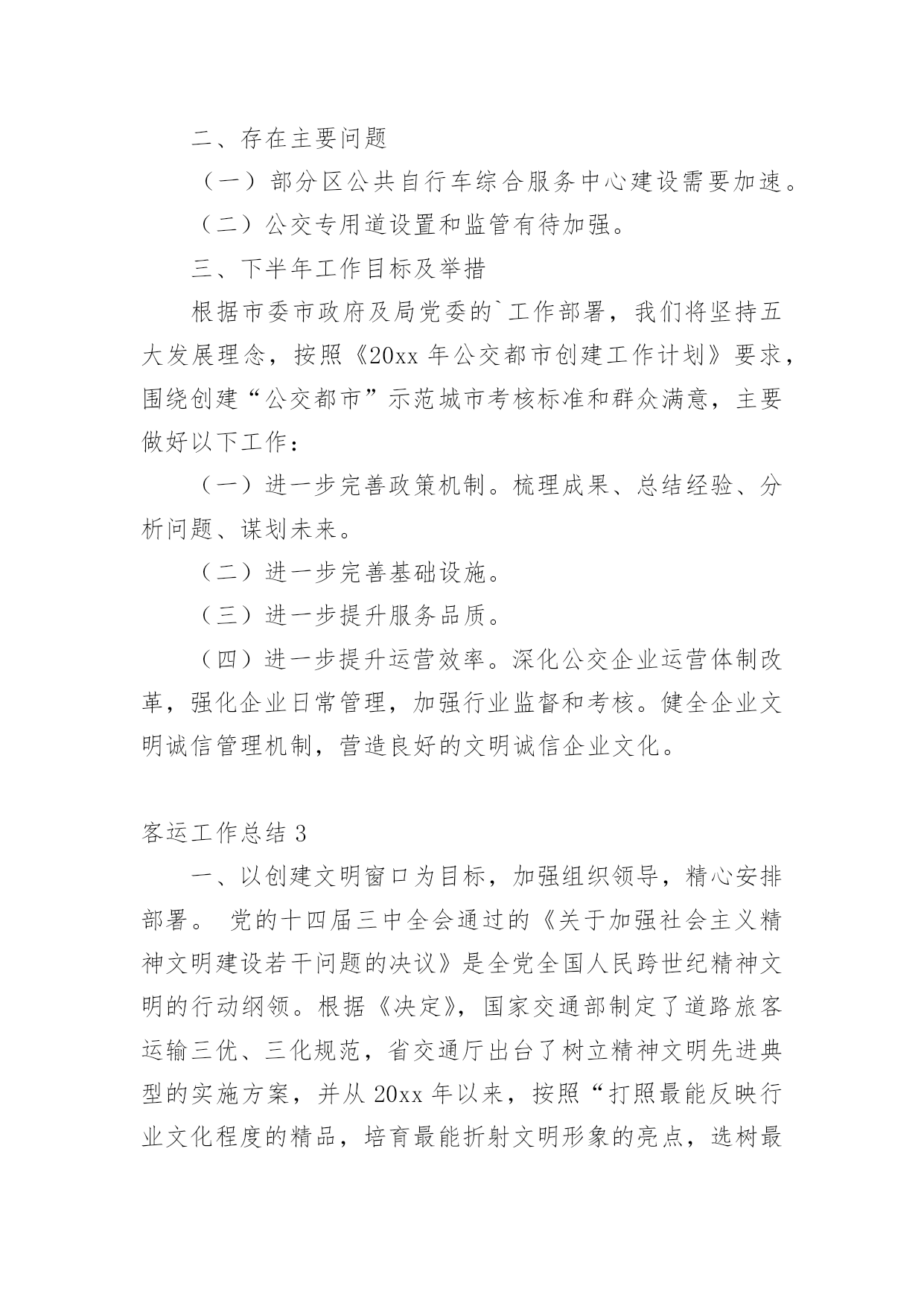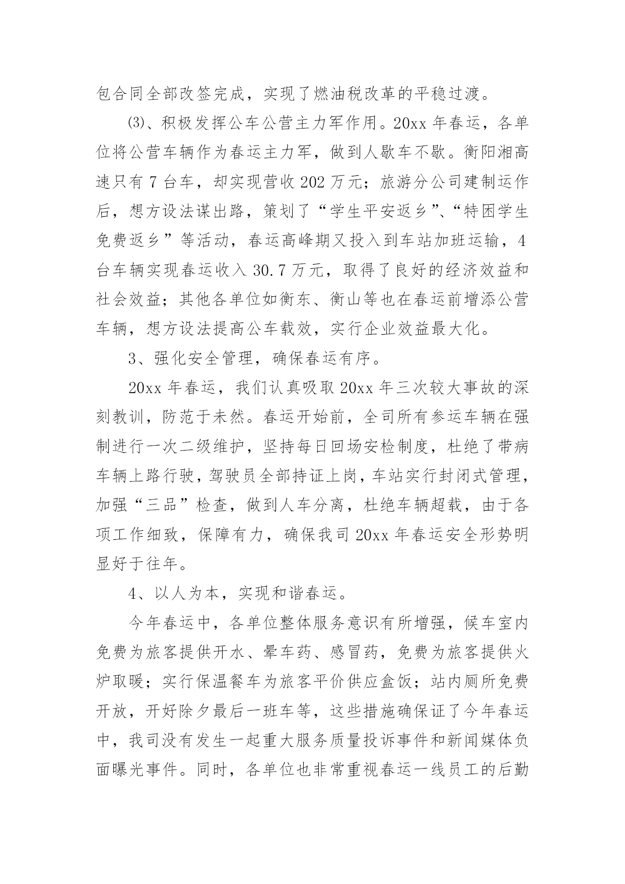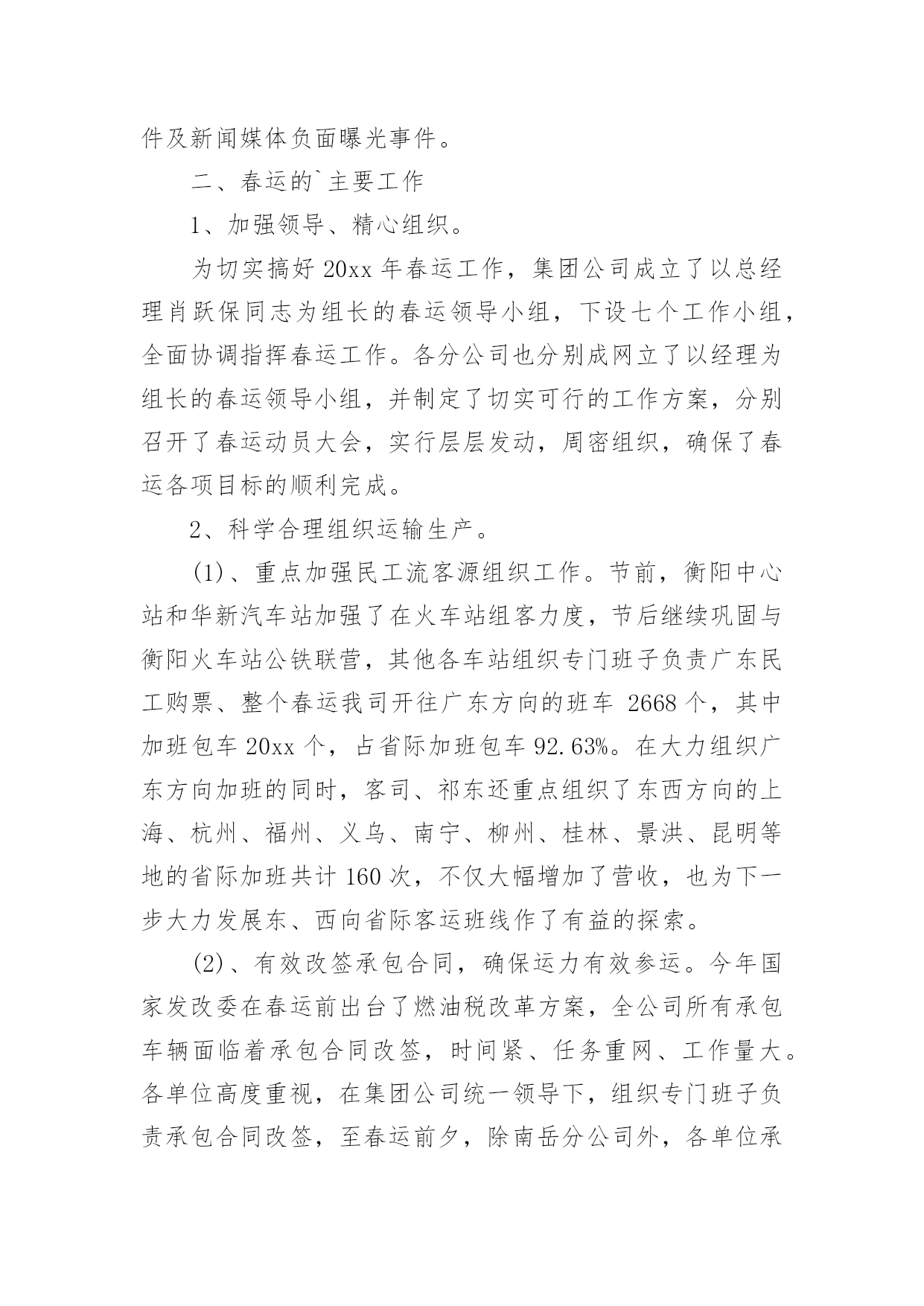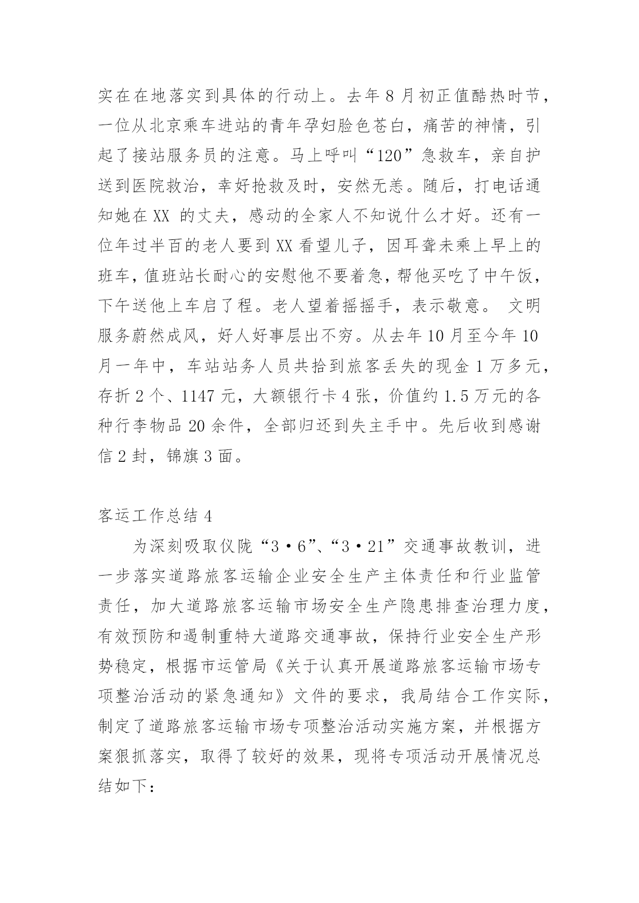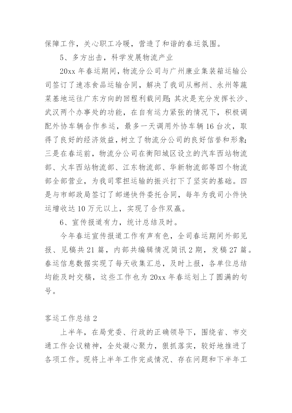 客运工作总结总结在一个时期、一个年度、一个阶段对学习和工作生活等情况加以回顾和分析的一种书面材料,它有助于我们寻找工作和事物发展的规律,从而掌握并运用这些规律,因此我们要做好归纳,写好总结。我们该怎么写总结呢?下面是小编收集整理的客运工作总结,供大家参考借鉴,希望可以帮助到有需要的朋友。客运工作总结120xx年春运工作已经顺利结束。40天春运,在市委、市政府及各级各部门的大力支持下,在车站的正确领导下,汽车站依靠全司员工的共同努力,汽车站虎年春运成绩裴然,现就20xx年春运工作总结如下:一、春运基本情况1、旅客发送情况:春运四十天,我司共投入运力1072台,总座位32222座,运送旅客360万人次,较07年(20xx年春运因冰灾而缺乏可比性)同期增加13%;共计发送客运班次91493个,与07年同期相比增加6%;2、行车安全情况:全司车辆总行程20xx.5万公里,共发生计考核的交通事故1次,事故频率为0.05次/百万车公里,死亡频率为零,全司的春运安全形势是近5年来最好的一年。3、服务质量情况:春运期间没有发生重大服务质量事件及新闻媒体负面曝光事件。二、春运的`主要工作1、加强领导、精心组织。为切实搞好20xx年春运工作,集团公司成立了以总经理肖跃保同志为组长的春运领导小组,下设七个工作小组,全面协调指挥春运工作。各分公司也分别成网立了以经理为组长的春运领导小组,并制定了切实可行的工作方案,分别召开了春运动员大会,实行层层发动,周密组织,确保了春运各项目标的顺利完成。2、科学合理组织运输生产。(1)、重点加强民工流客源组织工作。节前,衡阳中心站和华新汽车站加强了在火车站组客力度,节后继续巩固与衡阳火车站公铁联营,其他各车站组织专门班子负责广东民工购票、整个春运我司开往广东方向的班车2668个,其中加班包车20xx个,占省际加班包车92.63%。在大力组织广东方向加班的同时,客司、祁东还重点组织了东西方向的上海、杭州、福州、义乌、南宁、柳州、桂林、景洪、昆明等地的省际加班共计160次,不仅大幅增加了营收,也为下一步大力发展东、西向省际客运班线作了有益的探索。(2)、有效改签承包合同,确保运力有效参运。今年国家发改委在春运前出台了燃油税改革方案,全公司所有承包车辆面临着承包合同改签,时间紧、任务重网、工作量大。各单位高度重视,在集团公司统一领导下,组织专门班子负责承包合同改签,至春运前夕,除南岳分公司外,各单位承包合同全部改签完成,实现了燃油税改革的平稳过渡。⑶、积极发挥公车公营主力军作用。20xx年春运,各单位将公营车辆作为春运主力军,做到人歇车不歇。衡阳湘高速只有7台车,却实现营收202万元;旅游分公司建制运作后,想方设法谋出路,策划了“学生平安返乡”、“特困学生免费返乡”等活动,春运高峰期又投入到车站加班运输,4台车辆实现春运收入30.7万元,取得了良好的经济效益和社会效益;其他各单位如衡东、衡山等也在春运前增添公营车辆,想方设法提高公车载效,实行企业效益最大化。3、强化安全管理,确保春运有序。20xx年春运,我们认真吸取20xx年三次较大事故的深刻教训,防范于未然。春运开始前,全司所有参运车辆在强制进行一次二级维护,坚持每日回场安检制度,杜绝了带病车辆上路行驶,驾驶员全部持证上岗,车站实行封闭式管理,加强“三品”检查,做到人车分离,杜绝车辆超载,由于各项工作细致,保障有力,确保我司20xx年春运安全形势明显好于往年。4、以人为本,实现和谐春运。今年春运中,各单位整体服务意识有所增强,候车室内免费为旅客提供开水、晕车药、感冒药,免费为旅客提供火炉取暖;实行保温餐车为旅客平价供应盒饭;站内厕所免费开放,开好除夕最后一班车等,这些措施确保证了今年春运中,我司没有发生一起重大服务质量投诉事件和新闻媒体负面曝光事件。同时,各单位也非常重视春运一线员工的后勤保障工作,关心职工冷暖,营造了和谐的春运氛围。5、多方出击,科学发展物流产业20xx年春运期间,物流分公司与广州康业集装箱运输公司签订了速冻食品运输合同,解决了我司从郴州、永州等蔬菜基地运往广东方向的回程利载问题;其次是充分发挥长沙、武汉两个办事处的功能,在自有运力紧张的情况下,积极调配外协车辆合作参运,最多一天调用外协车辆16台次,取得了良好的经济效益,树立了物流分公司的良好信誉和形象;三是在春运前,物流分公司在衡阳城区设立的汽车西站物流部、火车西站物流部、江东物流部、华新物流部等四个物流部全部营业,为我司零担运输的振兴打下了坚实的基础。四是与市邮政局签订了邮递快件委托合同,每年为我司小件快运增收达10万元以上,实现了合作双赢。6、宣传报道有力,统计总结及时。今年春运宣传报道工作有声有色,全司春运期间外部见报、见稿共21篇,内部共编辑情况简讯2期,发稿27篇。春运信息数据实现