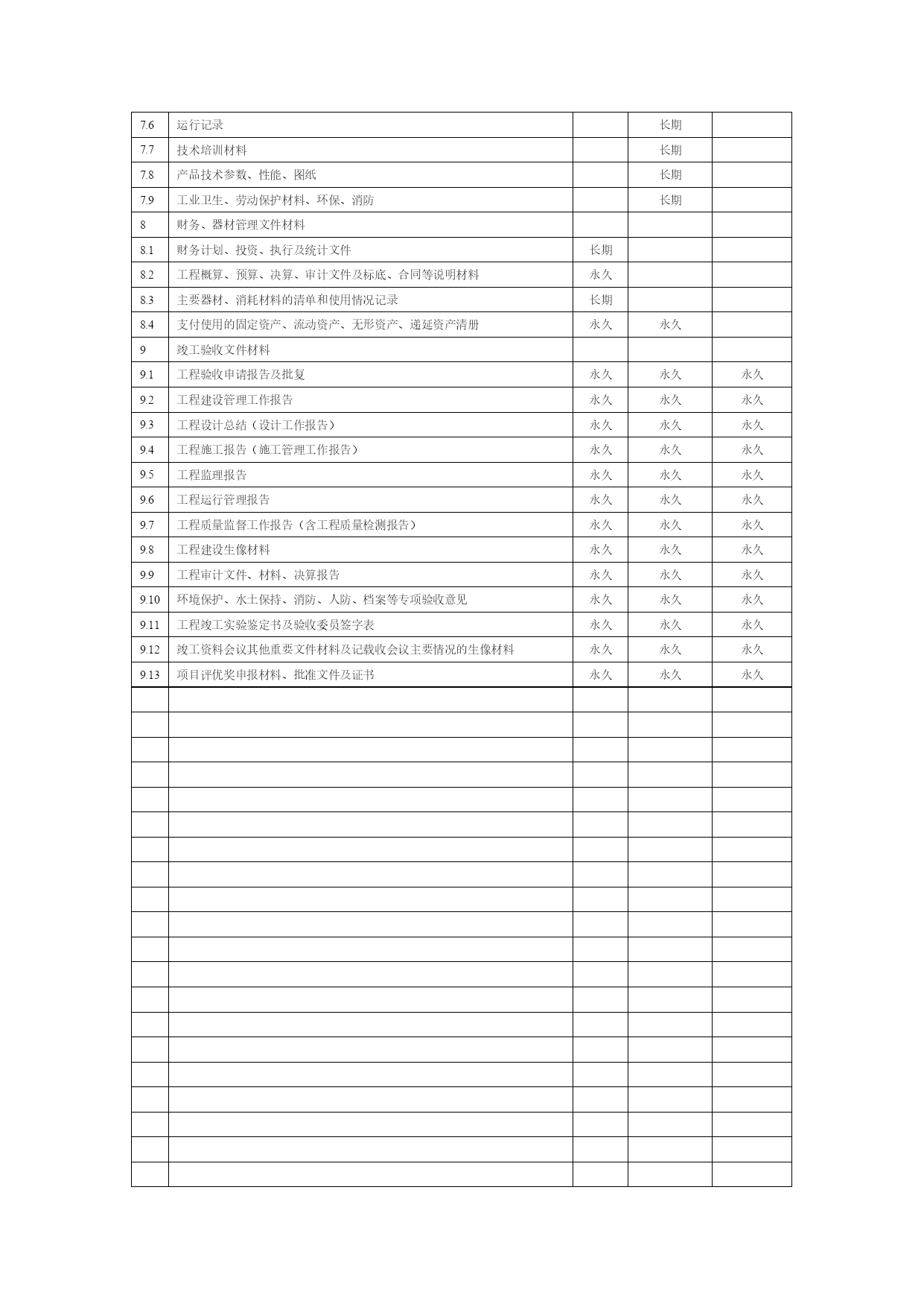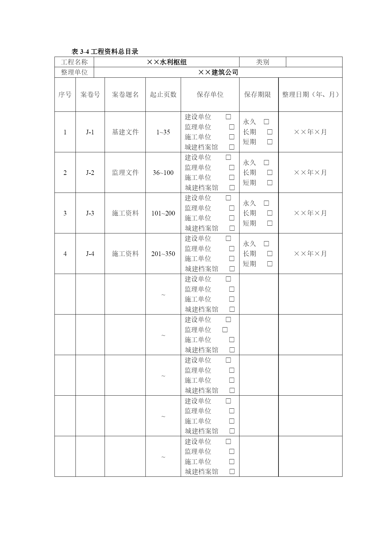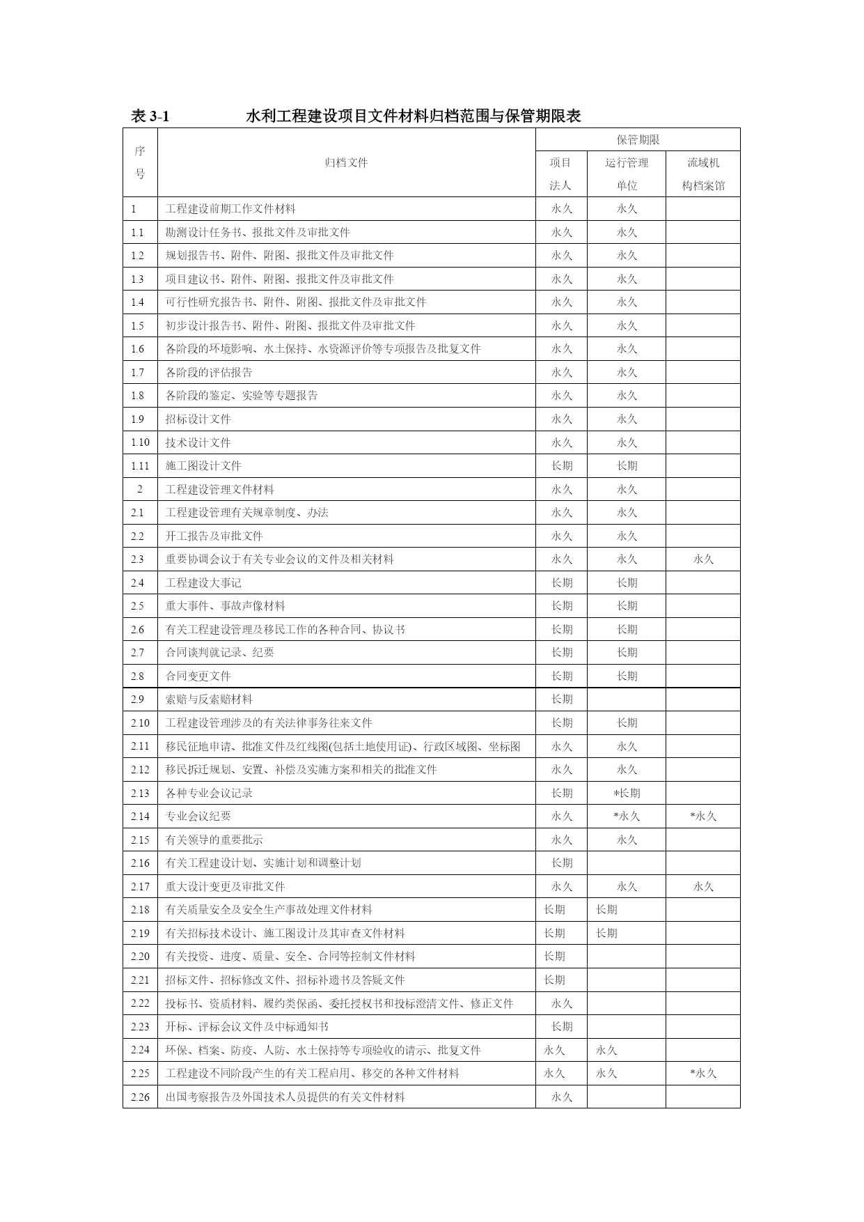 水利工程资料表格优质资料(可以直接使用,可编辑优质资料,欢迎下载)表3-1水利工程建设项目文件材料归档范围与保管期限表序号归档文件保管期限项目法人运行管理单位流域机构档案馆1工程建设前期工作文件材料永久永久1.1勘测设计任务书、报批文件及审批文件永久永久1.2规划报告书、附件、附图、报批文件及审批文件永久永久1.3项目建议书、附件、附图、报批文件及审批文件永久永久1.4可行性研究报告书、附件、附图、报批文件及审批文件永久永久1.5初步设计报告书、附件、附图、报批文件及审批文件永久永久1.6各阶段的环境影响、水土保持、水资源评价等专项报告及批复文件永久永久1.7各阶段的评估报告永久永久1.8各阶段的鉴定、实验等专题报告永久永久1.9招标设计文件永久永久1.10技术设计文件永久永久1.11施工图设计文件长期长期2工程建设管理文件材料永久永久2.1工程建设管理有关规章制度、办法永久永久2.2开工报告及审批文件永久永久2.3重要协调会议于有关专业会议的文件及相关材料永久永久永久2.4工程建设大事记长期长期2.5重大事件、事故声像材料长期长期2.6有关工程建设管理及移民工作的各种合同、协议书长期长期2.7合同谈判就记录、纪要长期长期2.8合同变更文件长期长期2.9索赔与反索赔材料长期2.10工程建设管理涉及的有关法律事务往来文件长期长期2.11移民征地申请、批准文件及红线图(包括土地使用证)、行政区域图、坐标图永久永久2.12移民拆迁规划、安置、补偿及实施方案和相关的批准文件永久永久2.13各种专业会议记录长期*长期2.14专业会议纪要永久*永久*永久2.15有关领导的重要批示永久永久2.16有关工程建设计划、实施计划和调整计划长期2.17重大设计变更及审批文件永久永久永久2.18有关质量安全及安全生产事故处理文件材料长期长期2.19有关招标技术设计、施工图设计及其审查文件材料长期长期2.20有关投资、进度、质量、安全、合同等控制文件材料长期2.21招标文件、招标修改文件、招标补遗书及答疑文件长期2.22投标书、资质材料、履约类保函、委托授权书和投标澄清文件、修正文件永久2.23开标、评标会议文件及中标通知书长期2.24环保、档案、防疫、人防、水土保持等专项验收的请示、批复文件永久永久2.25工程建设不同阶段产生的有关工程启用、移交的各种文件材料永久永久*永久2.26出国考察报告及外国技术人员提供的有关文件材料永久2.27项目法人在工程建设管理方面与有关单位(含外商)的重要来往函电永久3施工文件材料3.1工程技术要求、技术交底、图纸会审记要长期长期3.2施工计划、技术、工艺、安全措施等施工组织设计报批及审核文件长期长期3.3建筑原材料出厂证明、质量鉴定、复验单及试验报告长期长期3.4设备材料、零部件的出厂证明(合格证)、材料代用核定审批手续、技术核定表、业务联系单、备忘录等长期3.5设计变更通知、工程更改洽商单等永久永久永久3.6施工定位(水准点、导线点、基准点、控制点)等测量、复核记录永久永久3.7施工放养记录及有关材料永久永久3.8地质勘探和土(岩)试验报告永久长期3.9基础处理、基础工程施工、桩基工程、地基验槽记录永久永久3.10设备及管线焊接实验记录、报告、施工检验、探伤记录永久长期3.11工程或设备与设施强度、密闭性试验记录、报告长期长期3.12隐蔽工程验收记录永久长期3.13记载工程或设备变化状态(测试、沉降、位移、变形等)的各种检测记录永久长期3.14各类设备、电气、仪表的施工安装记录、质量检查、检验、评定材料长期长期3.15网络、系统、管线等设备、设施的运行、测试、调试、试验记录与报告长期长期3.16管线清洗、试压、通水、通气、消毒记录、报告长期长期3.17管线标高、位置、坡度测量记录长期长期3.18绝缘、接地电阻等性能测试、校核记录永久长期3.19材料、设备明细表及检验、交接记录长期长期3.20电器装置操作、联动实验记录短期长期3.21工程质量检查自评表永久长期3.22施工技术总结、施工预、决算长期长期3.23事故及缺陷处理报告等相关材料长期长期3.24个阶段检查、验收报告和结论及相关文件材料永久永久*永久3.25设备及管线施工中间交工验收记录及相关材料永久长期3.26竣工图(含工程基础地质素描图)永久永久永久3.27反映工程建设原貌及建设过程中重要阶段或事件的声像材料永久永久*永久3.28施工大事记长期长期3.29施工记录及施工日记长期4监理文件材料4.1监理合同协议,监理大纲,监理规划、细则、采购方案、监造计划及批复文件长期4.2设备材料审核文件长期4.3施工进度、延长工期、索赔及付款报批材料长期4.4开(停、复返)工令、许可证等长期4.5监理通知,协调会议机要,监理工程师指令、指示,来往信函长期4.6