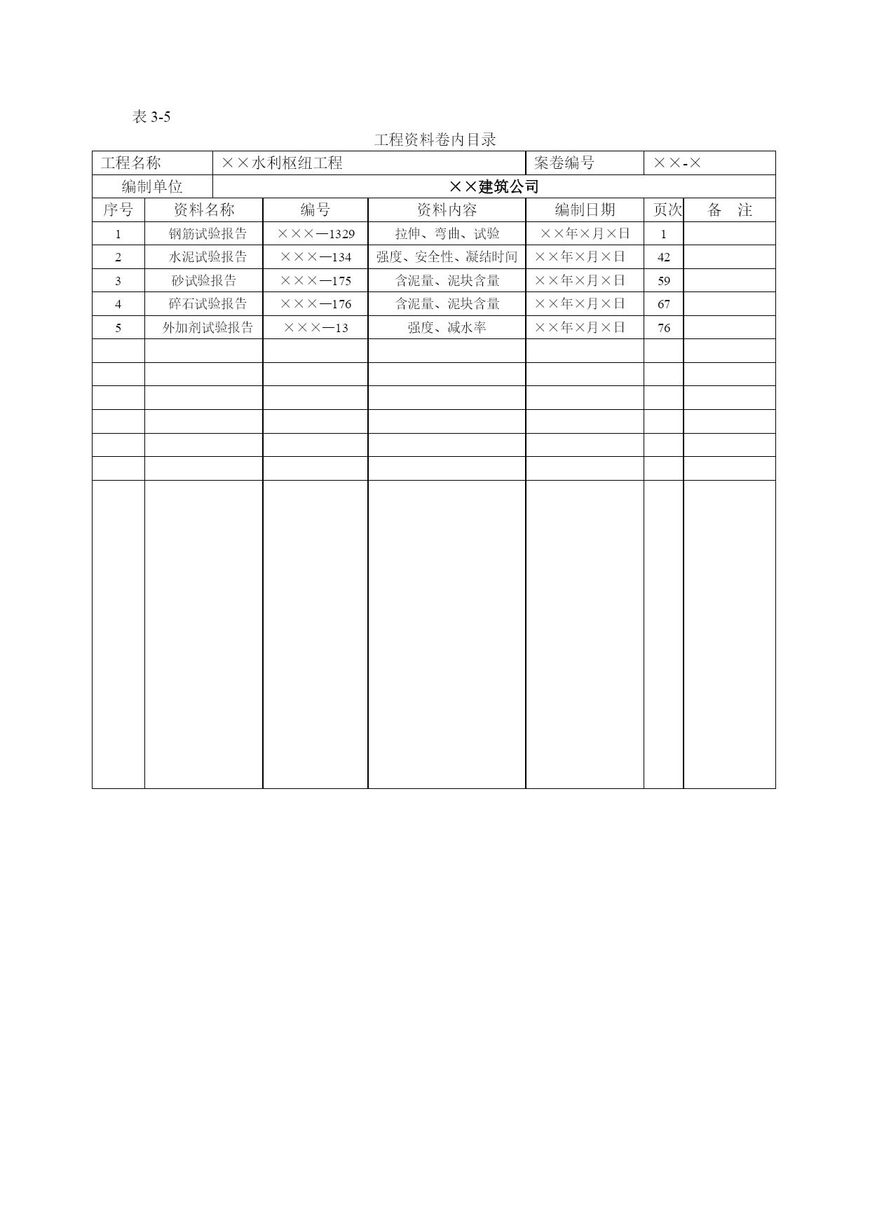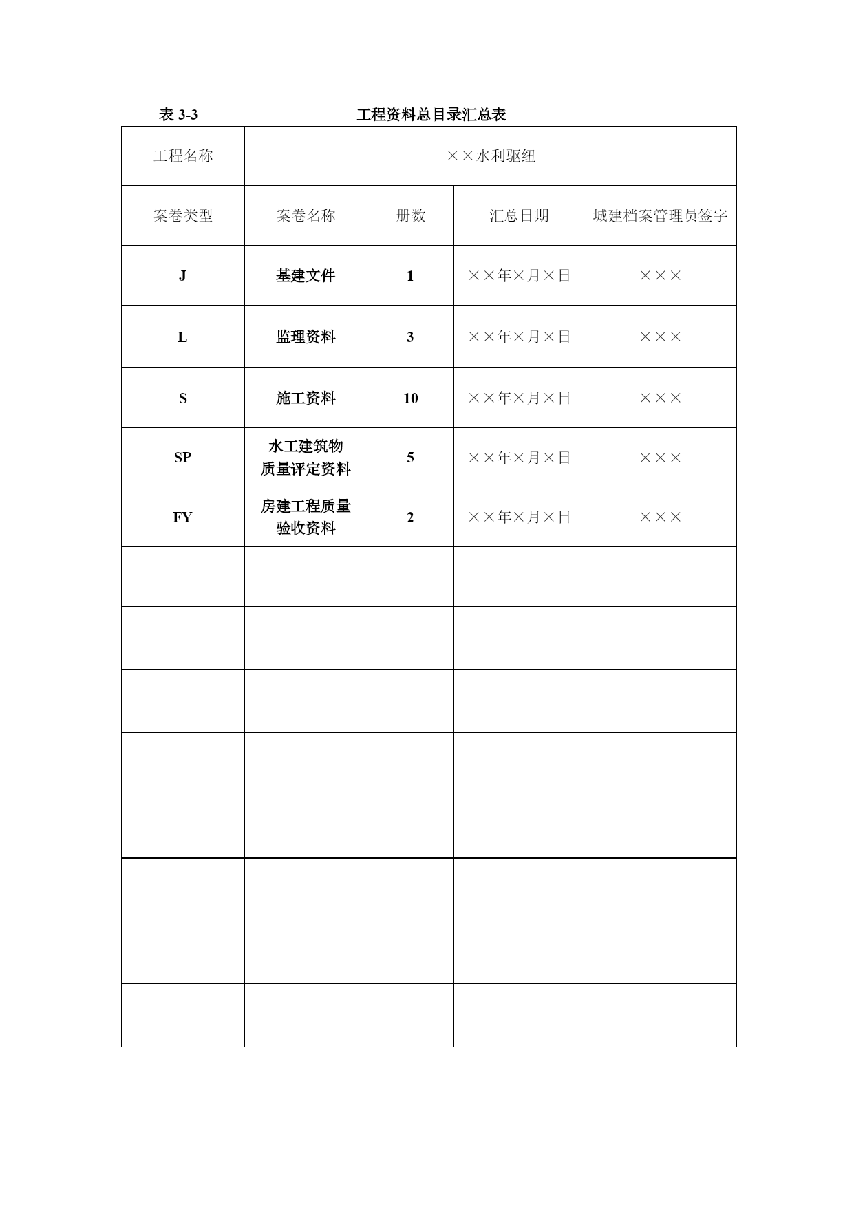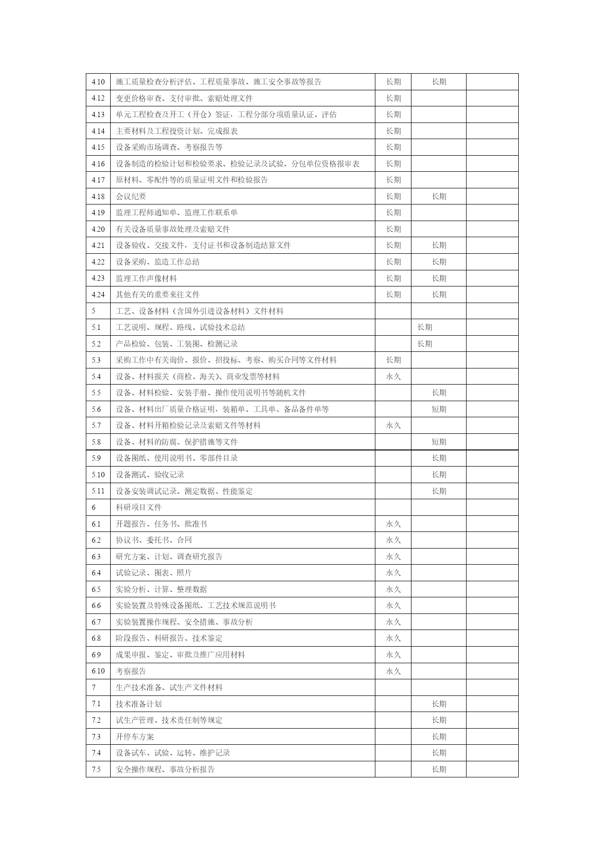水利工程资料表格优质资料(可以直接使用,可编辑优质资料,欢迎下载)表3-1水利工程建设项目文件材料归档范围与保管期限表序号归档文件保管期限项目法人运行管理单位流域机构档案馆1工程建设前期工作文件材料永久永久1.1勘测设计任务书、报批文件及审批文件永久永久1.2规划报告书、附件、附图、报批文件及审批文件永久永久1.3项目建议书、附件、附图、报批文件及审批文件永久永久1.4可行性研究报告书、附件、附图、报批文件及审批文件永久永久1.5初步设计报告书、附件、附图、报批文件及审批文件永久永久1.6各阶段的环境影响、水土保持、水资源评价等专项报告及批复文件永久永久1.7各阶段的评估报告永久永久1.8各阶段的鉴定、实验等专题报告永久永久1.9招标设计文件永久永久1.10技术设计文件永久永久1.11施工图设计文件长期长期2工程建设管理文件材料永久永久2.1工程建设管理有关规章制度、办法永久永久2.2开工报告及审批文件永久永久2.3重要协调会议于有关专业会议的文件及相关材料永久永久永久2.4工程建设大事记长期长期2.5重大事件、事故声像材料长期长期2.6有关工程建设管理及移民工作的各种合同、协议书长期长期2.7合同谈判就记录、纪要长期长期2.8合同变更文件长期长期2.9索赔与反索赔材料长期2.10工程建设管理涉及的有关法律事务往来文件长期长期2.11移民征地申请、批准文件及红线图(包括土地使用证)、行政区域图、坐标图永久永久2.12移民拆迁规划、安置、补偿及实施方案和相关的批准文件永久永久2.13各种专业会议记录长期*长期2.14专业会议纪要永久*永久*永久2.15有关领导的重要批示永久永久2.16有关工程建设计划、实施计划和调整计划长期2.17重大设计变更及审批文件永久永久永久2.18有关质量安全及安全生产事故处理文件材料长期长期2.19有关招标技术设计、施工图设计及其审查文件材料长期长期2.20有关投资、进度、质量、安全、合同等控制文件材料长期2.21招标文件、招标修改文件、招标补遗书及答疑文件长期2.22投标书、资质材料、履约类保函、委托授权书和投标澄清文件、修正文件永久2.23开标、评标会议文件及中标通知书长期2.24环保、档案、防疫、人防、水土保持等专项验收的请示、批复文件永久永久2.25工程建设不同阶段产生的有关工程启用、移交的各种文件材料永久永久*永久2.26出国考察报告及外国技术人员提供的有关文件材料永久2.27项目法人在工程建设管理方面与有关单位(含外商)的重要来往函电永久3施工文件材料3.1工程技术要求、技术交底、图纸会审记要长期长期3.2施工计划、技术、工艺、安全措施等施工组织设计报批及审核文件长期长期3.3建筑原材料出厂证明、质量鉴定、复验单及试验报告长期长期3.4设备材料、零部件的出厂证明(合格证)、材料代用核定审批手续、技术核定表、业务联系单、备忘录等长期3.5设计变更通知、工程更改洽商单等永久永久永久3.6施工定位(水准点、导线点、基准点、控制点)等测量、复核记录永久永久3.7施工放养记录及有关材料永久永久3.8地质勘探和土(岩)试验报告永久长期3.9基础处理、基础工程施工、桩基工程、地基验槽记录永久永久3.10设备及管线焊接实验记录、报告、施工检验、探伤记录永久长期3.11工程或设备与设施强度、密闭性试验记录、报告长期长期3.12隐蔽工程验收记录永久长期3.13记载工程或设备变化状态(测试、沉降、位移、变形等)的各种检测记录永久长期3.14各类设备、电气、仪表的施工安装记录、质量检查、检验、评定材料长期长期3.15网络、系统、管线等设备、设施的运行、测试、调试、试验记录与报告长期长期3.16管线清洗、试压、通水、通气、消毒记录、报告长期长期3.17管线标高、位置、坡度测量记录长期长期3.18绝缘、接地电阻等性能测试、校核记录永久长期3.19材料、设备明细表及检验、交接记录长期长期3.20电器装置操作、联动实验记录短期长期3.21工程质量检查自评表永久长期3.22施工技术总结、施工预、决算长期长期3.23事故及缺陷处理报告等相关材料长期长期3.24个阶段检查、验收报告和结论及相关文件材料永久永久*永久3.25设备及管线施工中间交工验收记录及相关材料永久长期3.26竣工图(含工程基础地质素描图)永久永久永久3.27反映工程建设原貌及建设过程中重要阶段或事件的声像材料永久永久*永久3.28施工大事记长期长期3.29施工记录及施工日记长期4监理文件材料4.1监理合同协议,监理大纲,监理规划、细则、采购方案、监造计划及批复文件长期4.2设备材料审核文件长期4.3施工进度、延长工期、索赔及付款报批材料长期4.4开(停、复返)工令、许可证等长期4.5监理通知,协调会议机要,监理工程师指令、指示,来往信函长期4.6