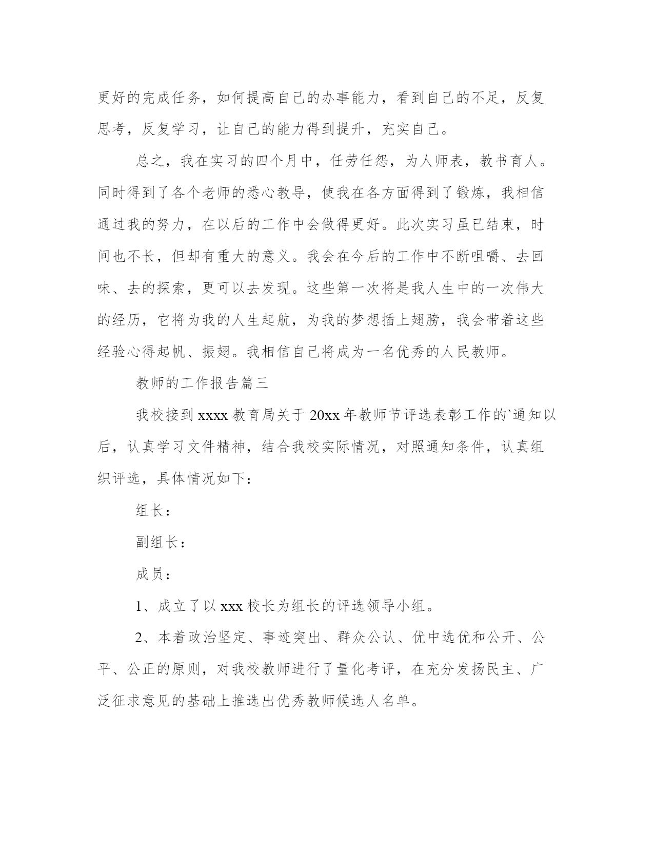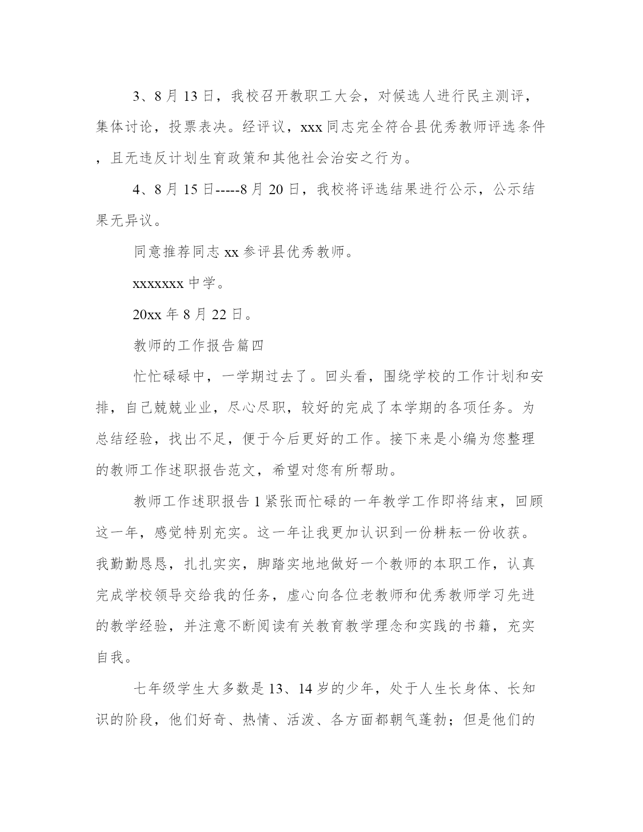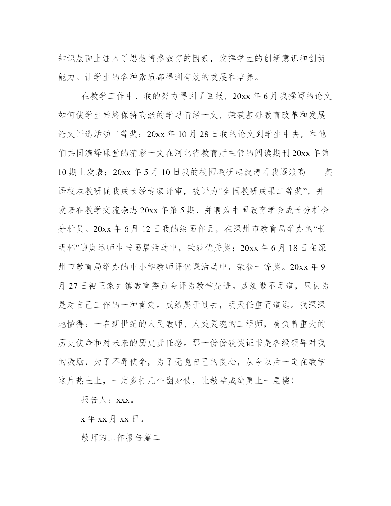 教师的工作报告(汇总17篇)无论是学术报告还是工作报告,都需要遵循一定的结构和格式。在撰写报告时,要注意语言简明扼要,并且用词准确,避免使用不必要的修饰词和废话。报告是对事实、情况和问题进行客观分析和评价的一种书面形式,它可以向他人传达信息和建议,提供决策依据。撰写报告需要充分准备和深入分析,具备准确性和可信度。报告的撰写需要注意语言的简练明了和数据的有力支持。那么我们该如何写一篇较为完美的报告呢?以下是小编为大家收集的报告范文,供参考和借鉴。教师的工作报告篇一光阴似箭,日月如梭,转眼间,我已在教坛摸爬滚打了十几年。回顾近十几年的工作,我感慨万千。这十几年,是我默默耕耘的十几年,也是我努力探索的十几年,更是我迅速成长的十几年。天道酬勤,一份耕耘也有一份收获。但我深深知道,我取得的点滴进步都离不开领导的信任、栽培和老师们的鼓励与支持。新的时代,新的教育理念,教育也提出新的改革,新课程的实施,对我们教师的工作提出了更高的要求,我从各方面严格要求自己,努力提高自己的业务水平丰富知识面,结合本校的实际条件和学生的实际情况,勤勤恳恳,兢兢业业,使教学工作有计划,有组织,有步骤地开展。立足现在,放眼未来,为使今后的工作取得更大的进步不断努力,现对近年来教学工作作出总结:一、坚持认真备课,备课中我不仅备学生而且备教材备教法,根据教材内容及学生的实际,设计课的类型,拟定采用的教学方法,并对教学过程的程序及时间安排都作了详细的记录,认真写好教案。每一课都做到“有备而来”,每堂课都在课前做好充分的准备,并制作各种利于吸引学生注意力的有趣教具,课后及时对该课作出总结,写好教学后记,并认真按搜集每课书的知识要点,归纳成集。在工作中,“德高为师”在我心中根深蒂固,“为人师表”是我的行动指南,并时刻以师德规范这面镜子来要求自己。二、努力增强我的`上课技能,提高教学质量,使讲解清晰化,条理化,准确化,条理化,准确化,情感化,生动化,做到线索清晰,层次分明,言简意赅,深入浅出。在课堂上特别注意调动学生的积极性,加强师生交流,充分体现学生的主作用,让学生学得容易,学得轻松,学得愉快;注意精讲精练,在课堂上老师讲得尽量少,学生动口动手动脑尽量多;同时在每一堂课上都充分考虑每一个层次的学生学习需求和学习能力,让各个层次的学生都得到提高。现在学生普遍反映喜欢上英语课,就连以前极讨厌英语的学生都乐于上课了。三、与同事交流,虚心请教其他老师。在教学上,有疑必问。在各个章节的学习上都积极征求其他老师的意见,学习他们的方法,同时,多听老师的课,做到边听边讲,学习别人的优点,克服自己的不足,并常常邀请其他老师来听课,征求他们的意见,改进工作。四、完善批改作业:布置作业做到精读精练。有针对性,有层次性。为了做到这点,我常常到各大书店去搜集资料,对各种辅助资料进行筛选,力求每一次练习都起到最大的效果。同时对学生的作业批改及时、认真,分析并记录学生的作业情况,将他们在作业过程出现的问题作出分类总结,进行透切的评讲,并针对有关情况及时改进教学方法,做到有的放矢。五、做好课后辅导工作,注意分层教学。在课后,为不同层次的学生进行相应的辅导。对后进生的辅导,并不限于学习知识性的辅导,而是通过各种途径激发他们的求知欲和上进心,让他们意识到学英语并不是一项任务,也不是一件痛苦的事情。而是充满乐趣的,从而自觉的把身心投放到学习中去。在此基础上,再教给他们学习的方法,提高他们的技能。并认真细致地做好查漏补缺工作。后进生通常存在很多知识断层,这些都是后进生转化过程中的拌脚石,在做好后进生的转化工作时,要特别注意给他们补课,把他们以前学习的知识断层补充完整,这样,他们就会学得轻松,进步也快,兴趣和求知欲也会随之增加。六、积极推进素质教育。新课改提了的,要以提高学生素质教育为主导思想,为此,我在教学工作中并非只是传授知识,而是注意了学生能力的培养,把传授知识、技能和发展智力、能力结合起来,在知识层面上注入了思想情感教育的因素,发挥学生的创新意识和创新能力。让学生的各种素质都得到有效的发展和培养。在教学工作中,我的努力得到了回报,20xx年6月我撰写的论文如何使学生始终保持高涨的学习情绪一文,荣获基础教育改革和发展论文评选活动二等奖;20xx年10月28日我的论文到学生中去,和他们共同演绎课堂的精彩一文在河北省教育厅主管的阅读期刊20xx年第10期上发表;20xx年5月10日我的校园教研起波涛看我逐浪高——英语校本教研促我成长经专家评审,被评为“全国教研成果二等奖”,并发表在教学交流杂志20xx年第5期,并聘为中国教育学会成长分析会分析员。20xx年6月12日我的绘画作品,在深州市教育局举办的“长明杯”迎奥运师生书画展活动中,荣获优秀奖;20xx年6月18日在深州市教育局举办的中小学