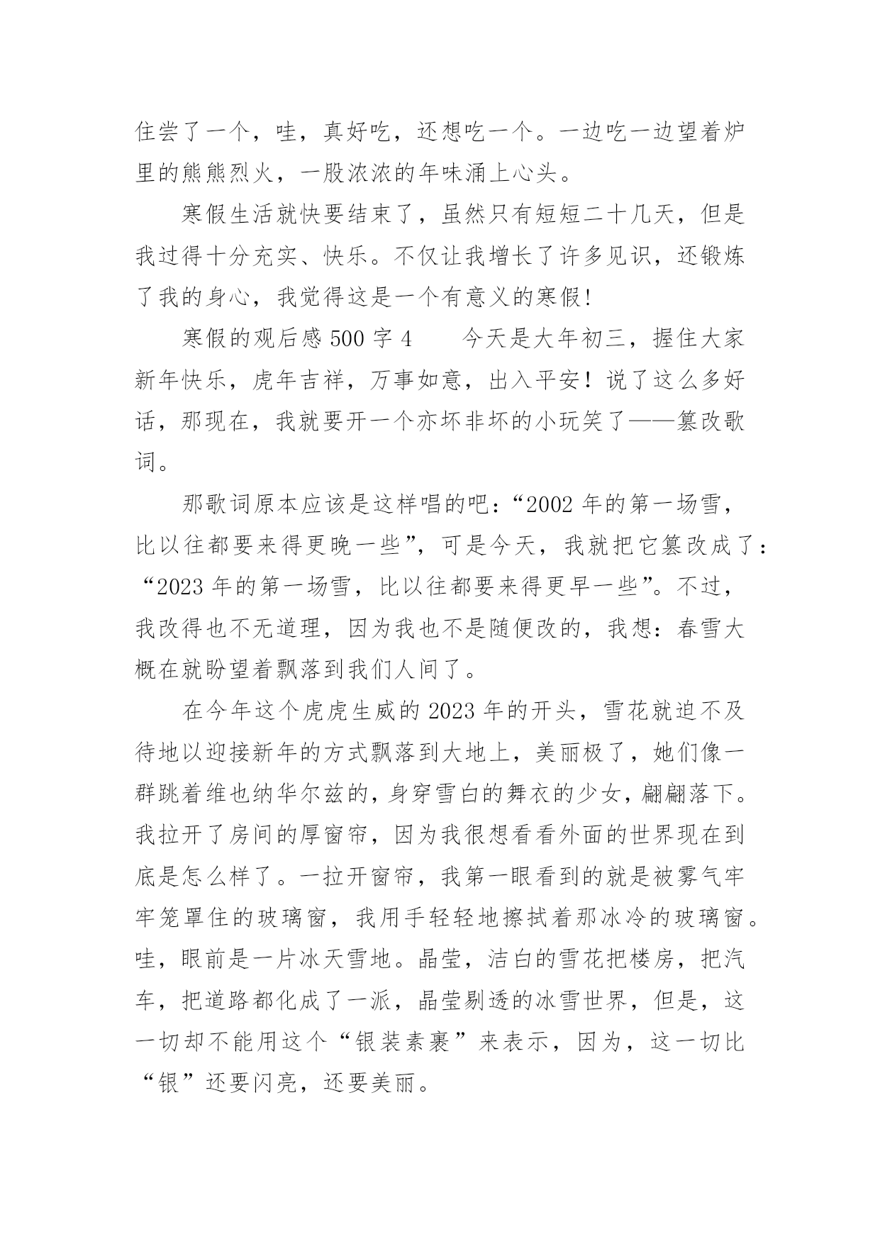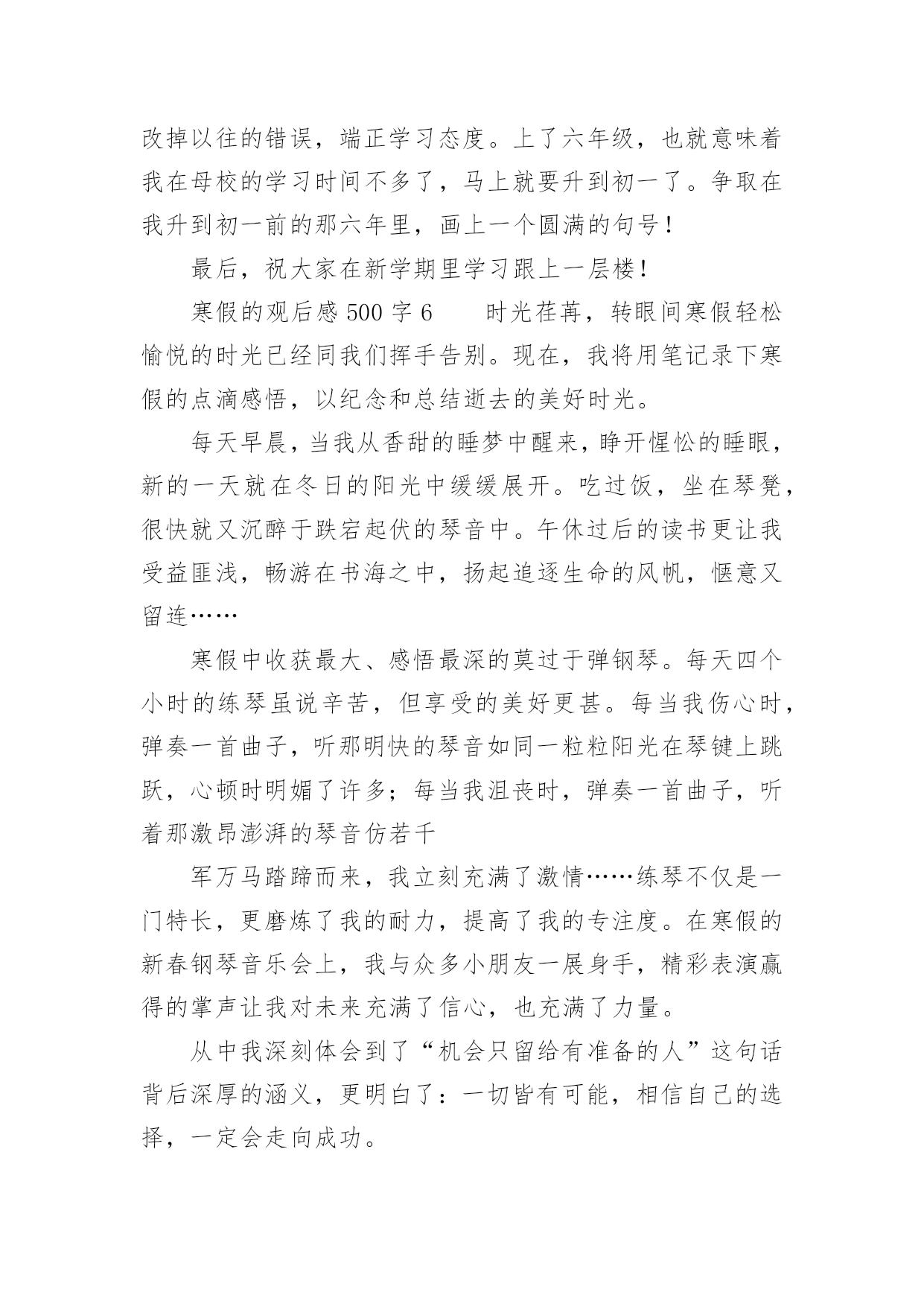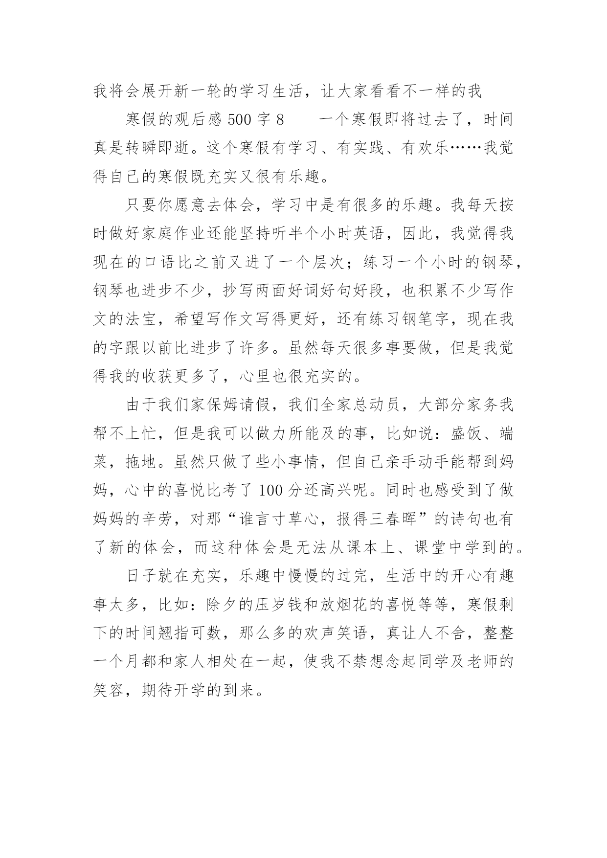 寒假的观后感500字寒假的观后感500字(精选8篇)认真看完一部作品以后,相信你会有不少感想吧,需要回过头来写一写观后感了。观后感你想好怎么写了吗?以下是小编为大家整理的寒假的观后感500字(精选8篇),供大家参考借鉴,希望可以帮助到有需要的朋友。寒假的观后感500字1转眼间,寒假过去一半了,春节即将来临,我又终于可以安静的上几天网了,终于又可以体验体验游戏的滋味了,又可以享受享受自由的感觉了!一点一点…哇!终于完成了,我终于又可以进入我梦想的三国世界啦,我眼都不眨的注视着屏幕,心旷神怡的感受着游戏的甜美,真是玩儿时无限好,只是有尽时啊……我不放过一分一秒,不论是腰酸还是悲痛,不论是腿麻还是脚木,统统都抛到九霄云外了,喳喳喳……游戏里的刀光剑影让我神采飞扬,唰唰唰……游戏里的走石飞沙让我魂牵梦索……我知道,我不能迷恋网络,而我并非迷恋它,只是一时的嗜好罢了,我只是将它当作一种消遣,当作一种可以打发因学习困惑的工具。我并非没有局限,我只是将时间胡乱的搭配,将工作下乱穿插罢了。我不希望将宝贵的时间挥霍在网络,我只是希望得到一点愉快,我假如浪费一分一秒,在我的世界就要多一会儿奔跑……比慢慢的停了下来,我感受着每一个人的人生,不能适可而止!不可停住步伐!我要随着时间,踏着风,一路搏风斩浪,我不会自己打垮自己,也不会轻言放弃,让自己微笑的面对自己,面对明天,面对人生……我放松紧按在键盘上的手,放下悬吊着的心,乌云依旧,雪花依旧,狂风依旧,而鸟儿的嬉戏,喜鹊的报春而又何尝不是呢?寒假的观后感500字2时光如水,岁月如梭。唉!一眨眼,一个寒假又过去了。在这个发生了许许多多的事情。过了一个年,我们都长大了一岁。似乎同时我们也跟着年龄的增长而变化,再次回到学校,我觉得同学们都比以前更懂事了、更成熟了、更努力了、更认真了。想起刚上初中的那段时间,我们都还带着小学生的稚气,来到这个美好而又和谐的校园。整天在走廊上追打、嬉戏、拥挤在栏杆上,无所顾忌,每天都在疯玩。嘻嘻,现在想起来觉得那时的我们真是太幼稚、太不珍惜能在这美好的环境里学知识。时间过得可真快,又一个寒假过去了。我不禁扪心自问:在这个寒假里我究竟做了什么、又获得了什么。只知道自己每天都是睡到12点才起床,吃完午饭。玩到3点才做作业,然后到4点又玩电脑,玩到5点就下来吃饭,吃完饭到9点多才做作业。(而且每次做作业都吃一边吃零食,一边做作业)就这样一天又眨眼间过去了,接下来的每一天都是这样度过的。现在开学了,我就开始后悔自己当初为什么那么贪玩、为什么不多看一些选、为什么不好好利用这宝贵的时间。我知道过去了就是过去了,再怎么后悔、怎么使唤,那段时间也不会再回来。现在,我们唯有踏踏实实过好每一天,将每一天过得充实,这样到了结束的时候,我们就不会再流着眼泪说:“后悔自己当初没怎么样、怎么样。”寒假已经结束,我们又要回到学校继续学习新知识。面对新的学期,我们又要以全新的姿态,迎接新的'学年了。寒假的观后感500字3我想没有哪位同学不期盼寒假吧?寒假不止是漫长的休息日,也是欢度春节的时候。寒假里不能一味学习,还要适当的娱乐,也不能一味的玩耍,就把学习拋到九霄云外。我每天按计划做作业、弹古筝、做运动、玩耍,寒假也充实了许多。这样一个学习与娱乐并存的假期,就快要过去,崭新的一个学期也即将来临。在迎来新的一个学期之前,先让我们来回顾一下这个寒假吧。寒假期间,我一直在努力充实自己,跟爸爸妈妈一起骑行、爬山、滑雪。最近我又看了几本历史书,当中的历史人物栩栩如生,很多故事也让我着迷。其中有聪明绝顶的张衡、医术高明的华佗,还有任性妄为的隋炀帝……当然,让我觉得最难忘的莫过于在外婆家做团子了。早上,我睡了一个小小的懒觉,一觉醒来,我发现大家都在做团子。我赶紧洗漱,吃完早餐我也加入了其中。我先是搓了几个团子,又去看看负责生火的爸爸。一看,呀!爸爸灰头土脸,满脸通红。我急忙跑过去接过铁钳,干起了生火的活儿。我时不时地往炉子里加点柴火,不一会儿,两笼团子就蒸好了。爸爸打开一看,个个晶莹润泽、洁白透亮。我忍不住尝了一个,哇,真好吃,还想吃一个。一边吃一边望着炉里的熊熊烈火,一股浓浓的年味涌上心头。寒假生活就快要结束了,虽然只有短短二十几天,但是我过得十分充实、快乐。不仅让我增长了许多见识,还锻炼了我的身心,我觉得这是一个有意义的寒假!寒假的观后感500字4今天是大年初三,握住大家新年快乐,虎年吉祥,万事如意,出入平安!说了这么多好话,那现在,我就要开一个亦坏非坏的小玩笑了——篡改歌词。那歌词原本应该是这样唱的吧:“2002年的第一场雪,比以往都要来得更晚一些”,可是今天,我就把它篡改成了:“2023年的第一场雪,比以往都要来得更早一些”。不过,我改得也不无道理,因为我也不是随便改的,我想:春雪大概在就盼望着飘落到我们人间了。