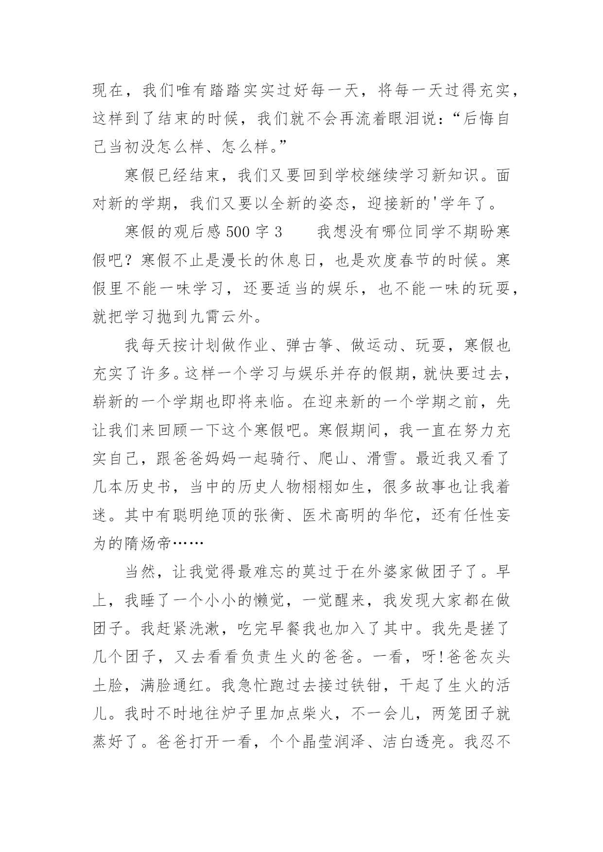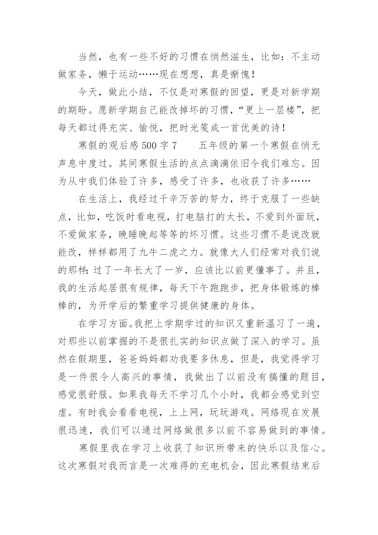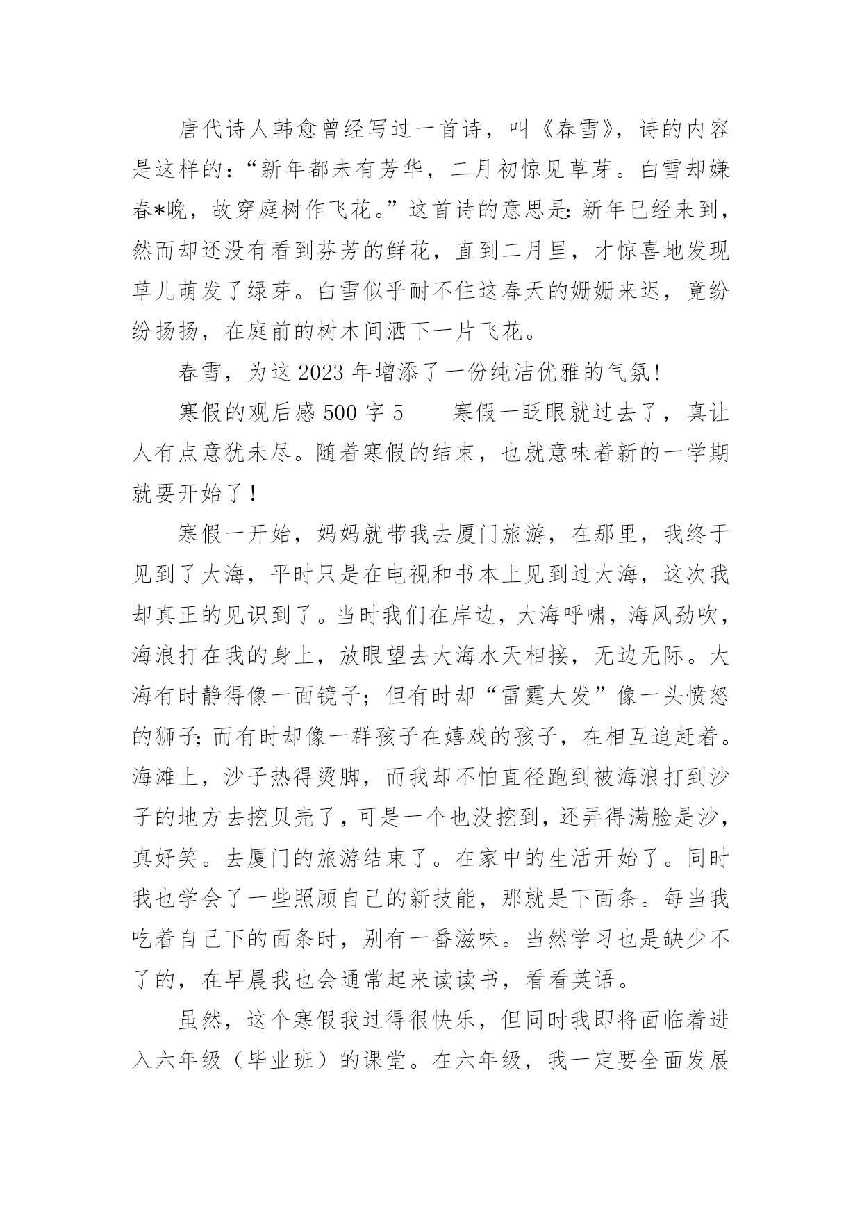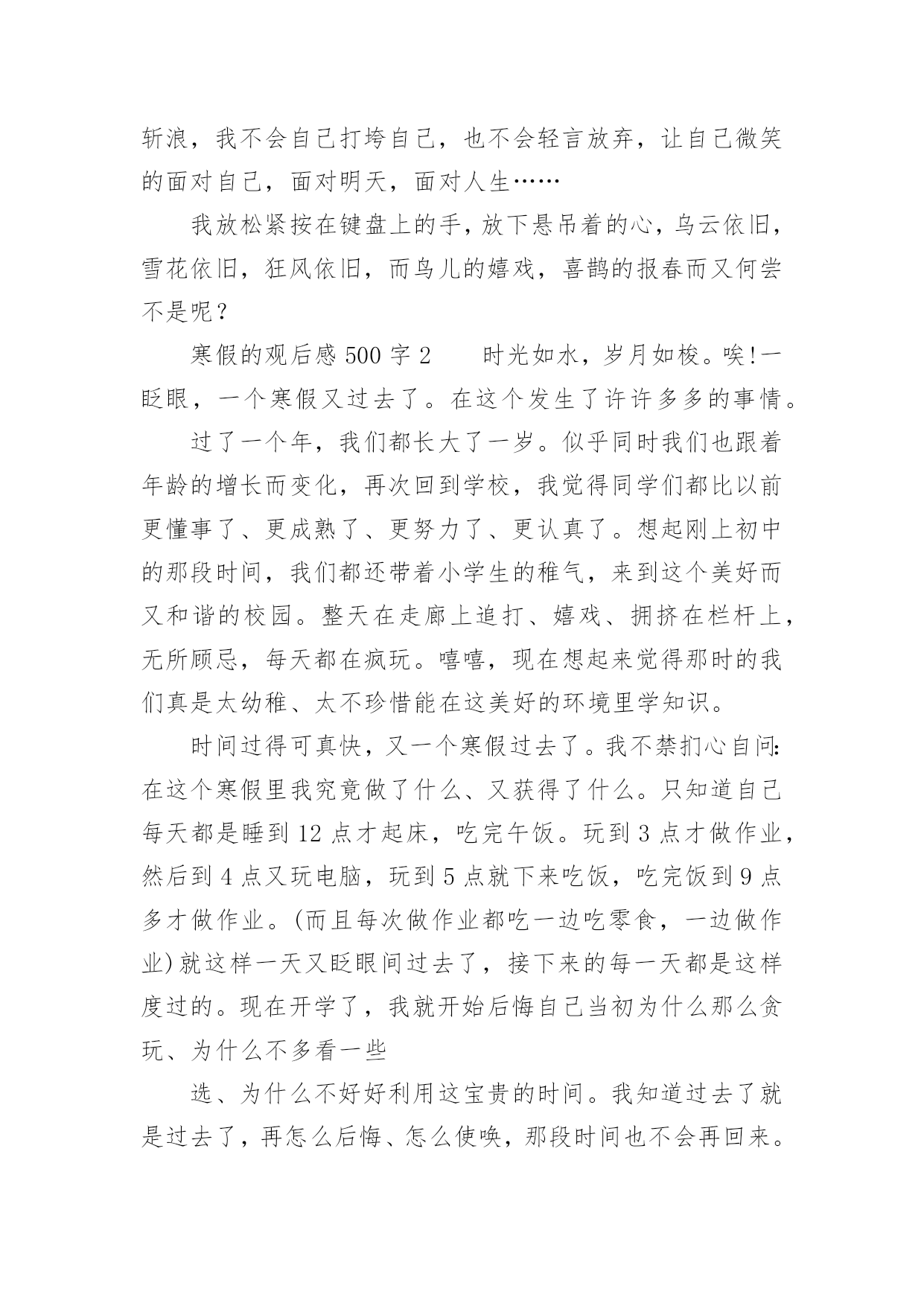 寒假的观后感500字寒假的观后感500字(精选8篇)认真看完一部作品以后,相信你会有不少感想吧,需要回过头来写一写观后感了。观后感你想好怎么写了吗?以下是小编为大家整理的寒假的观后感500字(精选8篇),供大家参考借鉴,希望可以帮助到有需要的朋友。寒假的观后感500字1转眼间,寒假过去一半了,春节即将来临,我又终于可以安静的上几天网了,终于又可以体验体验游戏的滋味了,又可以享受享受自由的感觉了!一点一点…哇!终于完成了,我终于又可以进入我梦想的三国世界啦,我眼都不眨的注视着屏幕,心旷神怡的感受着游戏的甜美,真是玩儿时无限好,只是有尽时啊……我不放过一分一秒,不论是腰酸还是悲痛,不论是腿麻还是脚木,统统都抛到九霄云外了,喳喳喳……游戏里的刀光剑影让我神采飞扬,唰唰唰……游戏里的走石飞沙让我魂牵梦索……我知道,我不能迷恋网络,而我并非迷恋它,只是一时的嗜好罢了,我只是将它当作一种消遣,当作一种可以打发因学习困惑的工具。我并非没有局限,我只是将时间胡乱的搭配,将工作下乱穿插罢了。我不希望将宝贵的时间挥霍在网络,我只是希望得到一点愉快,我假如浪费一分一秒,在我的世界就要多一会儿奔跑……比慢慢的停了下来,我感受着每一个人的人生,不能适可而止!不可停住步伐!我要随着时间,踏着风,一路搏风斩浪,我不会自己打垮自己,也不会轻言放弃,让自己微笑的面对自己,面对明天,面对人生……我放松紧按在键盘上的手,放下悬吊着的心,乌云依旧,雪花依旧,狂风依旧,而鸟儿的嬉戏,喜鹊的报春而又何尝不是呢?寒假的观后感500字2时光如水,岁月如梭。唉!一眨眼,一个寒假又过去了。在这个发生了许许多多的事情。过了一个年,我们都长大了一岁。似乎同时我们也跟着年龄的增长而变化,再次回到学校,我觉得同学们都比以前更懂事了、更成熟了、更努力了、更认真了。想起刚上初中的那段时间,我们都还带着小学生的稚气,来到这个美好而又和谐的校园。整天在走廊上追打、嬉戏、拥挤在栏杆上,无所顾忌,每天都在疯玩。嘻嘻,现在想起来觉得那时的我们真是太幼稚、太不珍惜能在这美好的环境里学知识。时间过得可真快,又一个寒假过去了。我不禁扪心自问:在这个寒假里我究竟做了什么、又获得了什么。只知道自己每天都是睡到12点才起床,吃完午饭。玩到3点才做作业,然后到4点又玩电脑,玩到5点就下来吃饭,吃完饭到9点多才做作业。(而且每次做作业都吃一边吃零食,一边做作业)就这样一天又眨眼间过去了,接下来的每一天都是这样度过的。现在开学了,我就开始后悔自己当初为什么那么贪玩、为什么不多看一些选、为什么不好好利用这宝贵的时间。我知道过去了就是过去了,再怎么后悔、怎么使唤,那段时间也不会再回来。现在,我们唯有踏踏实实过好每一天,将每一天过得充实,这样到了结束的时候,我们就不会再流着眼泪说:“后悔自己当初没怎么样、怎么样。”寒假已经结束,我们又要回到学校继续学习新知识。面对新的学期,我们又要以全新的姿态,迎接新的'学年了。寒假的观后感500字3我想没有哪位同学不期盼寒假吧?寒假不止是漫长的休息日,也是欢度春节的时候。寒假里不能一味学习,还要适当的娱乐,也不能一味的玩耍,就把学习拋到九霄云外。我每天按计划做作业、弹古筝、做运动、玩耍,寒假也充实了许多。这样一个学习与娱乐并存的假期,就快要过去,崭新的一个学期也即将来临。在迎来新的一个学期之前,先让我们来回顾一下这个寒假吧。寒假期间,我一直在努力充实自己,跟爸爸妈妈一起骑行、爬山、滑雪。最近我又看了几本历史书,当中的历史人物栩栩如生,很多故事也让我着迷。其中有聪明绝顶的张衡、医术高明的华佗,还有任性妄为的隋炀帝……当然,让我觉得最难忘的莫过于在外婆家做团子了。早上,我睡了一个小小的懒觉,一觉醒来,我发现大家都在做团子。我赶紧洗漱,吃完早餐我也加入了其中。我先是搓了几个团子,又去看看负责生火的爸爸。一看,呀!爸爸灰头土脸,满脸通红。我急忙跑过去接过铁钳,干起了生火的活儿。我时不时地往炉子里加点柴火,不一会儿,两笼团子就蒸好了。爸爸打开一看,个个晶莹润泽、洁白透亮。我忍不住尝了一个,哇,真好吃,还想吃一个。一边吃一边望着炉里的熊熊烈火,一股浓浓的年味涌上心头。寒假生活就快要结束了,虽然只有短短二十几天,但是我过得十分充实、快乐。不仅让我增长了许多见识,还锻炼了我的身心,我觉得这是一个有意义的寒假!寒假的观后感500字4今天是大年初三,握住大家新年快乐,虎年吉祥,万事如意,出入平安!说了这么多好话,那现在,我就要开一个亦坏非坏的小玩笑了——篡改歌词。那歌词原本应该是这样唱的吧:“2002年的第一场雪,比以往都要来得更晚一些”,可是今天,我就把它篡改成了:“2023年的第一场雪,比以往都要来得更早一些”。不过,我改得也不无道理,因为我也不是随便改的,我想:春雪大概在就盼望着飘落到我们人间了。