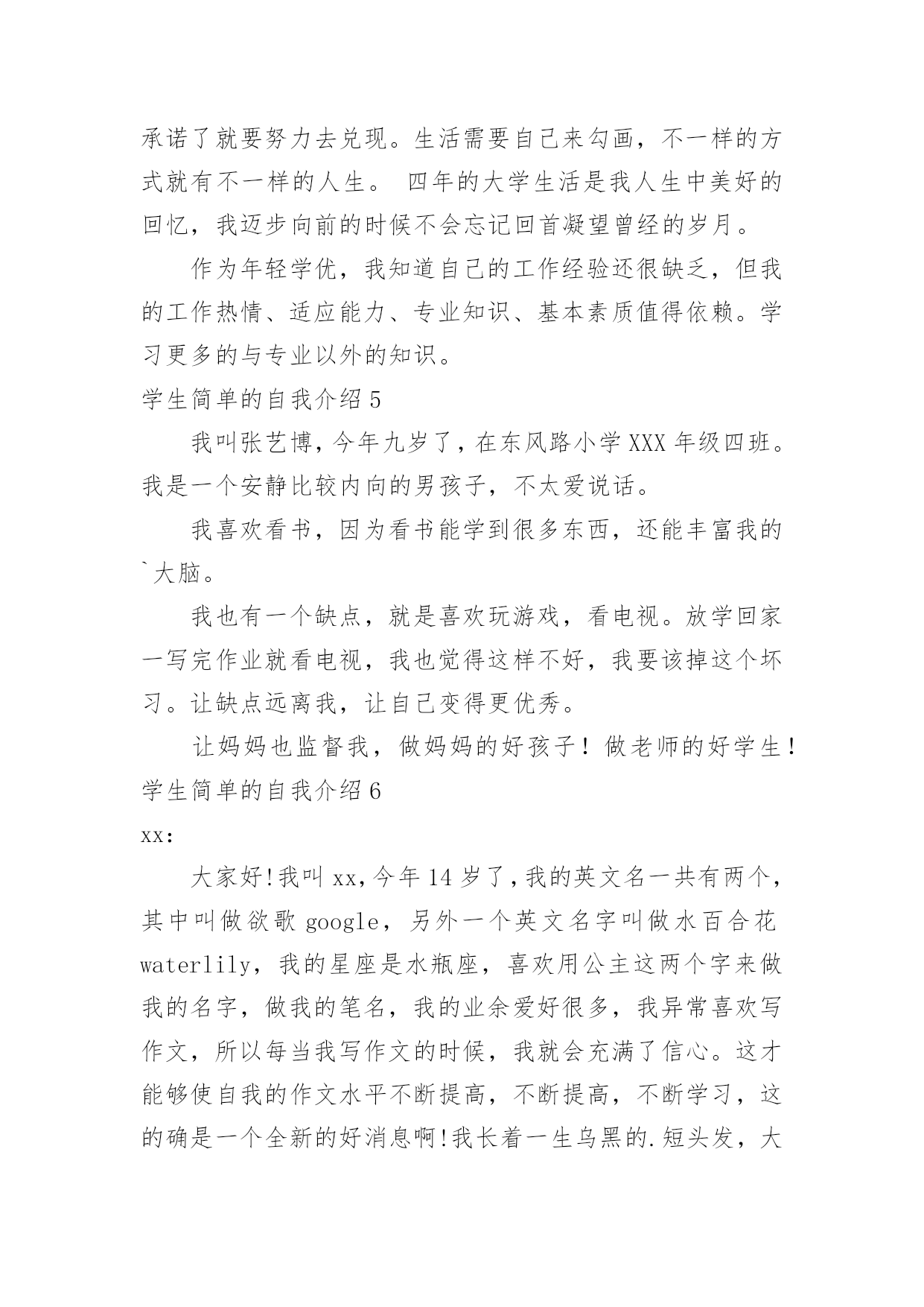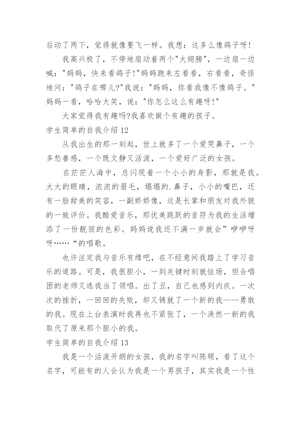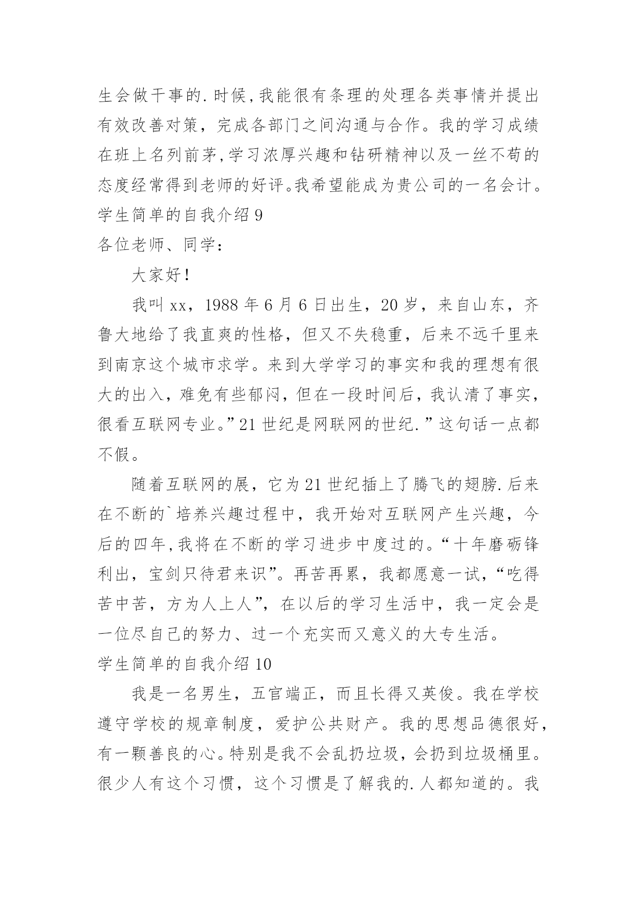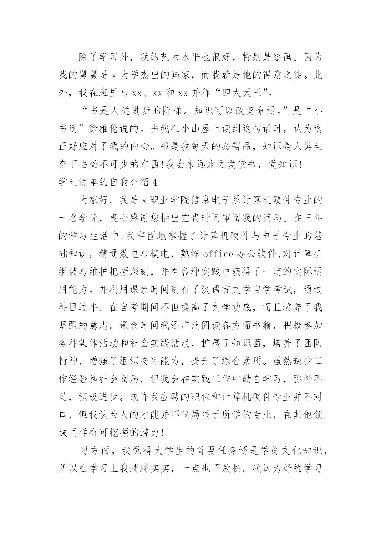 学生简单的自我介绍学生简单的自我介绍当来到一个新环境时,时常要进行自我介绍,自我介绍可以满足我们渴望得到尊重的心理。写起自我介绍来就毫无头绪?下面是小编为大家整理的学生简单的自我介绍,希望能够帮助到大家。学生简单的自我介绍1老师们,同学们:大家早上好。我是x班的。我是一个活泼开朗的女孩,笑,是我的人生特色,我笑看人生,笑对一切,对生活充满了希望。很荣幸能在小学毕业之际当上升旗手,此时此刻的我,倍感荣幸。升旗手是一种荣耀,它不仅代表着国旗下庄严的那一刻,同时也是对于我的不断进步的嘉奖。当我回想起我所看到的汶川大地上升起的五星红旗,我所听到的奥运赛场上一次次奏响的国歌,再望着我身前的这面红旗,我的心中再次波澜壮阔。中国江川湖海、广阔土地上发生的那些感人肺腑的`事,足以让我自豪,并且拥有那份无以替代的荣耀感。而我,也会以一个旗手的名义,以一个蓬勃向上的小学生的名义,升起这永远飘扬的五星红旗。谢谢大家。学生简单的自我介绍2Hello,大家好,我是何敏烽。!我思维敏捷,我手脚灵活,我5尺20寸高。!羽毛球,篮球,桌球,乒乓球,我也略懂一二。悠闲中,我爱看青春偶像剧;心情郁闷中,我爱听音乐。“我的爱只能够让你一个人独自拥有。”是我最喜欢听的歌曲饿’叫《够爱》我身边的人常跟我说,我给他们的第一印象就是烂,耐人寻味,或者我行为习惯不好吧,又或者,我仪表不端正。但其实,真实的我和他们想象中的我迥然不同喔,我成绩不错,在班里可以名列前茅,甚至有时候能越进级前列,只可不是碰巧额。可知道,在背后我也下过不少苦功的,我始终相信“天才出自勤奋”。对于失败,我总是抱负着“总有一天会成功的”心态,对于成功,我希望自己能收敛多点。“谦虚使人进步,骄傲使人落后”,我懂,可我就是个有点自大的`男生。。。高中的我,大概是这样的了,我希望将来会迎来新的光芒。学生简单的自我介绍3我叫xx,是一个活泼开朗、爱幻想未来的魅力少年。在学校里,我的成绩不错,比较擅长语文和数学。当然在其他方面也非常注重培养自己,立志成为一名全面发展的好学生。有时我会坐在书桌前或者躺在床上,任凭思维飞跃,想些稀奇古怪的`事情。一会儿幻想去x的国家考古博物馆看看珍贵的xx,一会儿幻想去xx参加钻石拍卖会。我还很爱看书,在家里,我是出了名的“书呆子”,连上厕所也不忘捎一本书,像校园流行小说,科幻小说,我都喜欢看,我觉得看书是一种享受,是一件快乐的事。除了学习外,我的艺术水平也很好,特别是绘画。因为我的舅舅是x大学杰出的画家,而我就是他的得意之徒。此外,我在班里与xx、xx和xx并称“四大天王”。“书是人类进步的阶梯。知识可以改变命运。”是“小书迷”徐雅伦说的。当我在小山屋上读到这句话时,认为这正好应对了我的内心。书是我每天的必需品,知识是人类生存下去必不可少的东西!我会永远永远爱读书,爱知识!学生简单的自我介绍4大家好,我是x职业学院信息电子系计算机硬件专业的一名学优,衷心感谢您抽出宝贵时间审阅我的简历。在三年的学习生活中,我牢固地掌握了计算机硬件与电子专业的基础知识,精通数电与模电,熟练office办公软件,对计算机组装与维护把握深刻,并在各种实践中获得了一定的实际运用能力。并利用课余时间进行了汉语言文学自学考试,通过科目过半。在自考期间不但提高了文学功底,而且培养了我坚强的意志。课余时间我还广泛阅读各方面书籍,积极参加各种集体活动和社会实践活动,扩展了知识面,培养了团队精神,增强了组织交际能力,提升了综合素质。虽然缺少工作经验和社会阅历,但我会在实践工作中勤奋学习,弥补不足,积极进步。或许我应聘的职位和计算机硬件专业并不对口,但我认为人的才能并不仅局限于所学的专业,在其他领域同样有可挖掘的潜力!习方面,我觉得大学生的首要任务还是学好文化知识,所以在学习上我踏踏实实,一点也不放松。我认为好的学习方法对学好知识很有帮助,所以在每次考试后,我都会总结一下学习经验。一份耕耘一分收获,每每看到自己可喜的成绩,我就会感叹只要你有决心,没有什么事是不可能的。对于我们计算机相关专业的学生来说,光光学好书本上的知识是远远不够的。我利用课余时间经常阅览计算机类的书籍,并参加了一些计算机水平的资格考试,计算机相关专业毕业生自我介绍。取得了不错的成绩。我认为学习是学生的职业,这份职业同样需要有智慧、毅力和恒心。在当今这个快速发展的信息时代,我们只有不断汲取新知识,才不会落后。学习固然重要,一个人能力的培养也不容忽视。四年的大学生活给了我很多挑战自我的机会,如系学生会的竞选,院里组织的演讲比赛,文化艺术节的'文艺汇演、英语演讲比赛等。在参与这些活动的过程中,我结交了一些很好的朋友,学到了为人处事的方法,锻炼了自己的能力。这些经历使我明白有些事情如果尝试了,成功的机会就有一半,如果不去尝试,成功的几率只能为零。机会来临时