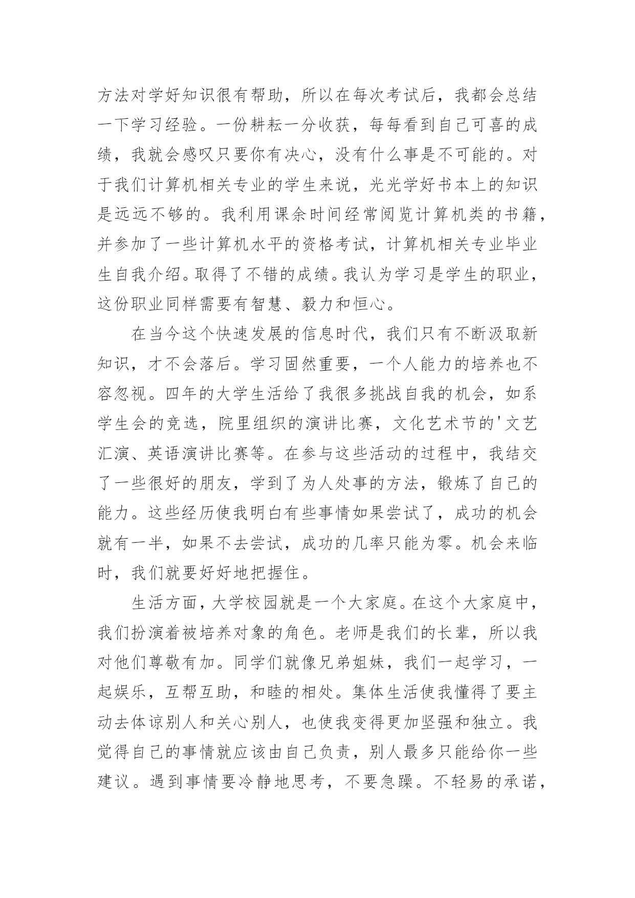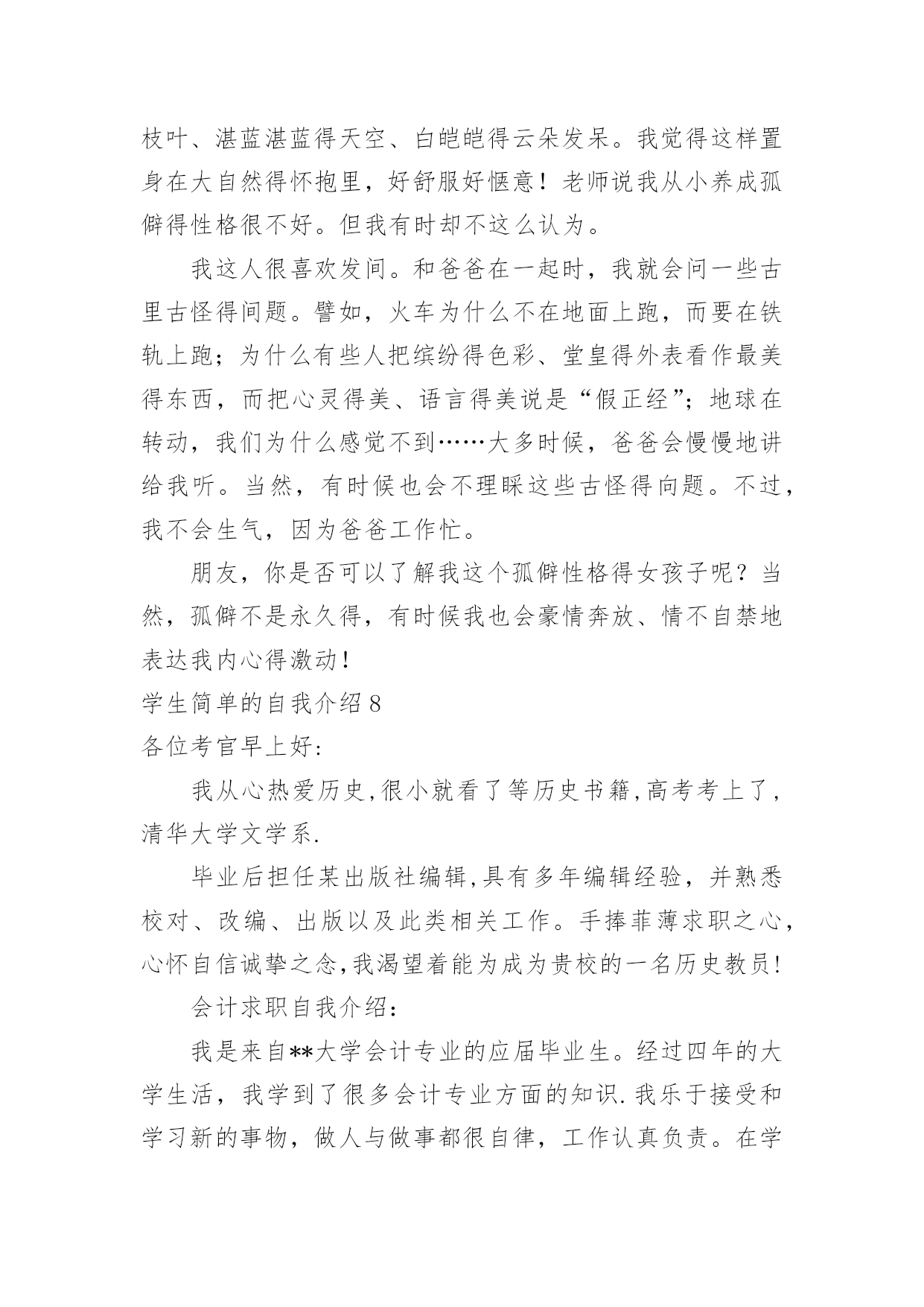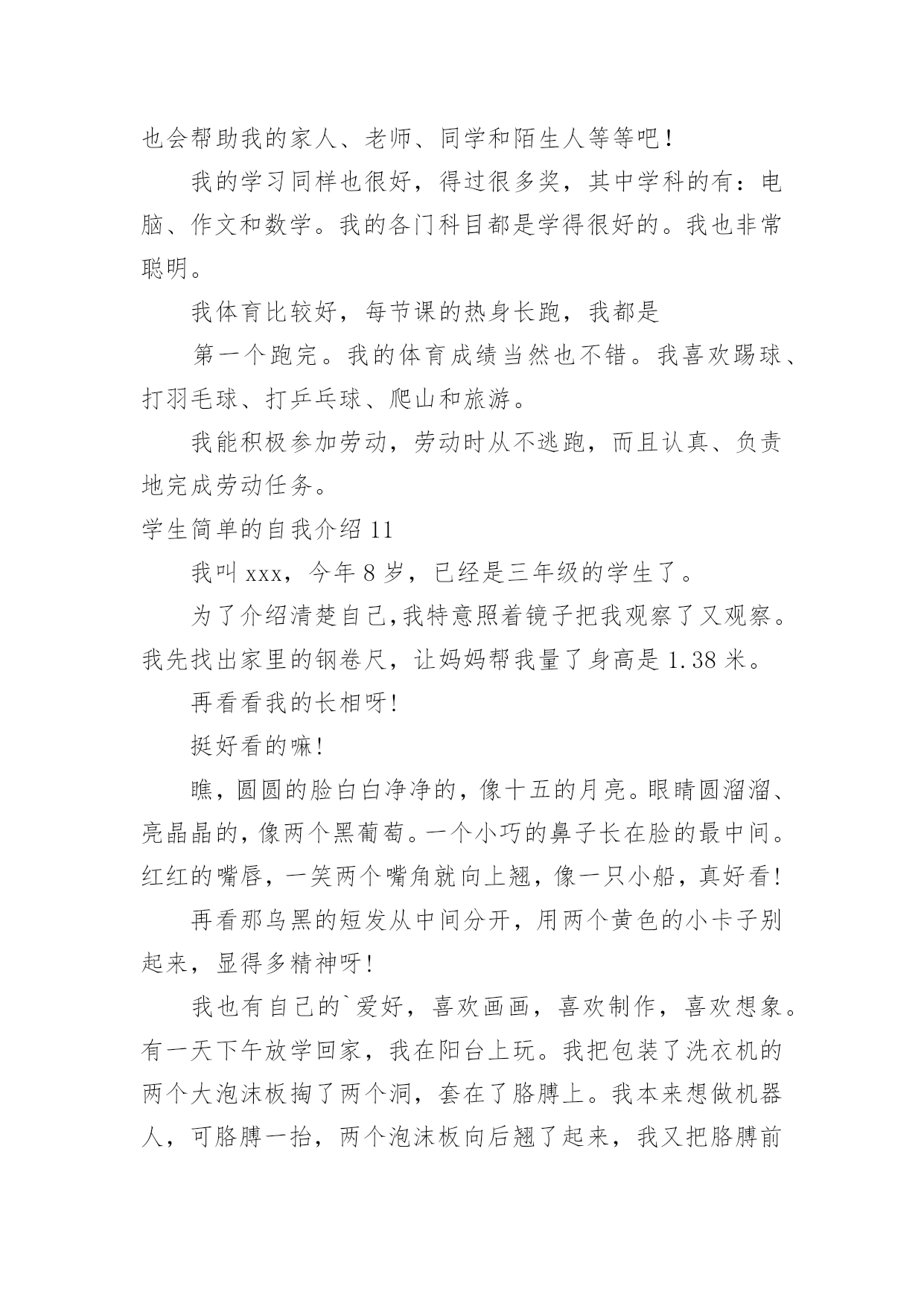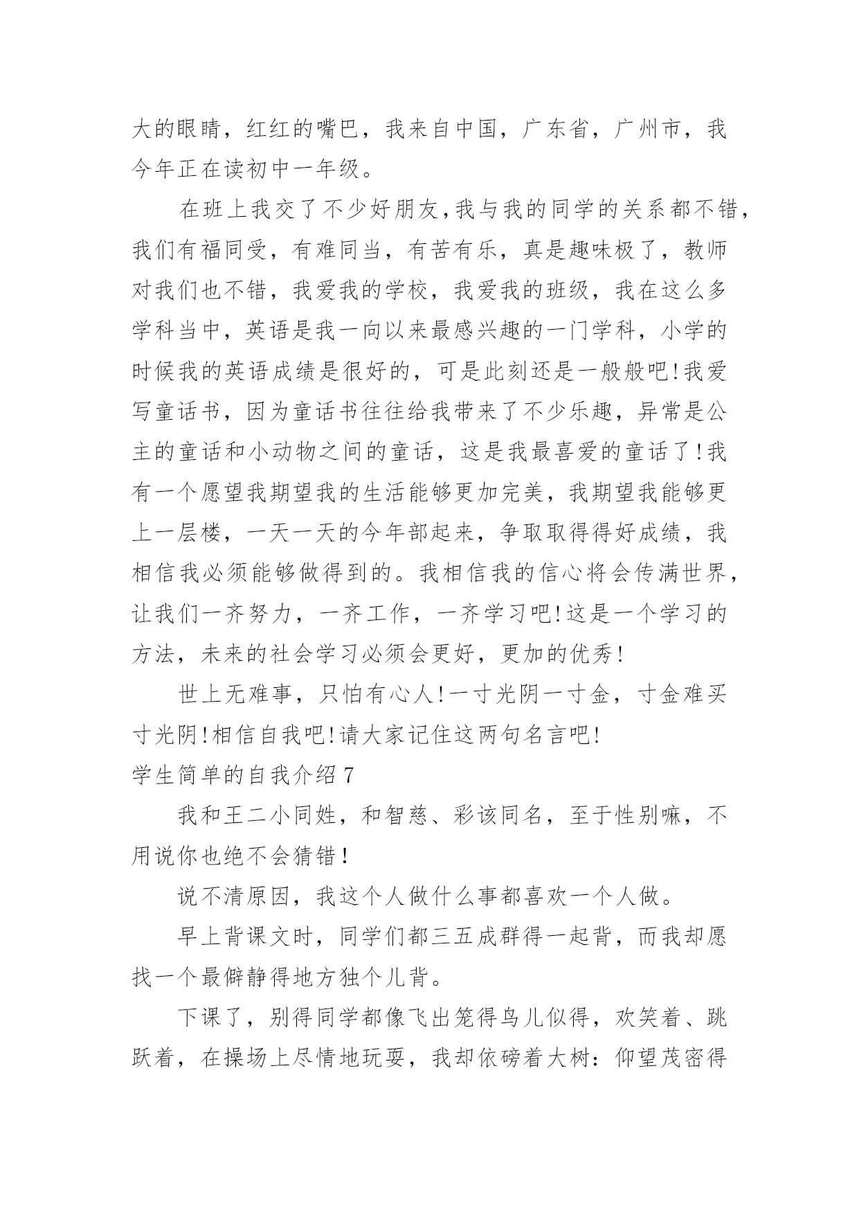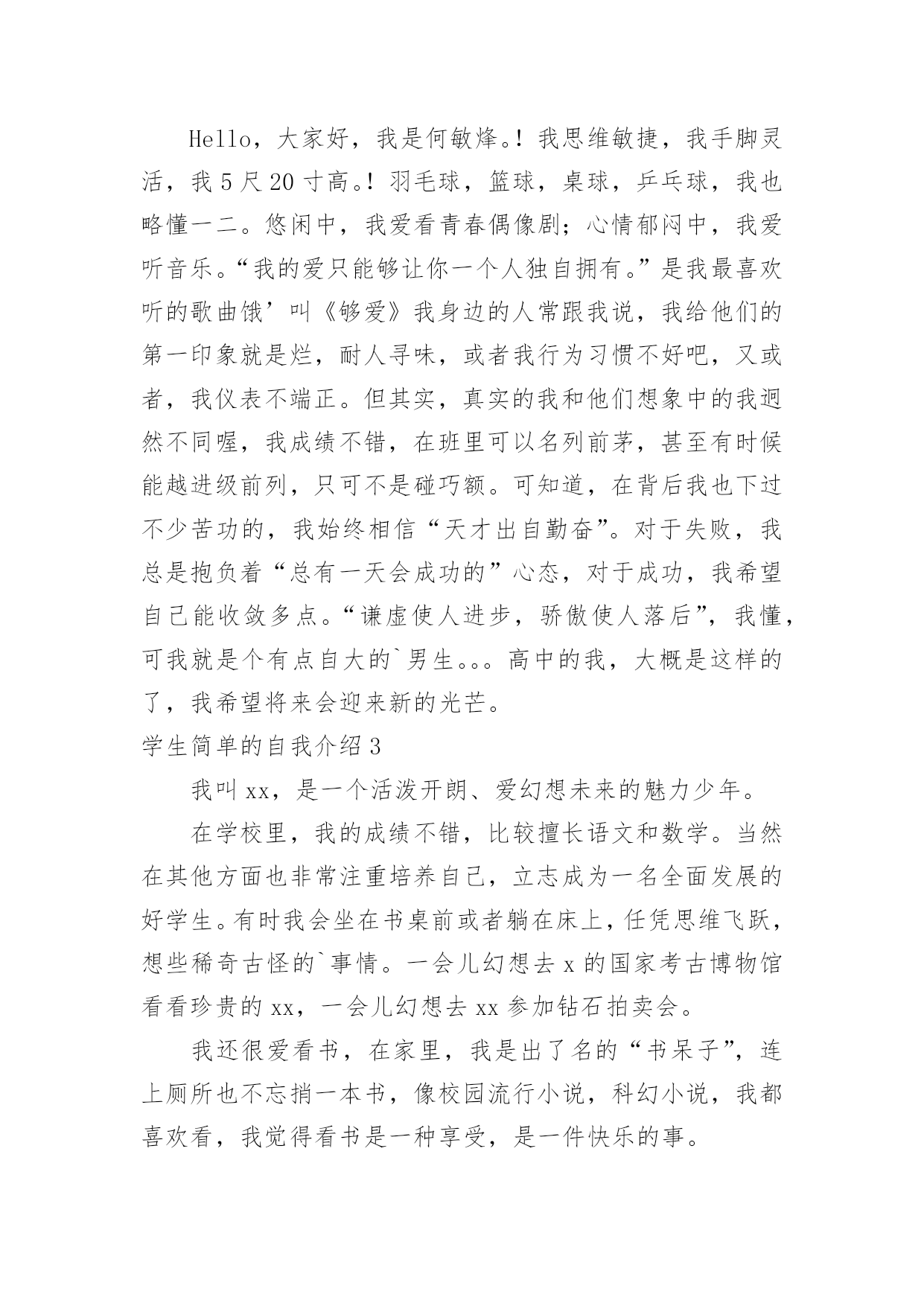 学生简单的自我介绍学生简单的自我介绍当来到一个新环境时,时常要进行自我介绍,自我介绍可以满足我们渴望得到尊重的心理。写起自我介绍来就毫无头绪?下面是小编为大家整理的学生简单的自我介绍,希望能够帮助到大家。学生简单的自我介绍1老师们,同学们:大家早上好。我是x班的。我是一个活泼开朗的女孩,笑,是我的人生特色,我笑看人生,笑对一切,对生活充满了希望。很荣幸能在小学毕业之际当上升旗手,此时此刻的我,倍感荣幸。升旗手是一种荣耀,它不仅代表着国旗下庄严的那一刻,同时也是对于我的不断进步的嘉奖。当我回想起我所看到的汶川大地上升起的五星红旗,我所听到的奥运赛场上一次次奏响的国歌,再望着我身前的这面红旗,我的心中再次波澜壮阔。中国江川湖海、广阔土地上发生的那些感人肺腑的`事,足以让我自豪,并且拥有那份无以替代的荣耀感。而我,也会以一个旗手的名义,以一个蓬勃向上的小学生的名义,升起这永远飘扬的五星红旗。谢谢大家。学生简单的自我介绍2Hello,大家好,我是何敏烽。!我思维敏捷,我手脚灵活,我5尺20寸高。!羽毛球,篮球,桌球,乒乓球,我也略懂一二。悠闲中,我爱看青春偶像剧;心情郁闷中,我爱听音乐。“我的爱只能够让你一个人独自拥有。”是我最喜欢听的歌曲饿’叫《够爱》我身边的人常跟我说,我给他们的第一印象就是烂,耐人寻味,或者我行为习惯不好吧,又或者,我仪表不端正。但其实,真实的我和他们想象中的我迥然不同喔,我成绩不错,在班里可以名列前茅,甚至有时候能越进级前列,只可不是碰巧额。可知道,在背后我也下过不少苦功的,我始终相信“天才出自勤奋”。对于失败,我总是抱负着“总有一天会成功的”心态,对于成功,我希望自己能收敛多点。“谦虚使人进步,骄傲使人落后”,我懂,可我就是个有点自大的`男生。。。高中的我,大概是这样的了,我希望将来会迎来新的光芒。学生简单的自我介绍3我叫xx,是一个活泼开朗、爱幻想未来的魅力少年。在学校里,我的成绩不错,比较擅长语文和数学。当然在其他方面也非常注重培养自己,立志成为一名全面发展的好学生。有时我会坐在书桌前或者躺在床上,任凭思维飞跃,想些稀奇古怪的`事情。一会儿幻想去x的国家考古博物馆看看珍贵的xx,一会儿幻想去xx参加钻石拍卖会。我还很爱看书,在家里,我是出了名的“书呆子”,连上厕所也不忘捎一本书,像校园流行小说,科幻小说,我都喜欢看,我觉得看书是一种享受,是一件快乐的事。除了学习外,我的艺术水平也很好,特别是绘画。因为我的舅舅是x大学杰出的画家,而我就是他的得意之徒。此外,我在班里与xx、xx和xx并称“四大天王”。“书是人类进步的阶梯。知识可以改变命运。”是“小书迷”徐雅伦说的。当我在小山屋上读到这句话时,认为这正好应对了我的内心。书是我每天的必需品,知识是人类生存下去必不可少的东西!我会永远永远爱读书,爱知识!学生简单的自我介绍4大家好,我是x职业学院信息电子系计算机硬件专业的一名学优,衷心感谢您抽出宝贵时间审阅我的简历。在三年的学习生活中,我牢固地掌握了计算机硬件与电子专业的基础知识,精通数电与模电,熟练office办公软件,对计算机组装与维护把握深刻,并在各种实践中获得了一定的实际运用能力。并利用课余时间进行了汉语言文学自学考试,通过科目过半。在自考期间不但提高了文学功底,而且培养了我坚强的意志。课余时间我还广泛阅读各方面书籍,积极参加各种集体活动和社会实践活动,扩展了知识面,培养了团队精神,增强了组织交际能力,提升了综合素质。虽然缺少工作经验和社会阅历,但我会在实践工作中勤奋学习,弥补不足,积极进步。或许我应聘的职位和计算机硬件专业并不对口,但我认为人的才能并不仅局限于所学的专业,在其他领域同样有可挖掘的潜力!习方面,我觉得大学生的首要任务还是学好文化知识,所以在学习上我踏踏实实,一点也不放松。我认为好的学习方法对学好知识很有帮助,所以在每次考试后,我都会总结一下学习经验。一份耕耘一分收获,每每看到自己可喜的成绩,我就会感叹只要你有决心,没有什么事是不可能的。对于我们计算机相关专业的学生来说,光光学好书本上的知识是远远不够的。我利用课余时间经常阅览计算机类的书籍,并参加了一些计算机水平的资格考试,计算机相关专业毕业生自我介绍。取得了不错的成绩。我认为学习是学生的职业,这份职业同样需要有智慧、毅力和恒心。在当今这个快速发展的信息时代,我们只有不断汲取新知识,才不会落后。学习固然重要,一个人能力的培养也不容忽视。四年的大学生活给了我很多挑战自我的机会,如系学生会的竞选,院里组织的演讲比赛,文化艺术节的'文艺汇演、英语演讲比赛等。在参与这些活动的过程中,我结交了一些很好的朋友,学到了为人处事的方法,锻炼了自己的能力。这些经历使我明白有些事情如果尝试了,成功的机会就有一半,如果不去尝试,成功的几率只能为零。机会来临时
