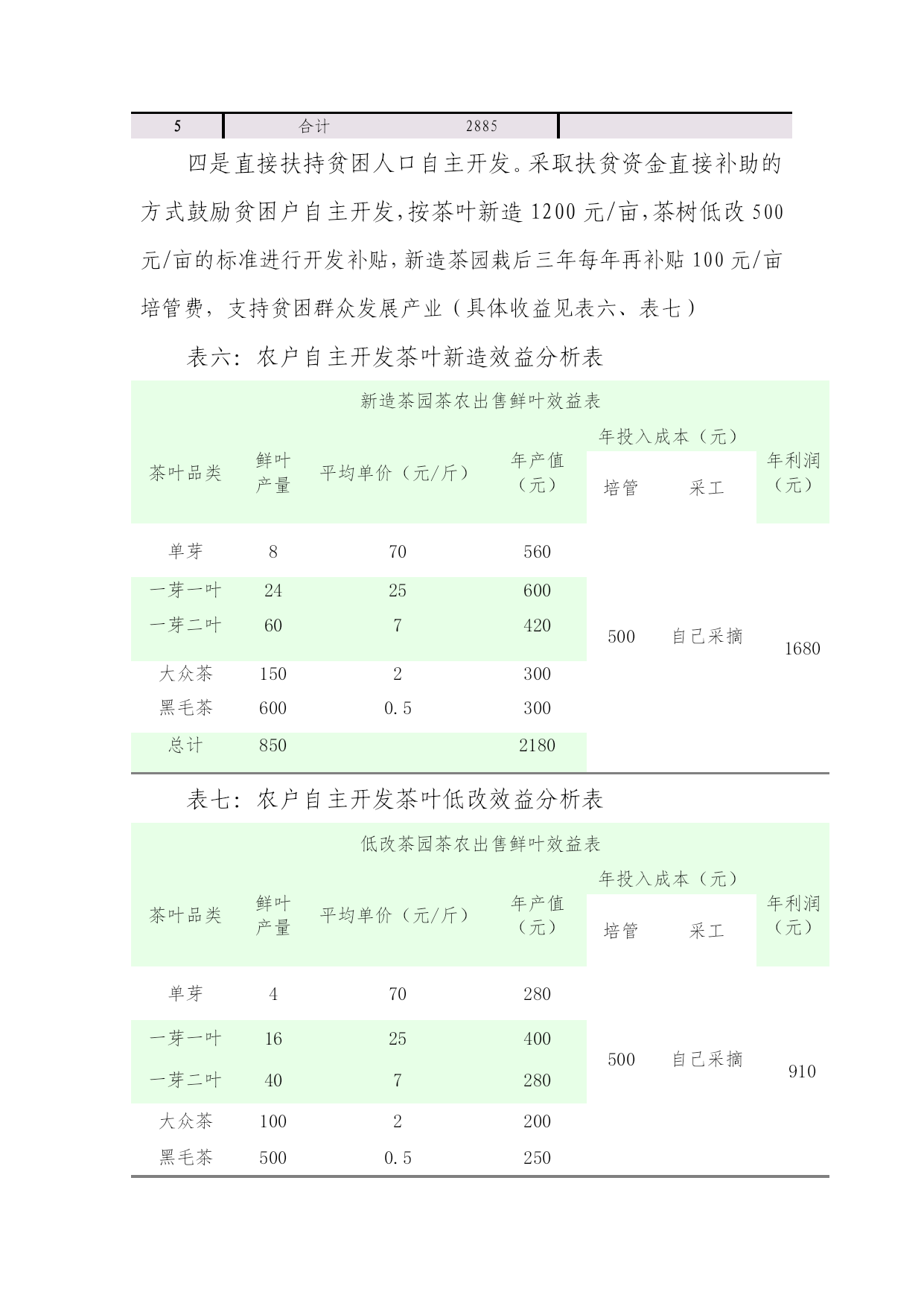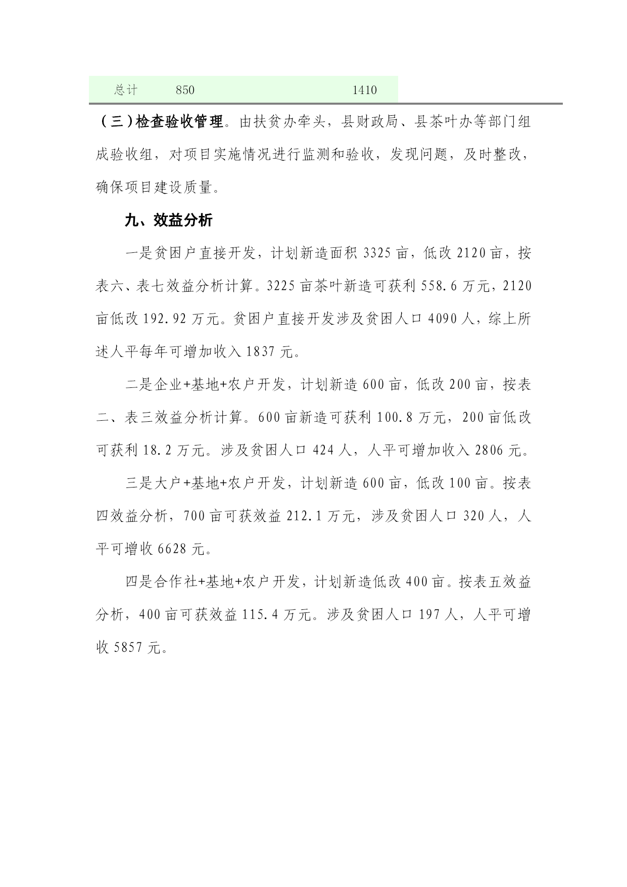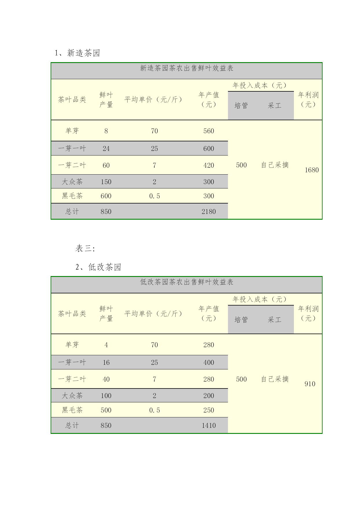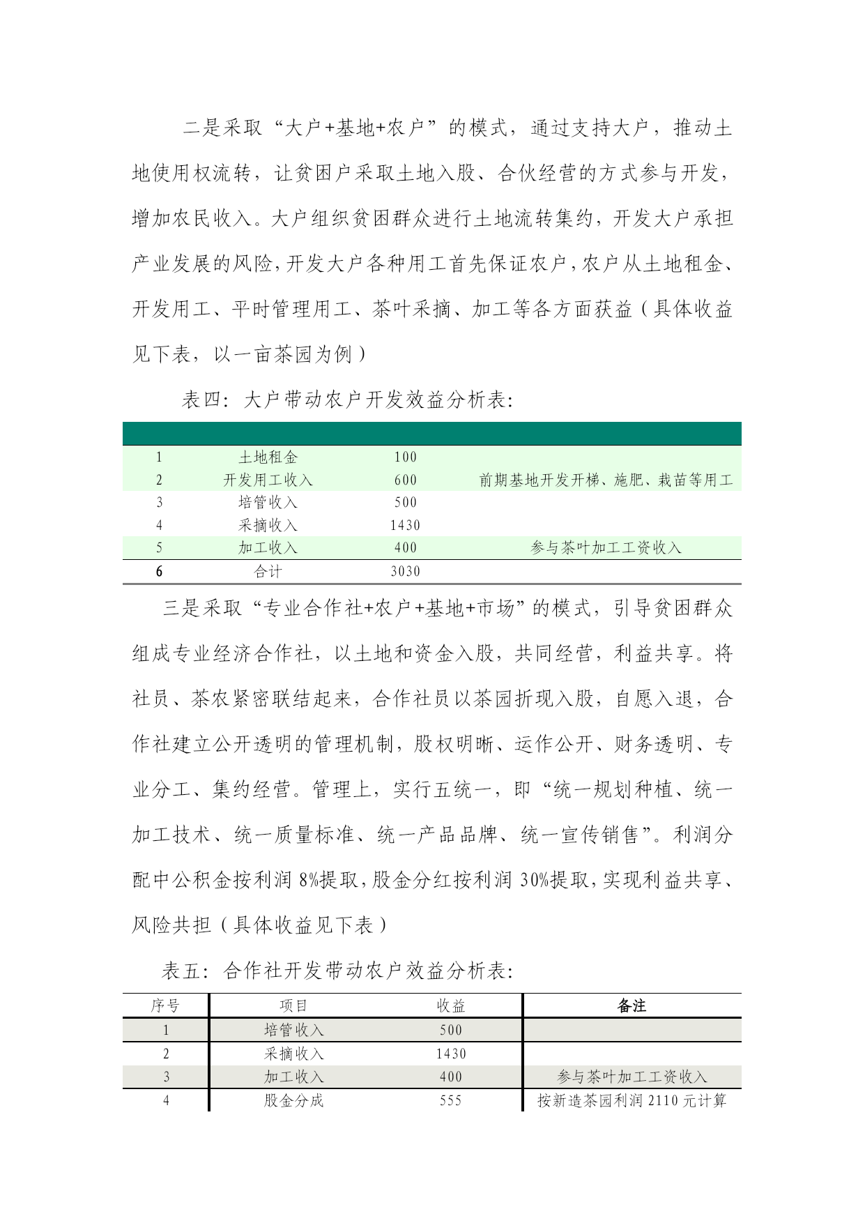 茶叶开发经济效益分析表优质资料(可以直接使用,可编辑优质资料,欢迎下载)1、新造茶园新造茶园茶农出售鲜叶效益表茶叶品类鲜叶产量平均单价(元/斤)年产值(元)年投入成本(元)年利润(元)培管采工单芽870560500自己采摘1680一芽一叶2425600一芽二叶607420大众茶1502300黑毛茶6000.5300总计8502180表三:2、低改茶园低改茶园茶农出售鲜叶效益表茶叶品类鲜叶产量平均单价(元/斤)年产值(元)年投入成本(元)年利润(元)培管采工单芽470280500自己采摘910一芽一叶1625400一芽二叶407280大众茶1002200黑毛茶5000.5250总计8501410二是采取“大户+基地+农户”的模式,通过支持大户,推动土地使用权流转,让贫困户采取土地入股、合伙经营的方式参与开发,增加农民收入。大户组织贫困群众进行土地流转集约,开发大户承担产业发展的风险,开发大户各种用工首先保证农户,农户从土地租金、开发用工、平时管理用工、茶叶采摘、加工等各方面获益(具体收益见下表,以一亩茶园为例)表四:大户带动农户开发效益分析表:1土地租金1002开发用工收入600前期基地开发开梯、施肥、栽苗等用工3培管收入5004采摘收入14305加工收入400参与茶叶加工工资收入6合计3030三是采取“专业合作社+农户+基地+市场”的模式,引导贫困群众组成专业经济合作社,以土地和资金入股,共同经营,利益共享。将社员、茶农紧密联结起来,合作社员以茶园折现入股,自愿入退,合作社建立公开透明的管理机制,股权明晰、运作公开、财务透明、专业分工、集约经营。管理上,实行五统一,即“统一规划种植、统一加工技术、统一质量标准、统一产品品牌、统一宣传销售”。利润分配中公积金按利润8%提取,股金分红按利润30%提取,实现利益共享、风险共担(具体收益见下表)表五:合作社开发带动农户效益分析表:序号项目收益备注1培管收入5002采摘收入14303加工收入400参与茶叶加工工资收入4股金分成555按新造茶园利润2110元计算5合计2885四是直接扶持贫困人口自主开发。采取扶贫资金直接补助的方式鼓励贫困户自主开发,按茶叶新造1200元/亩,茶树低改500元/亩的标准进行开发补贴,新造茶园栽后三年每年再补贴100元/亩培管费,支持贫困群众发展产业(具体收益见表六、表七)表六:农户自主开发茶叶新造效益分析表新造茶园茶农出售鲜叶效益表茶叶品类鲜叶产量平均单价(元/斤)年产值(元)年投入成本(元)年利润(元)培管采工单芽870560500自己采摘1680一芽一叶2425600一芽二叶607420大众茶1502300黑毛茶6000.5300总计8502180表七:农户自主开发茶叶低改效益分析表低改茶园茶农出售鲜叶效益表茶叶品类鲜叶产量平均单价(元/斤)年产值(元)年投入成本(元)年利润(元)培管采工单芽470280500自己采摘910一芽一叶1625400一芽二叶407280大众茶1002200黑毛茶5000.5250总计8501410(三)检查验收管理。由扶贫办牵头,县财政局、县茶叶办等部门组成验收组,对项目实施情况进行监测和验收,发现问题,及时整改,确保项目建设质量。九、效益分析一是贫困户直接开发,计划新造面积3325亩,低改2120亩,按表六、表七效益分析计算。3225亩茶叶新造可获利558.6万元,2120亩低改192.92万元。贫困户直接开发涉及贫困人口4090人,综上所述人平每年可增加收入1837元。二是企业+基地+农户开发,计划新造600亩,低改200亩,按表二、表三效益分析计算。600亩新造可获利100.8万元,200亩低改可获利18.2万元。涉及贫困人口424人,人平可增加收入2806元。三是大户+基地+农户开发,计划新造600亩,低改100亩。按表四效益分析,700亩可获效益212.1万元,涉及贫困人口320人,人平可增收6628元。四是合作社+基地+农户开发,计划新造低改400亩。按表五效益分析,400亩可获效益115.4万元。涉及贫困人口197人,人平可增收5857元。装饰施工企业效益低下的原因分析和对策摘要:装饰施工企业效益低下,发展困难.其原因多样:市场的无序竞争、质量管理的欠缺、成本费用的增加等。如何有效提高企业效益,质量、品牌形象以及开源与节流成为提高企业效益的重要环节。本文主要针对节流进行阐述.关键词:施工企业装饰效益原因对策当前激烈的市场竟争环境下,装饰施工企业面临业务承接难、单位体量小(相比土建项目)、报价竟争恶化、成本费用高、效益低下等诸多实际问题,但企业要想生存、发展,必须在不利的环境中强化管理、苦练内功,才能立于不败之地,下面就装饰企业在实