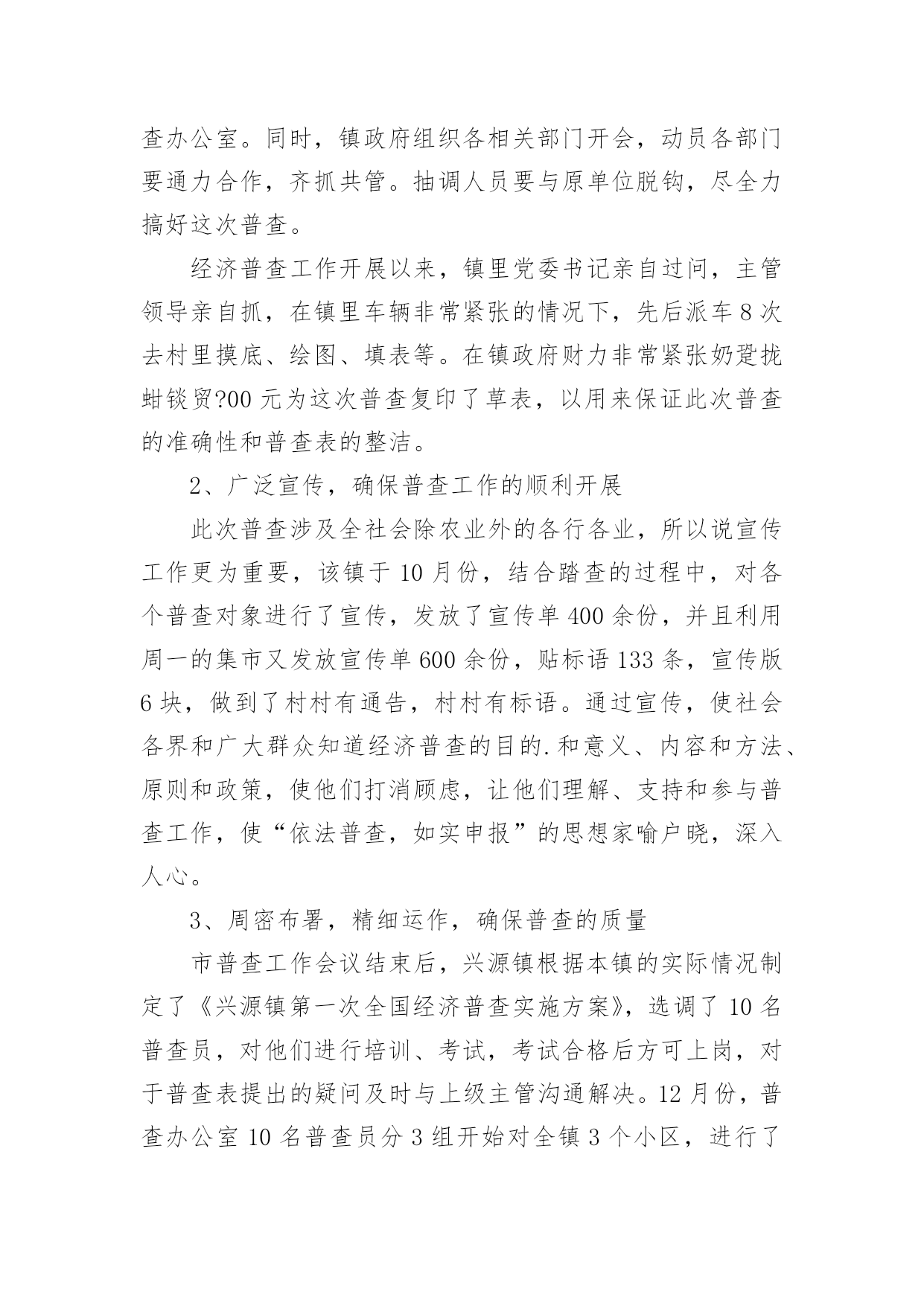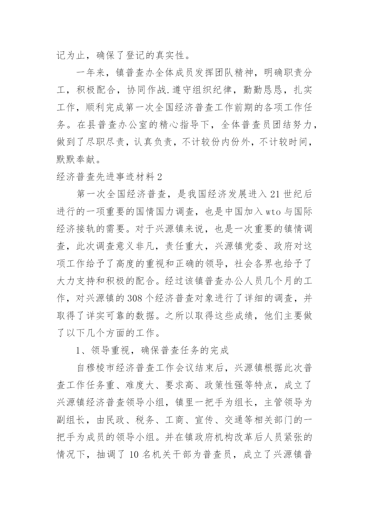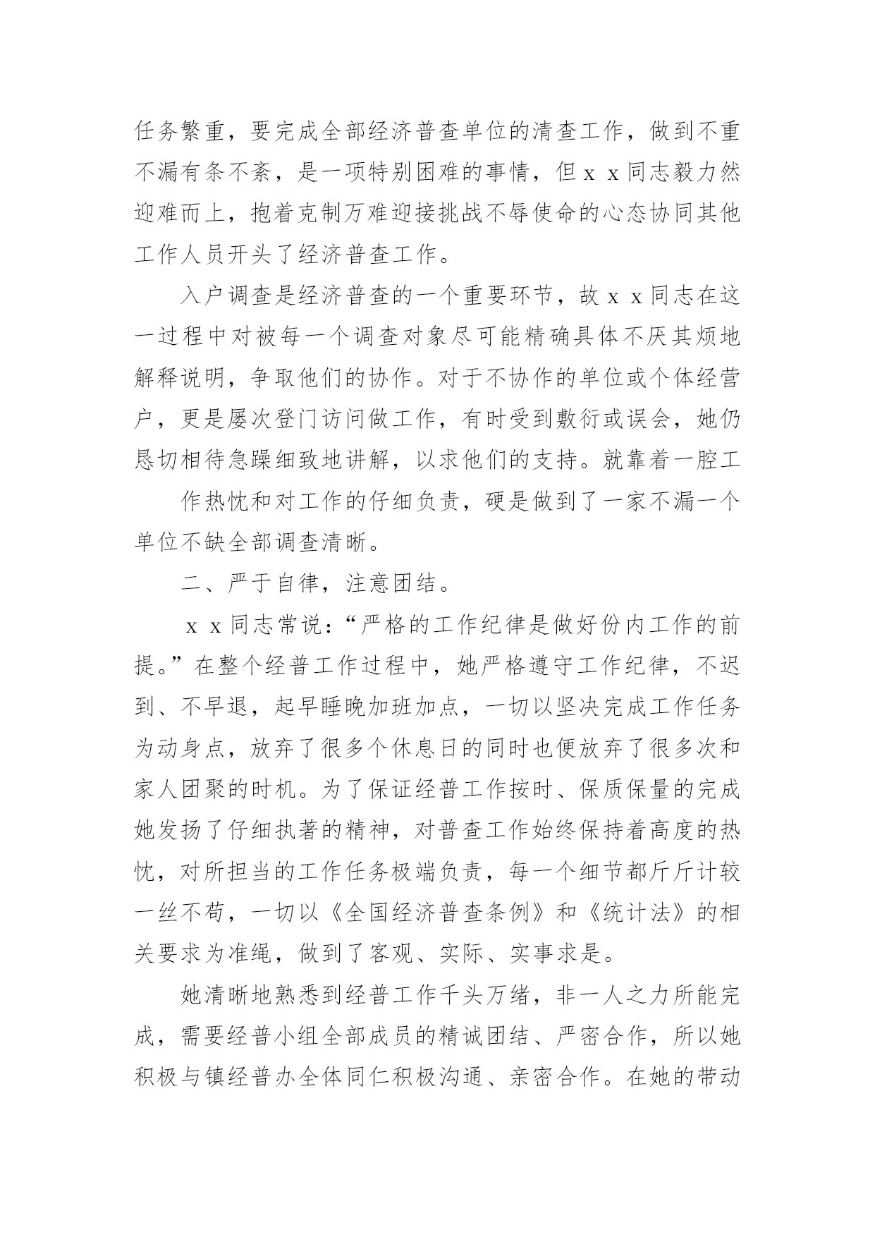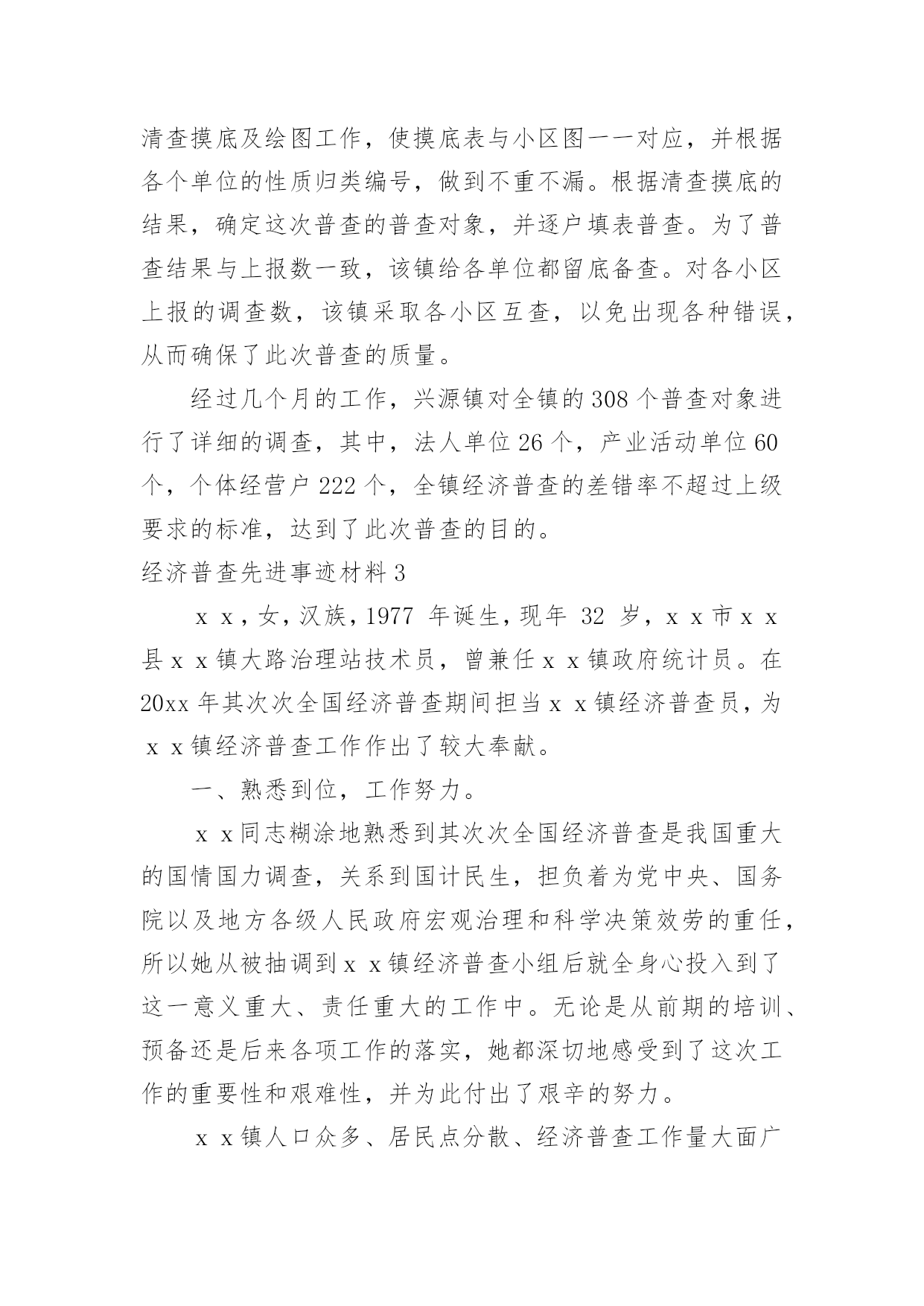 经济普查先进事迹材料经济普查先进事迹材料在平时的学习、工作或生活中,要用到事迹材料的地方还是很多的,从先进对象的形成和内涵上来分,事迹材料可分为在一个较长时间内形成的先进事迹的材料和在一时因突发事件而产生的先进事迹的材料。相信很多朋友都对拟事迹材料感到非常苦恼吧,以下是小编为大家收集的经济普查先进事迹材料,供大家参考借鉴,希望可以帮助到有需要的朋友。经济普查先进事迹材料1自20xx年全国第一次经济普查开始以来,民乐县新天镇普查小组,对此项工作高度负责,在时间紧、任务重的情况下,普查人员起早贪黑、加班加点、认真负责,按时按要求圆满完成县经济普查领导小组下达的任务,受到县领导和全镇干部职工的好评。一、充分认识经济普查工作的难度该镇法人和产业活动单位有近150家,在册登记的个体经营户有385家,还有为数众多的没有登记的个体户和流动摊位,普查对象的数量是很大的。另外,各单位不仅经济成分、企业产权结构和组织形式较复杂,而且第三产业也较发达。这些行业大都没有建立规范的统计制度,统计基础比较薄弱。因此,他们可能每天都会遇到新情况、新问题,工作量也会因此而增大。虽然他们的工作难度很大,但经常深入到每个村组、单位,进行宣传,做到家喻户晓人人皆知,这在以后的工作中,把情况摸准了,把思路和方法理清楚了,将会对经济普查工作中有很大的帮助。二、认真对待经济普查工作的关键环节经济普查工作千头万绪,各项工作环环相扣。为确保高质量完成经济普查工作,积极参加全县经济普查办组织的多次培训。(一)抓好本镇普查员的培训工作。乡镇经济普查办培训的重点放在普查基本内容、指标含义、入户工作的组织和询问填表的.技巧、方法上。通过参加培训,每个普查员能熟练掌握经济普查的工作流程、工作方式与方法,掌握清查、普查登记、审核等技能;熟悉各种调查表式及指标解释,能够解答普查对象提出的有关问题。(二)做好本镇普查对象的清查工作。普查对象的清查是实施经济普查的基础。针对本镇的特点通过对全镇单位全面清查,确保了普查的对象不重不漏。(三)深入本镇做好宣传工作。该镇经济普查的对象不仅多,而且构成复杂,他们的配合程度如何,能否如实填报普查数据,就成为这次工作成功与否的关键。解决这个问题就需要强大的宣传攻势,普查的宣传工作就是要使普查对象放下思想包袱,打消思想顾虑,如实回答和填报普查数据。普查小组多次深入单位,走上街头,大力宣传经济普查的意义和重要性(四)加强对本镇普查数据的审核和评估。普查数据的审核、评估是保证数据质量的重要环节。各工作环节的相关方案中也都有明确的要求。该镇力争使每一名普查员都明白自己的责任和分工,并抓好落实。对每次统计上来的数据进行逐一审查核实,对填写有问题的单位重新进行落实。(五)认真收集经济普查中的新情况和新问题,及时反映到街道经济普查办寻求解决。经济普查是一项全新的工作,在经济普查过程中,他们遇到了许多新情况和新问题。发现的新情况和新问题,都能认真地记录并及时反馈。三、经济普查工作的艰辛10月15日开始清查摸底登记工作,这天是双休日,大家放弃了与家人团聚的机会,普查员加班加点毫无怨言的工作。在工作中结合本镇的实际情况,为了使每一个单位、每一个个体户不漏登,下分了三个小组,每个小组选出一名组长由组长带队,对所管辖区的单位一一核实。在填表登记过程中,多数单位还能配合工作,但有些单位不配合,大家就耐心细致的讲解,做到边宣传边登记。例如,韩营大街有许多摊位,可去登记时,市场的主管人员就是不配合,总是说还没正式营业,摊位没有租出去不用登记了,他们就带着宣传品多次找到市场负责人员宣传、讲解普查的重要性,最终还是把营业的15个摊位的个体户登记上了。还有的单位工商登记在此,可是办公不在这里,为了不漏登,他们就耐心细致地为这些单位讲解经济普查的重要性,直到他们配合登记为止,确保了登记的真实性。一年来,镇普查办全体成员发挥团队精神,明确职责分工,积极配合,协同作战.遵守组织纪律,勤勤恳恳,扎实工作,顺利完成第一次全国经济普查工作前期的各项工作任务。在县普查办公室的精心指导下,全体普查员团结努力,做到了尽职尽责,认真负责,不计较份内份外,不计较时间,默默奉献。经济普查先进事迹材料2第一次全国经济普查,是我国经济发展进入21世纪后进行的一项重要的国情国力调查,也是中国加入wto与国际经济接轨的需要。对于兴源镇来说,也是一次重要的镇情调查,此次调查意义非凡,责任重大,兴源镇党委、政府对这项工作给予了高度的重视和正确的领导,社会各界也给予了大力支持和积极的配合。经过该镇普查办公人员几个月的工作,对兴源镇的308个经济普查对象进行了详细的调查,并取得了详实可靠的数据。之所以取得这些成绩,他们主要做了以下几个方面的工作。1、领导重视,确保普查任务的完成自穆棱市经济普查工作会议结束后,兴源镇根据此次普